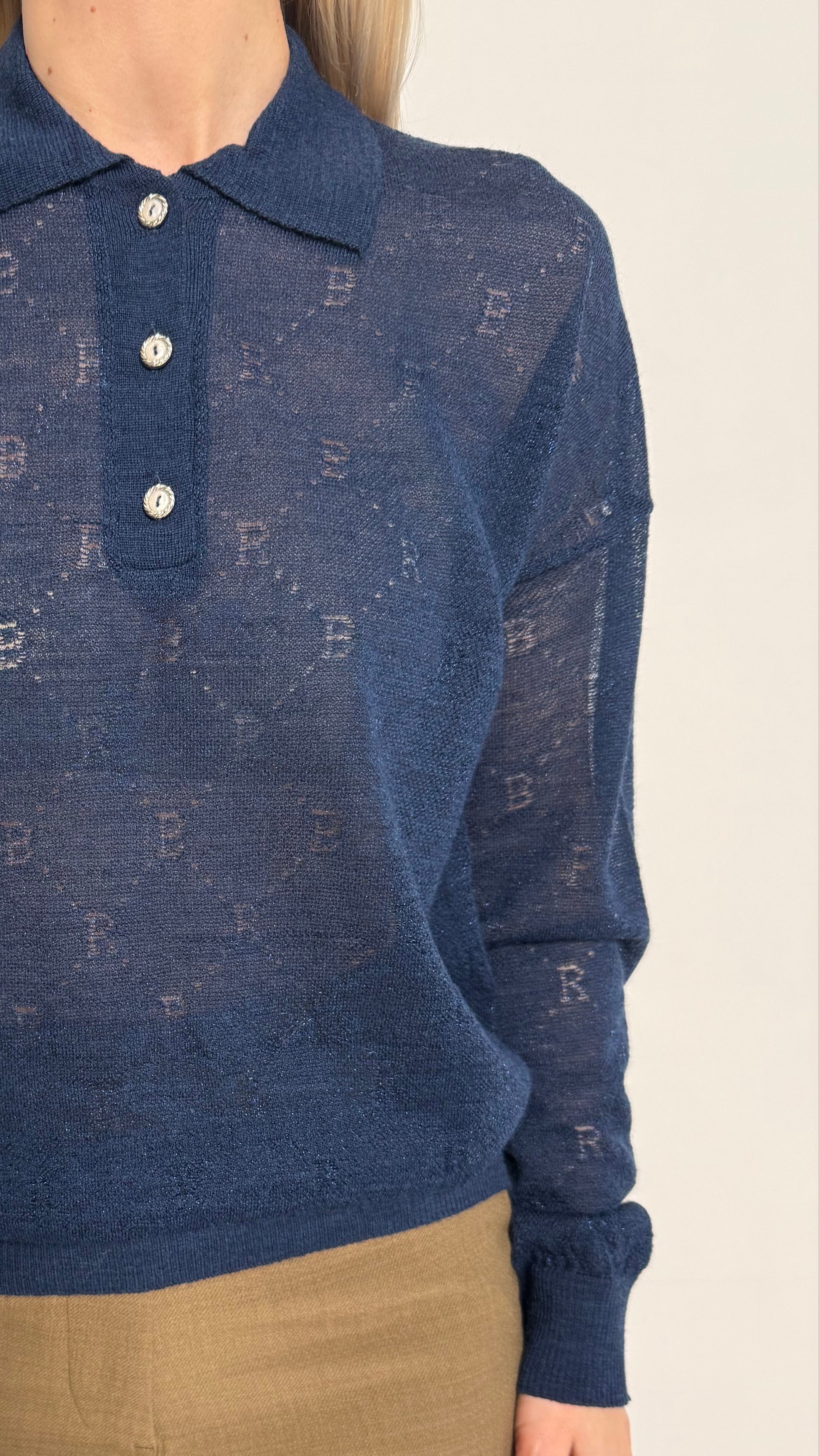 A finely knitted double-layered polo shirt with a 3-button placket at the neck and knitted cuffs.