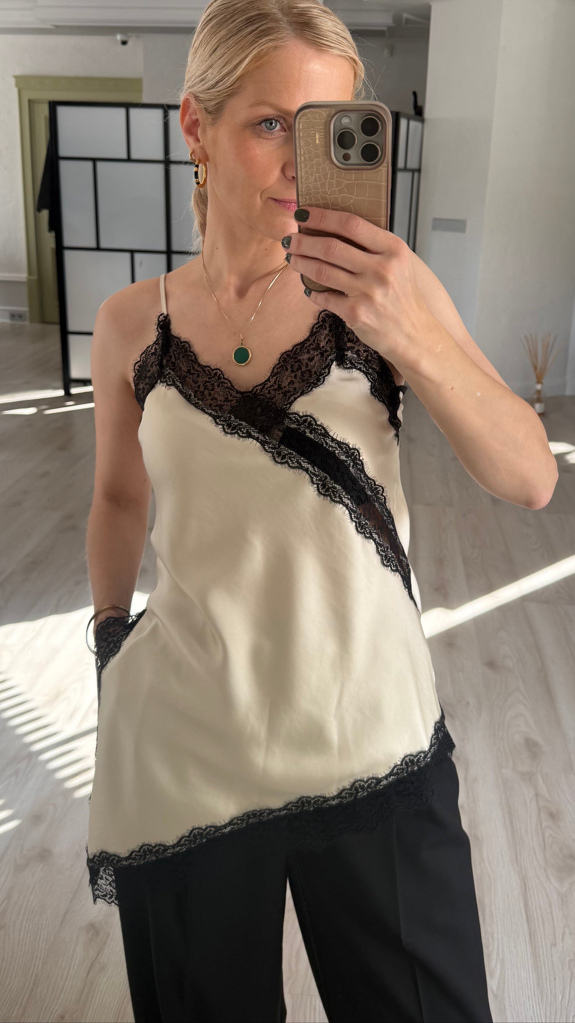 Asimetrisks tops ar mežģīni uz regulējamām lencītēm vaniļas tonī.