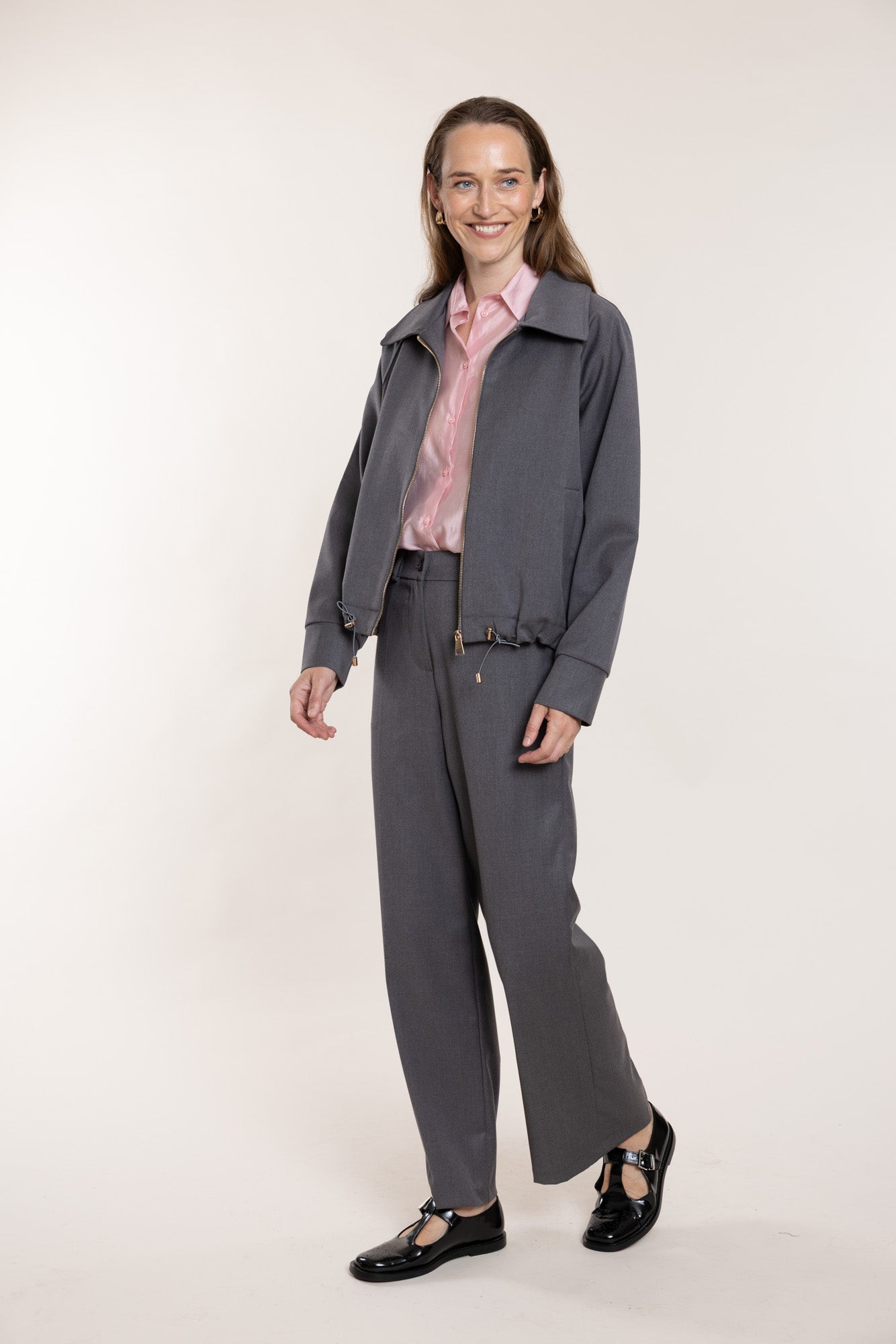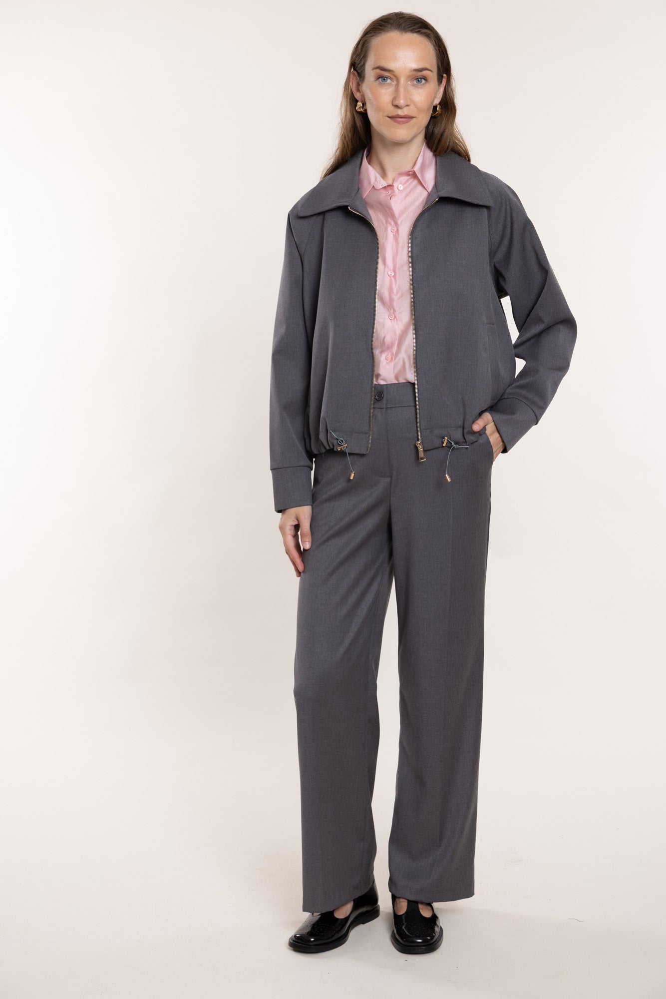 Classic trousers in a dusty rose shade with pockets. Elastic waistband at the back. A matching bomber jacket with a zipper is also available.