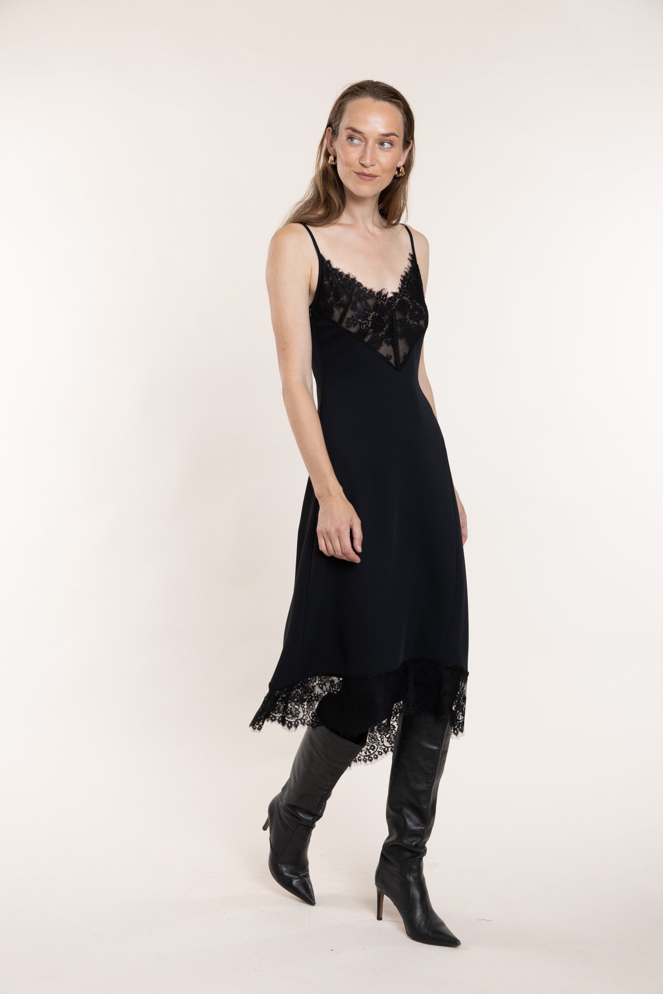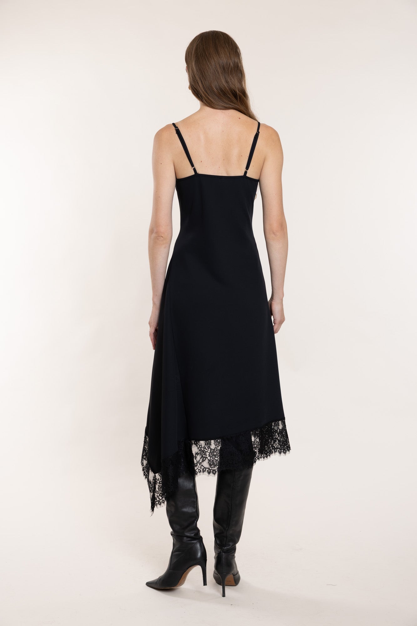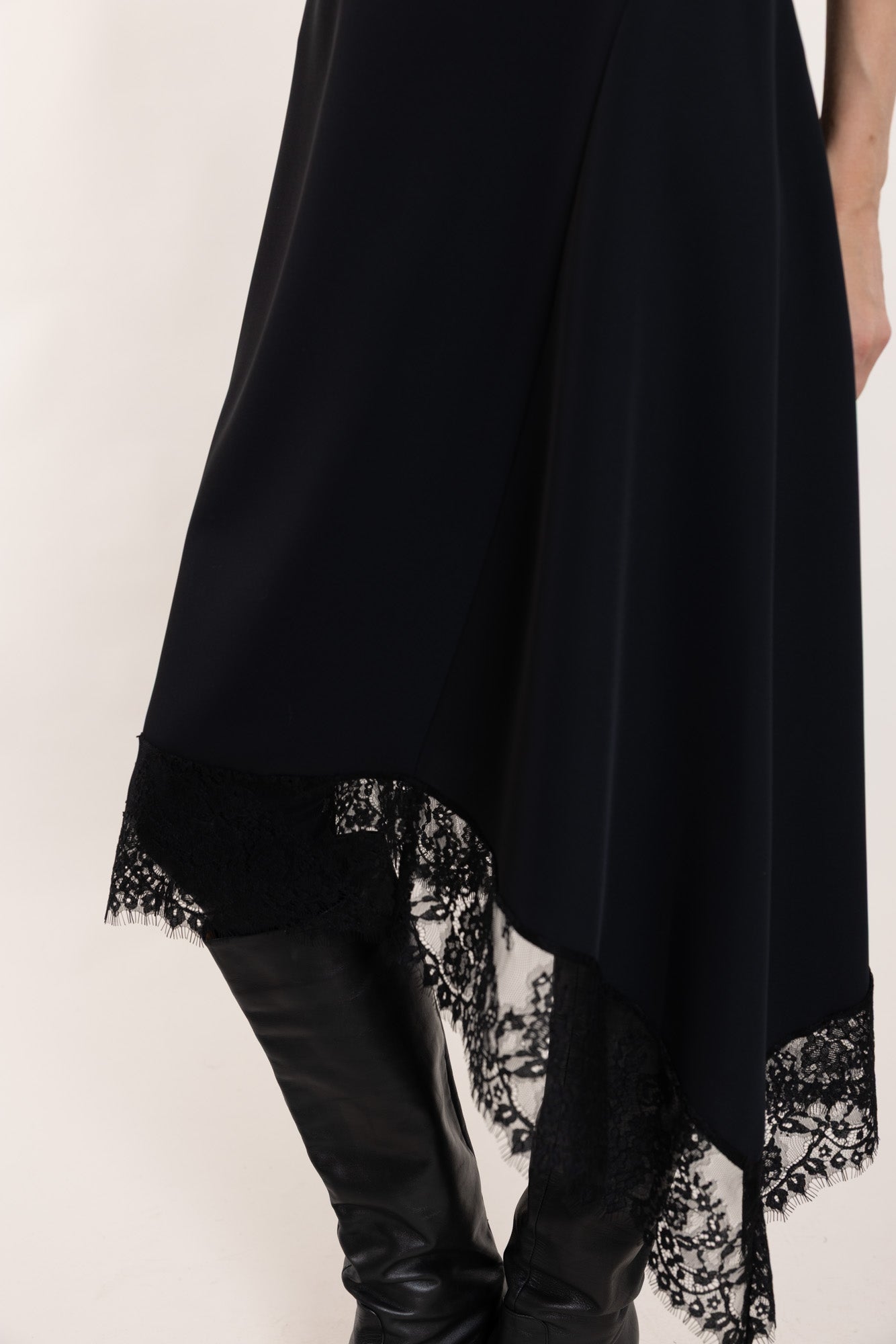 Dress with lace at the neckline and hem, thin spaghetti straps. The neckline lace is backed with tulle. The main fabric is firm and dense. Asymmetrical insert on one side. Asymmetrical hem. The dress bodice is narrower than usual.
