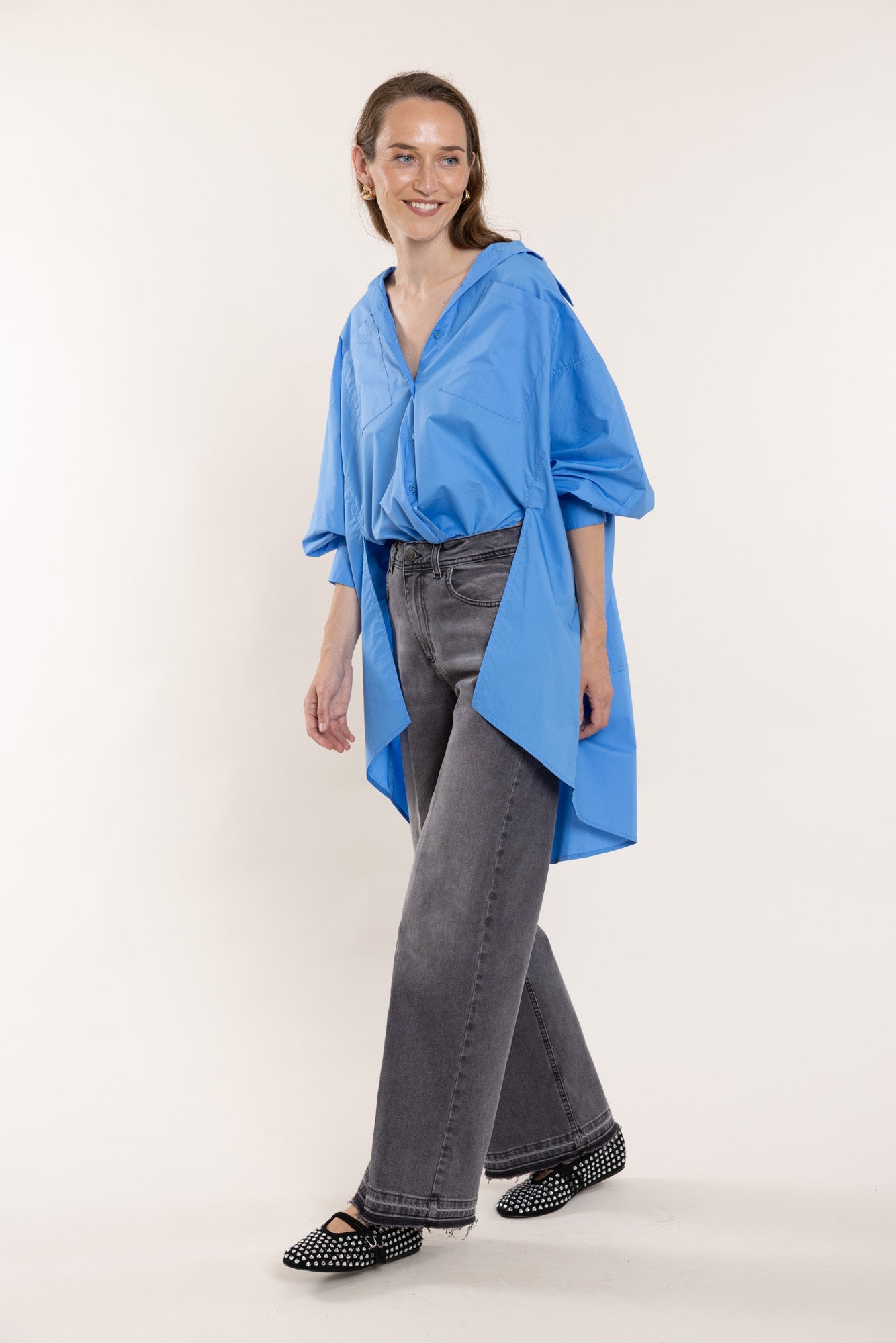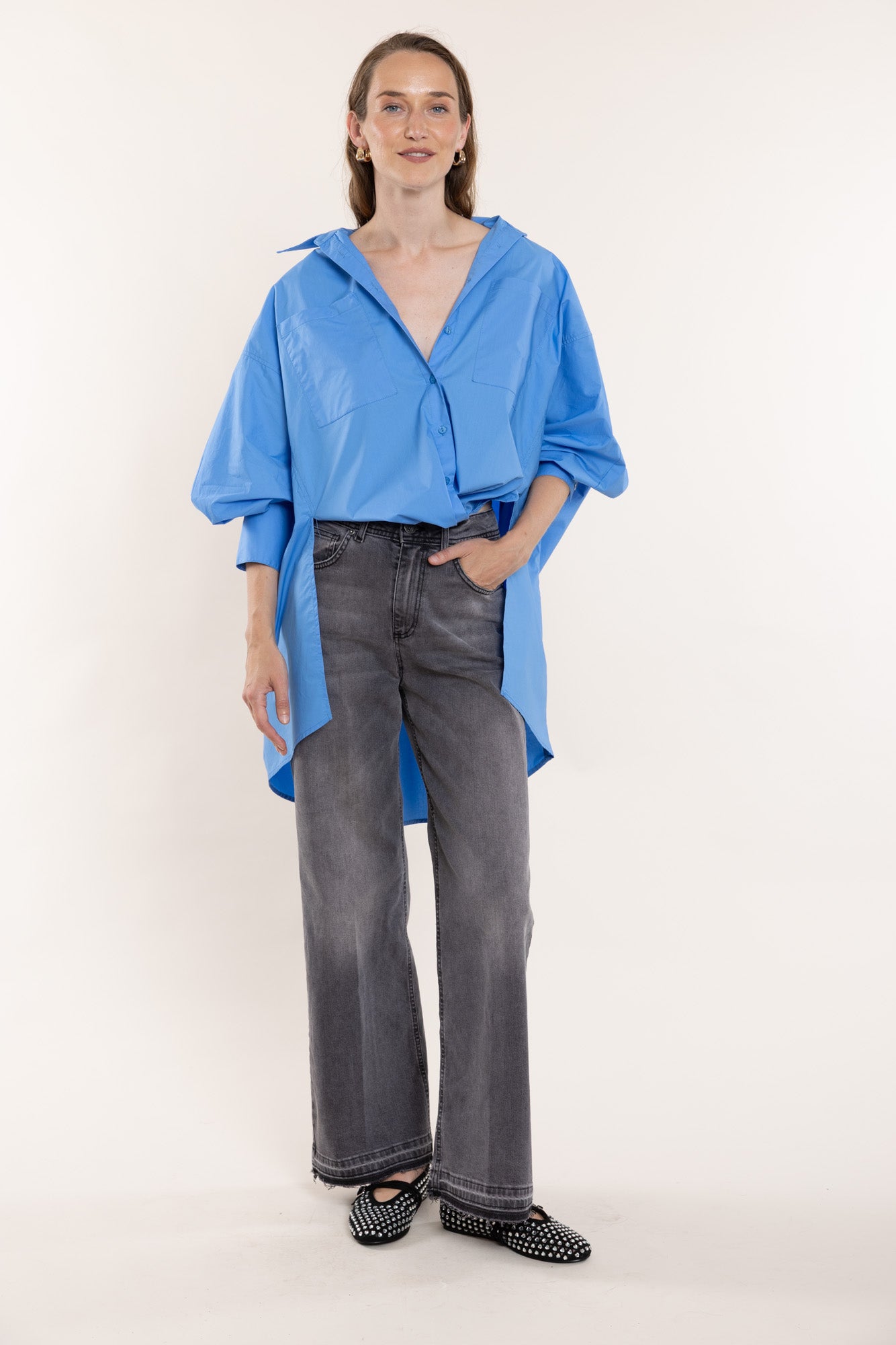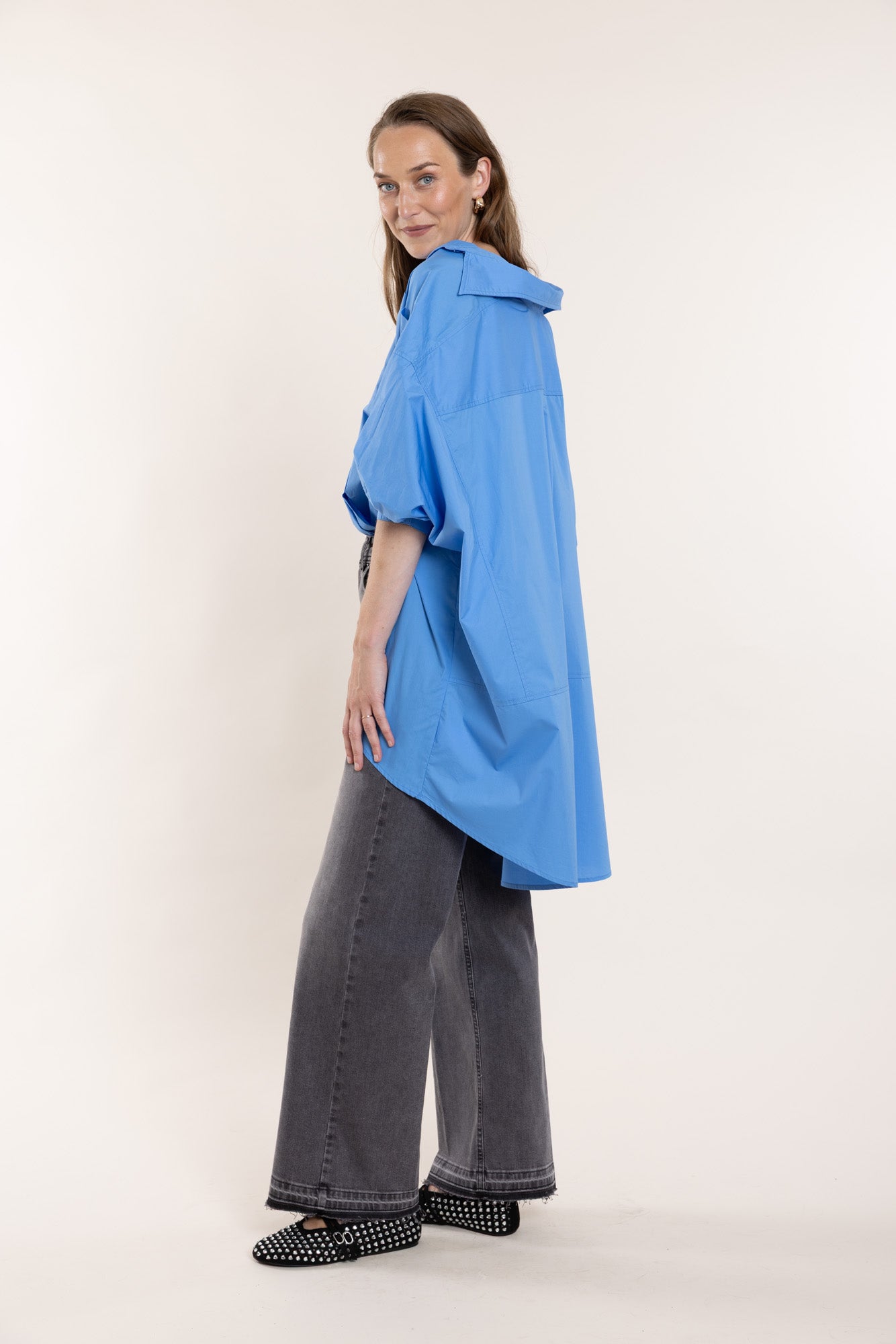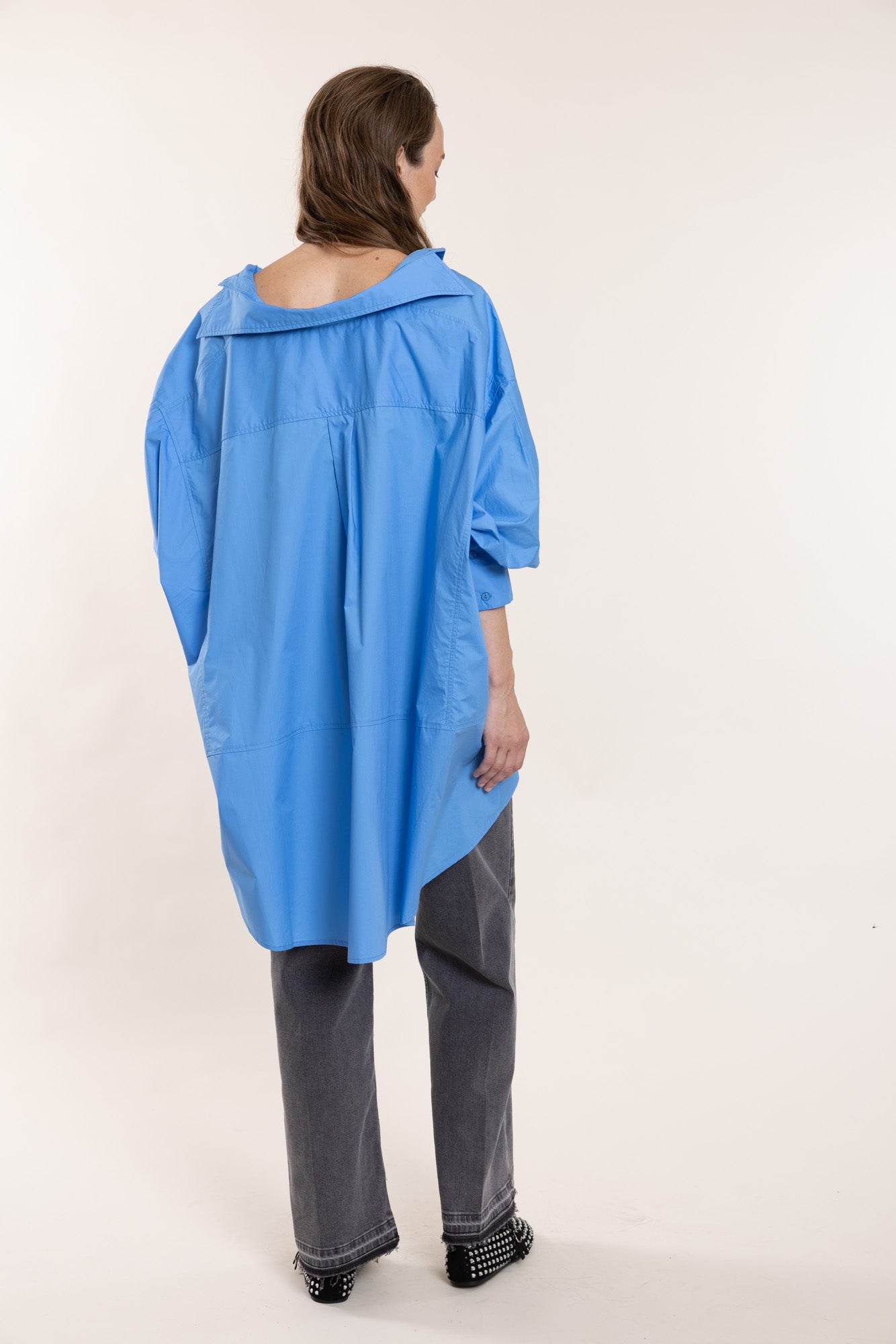 Bright blue cotton shirt in an oversized fit. Features classic buttoned cuffs, collar, and front placket, side slits, and an asymmetrical hem.