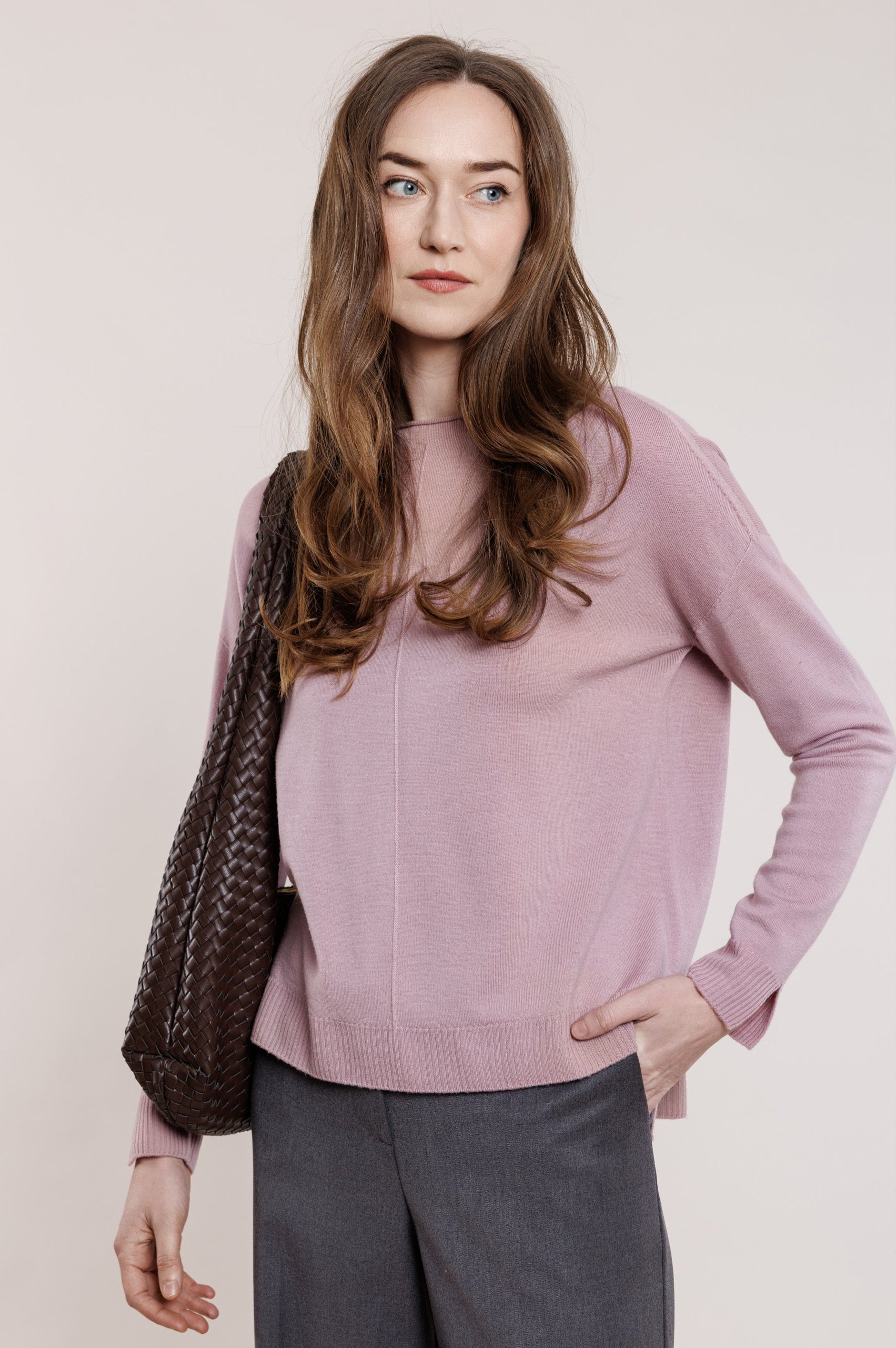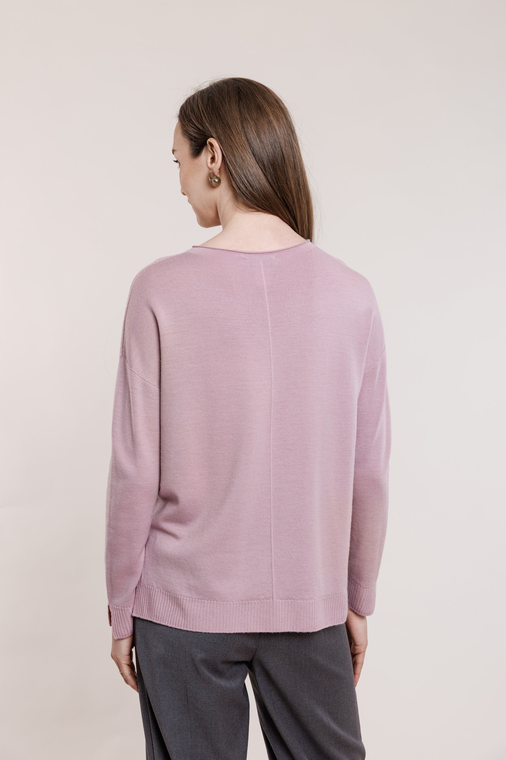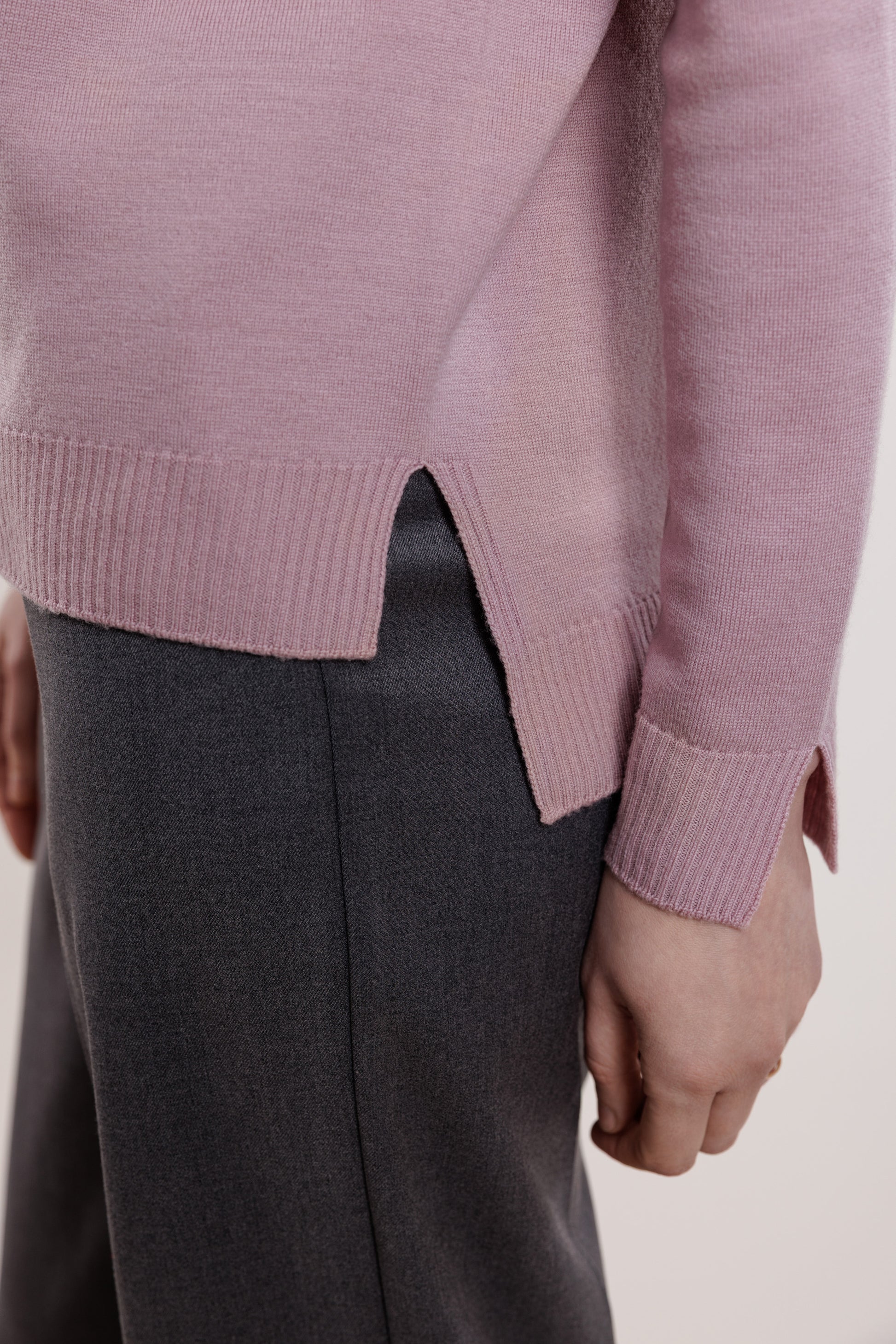 Soft, dense, ribbed knit sweater with small slits on the sides. Rounded neckline, small slits on the sleeves.
