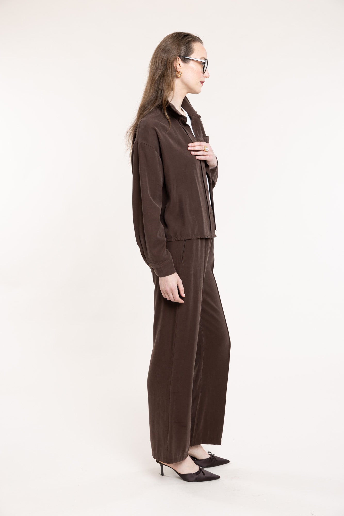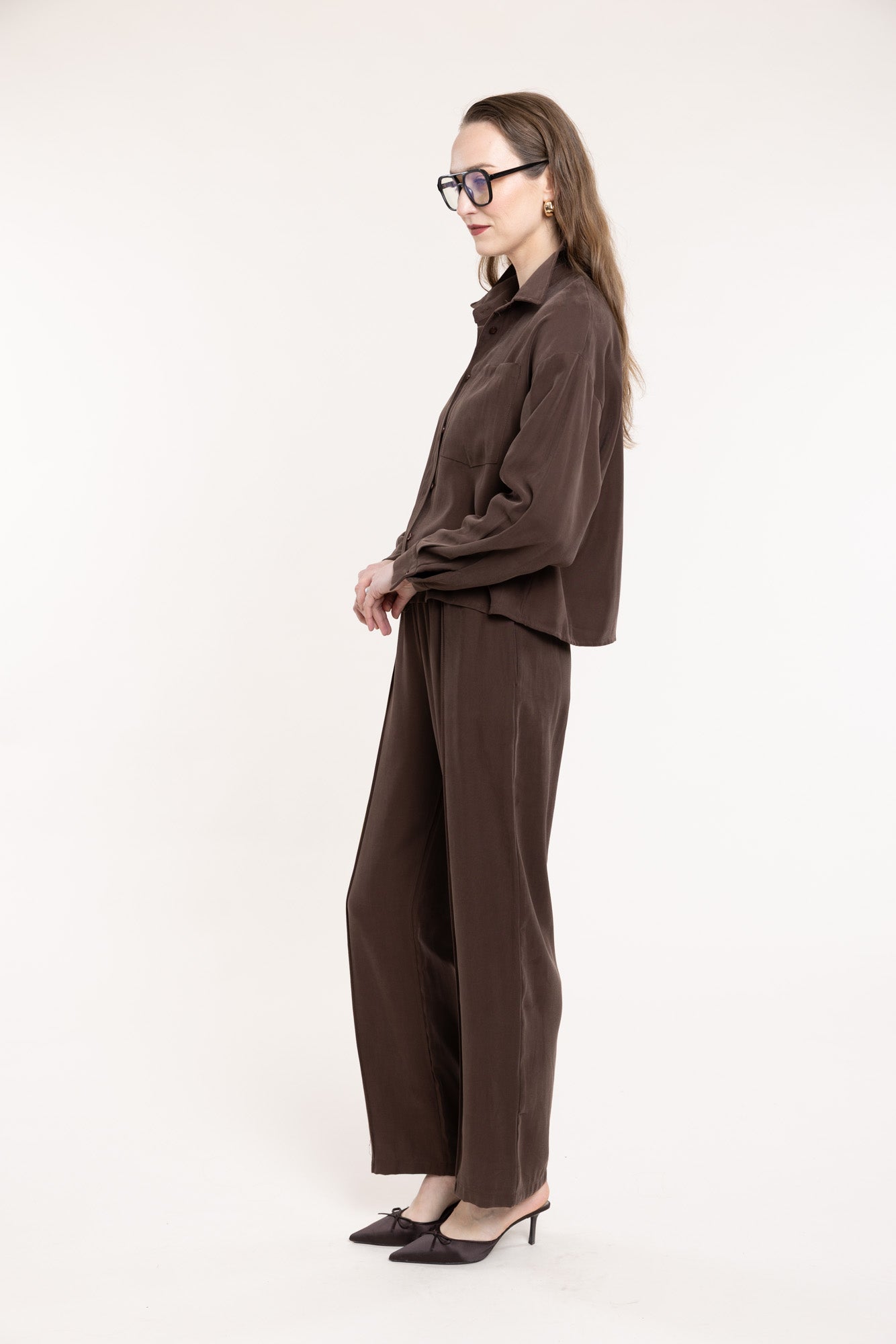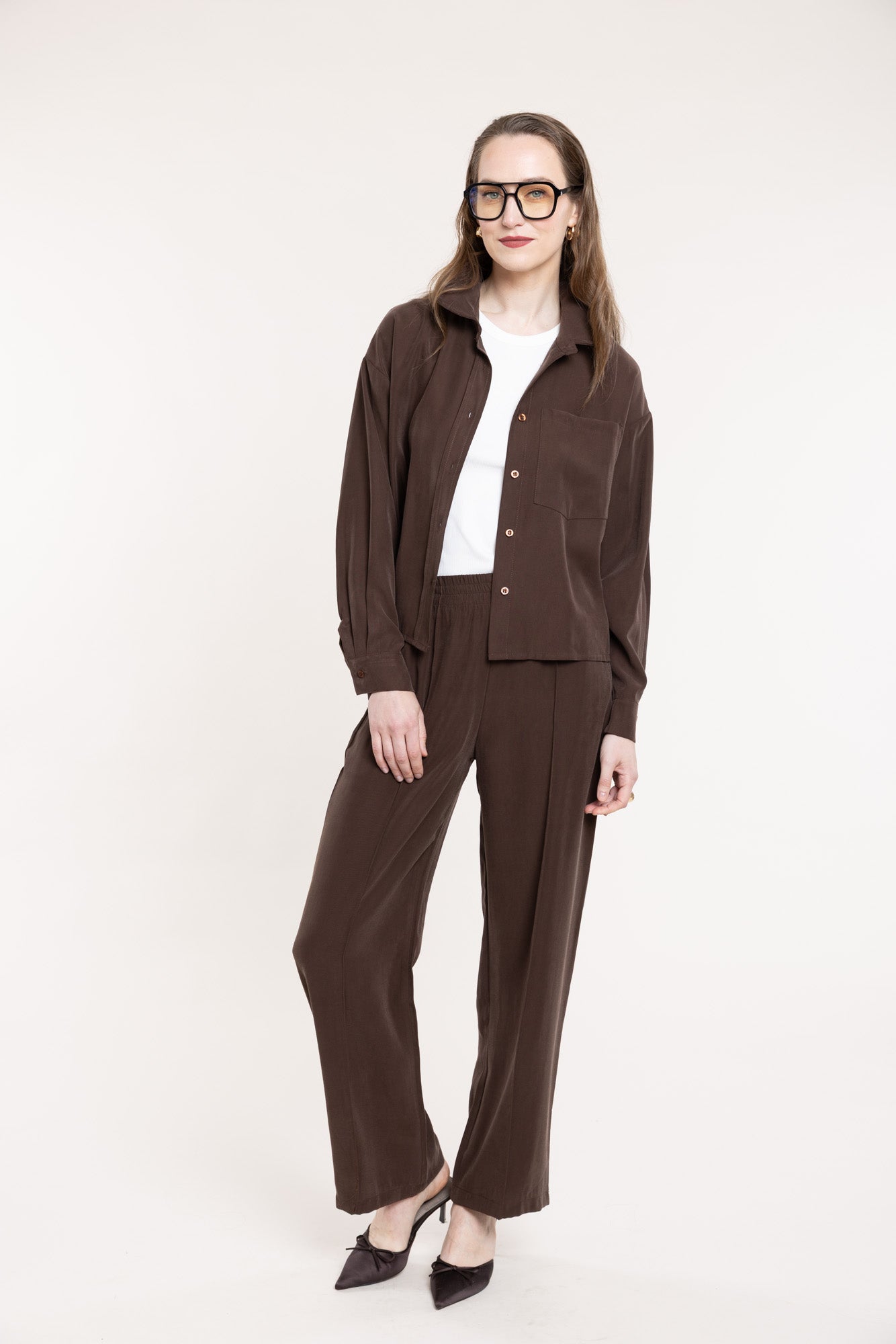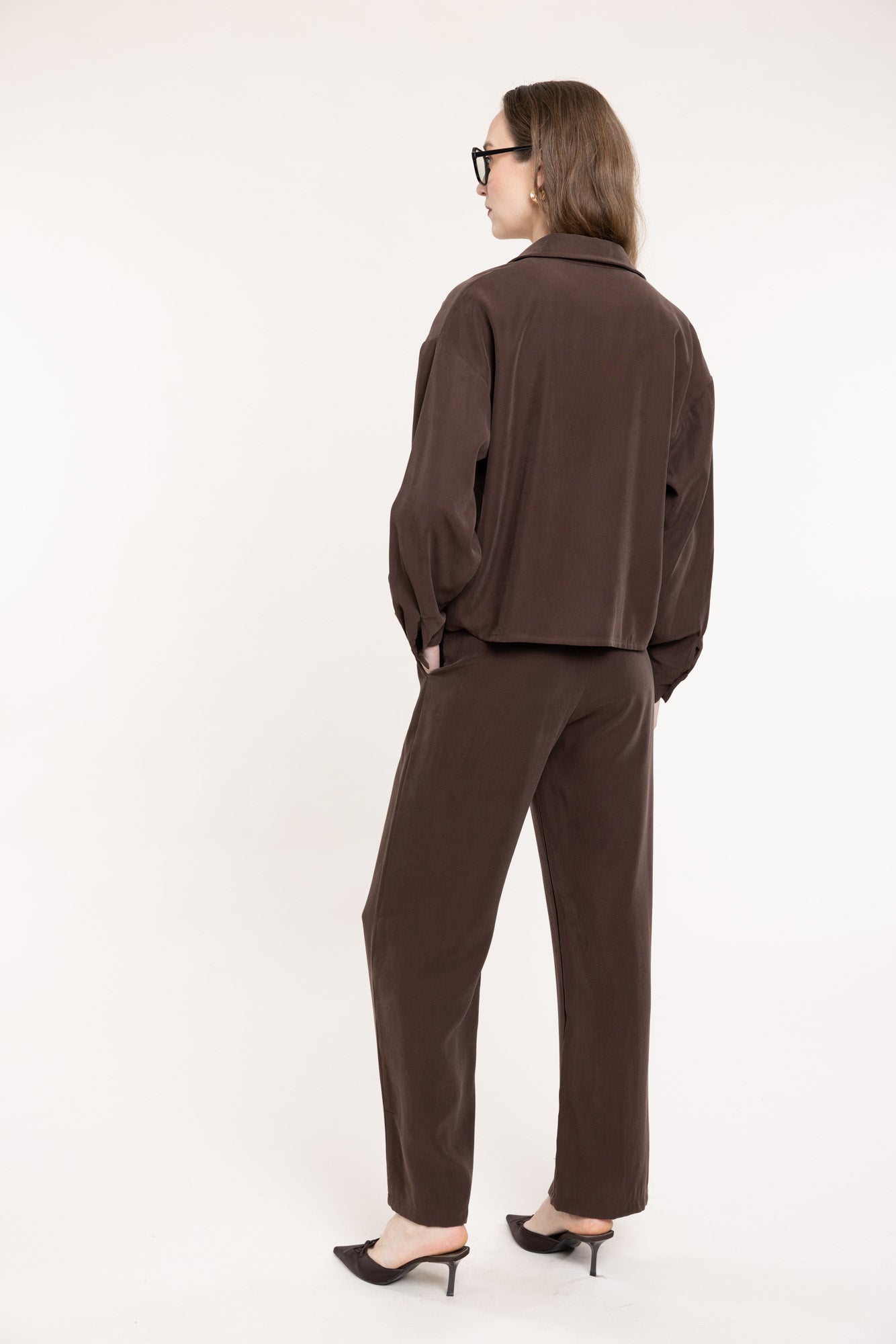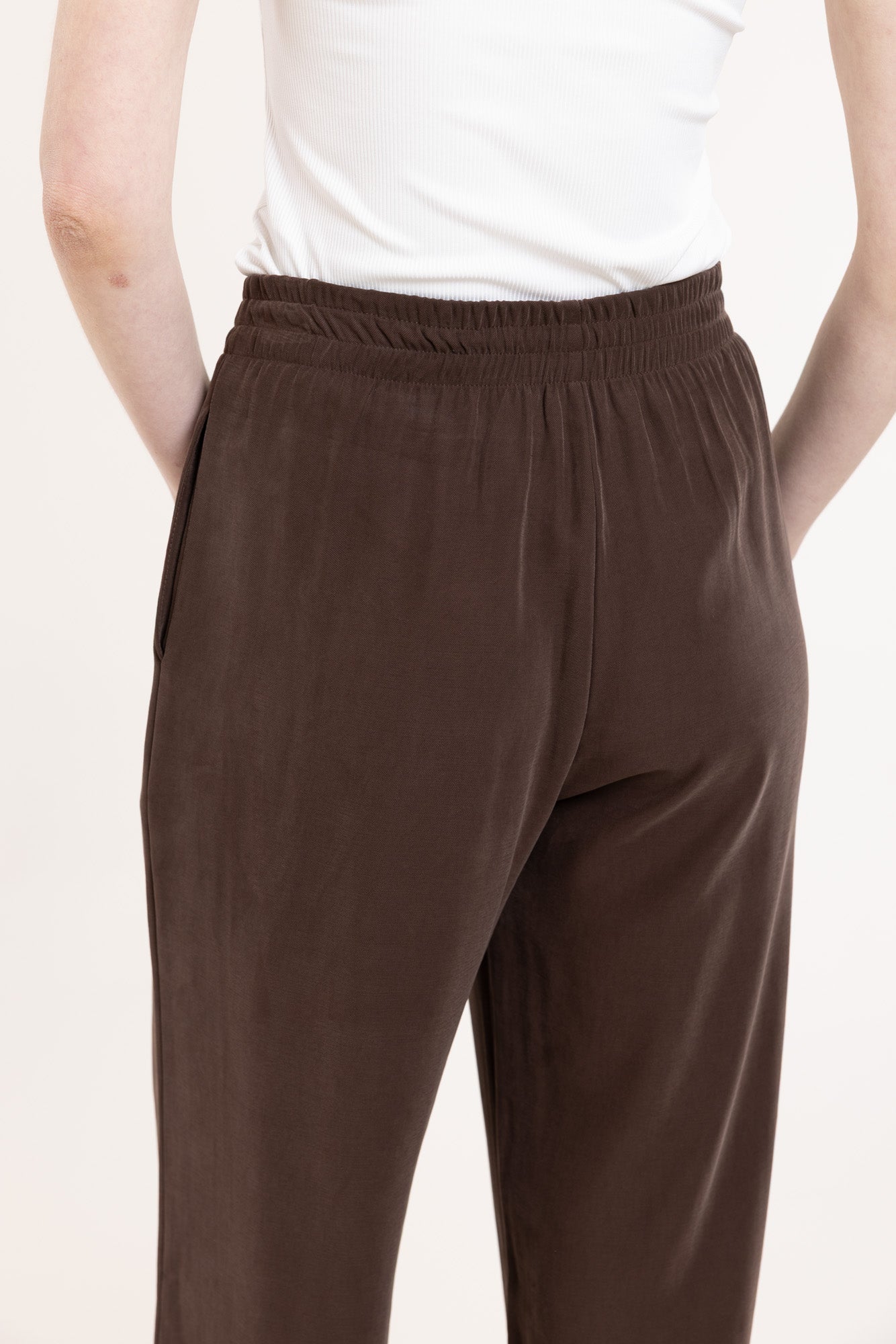 Loose-fitting trousers in chocolate brown with an elastic waistband and two convenient side pockets. The trousers have a straight cut. Perfectly match with a shirt of the same fabric, creating an elegant set.