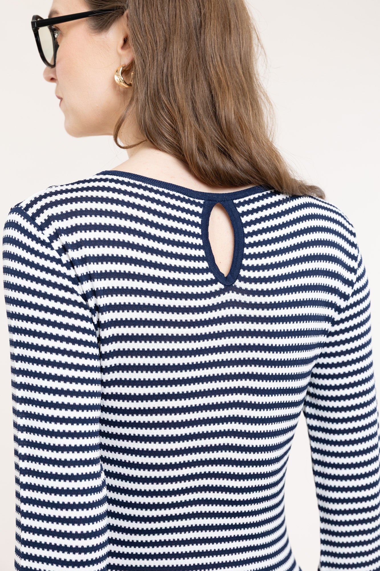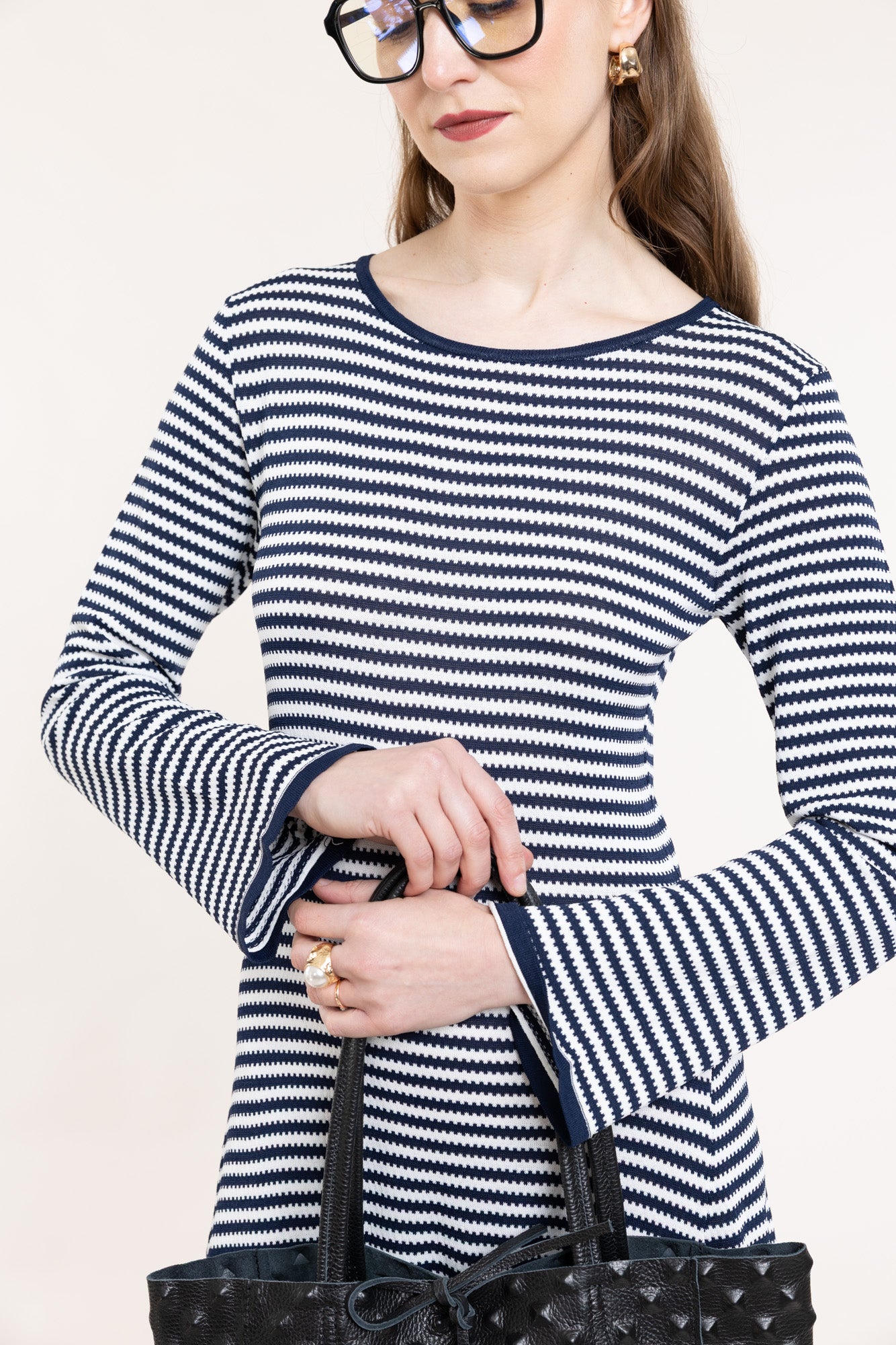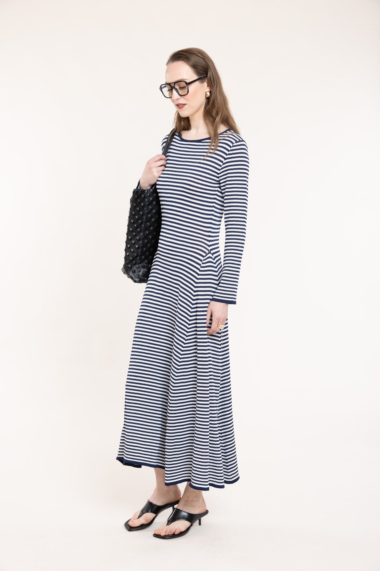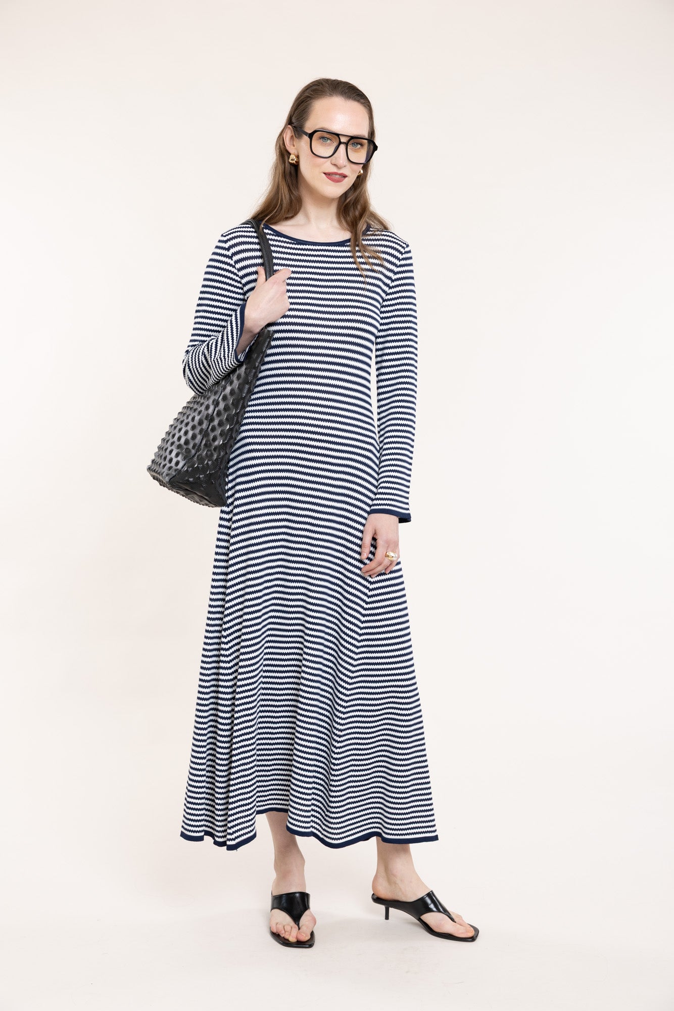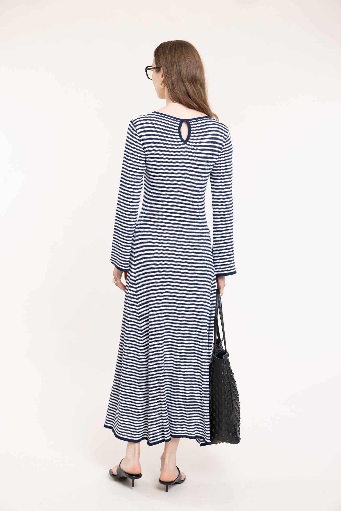 Striped knit dress in navy blue and white with a round neckline and long sleeves. Loose-fitting silhouette with a slightly flared bottom. Flared sleeves. Small opening with button at the back.