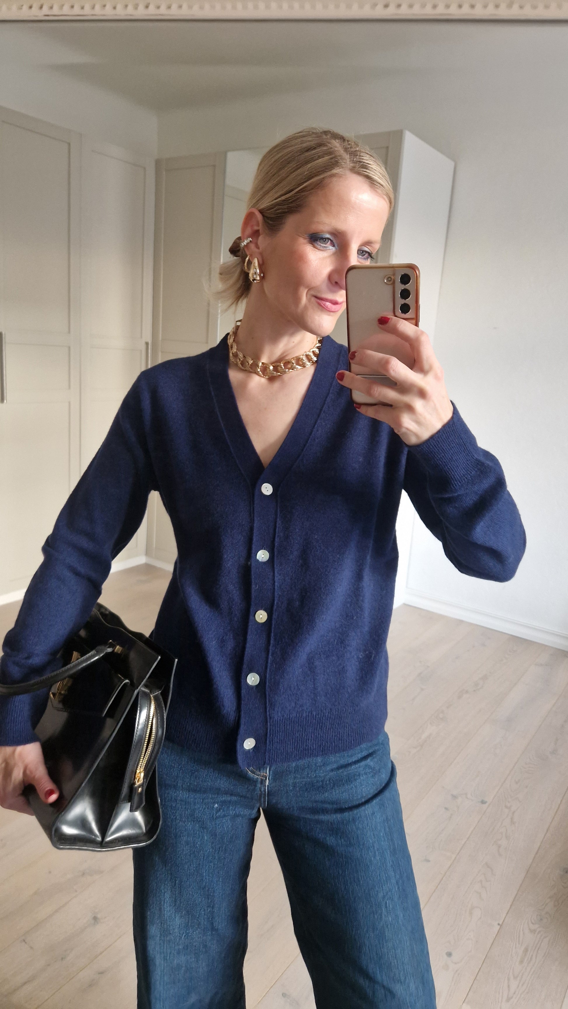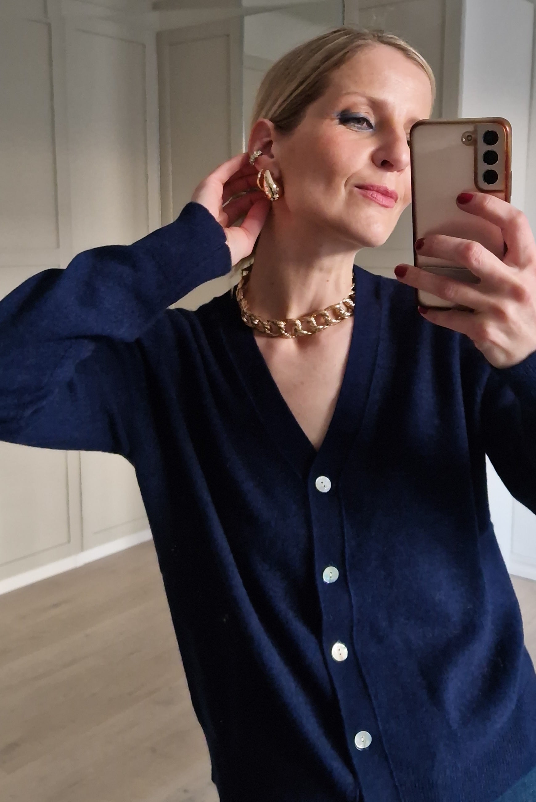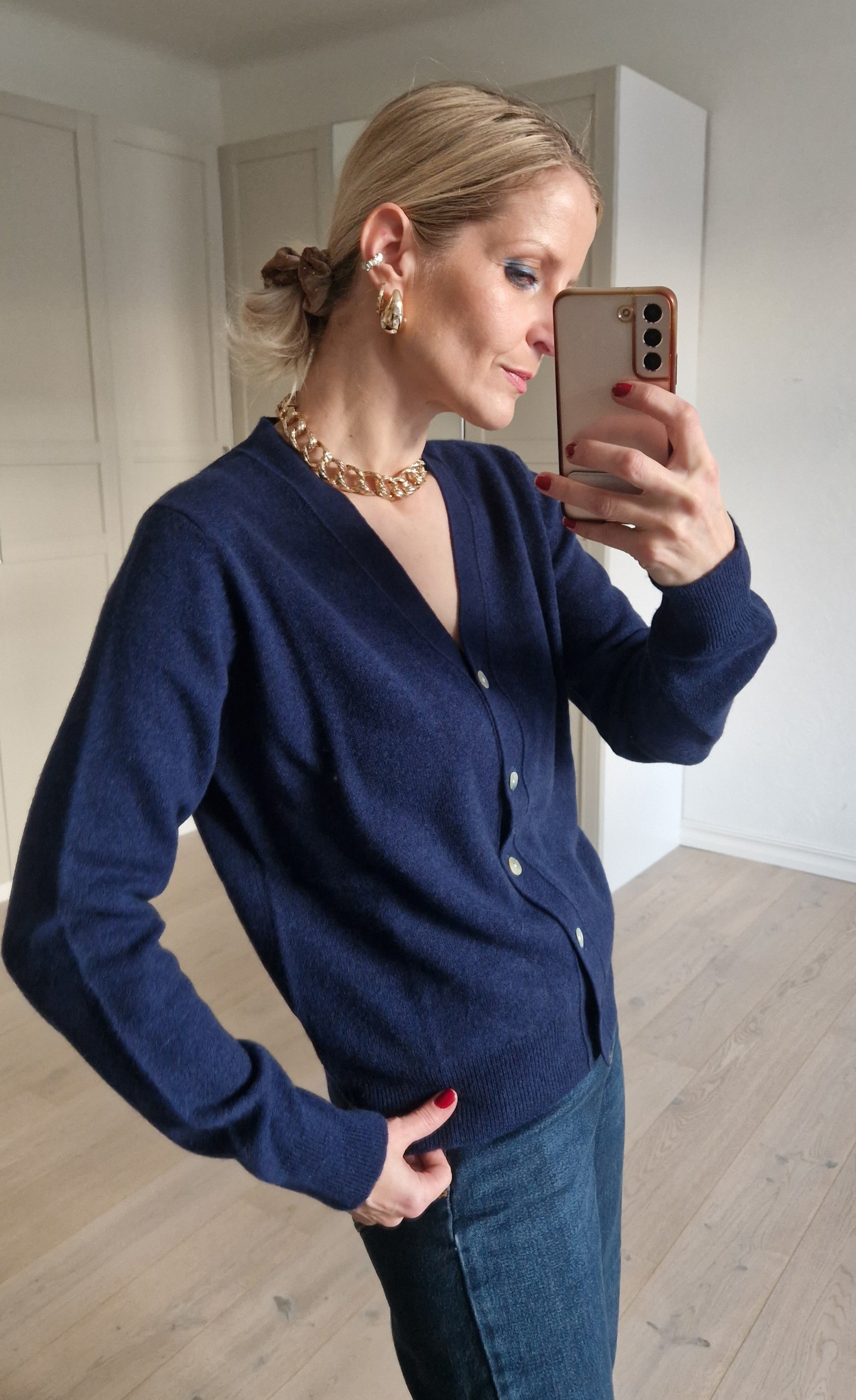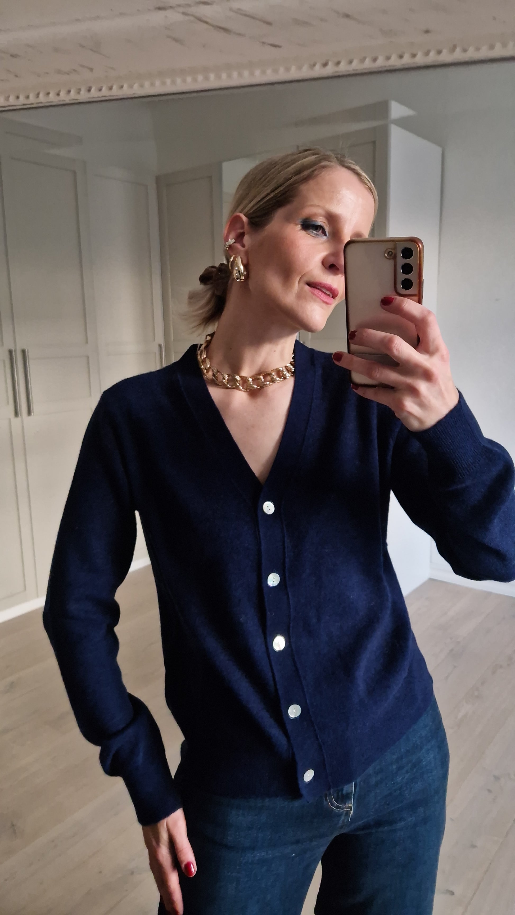 Navy blue jacket with a delicate button and long sleeves.