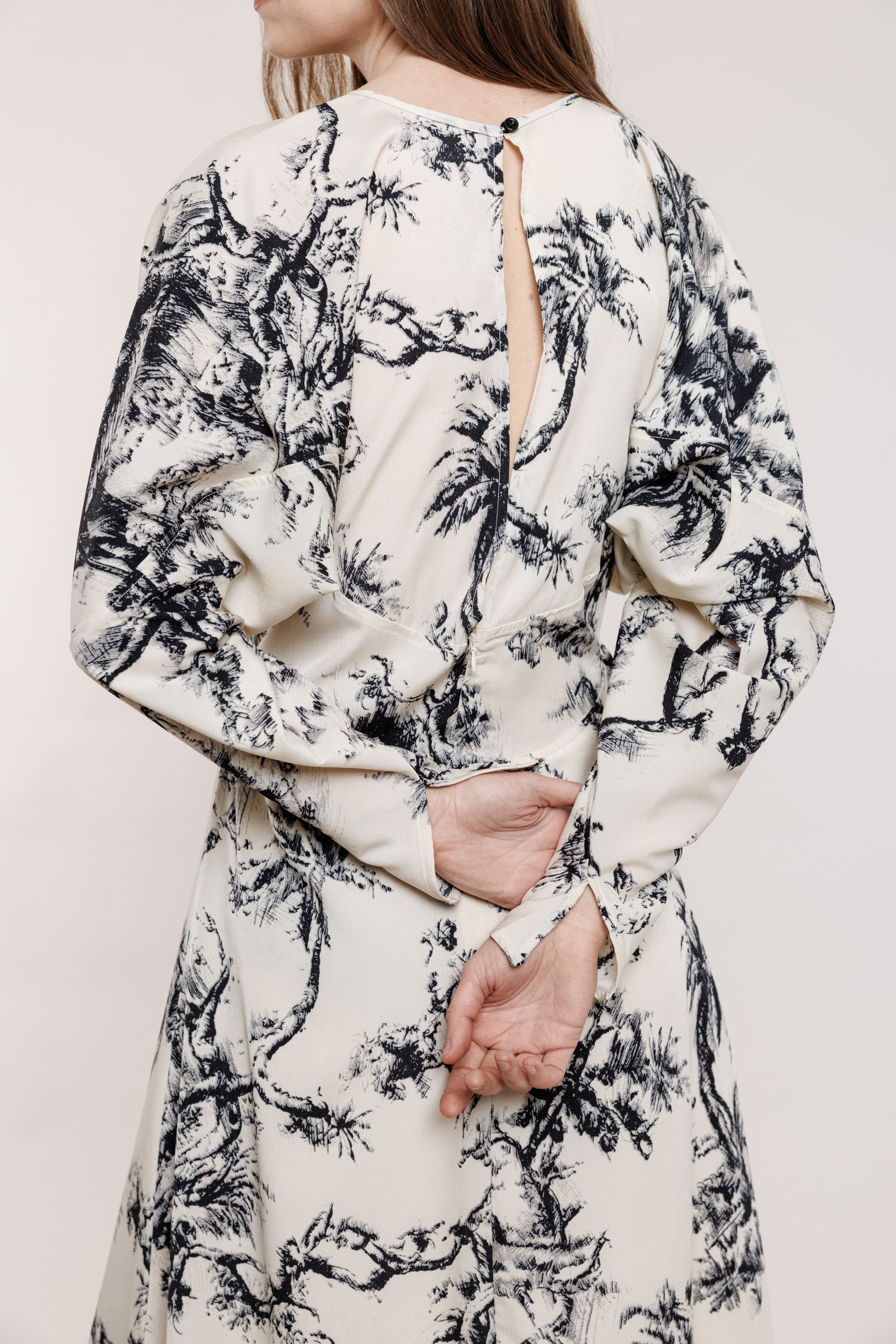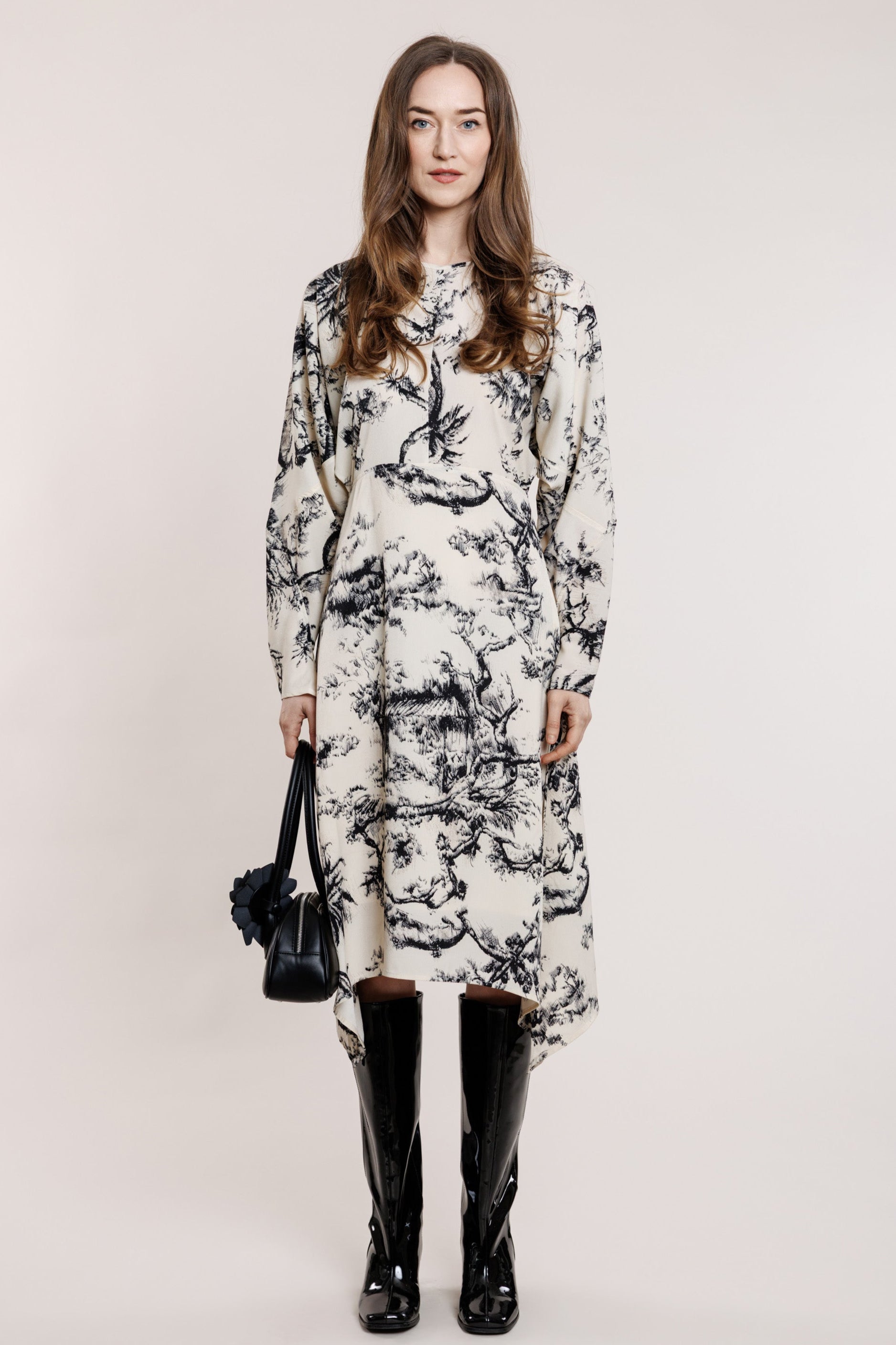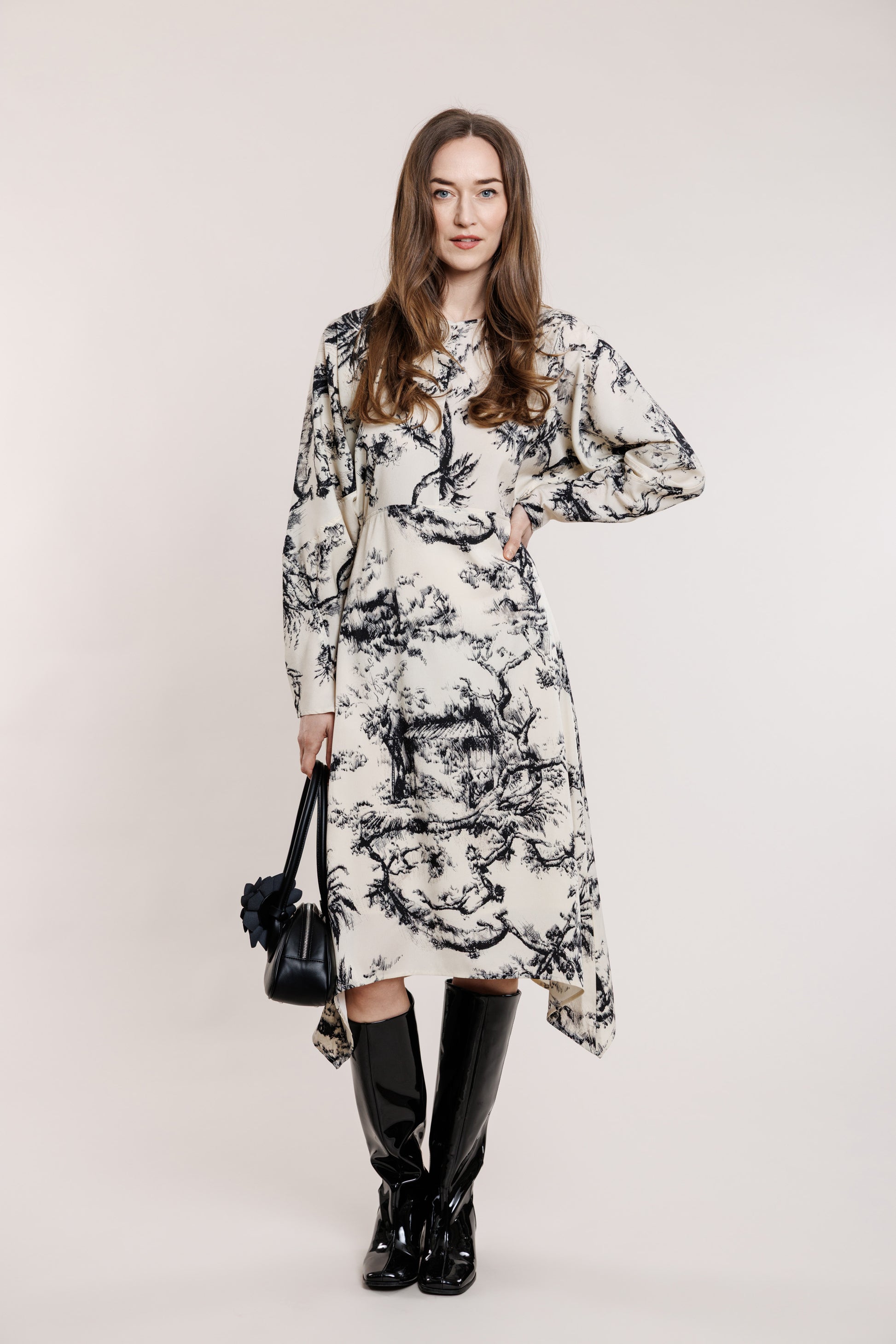 Brīvi krītoša kleita ar reglāna tipa piedurknēm, asimetriska svārku daļa. Mugurpusē aizdare ar rāvēslēdzēju, muguras daļā izgriezums. Svārku daļā ir odere.