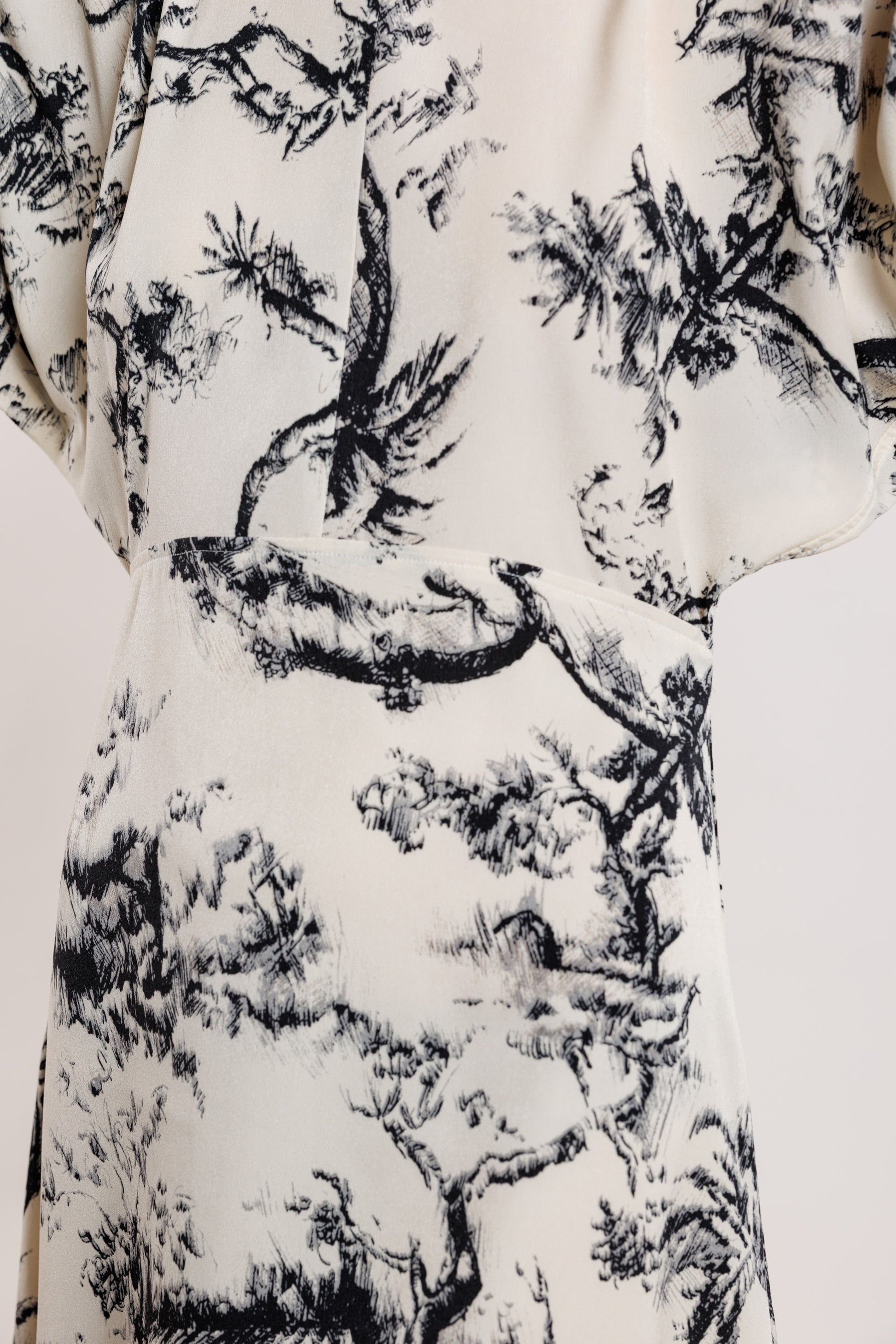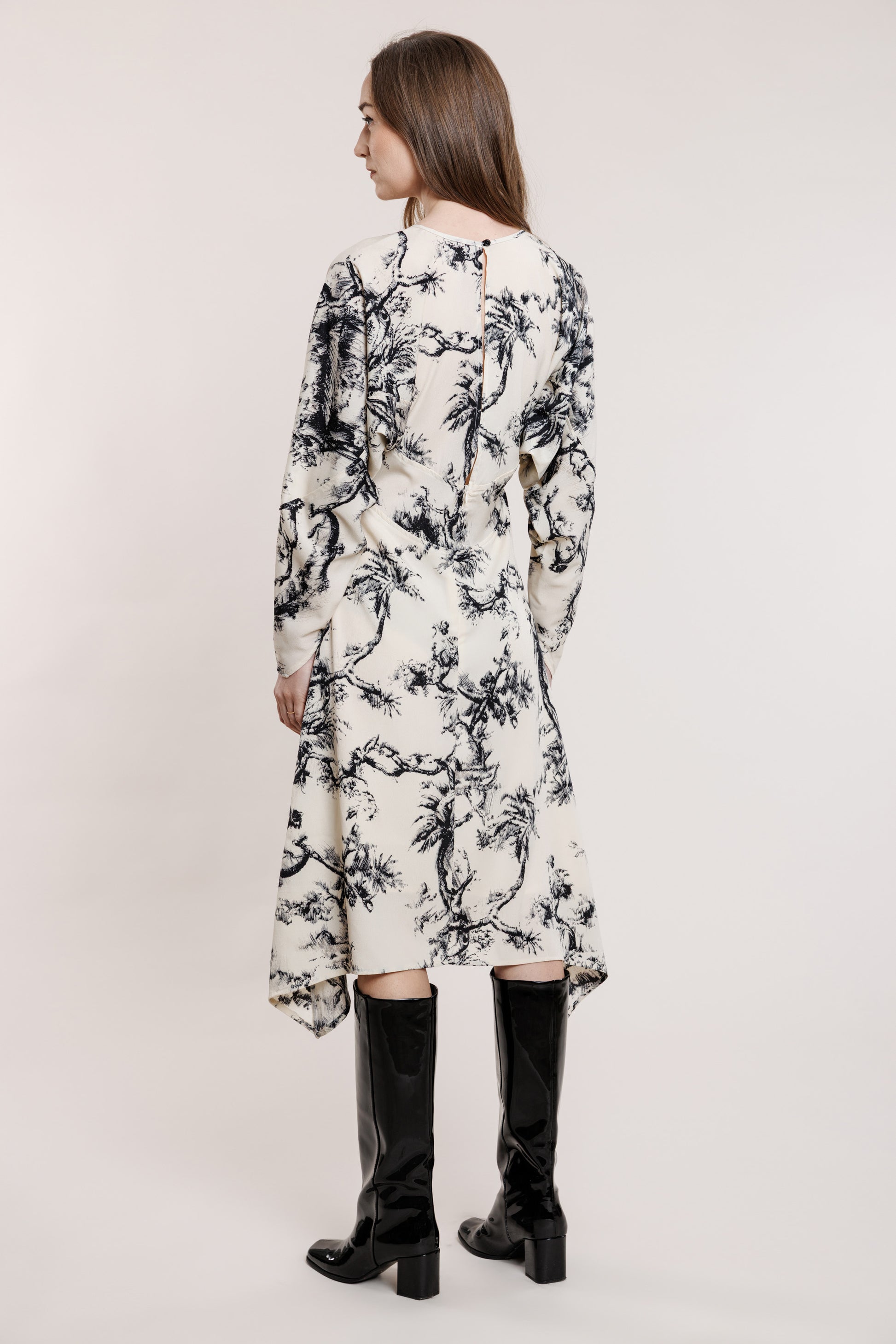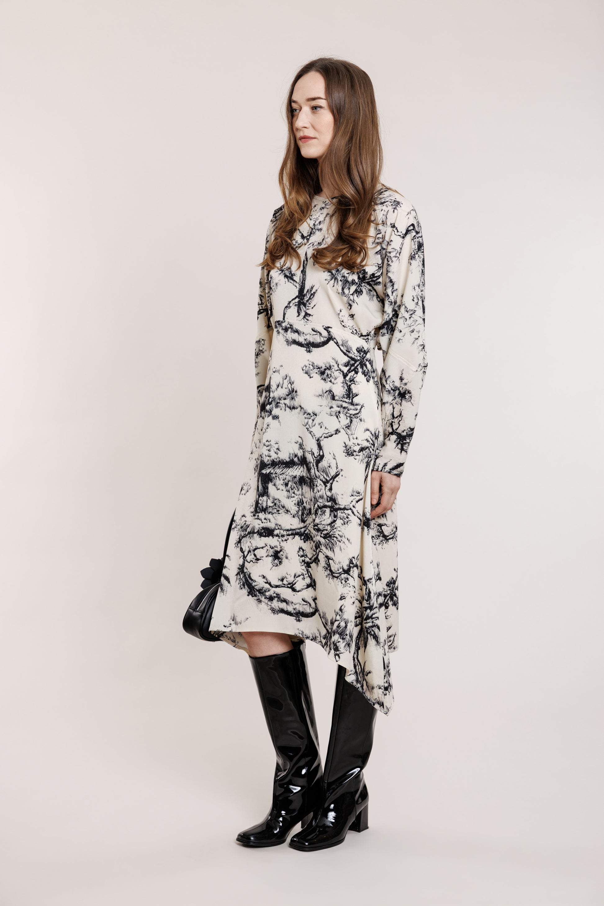 Brīvi krītoša kleita ar reglāna tipa piedurknēm, asimetriska svārku daļa. Mugurpusē aizdare ar rāvēslēdzēju, muguras daļā izgriezums. Svārku daļā ir odere.