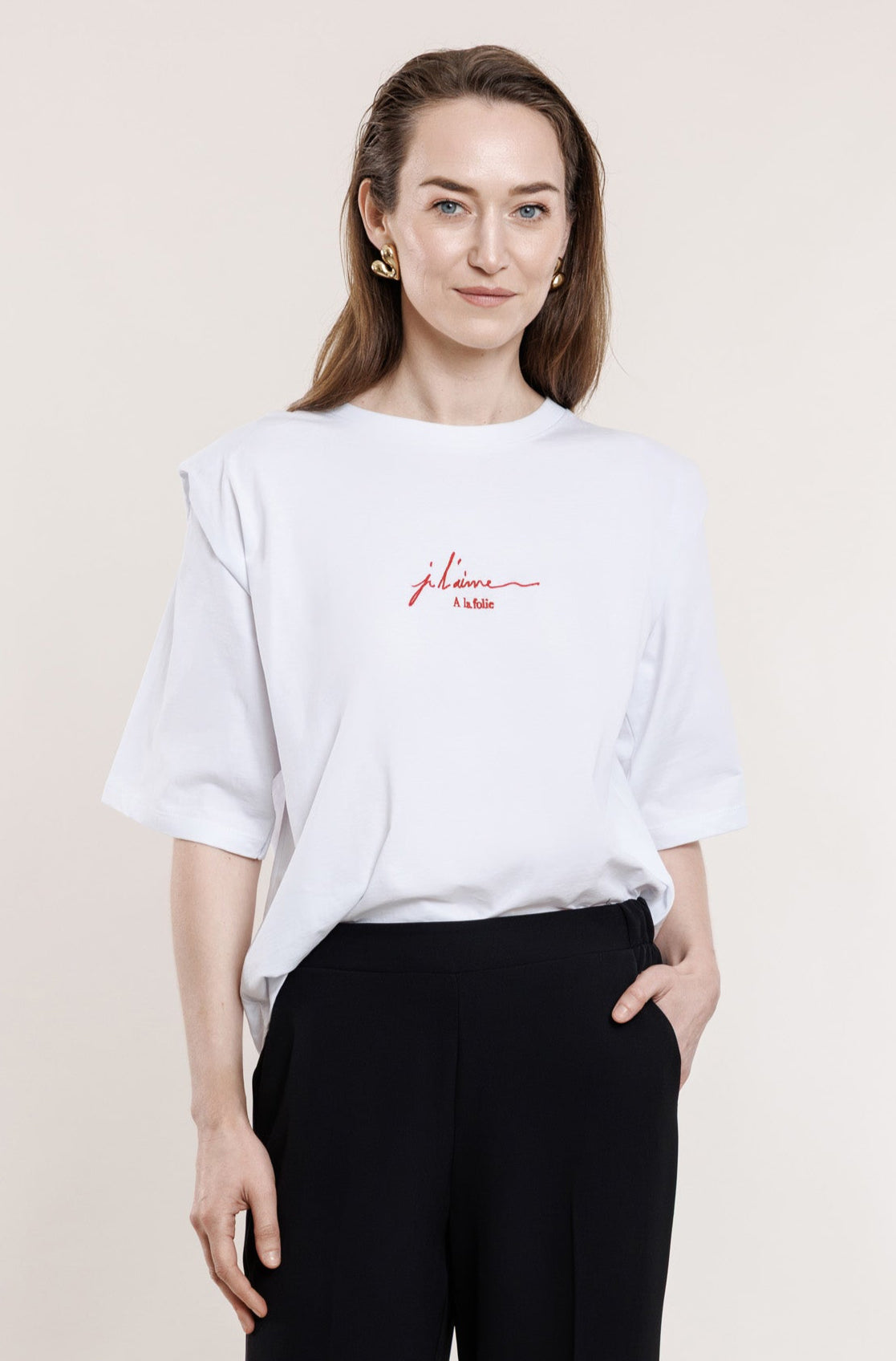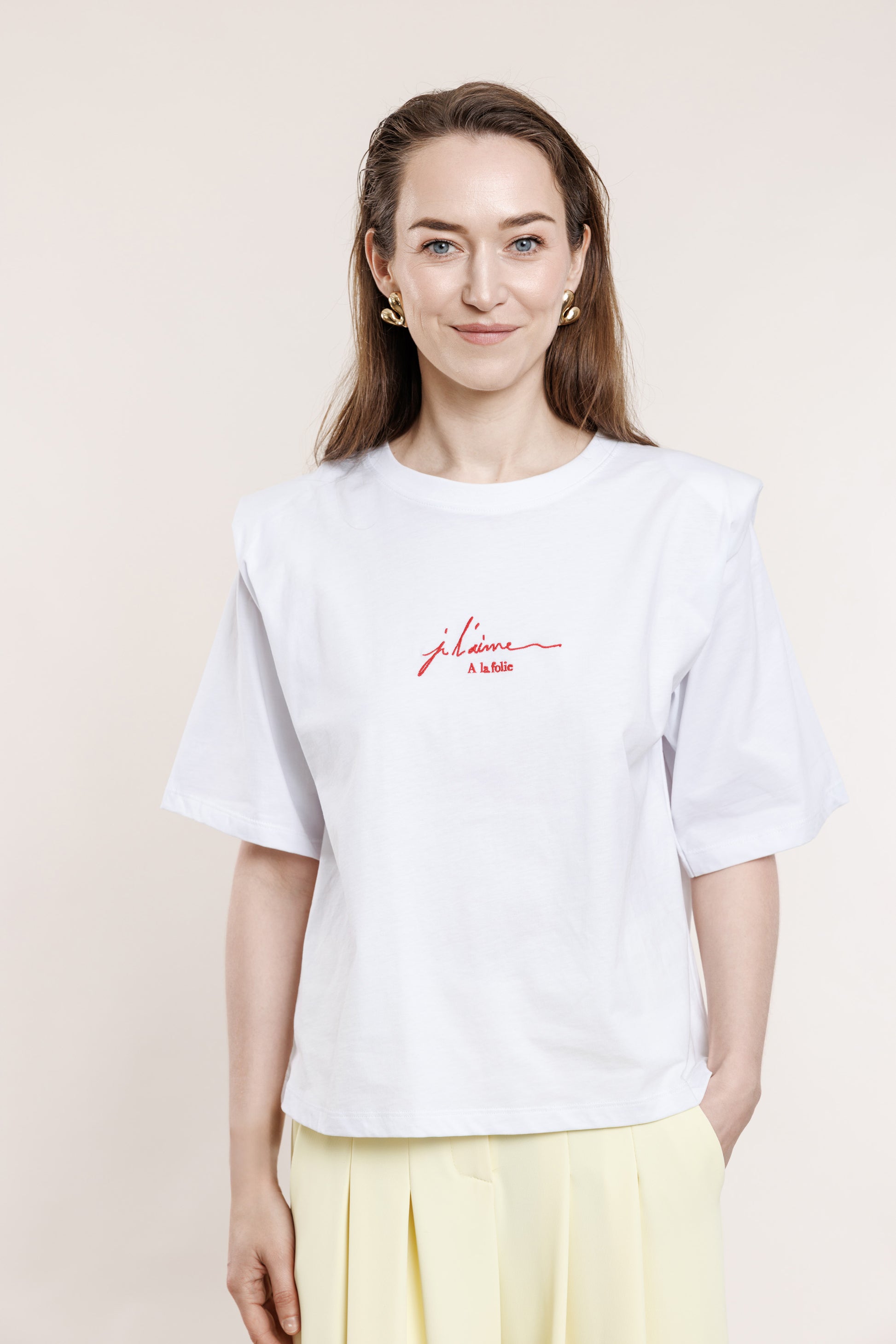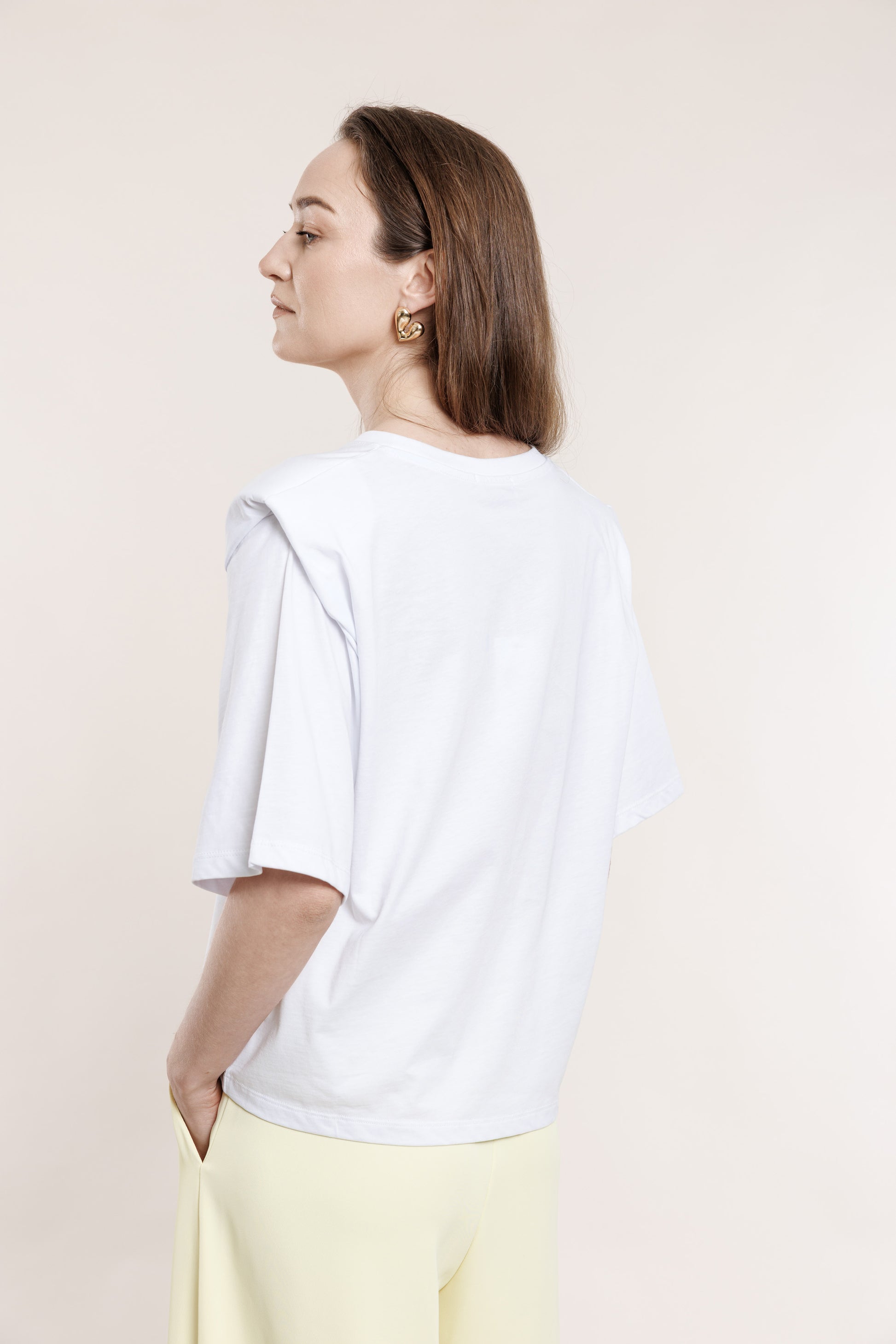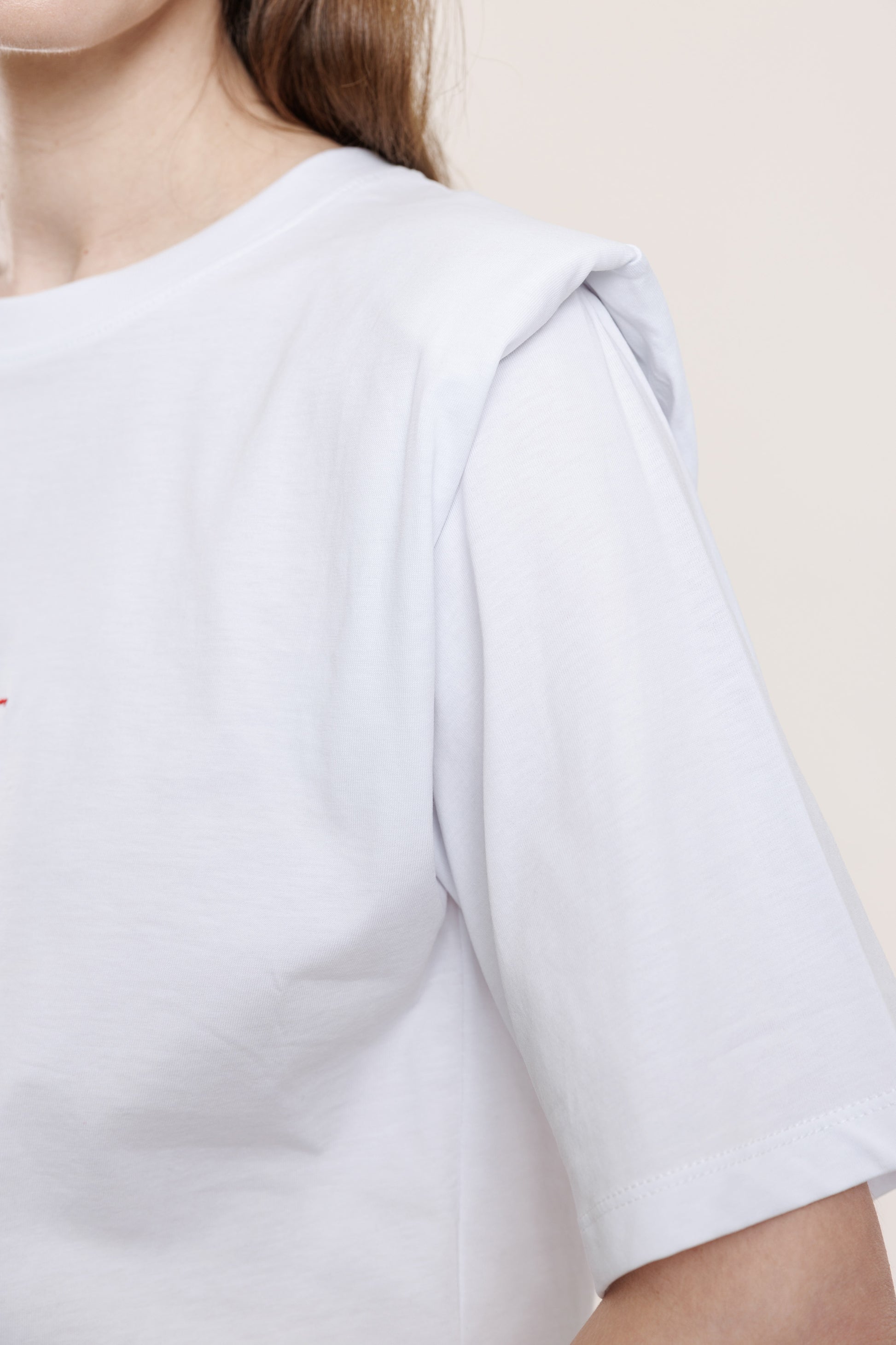 Balts T krekls ar uzrakstu un maziem polsteriem plecu daļā.