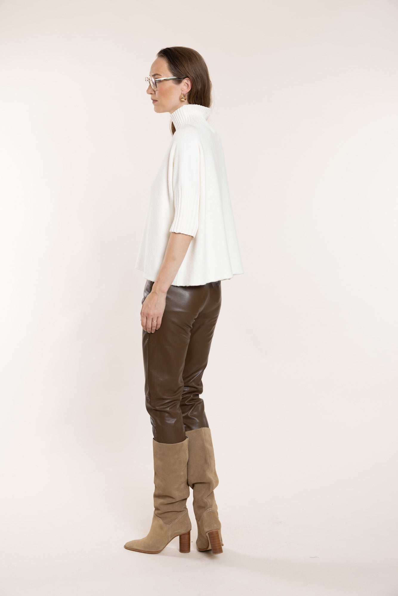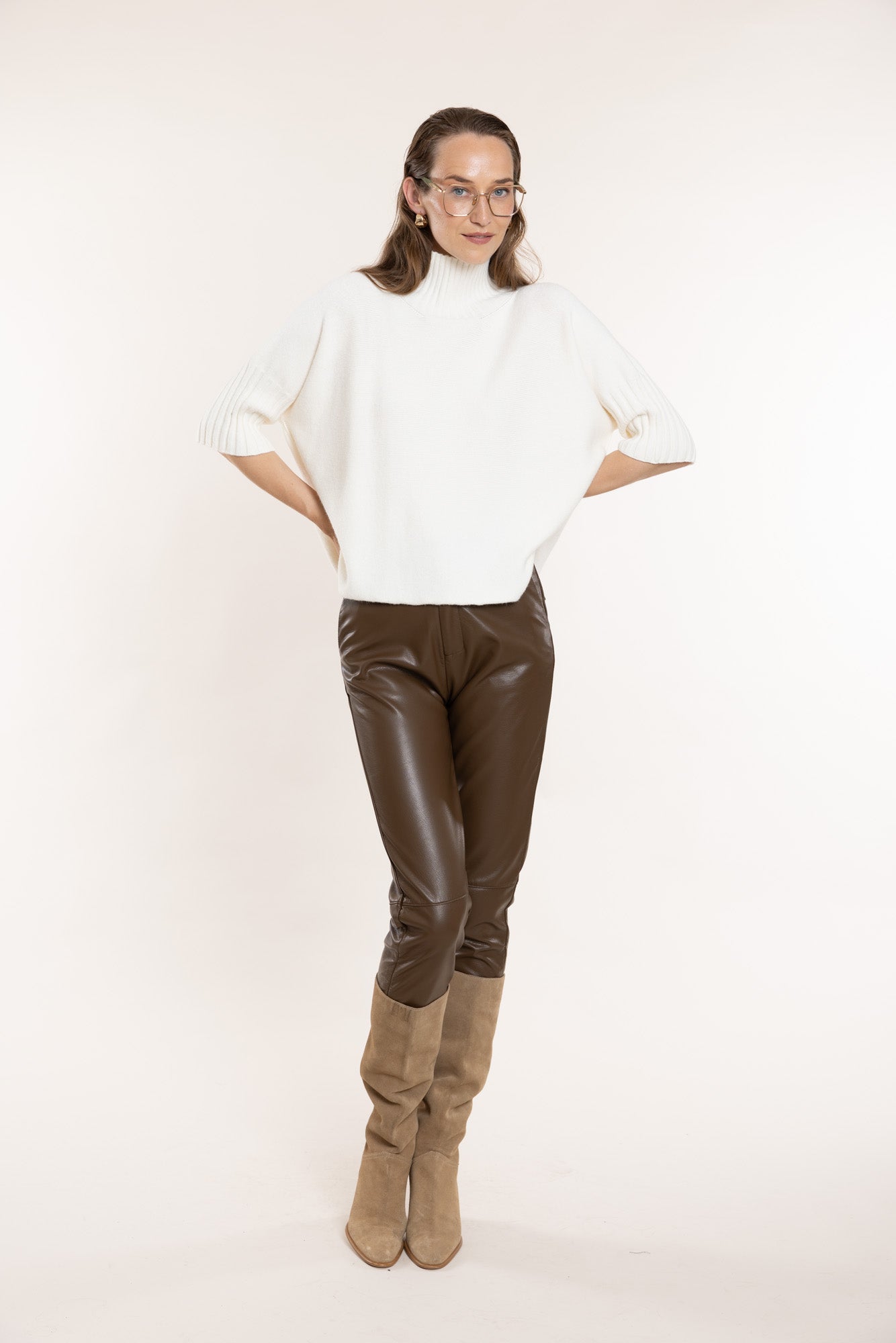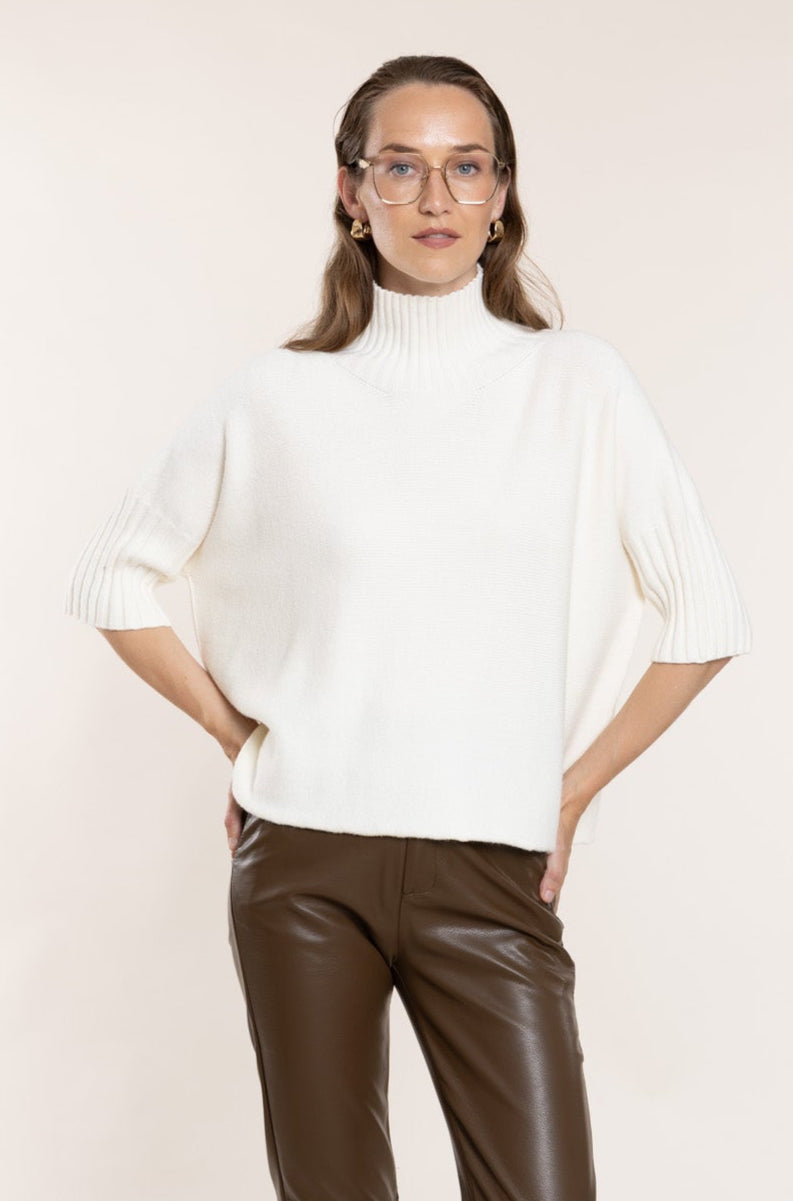Balts džemperis ar rievoto maliņu, 3/4 piedurknes, oversize korpuss. Kakla daļa arī nolokāma kā eleganta maliņa.
