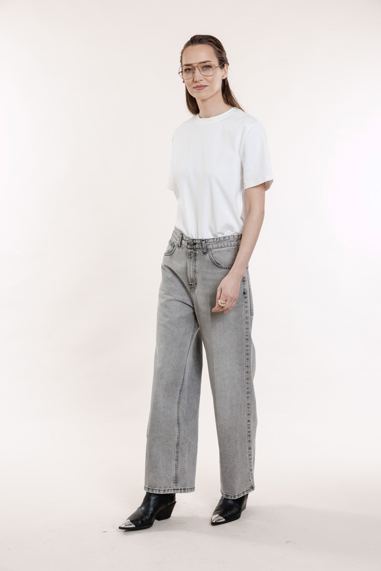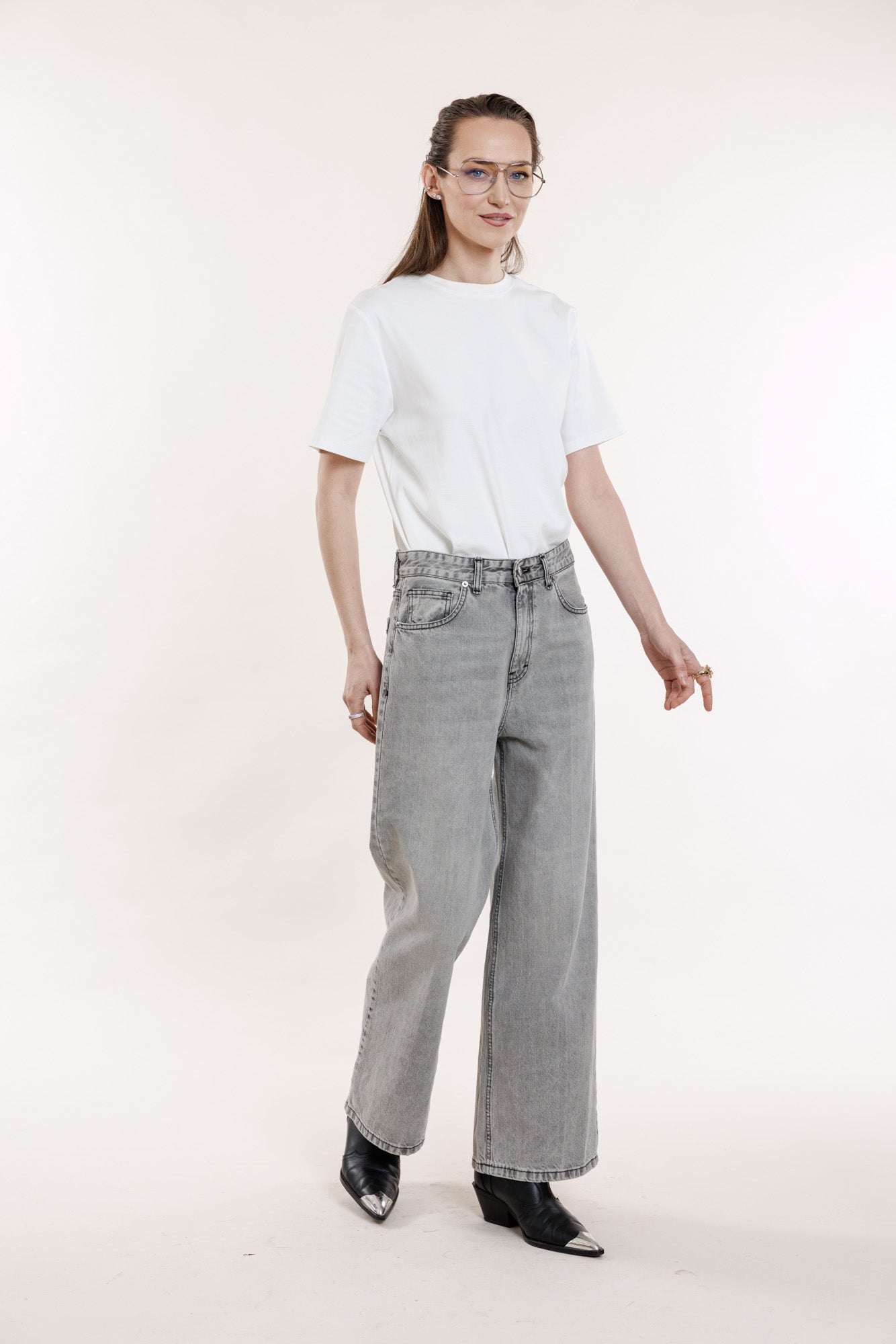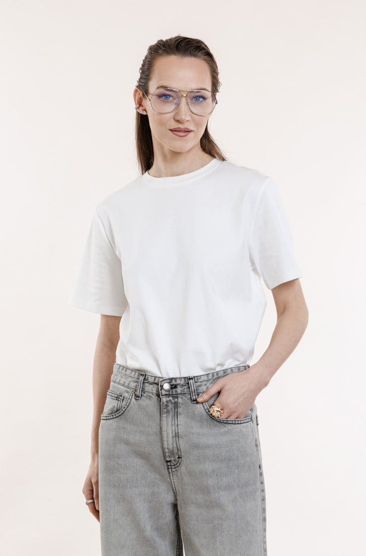 Balts T krekls no blīvas trikotāžas ar īso piedurkni un kakla apdari. Krekla korpus ir taisns un brīvs, garums 67cm.