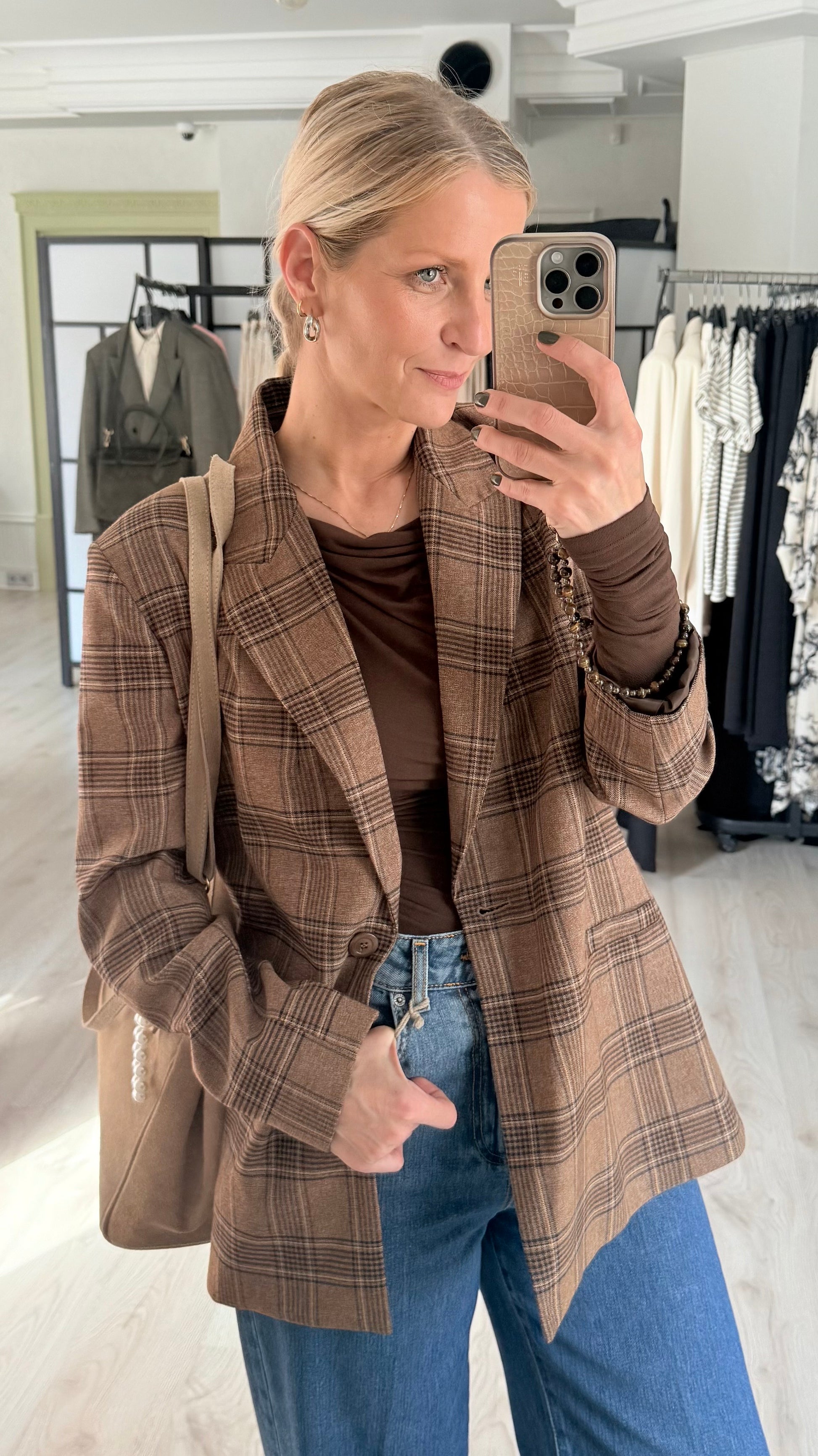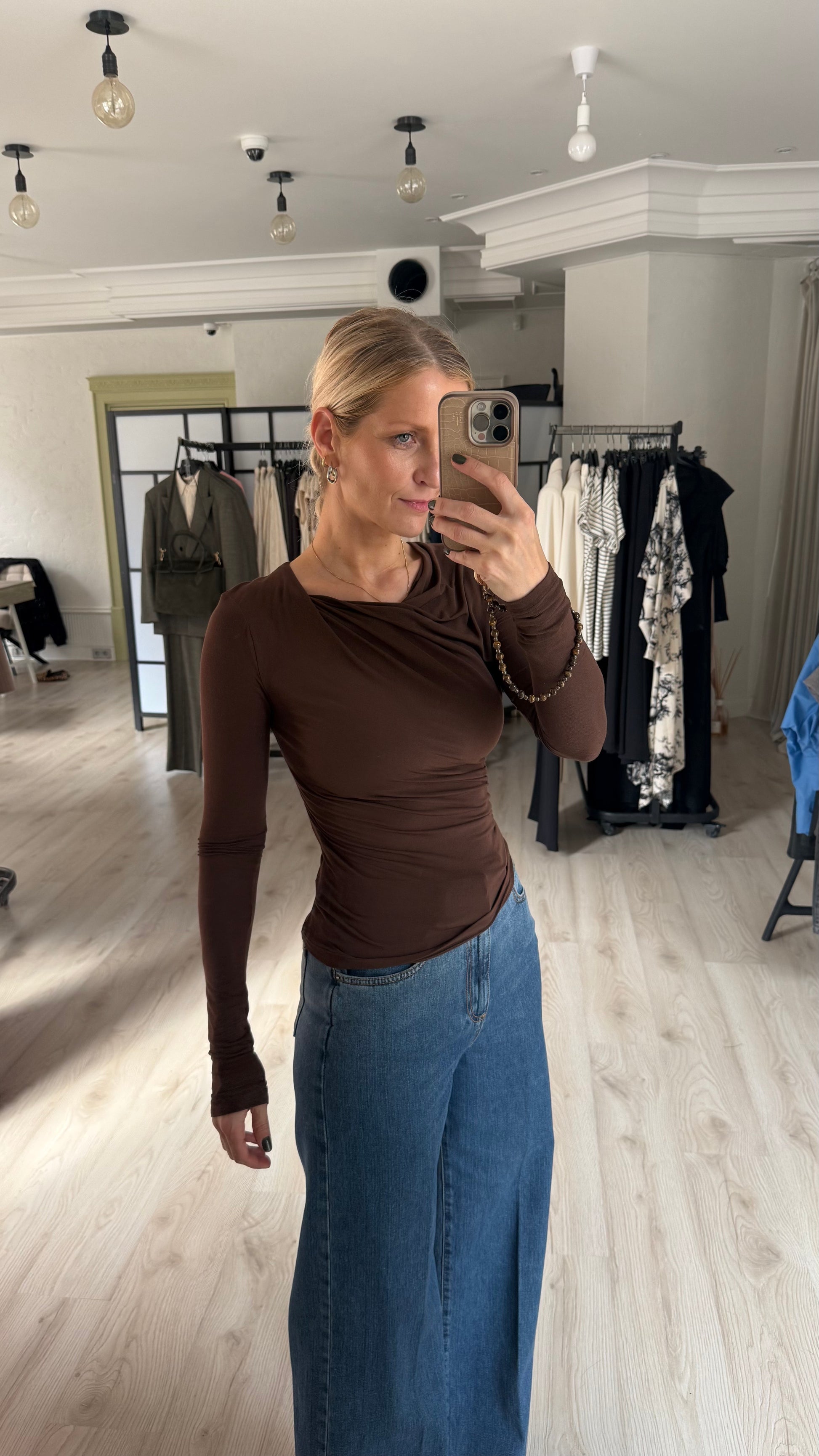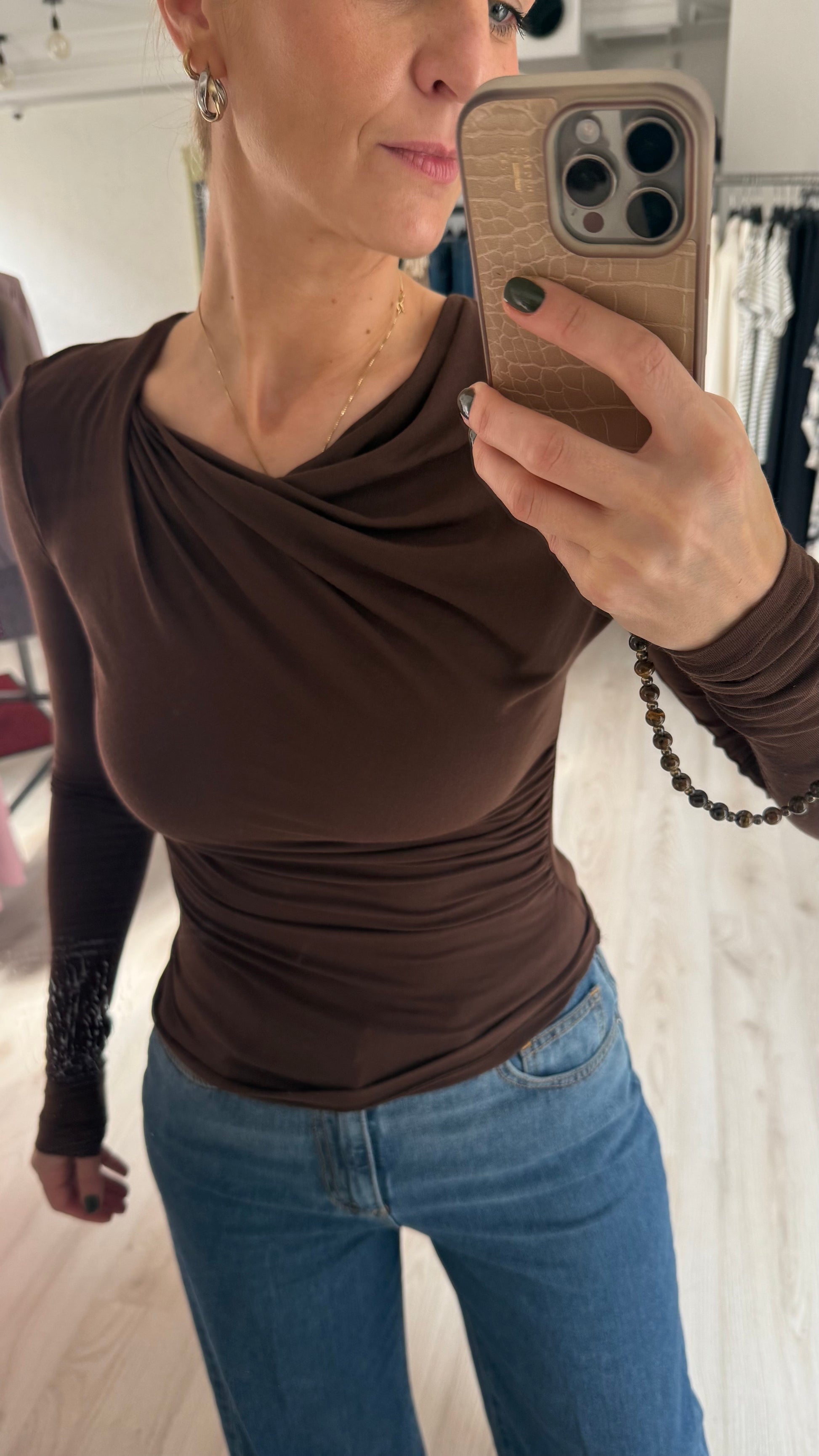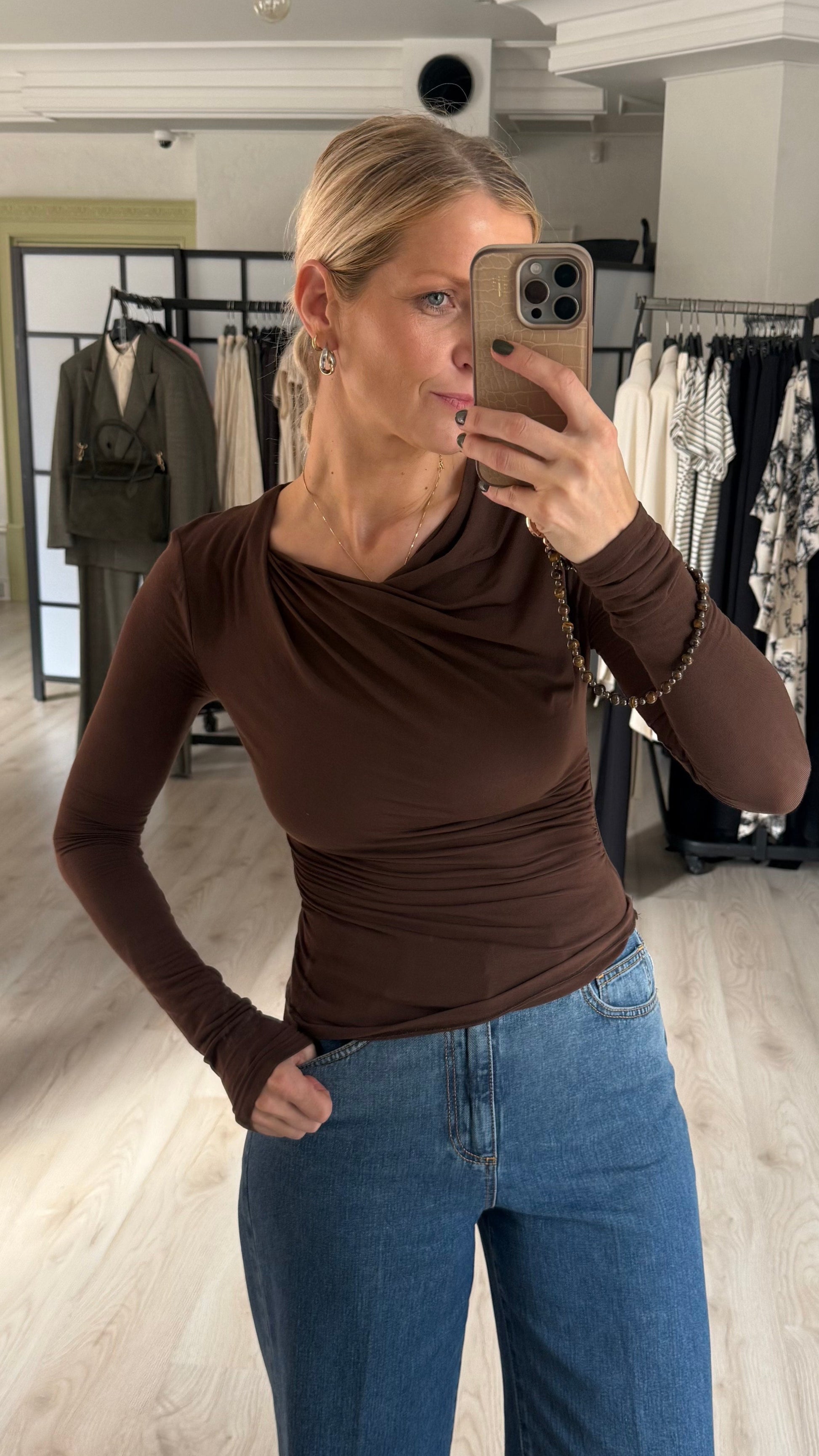 Riekstu brūns trikotāžas tops ar nelielu drapēriju dekolte un vienā sānu daļā. Garas piedurknes. Garrocim ļoti šaurs, piekļāvīgs siluets un samtaina faktūra.