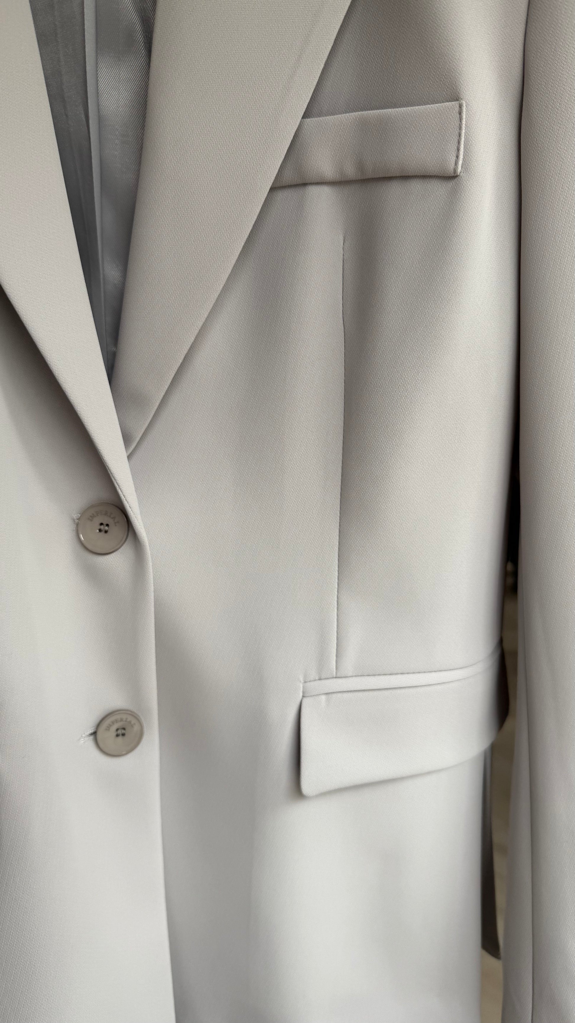 Gaiši pelēka krepa žakete ar oderi, maziem polsteriem un vienrindu aizdares pogām.