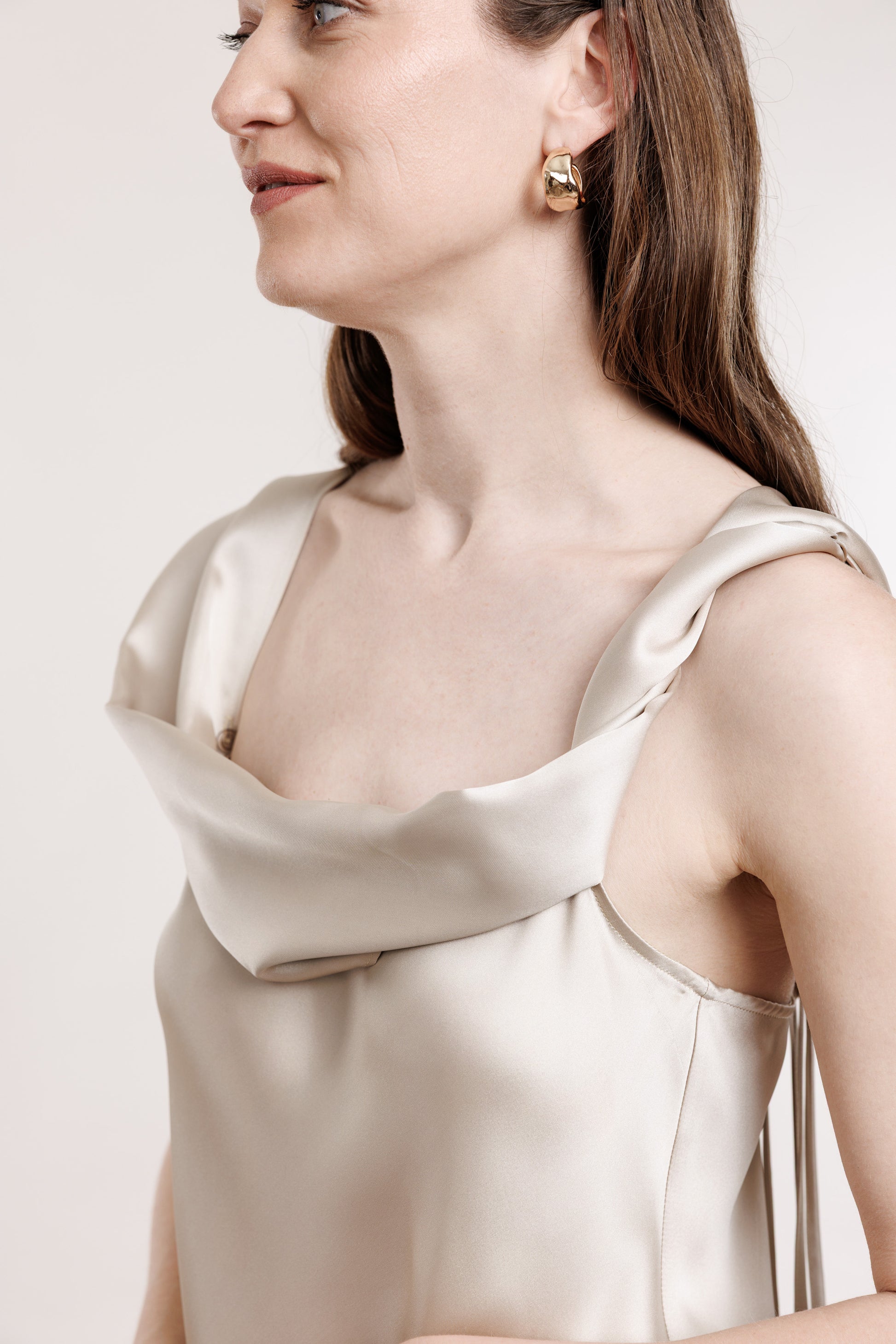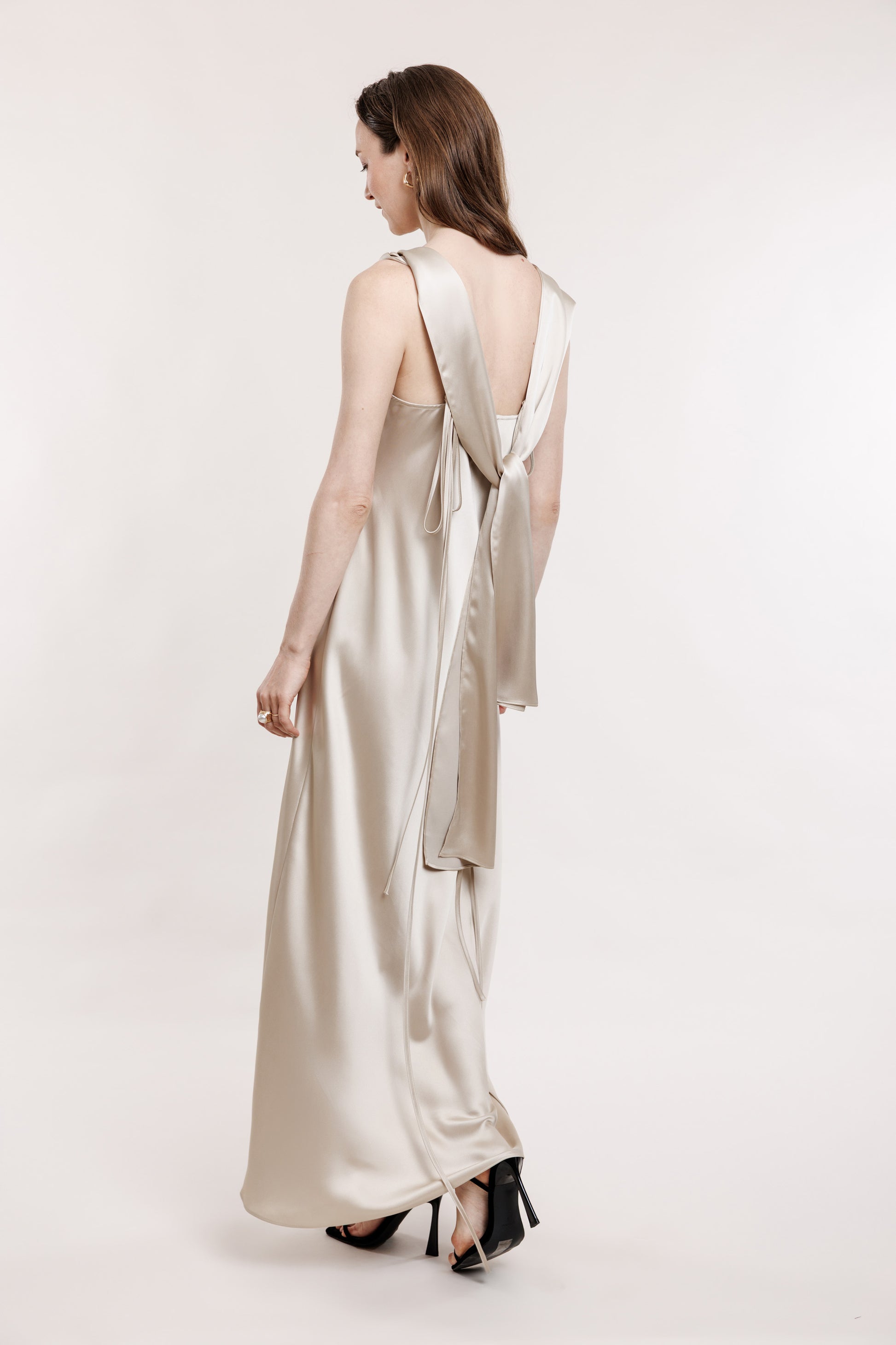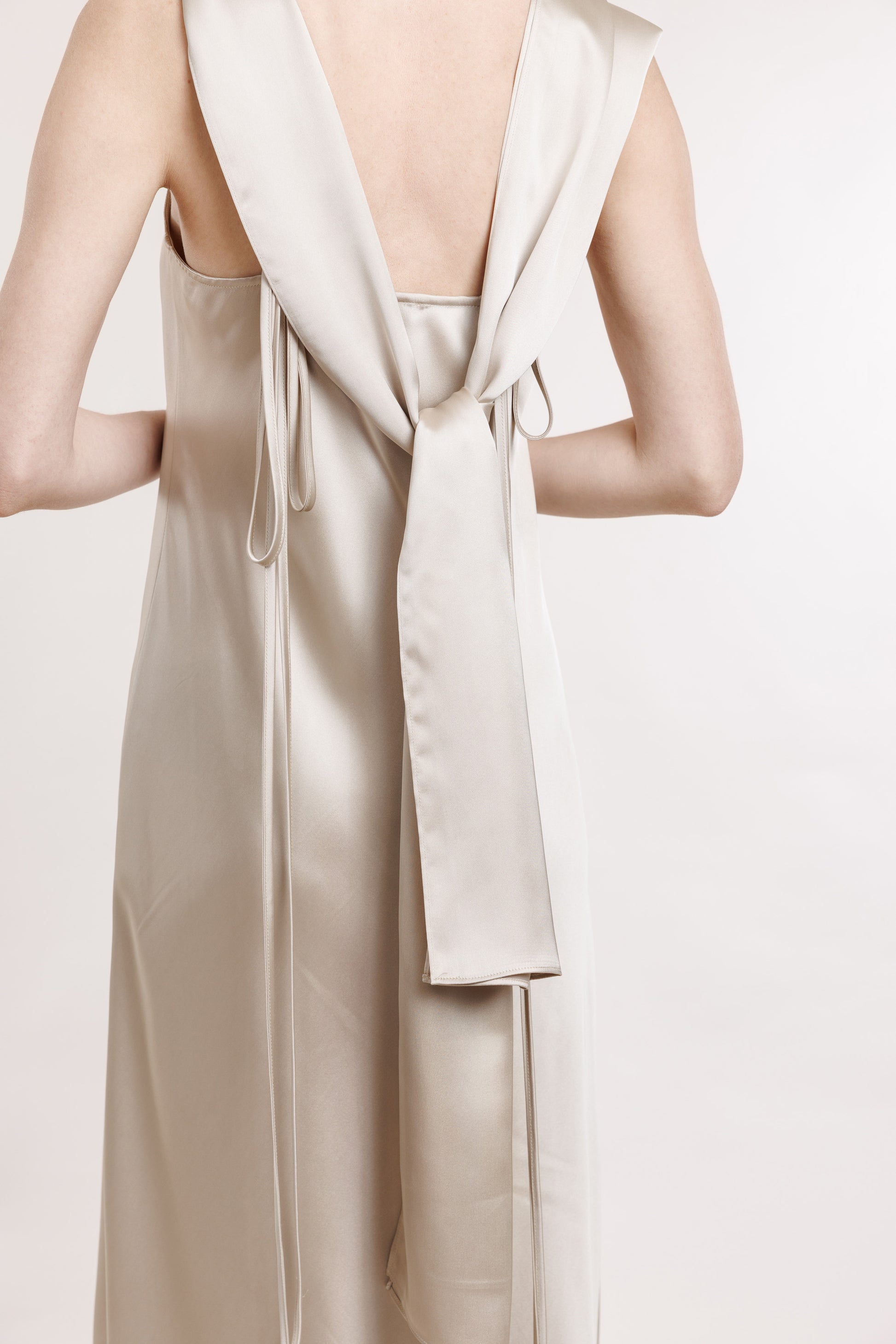 Garais slips šampanieša tonī ar saienāmā plek lentām un piepogājamo kleitas lentu. Lentu var nēsāt gan kā dekoru, gan kā jostu.
