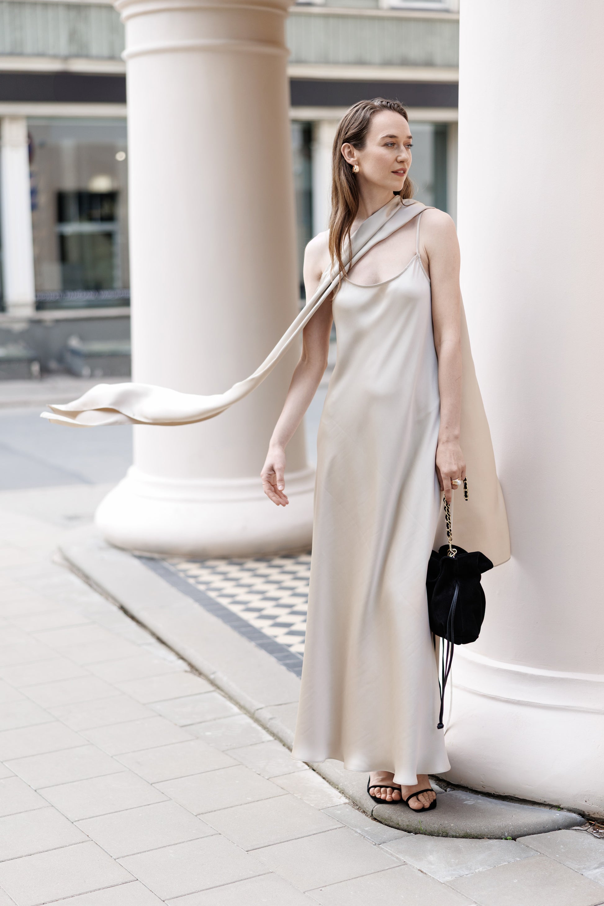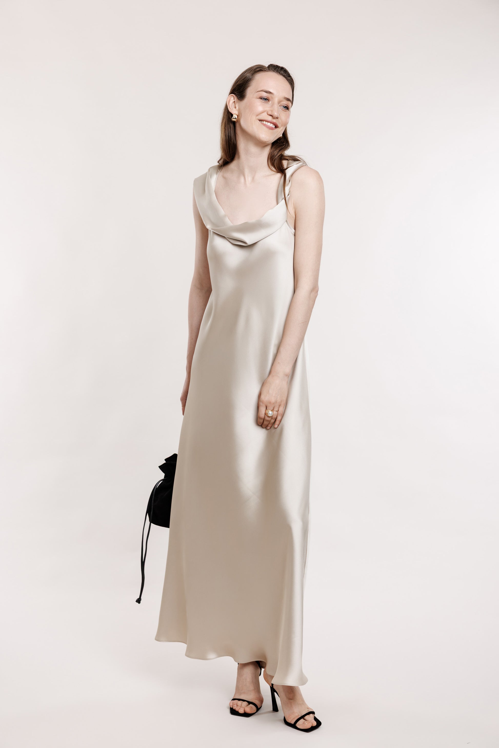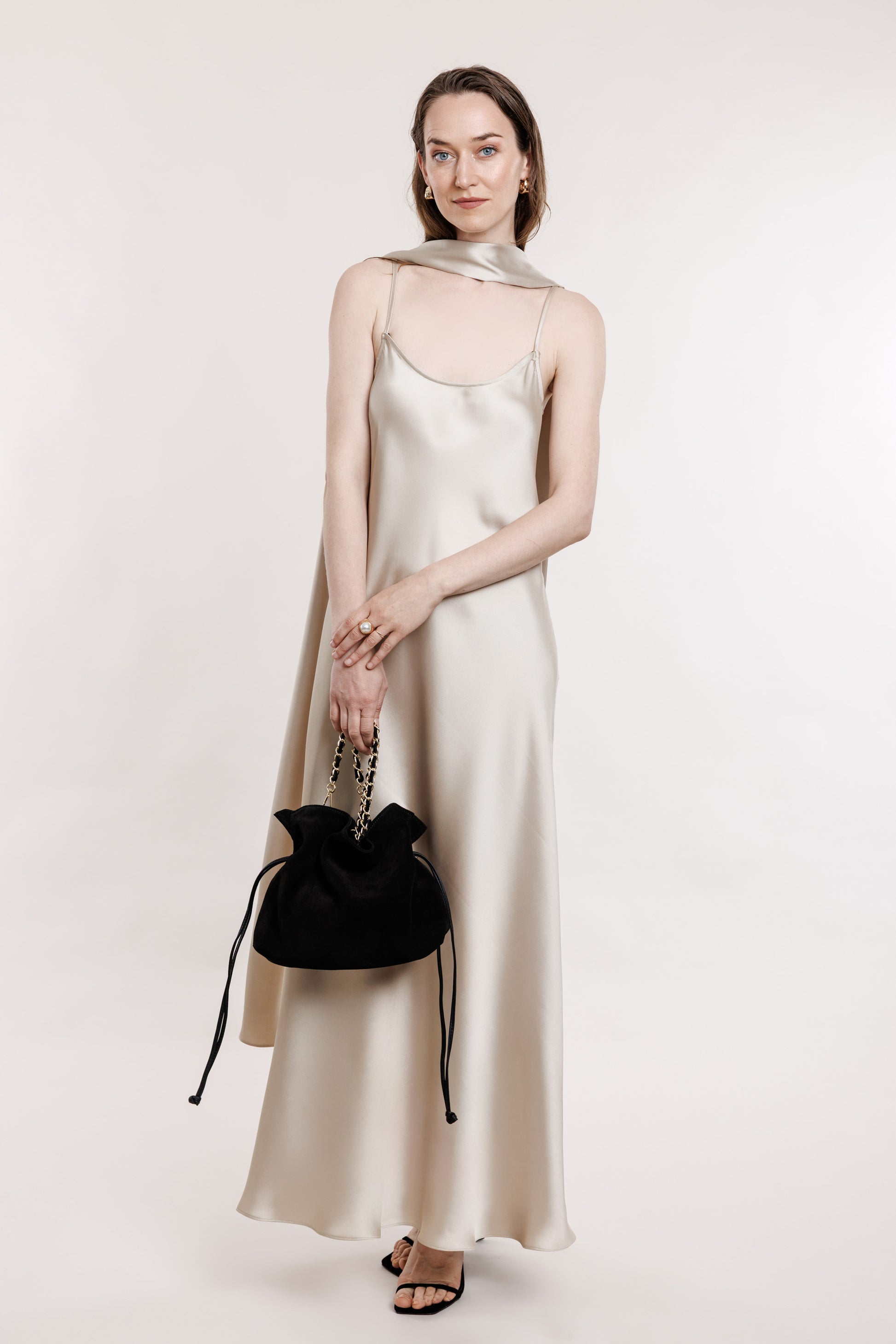 Garais slips šampanieša tonī ar saienāmā plek lentām un piepogājamo kleitas lentu. Lentu var nēsāt gan kā dekoru, gan kā jostu.