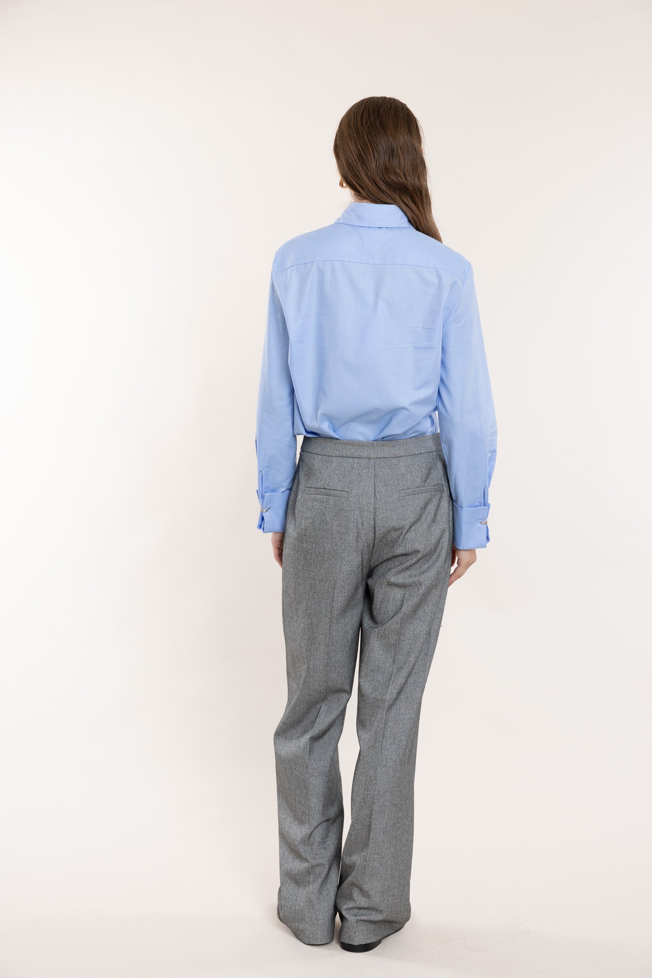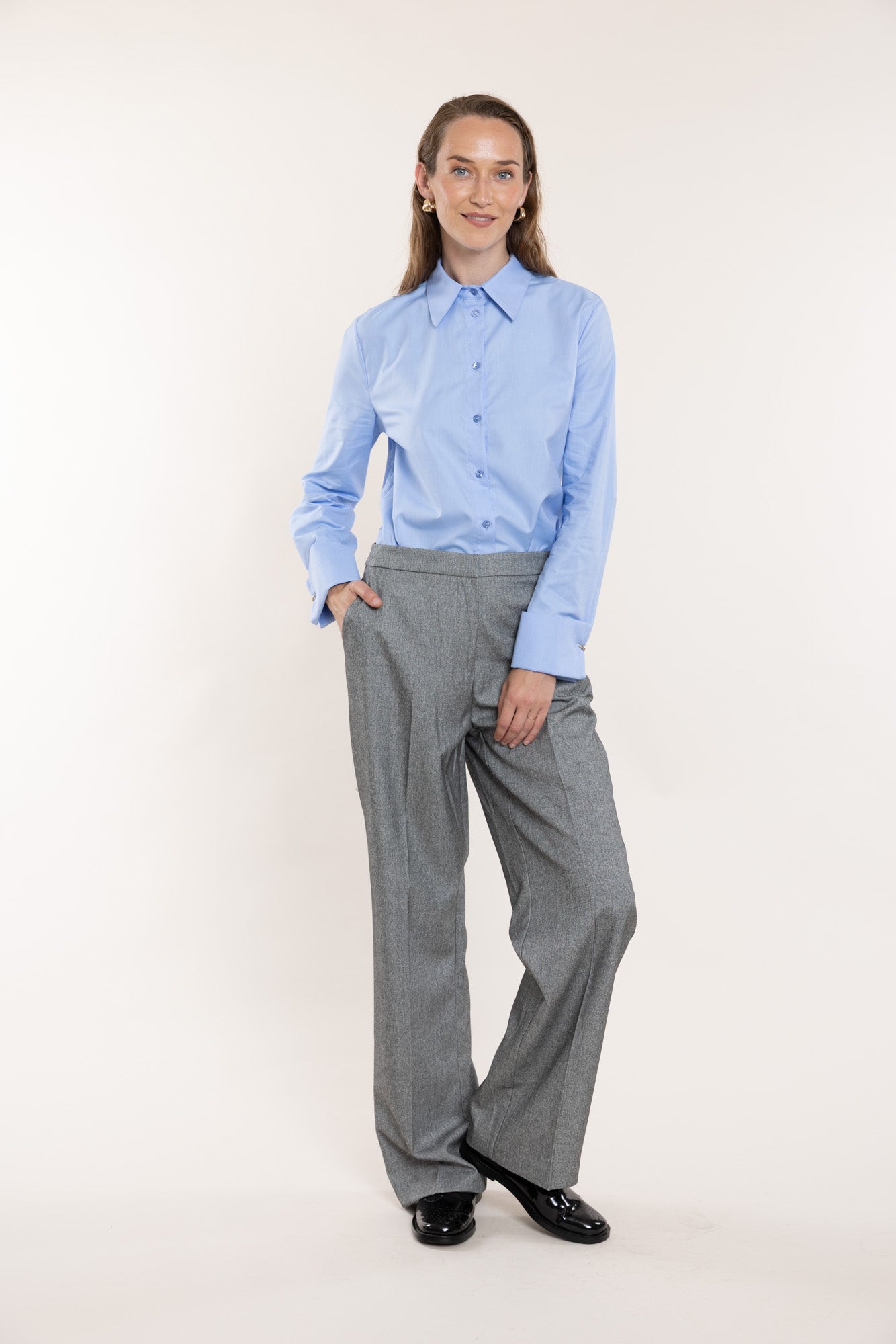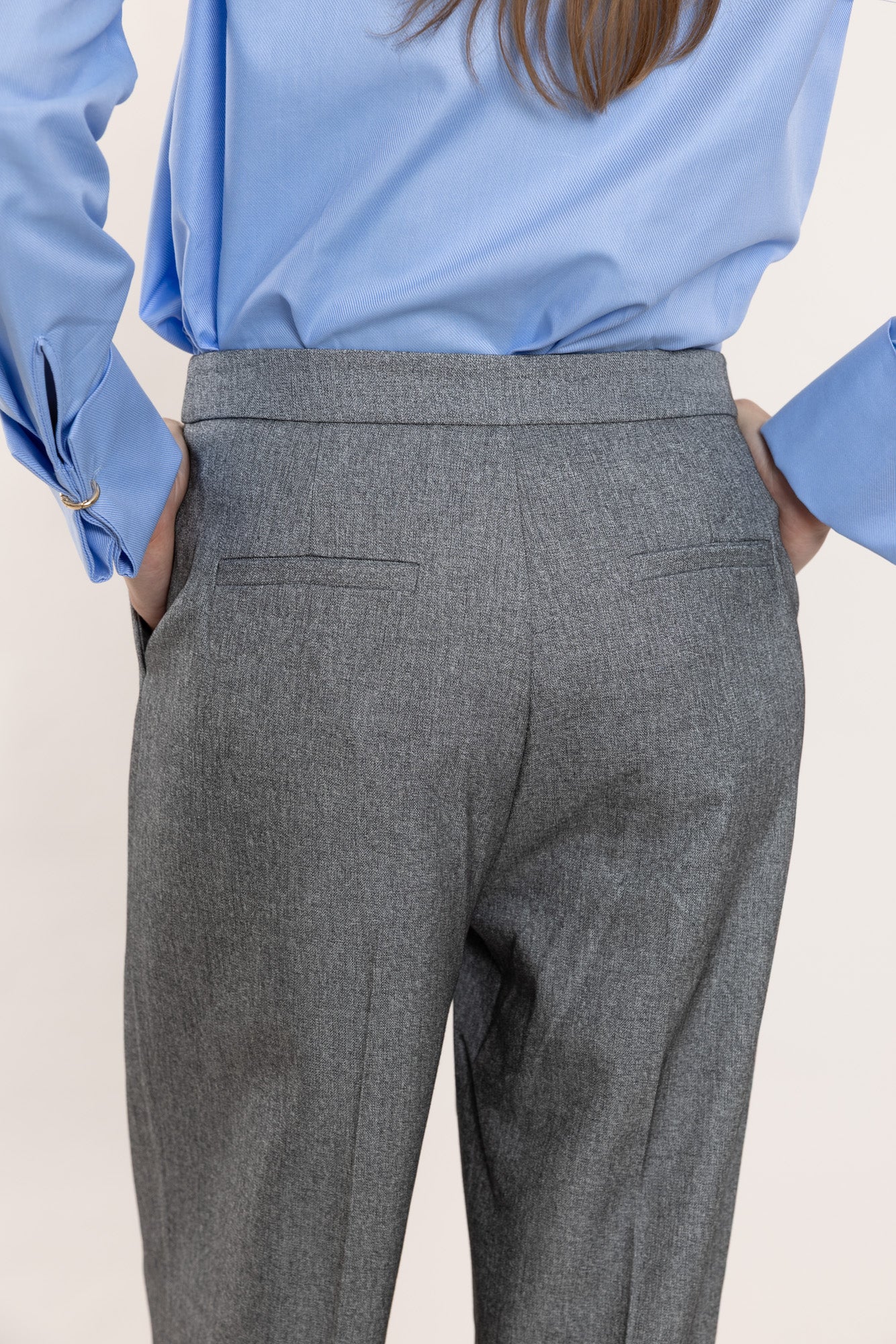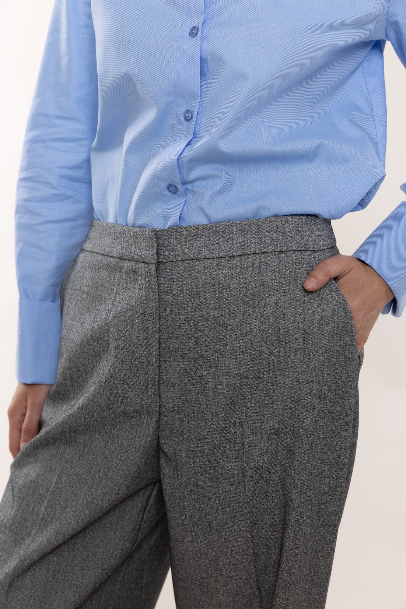 Klasiskas bikses pelēkā tonī. Audumam ir graudaini melnbalts raksts, josta daļa ir askētiska, bez cilpām. Aizdare klasiska ar rāvējslēdzēju un splēptu pogu.