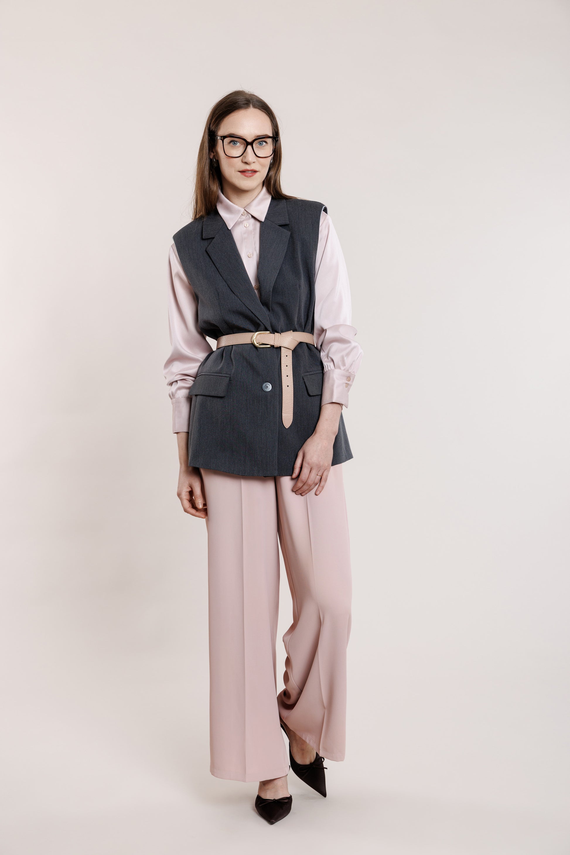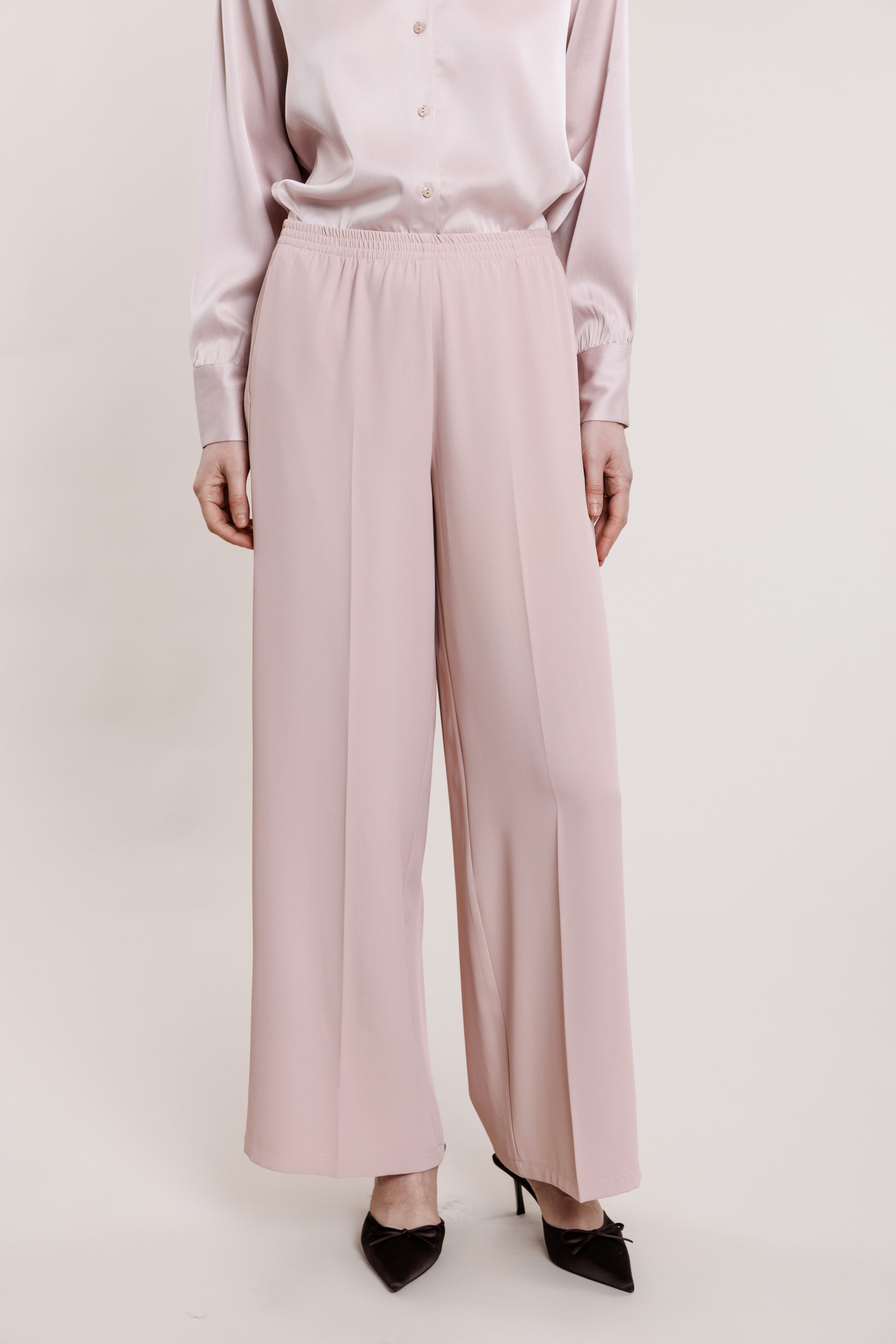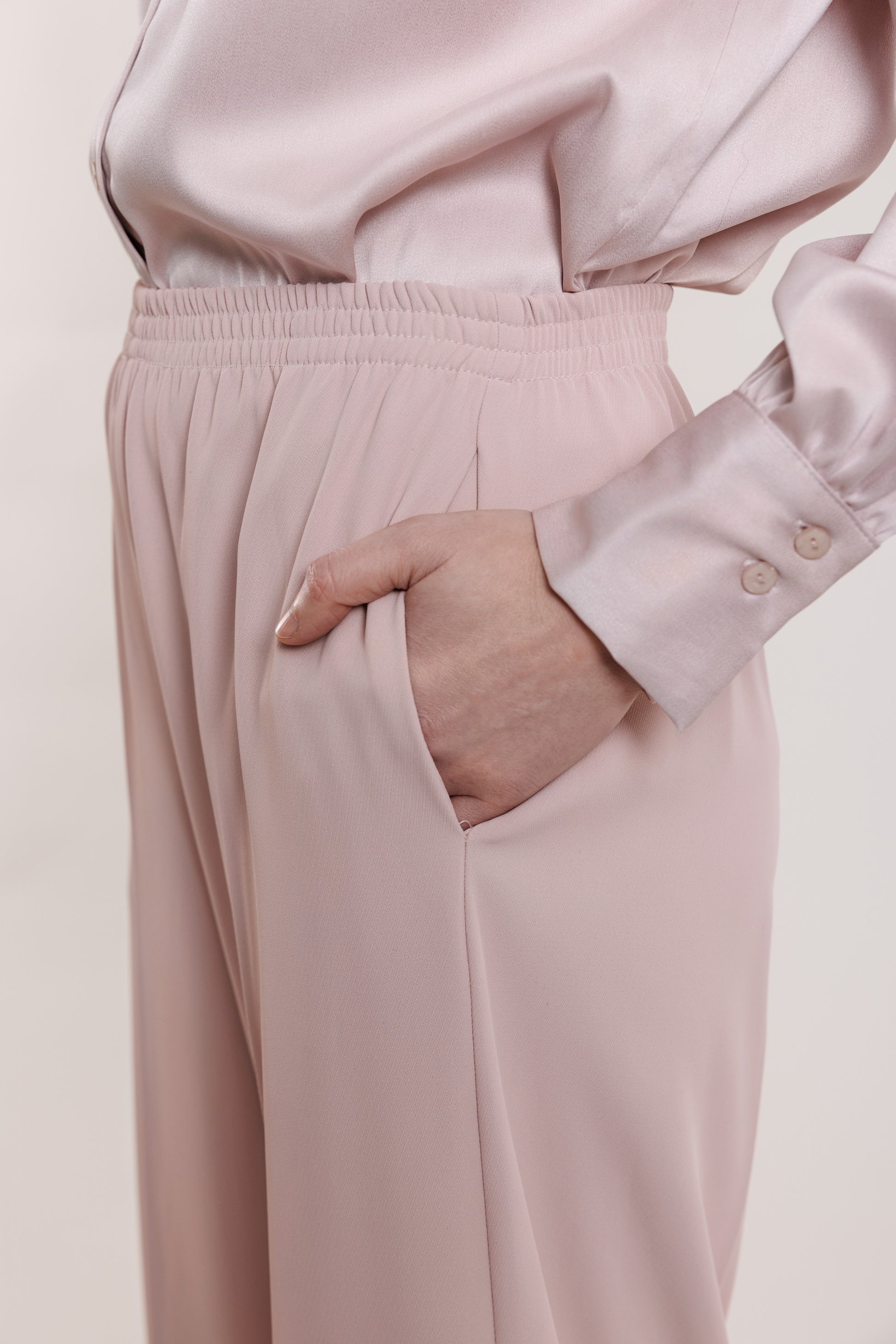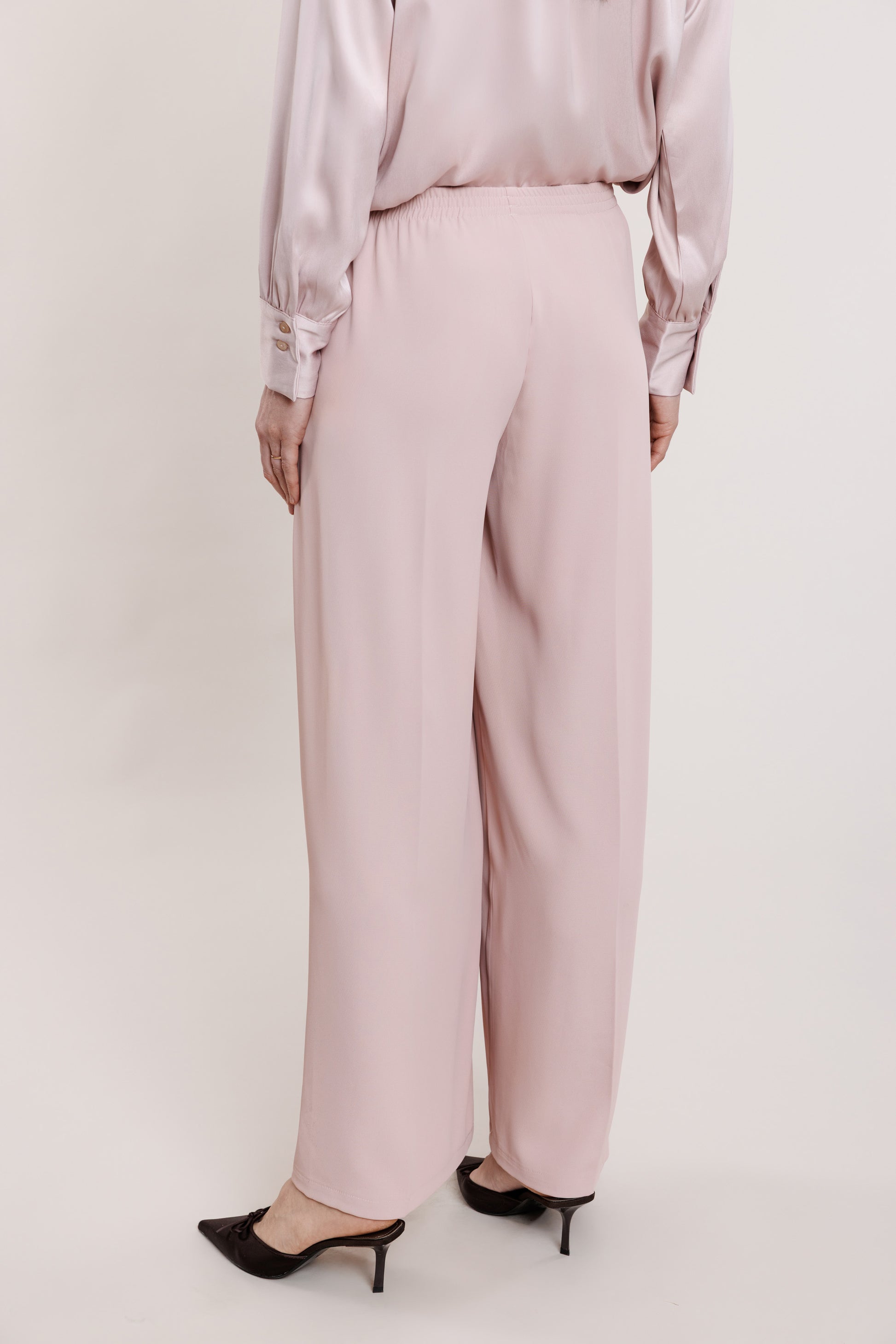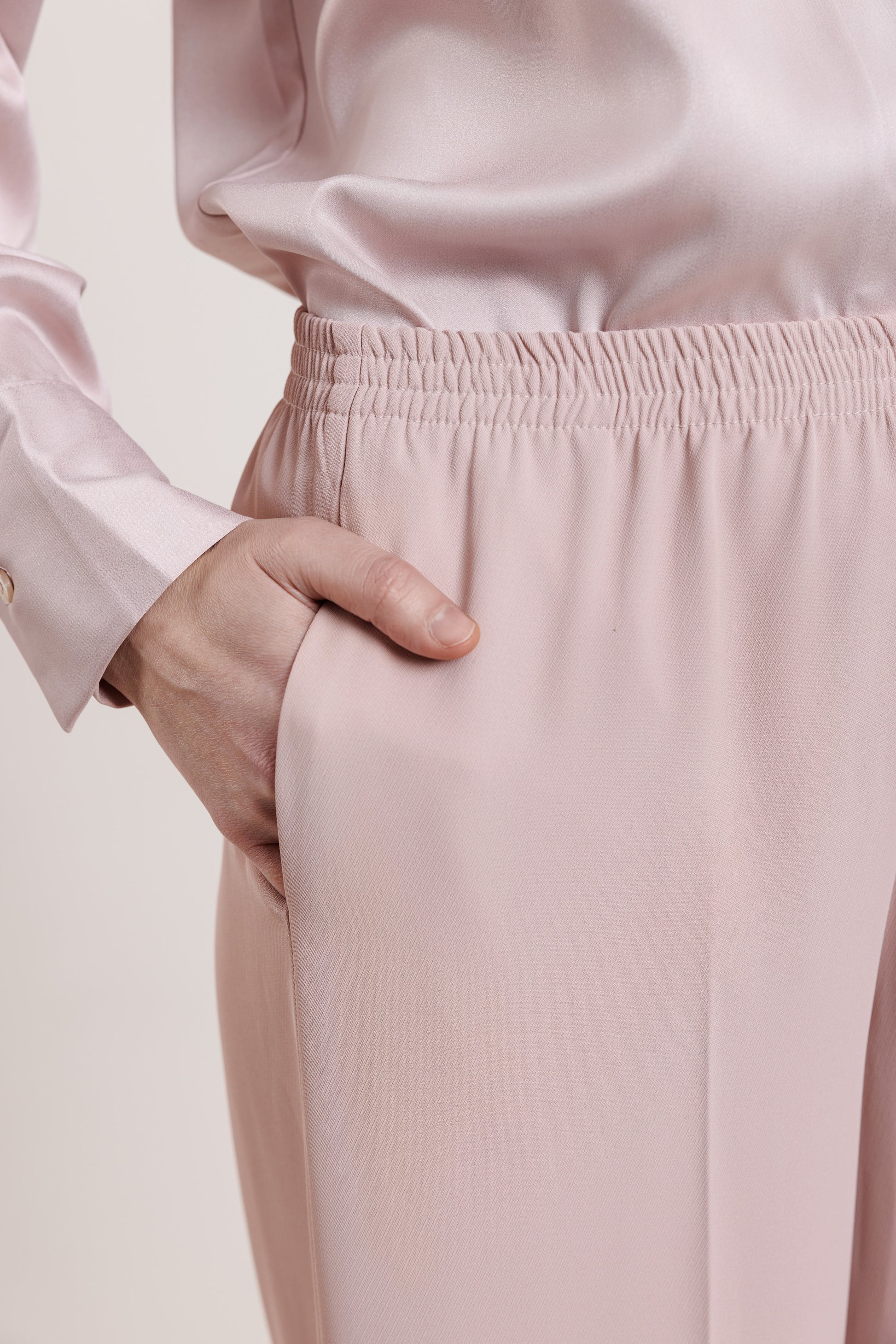Sportiska griezuma rozā krepa bikses ar kabatām un gumiju vidukļa daļā.