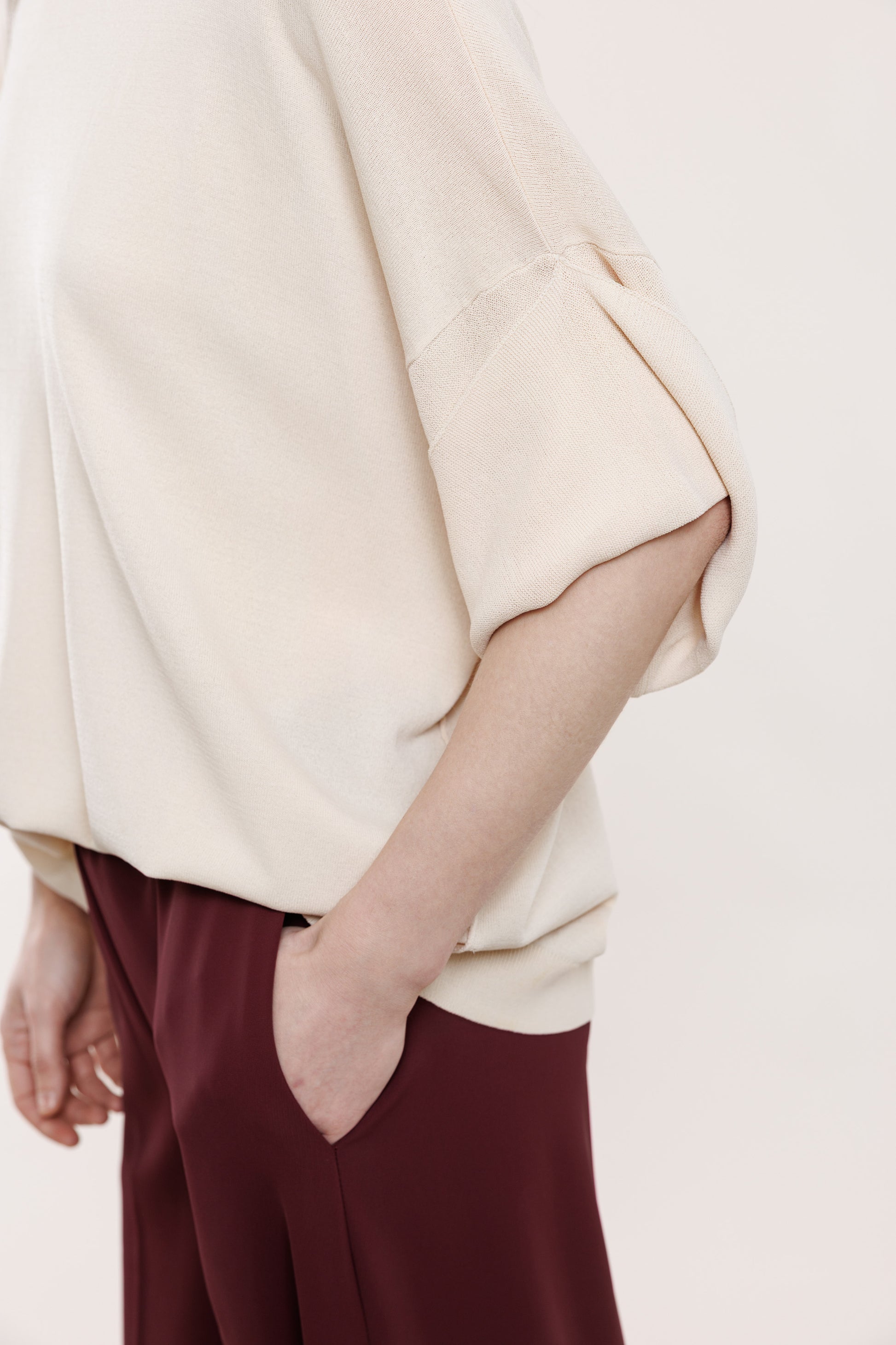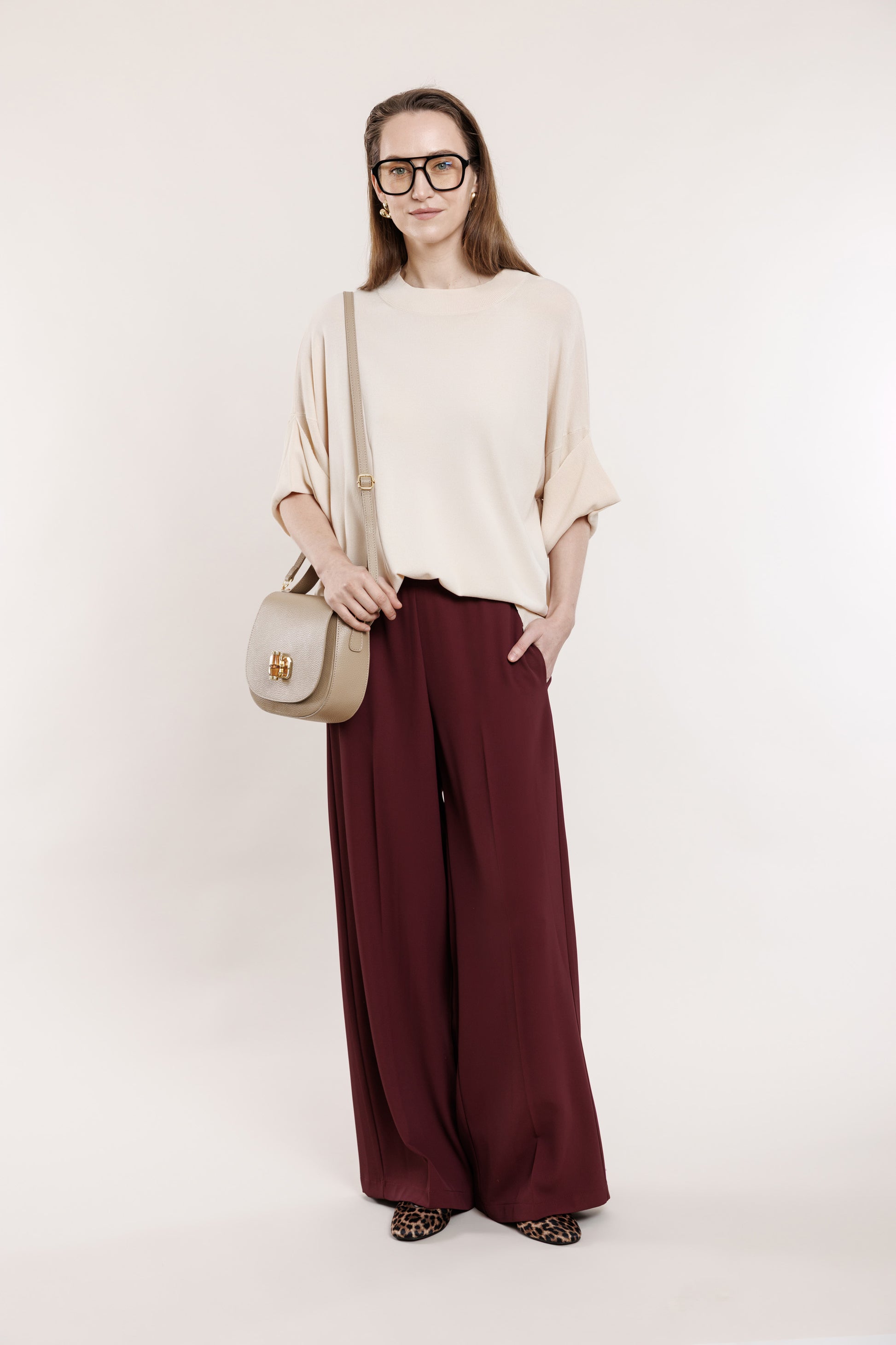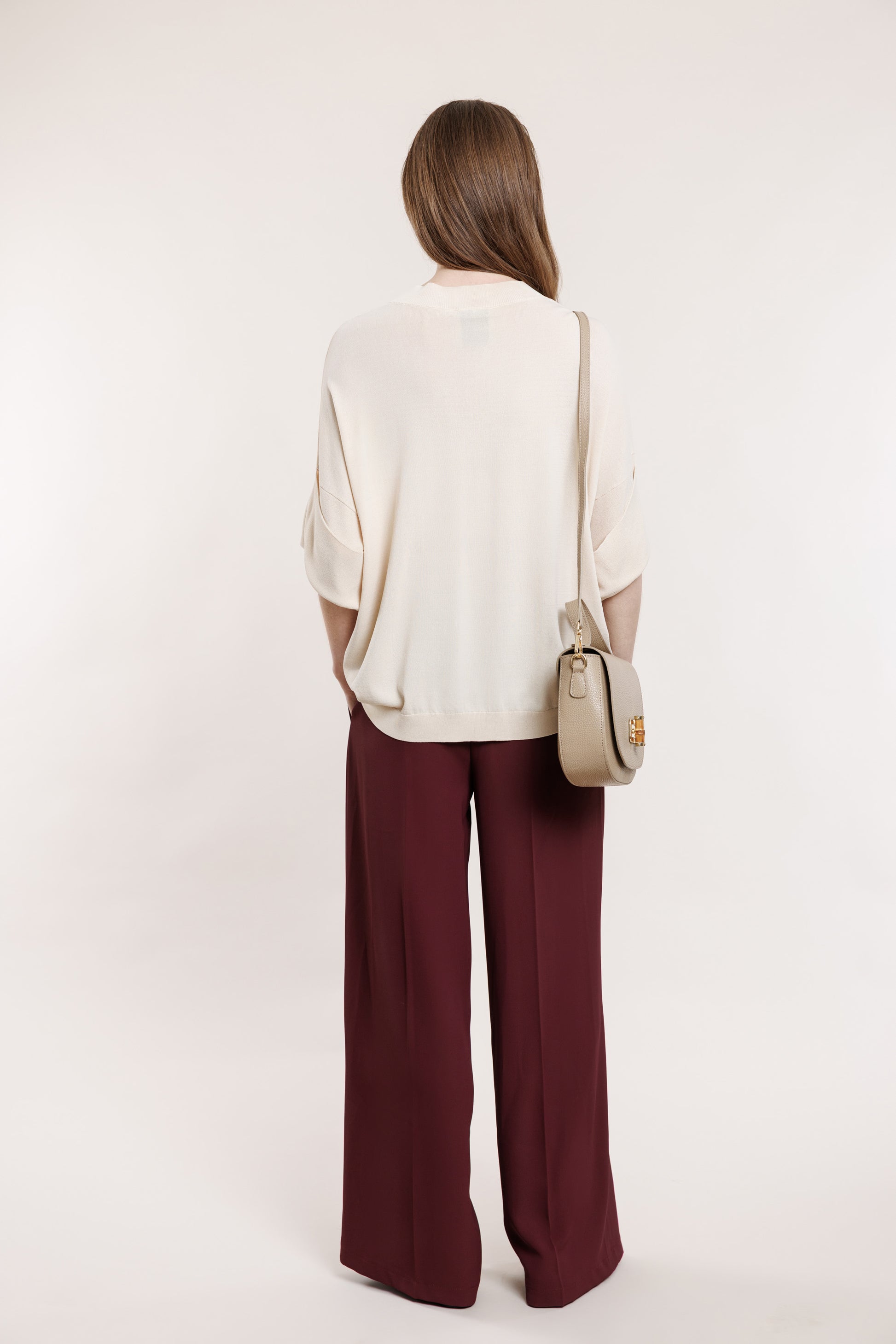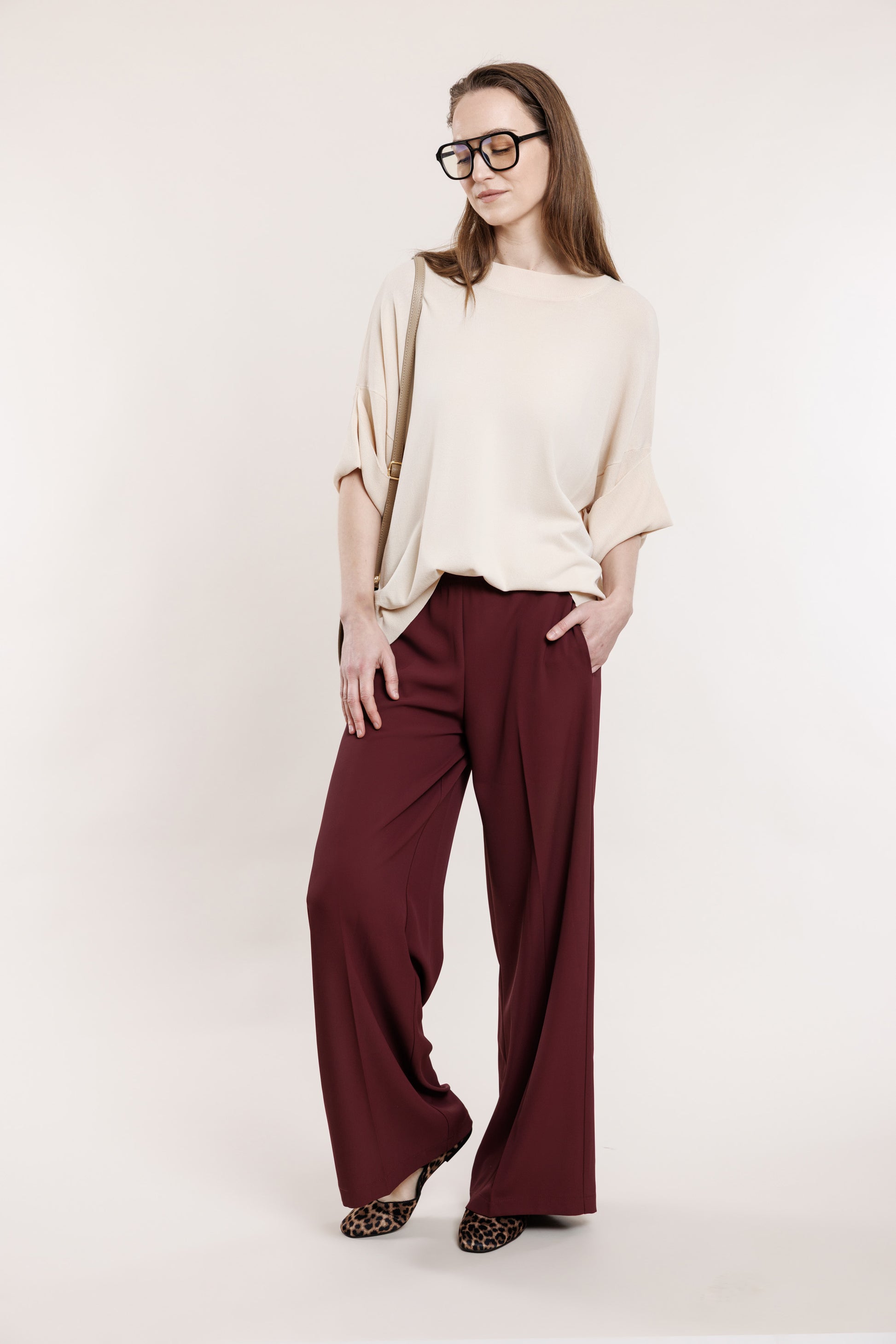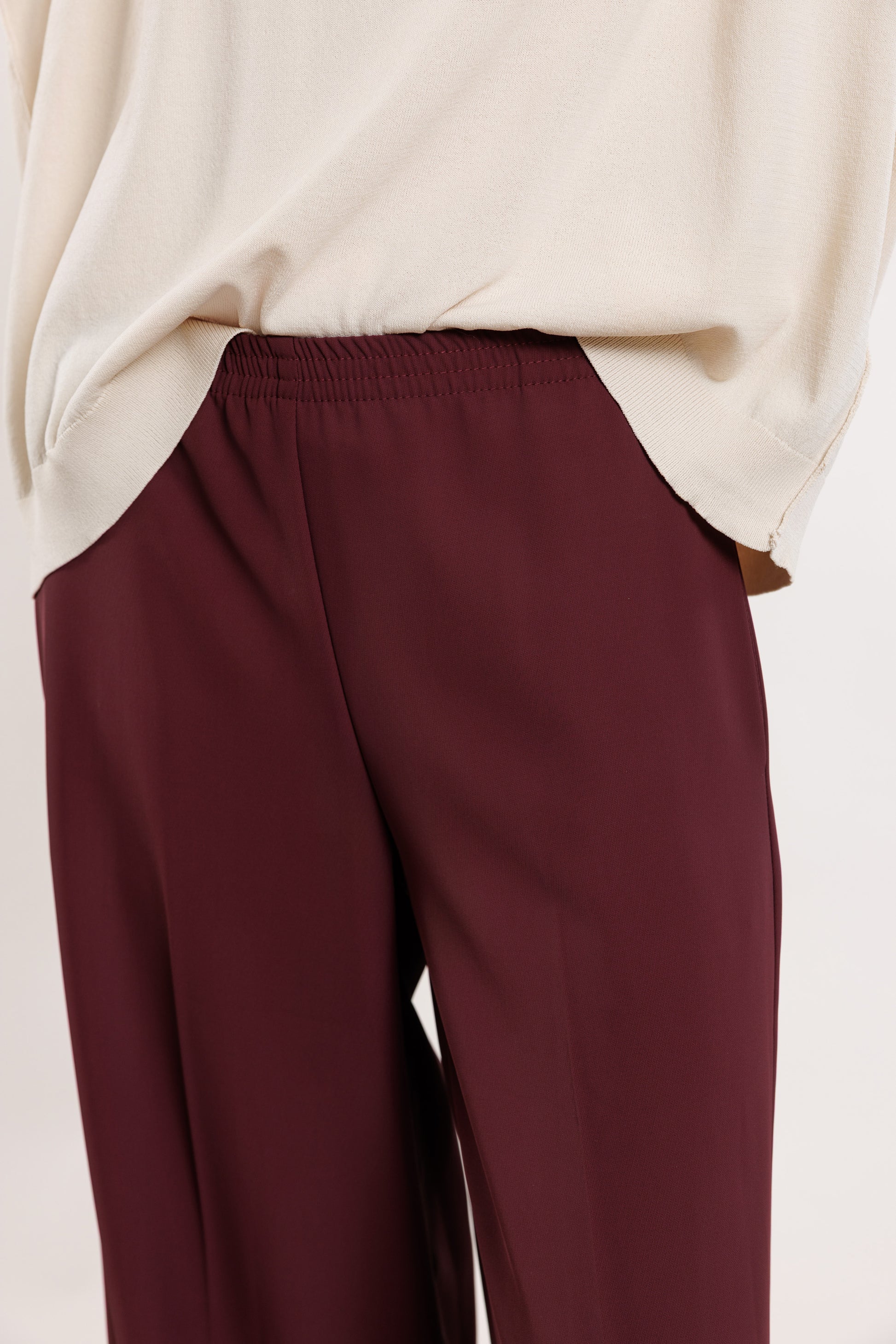 Krepa bikses ar gumiju vīna tonī, ar kabatām un gumijas jostas daļu.