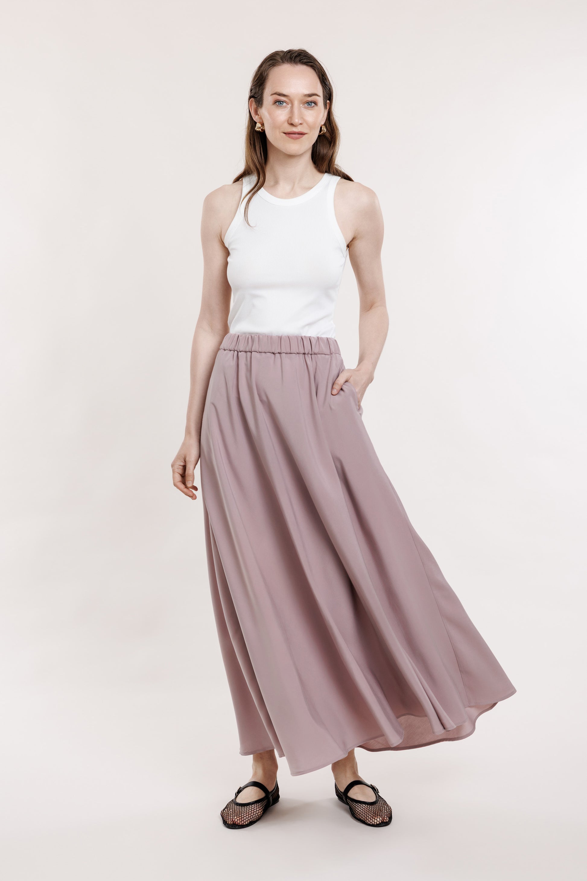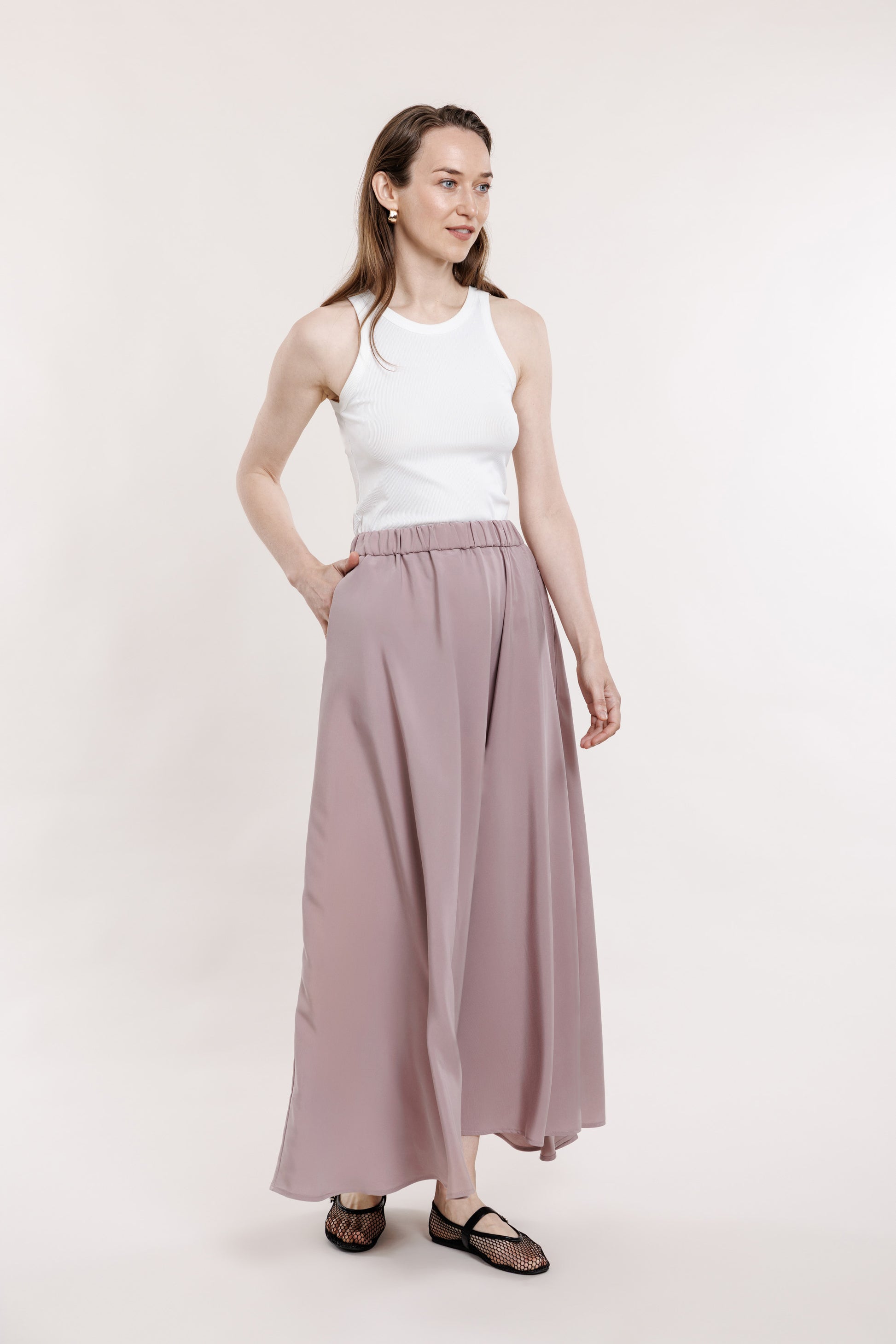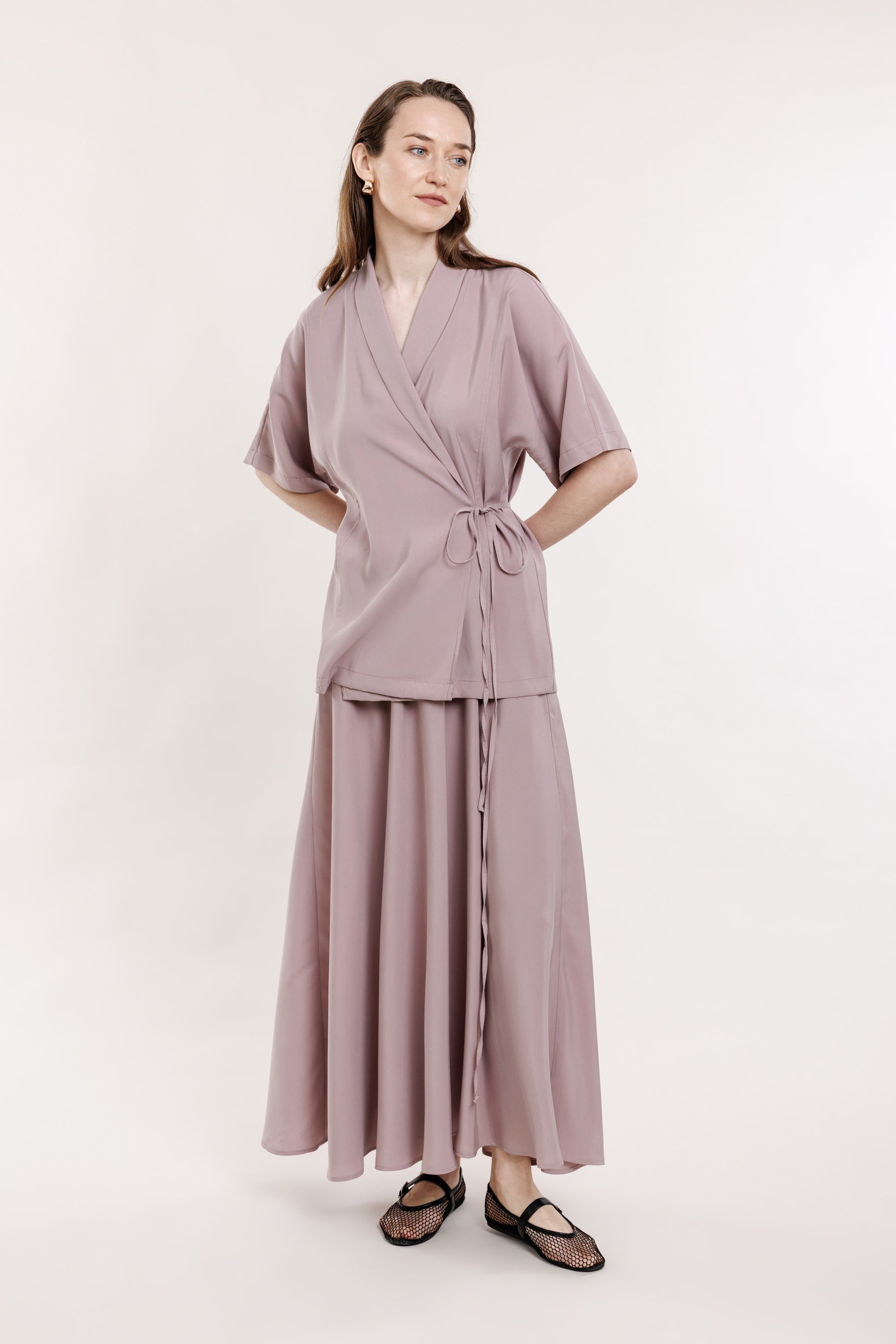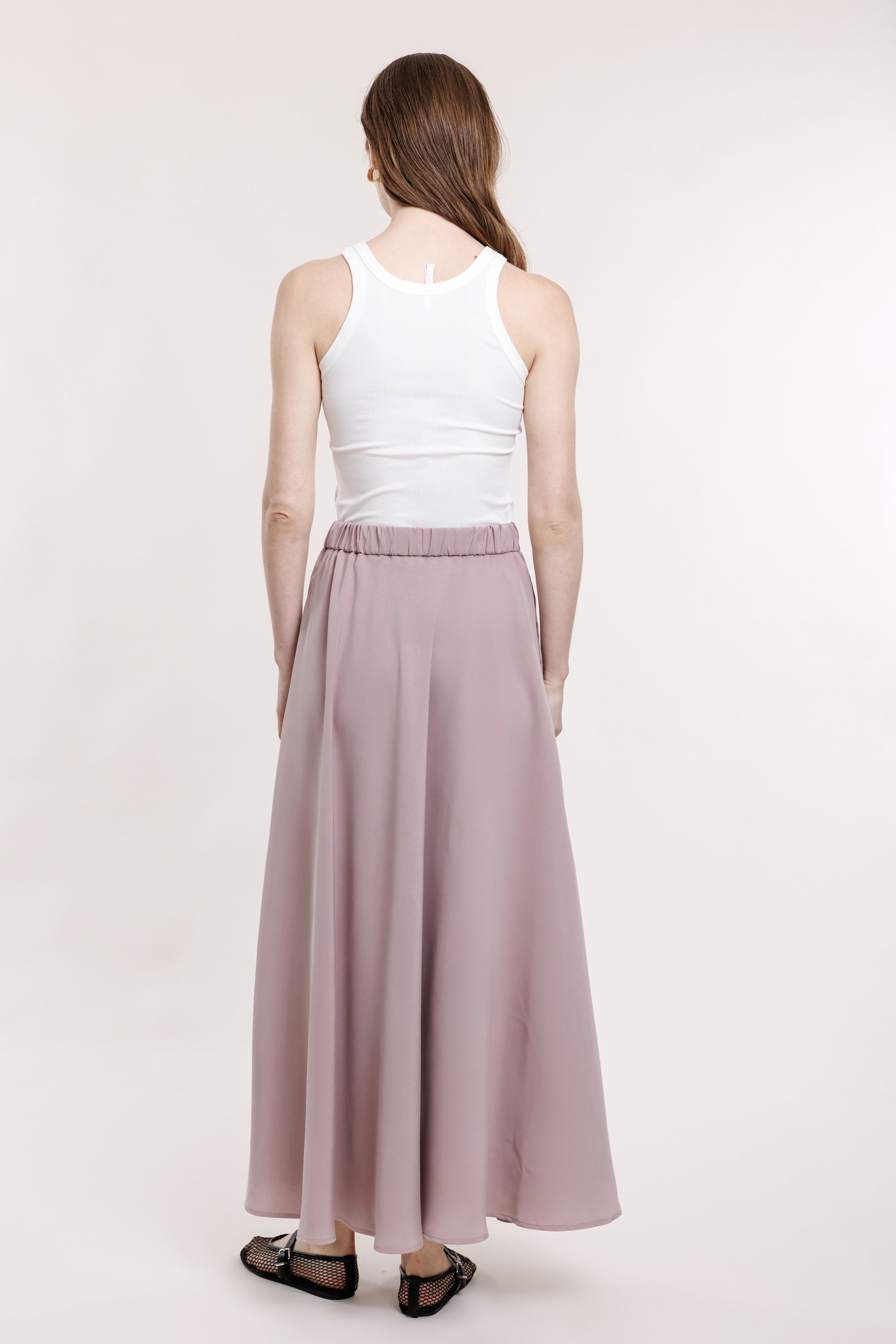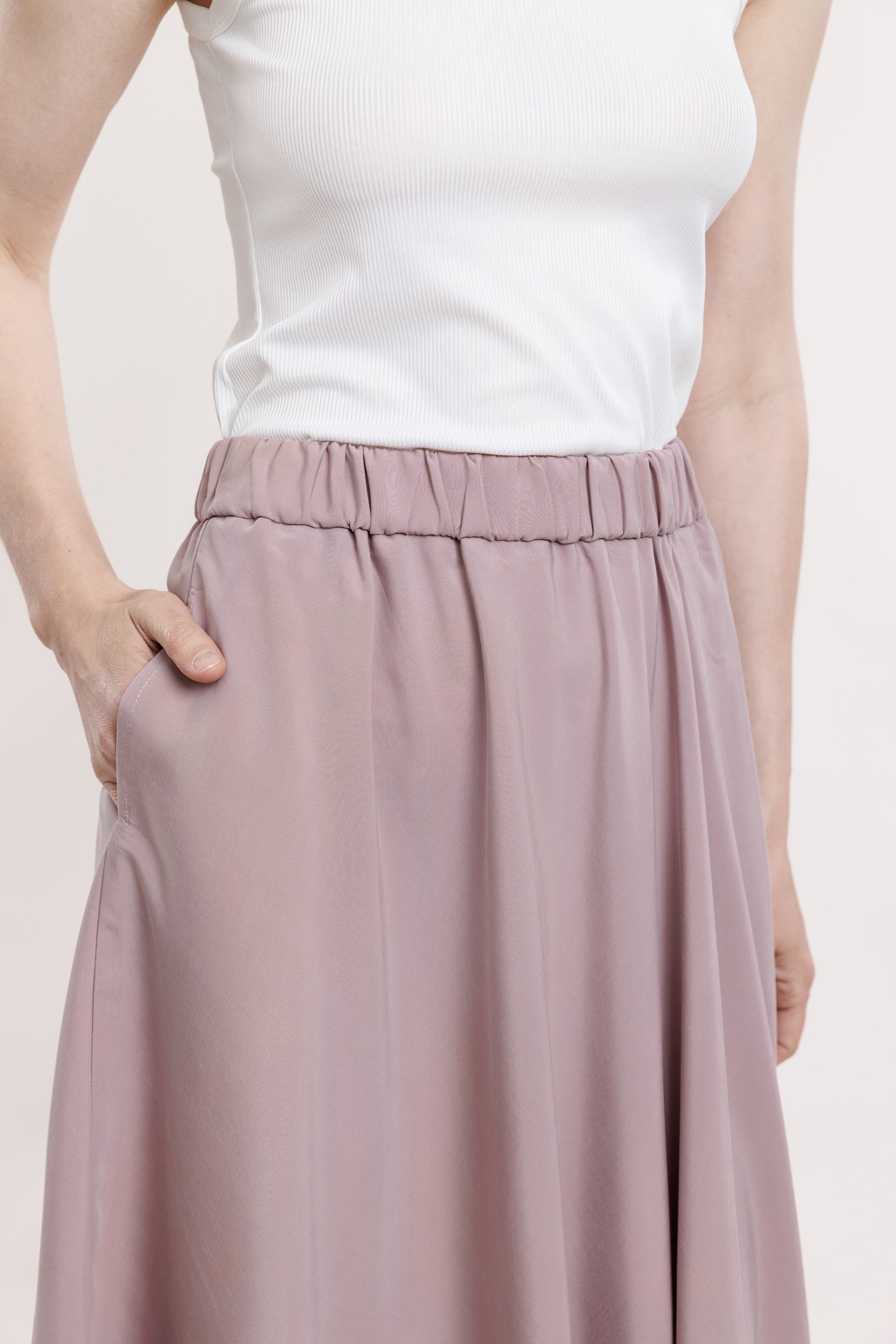Gari, brīvi krītoši maigi rozā svārki ar A-līniju. Svārkiem ir sānu kabatas un elastīga gumija jostas daļā aizmugurē. Lieliski piemēroti komplekta veidošanai ar tāda paša auduma kimono topu.