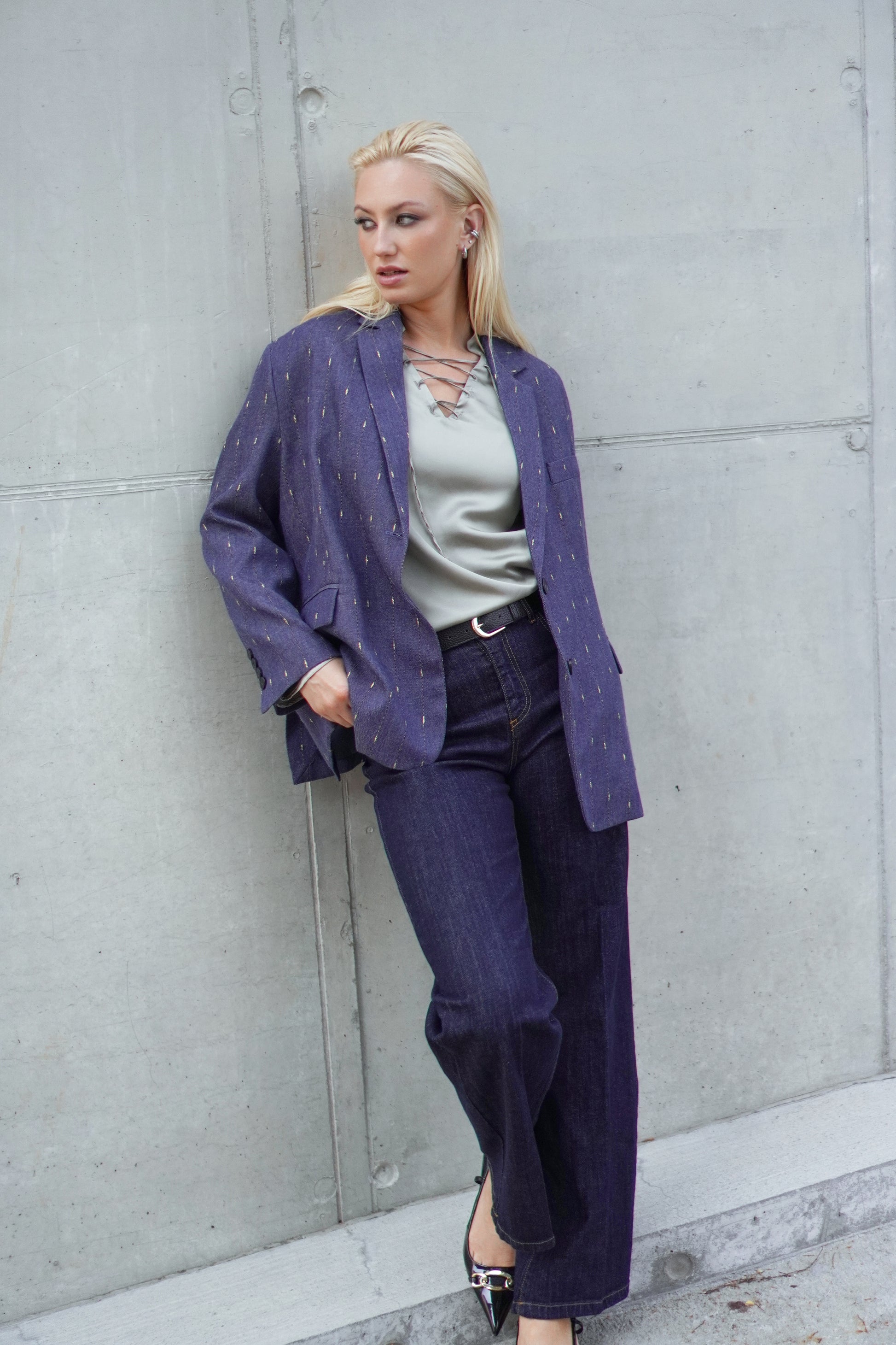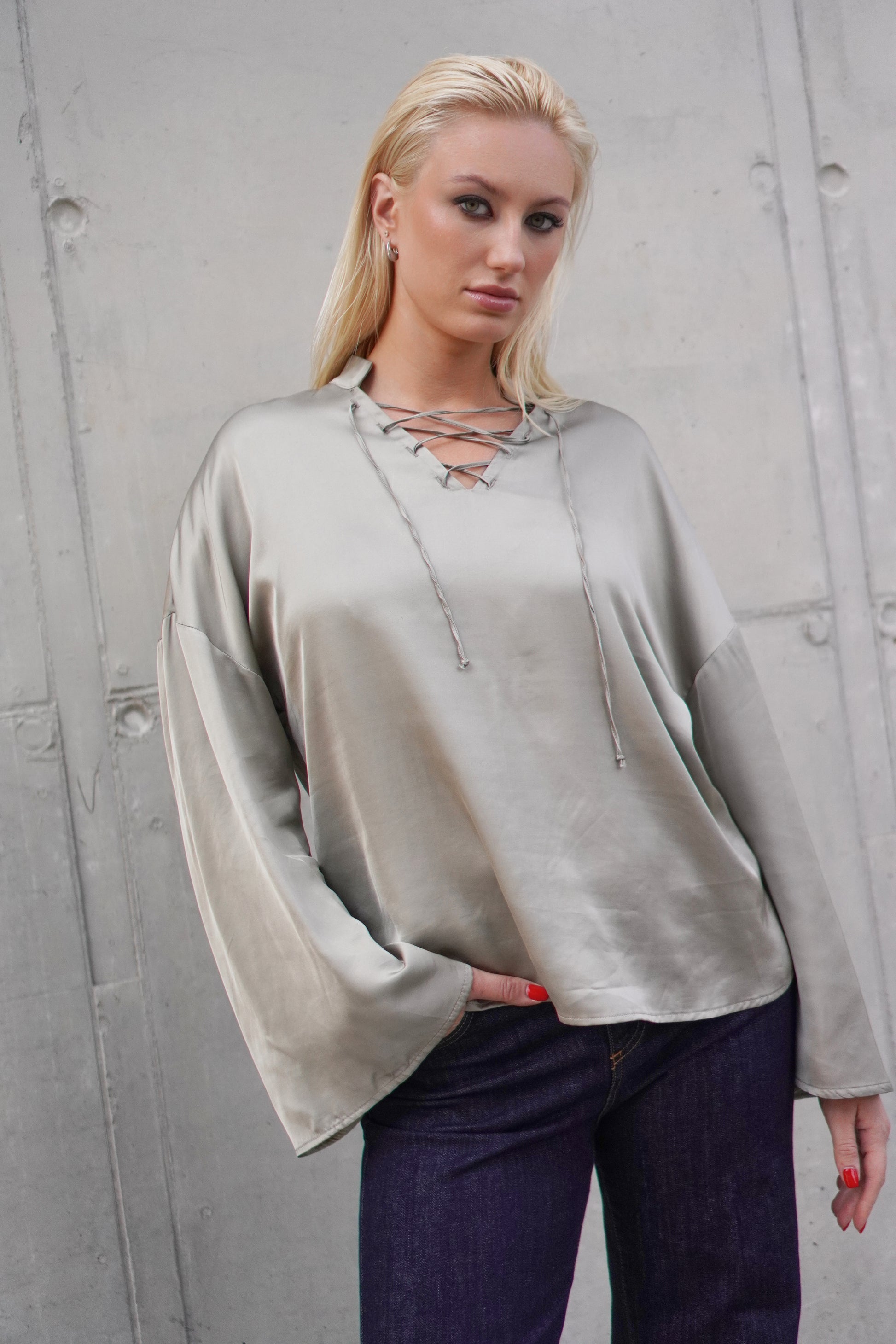 Maigi zaļa viskozes blūze ar stiķīšiem aizdares vietā kakla daļā, piedurknes ar paplatinātiem galiem.