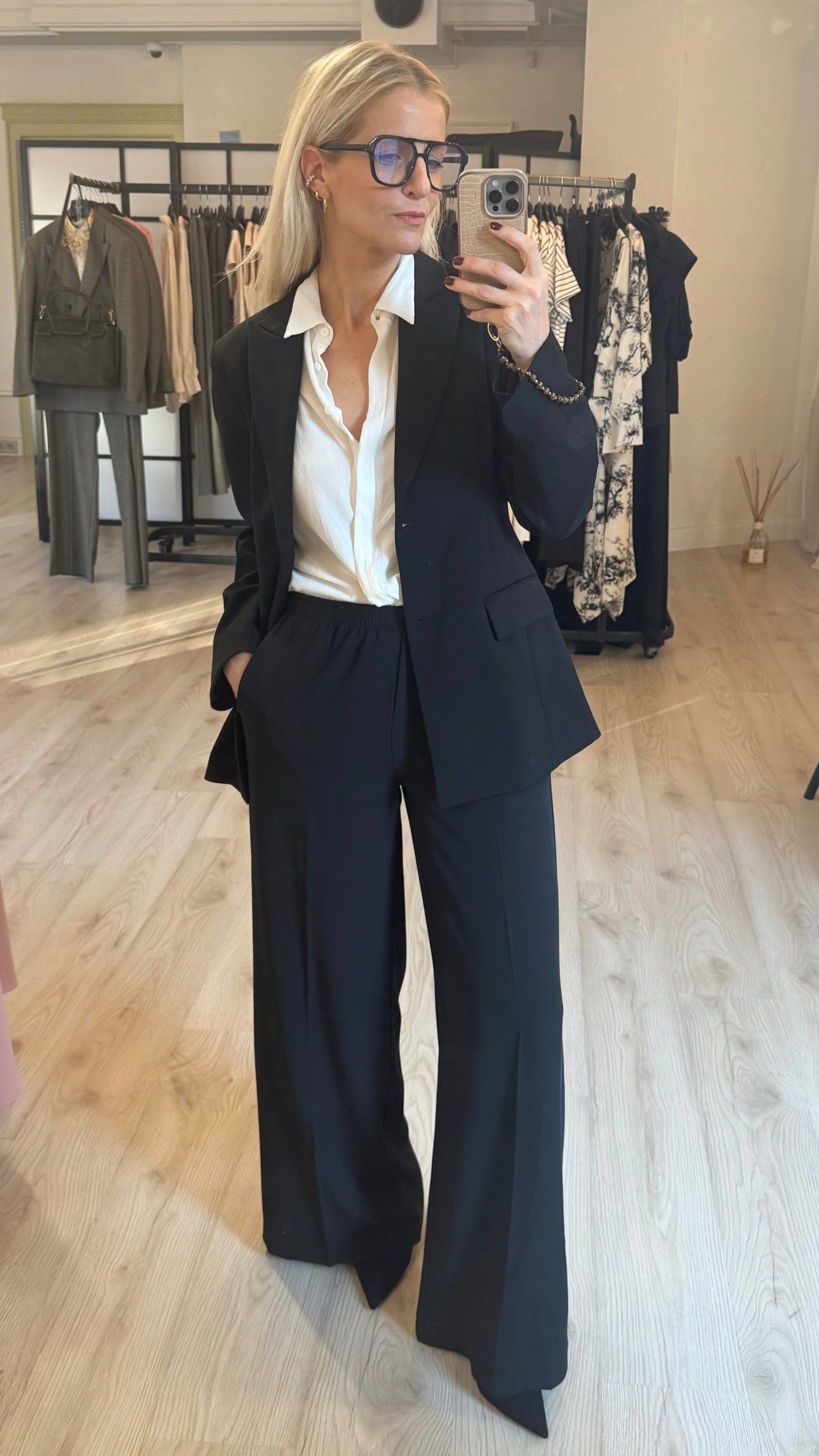 Melnas krepa bikses ar gumiju un kabatām.