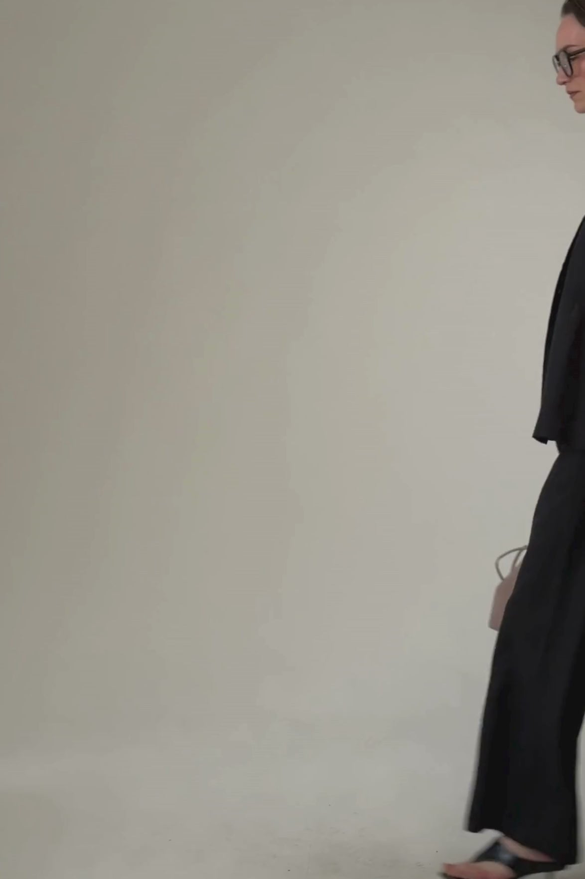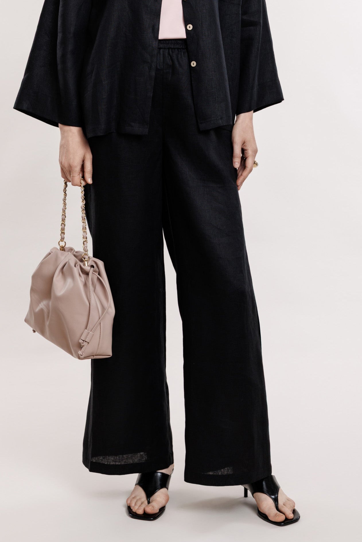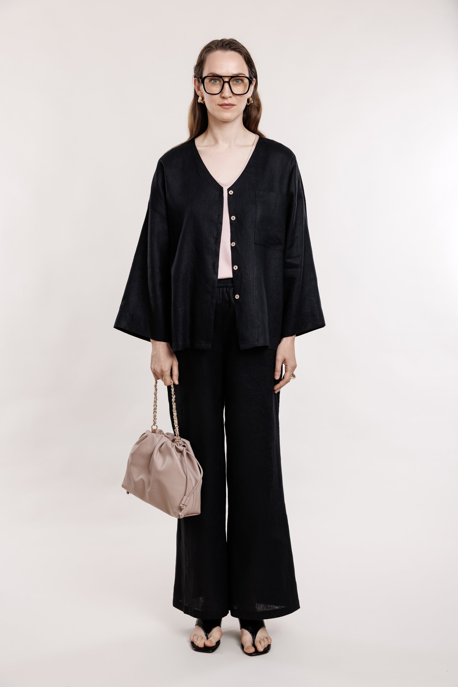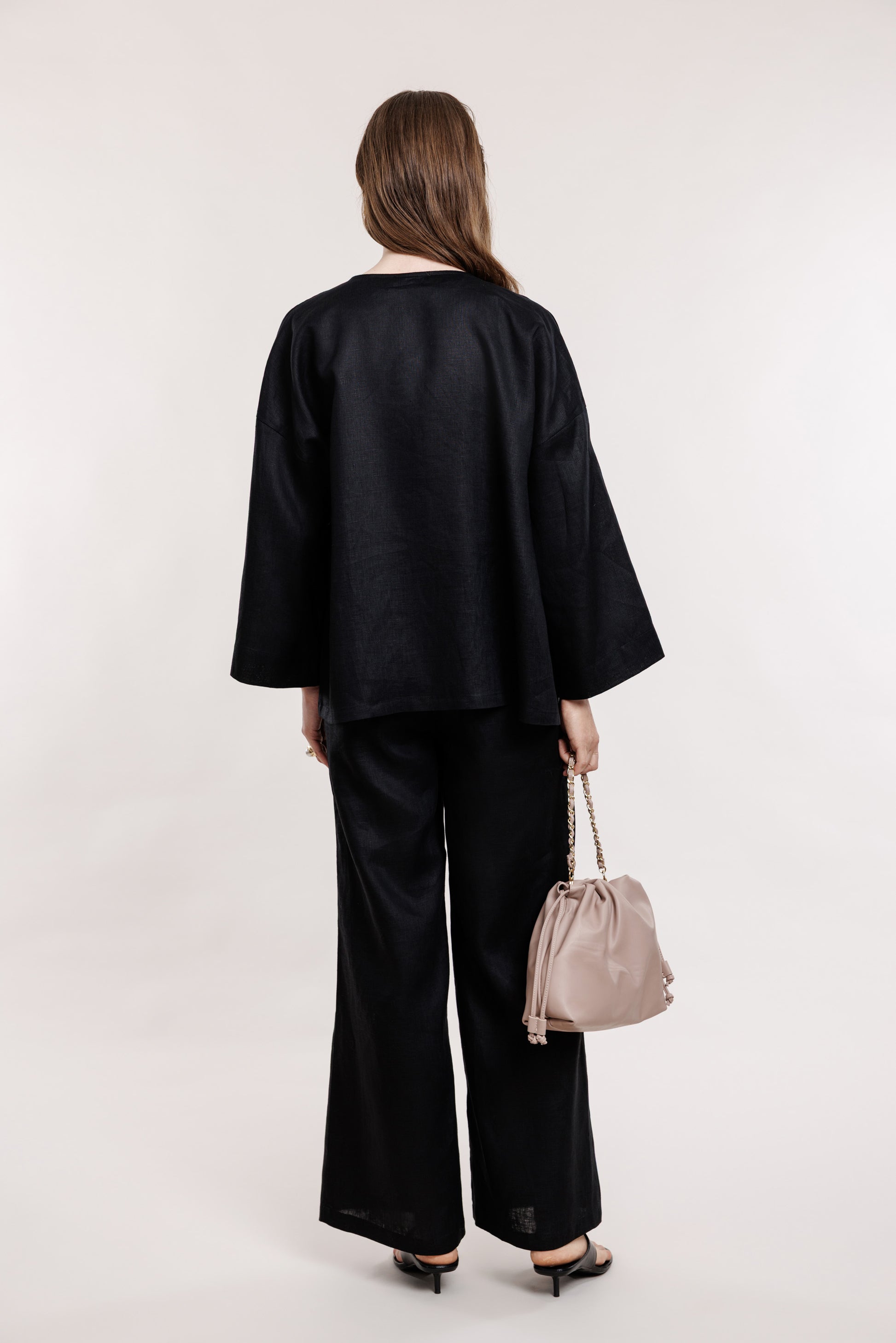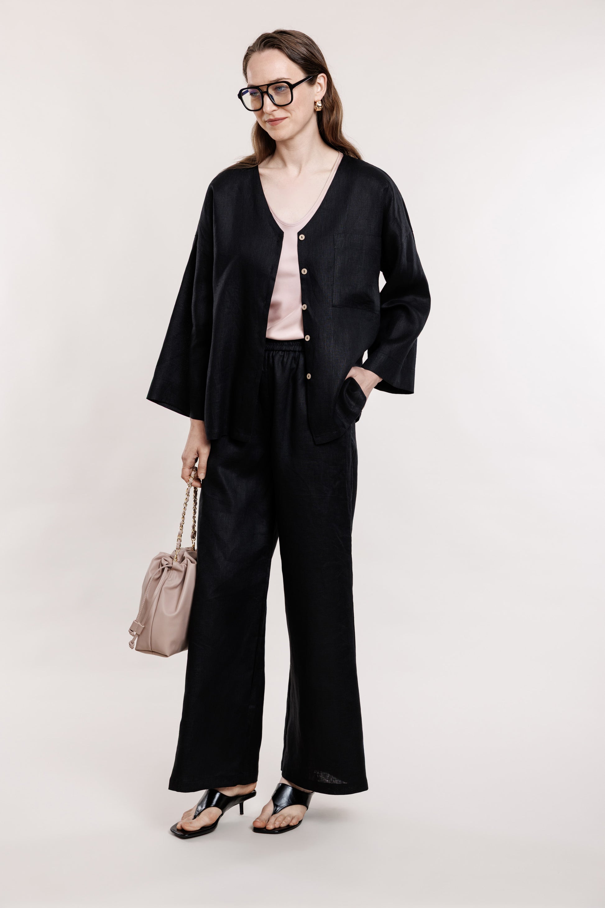 Melnas, taisna griezuma lina bikses ar gumiju jostas daļā. Ideālai komplektācijai pieejams arī melns lina žaketkrekls ar smalkām podziņām.