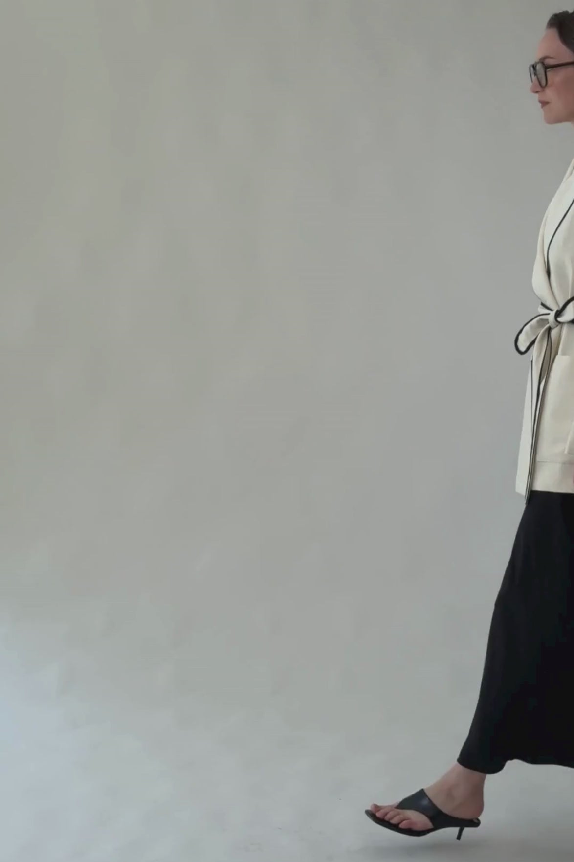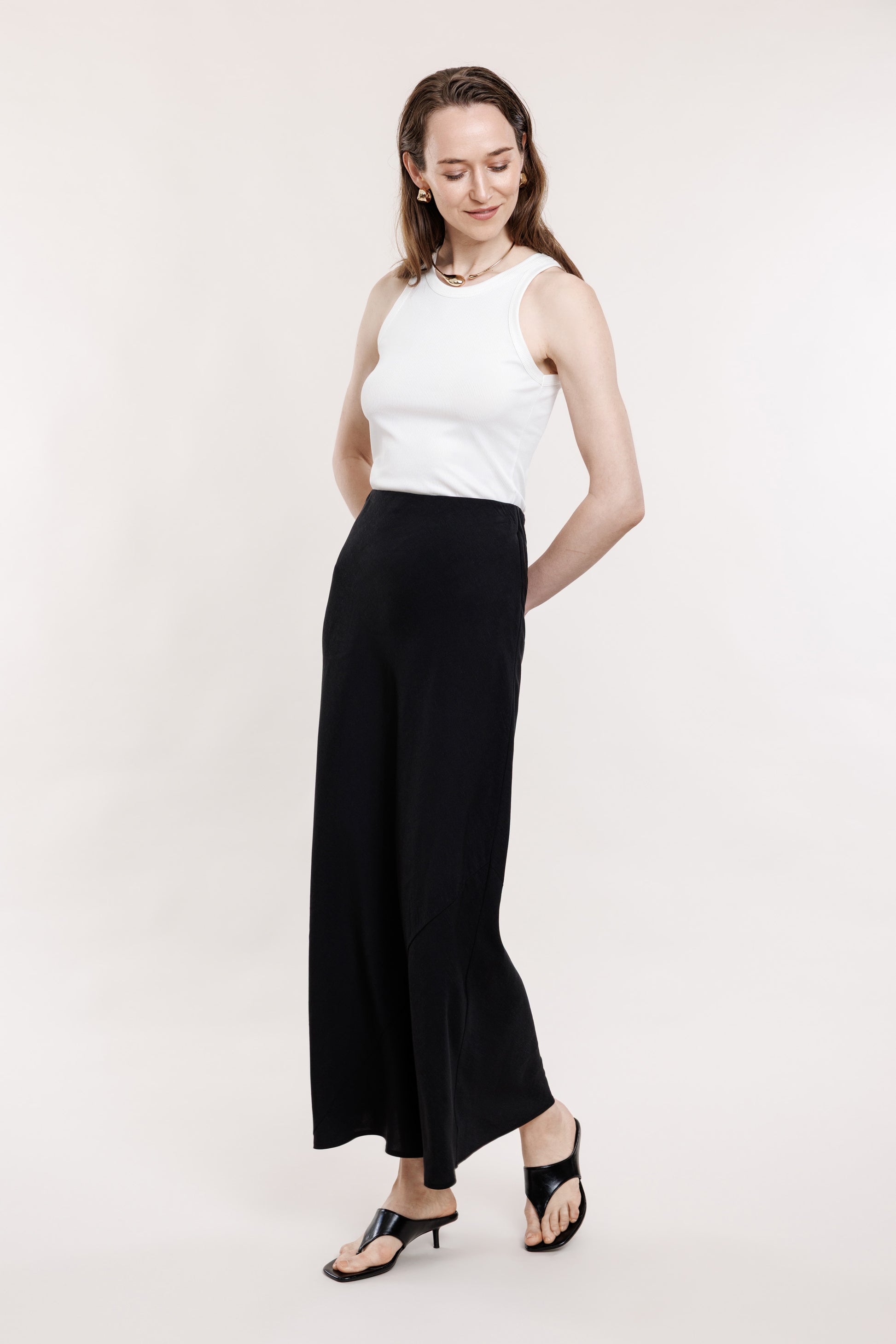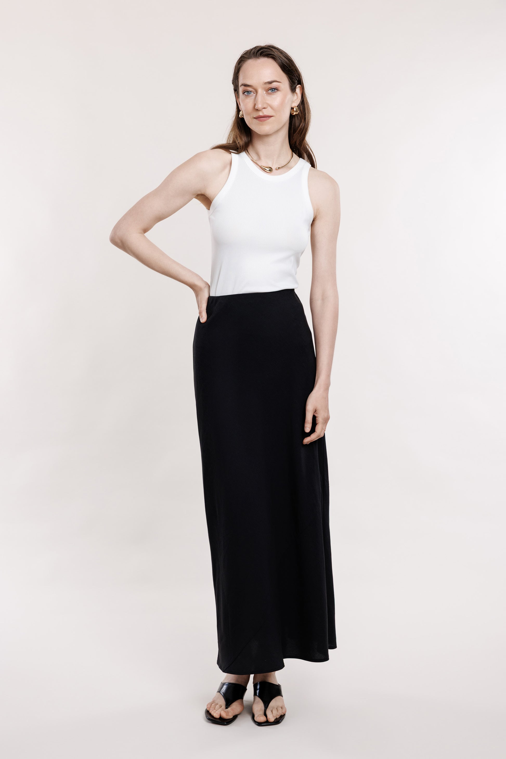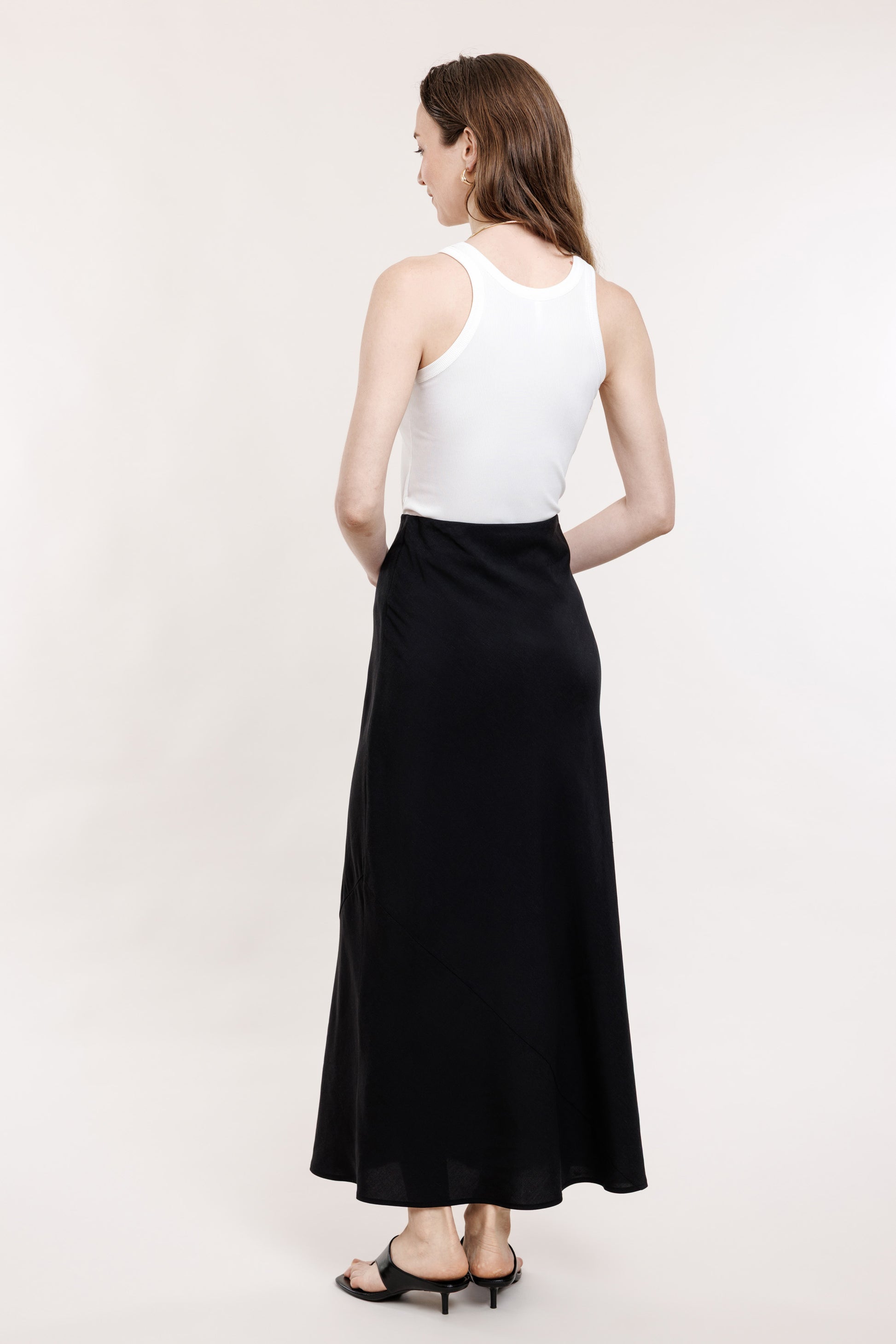 Melni lina svārki slīpā diegā bez aizdares un oderes. Jostas vietā apdare ar gumiju. Svārkiem ir šaurs siluets.