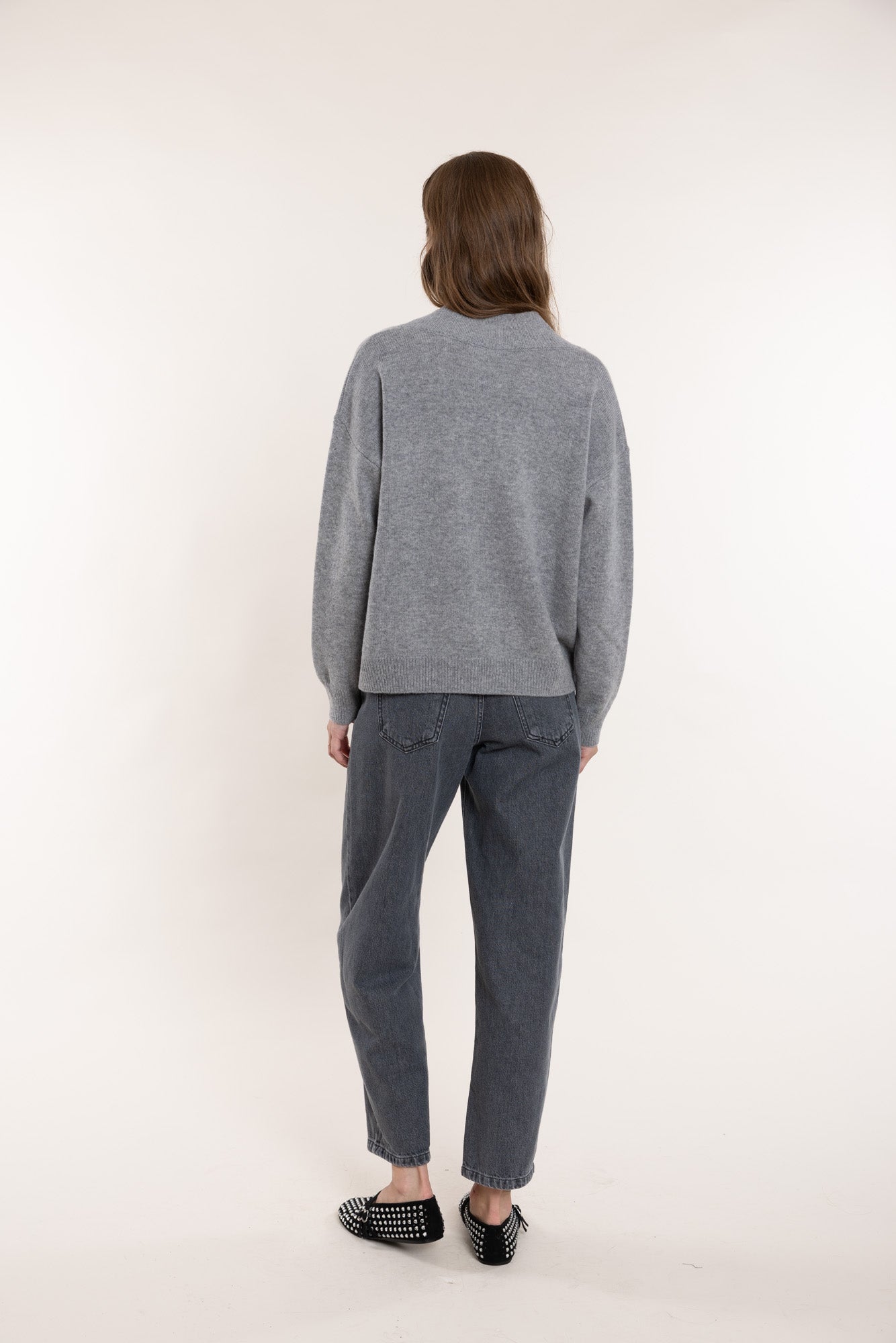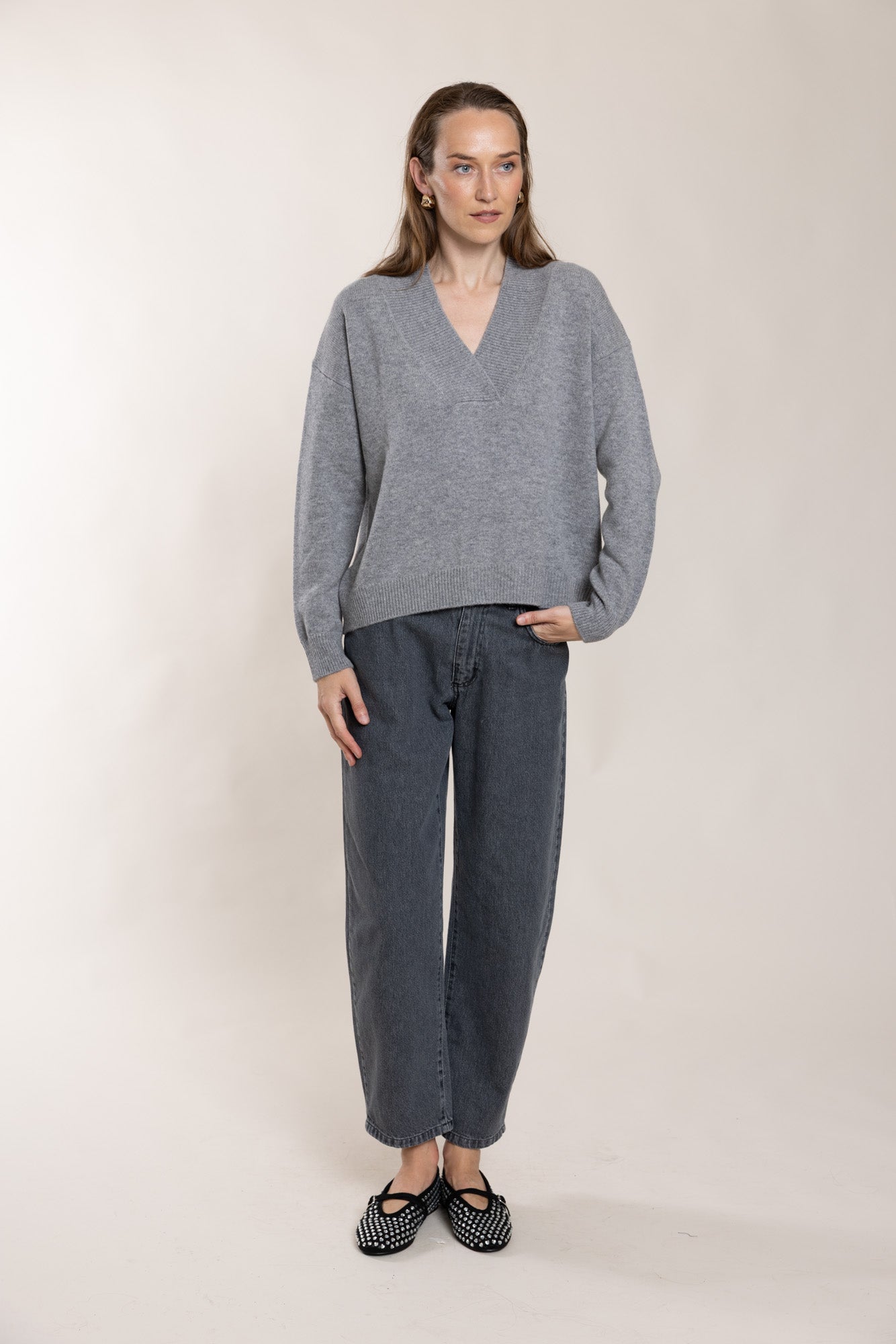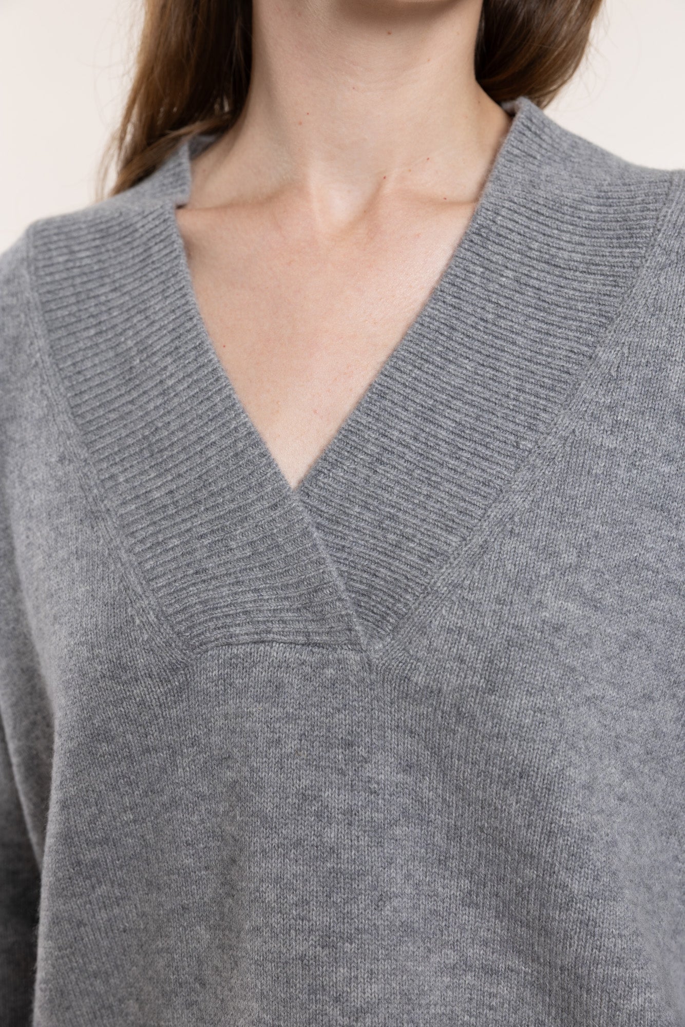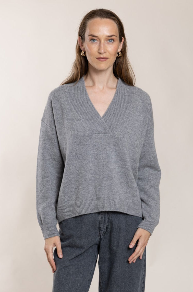 Pelēks džemperis ar V veida izgriezumu. Korpuss taisns un mazliet oversize. Valnītis izgriezumā, manšetēs un apakšmalā.