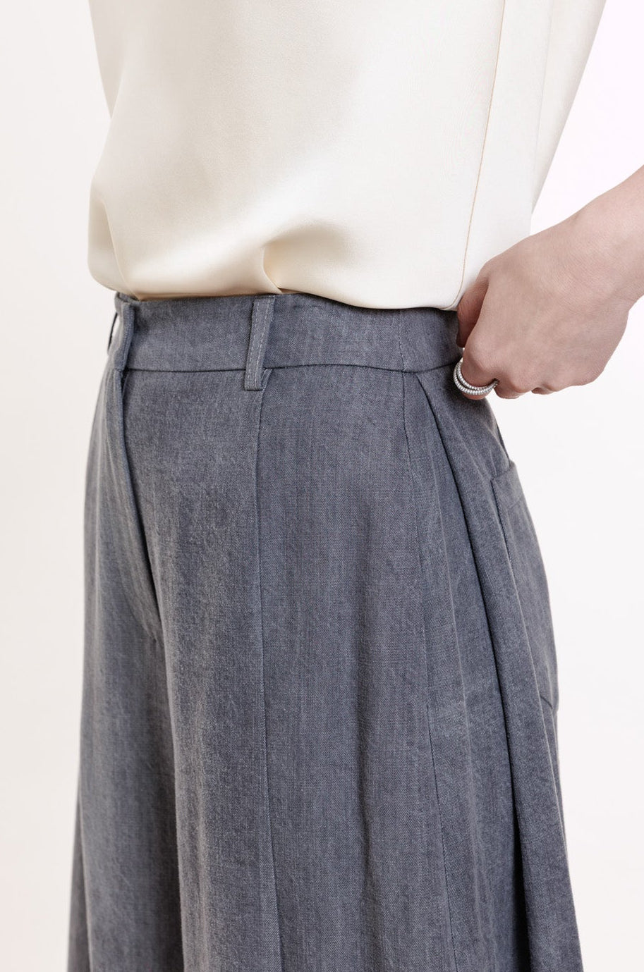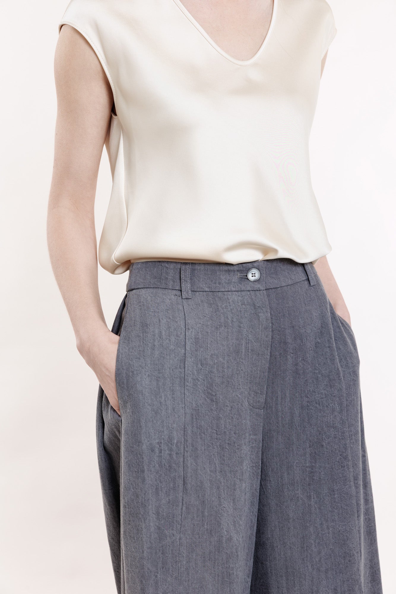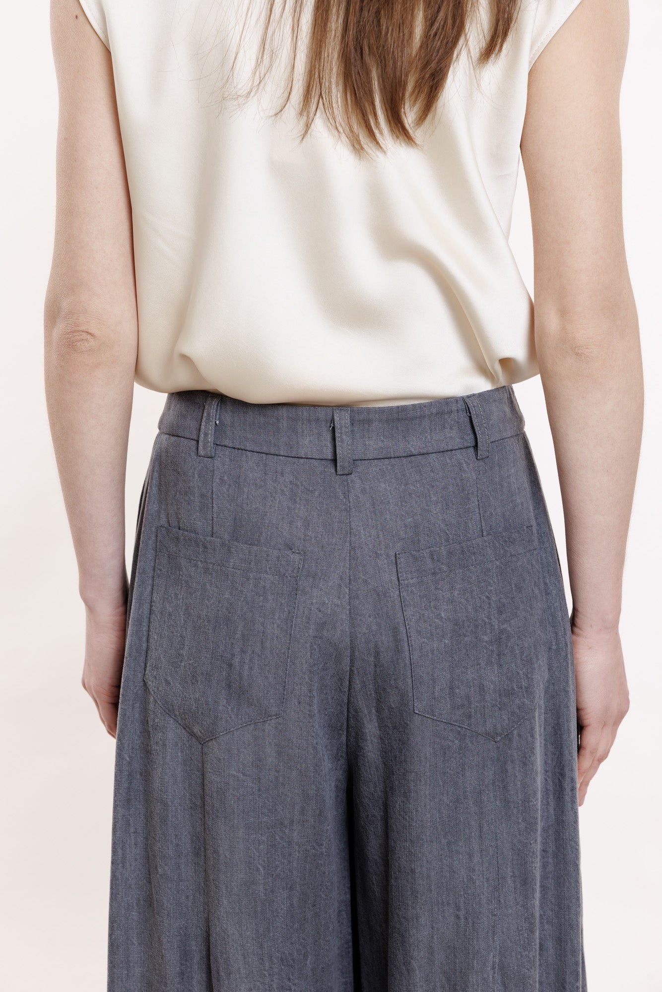 Pelēkas bikses no krītoša auduma, graudainas faktūras audums ar marmora rakstiņu. Biksēm ir šaurs vioduklis un plata staru daļa. Pilnam komplektam pieejama tāda paša auduma žakete. Garums pa staras ārmalu 117 cm.