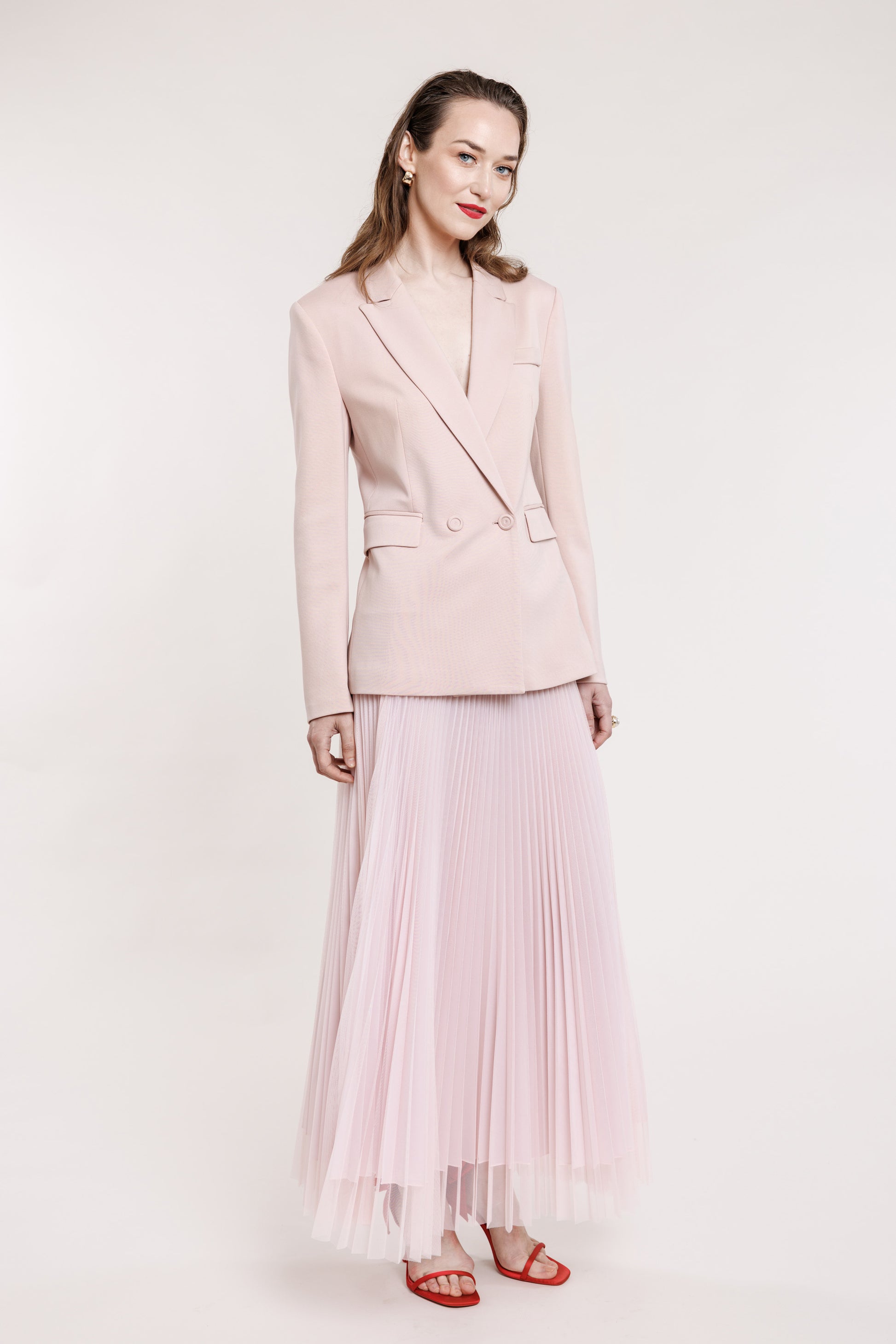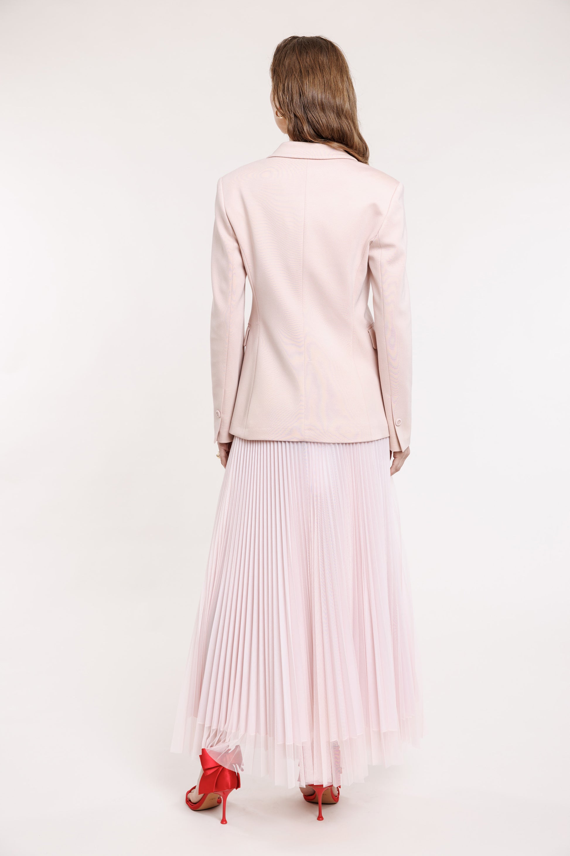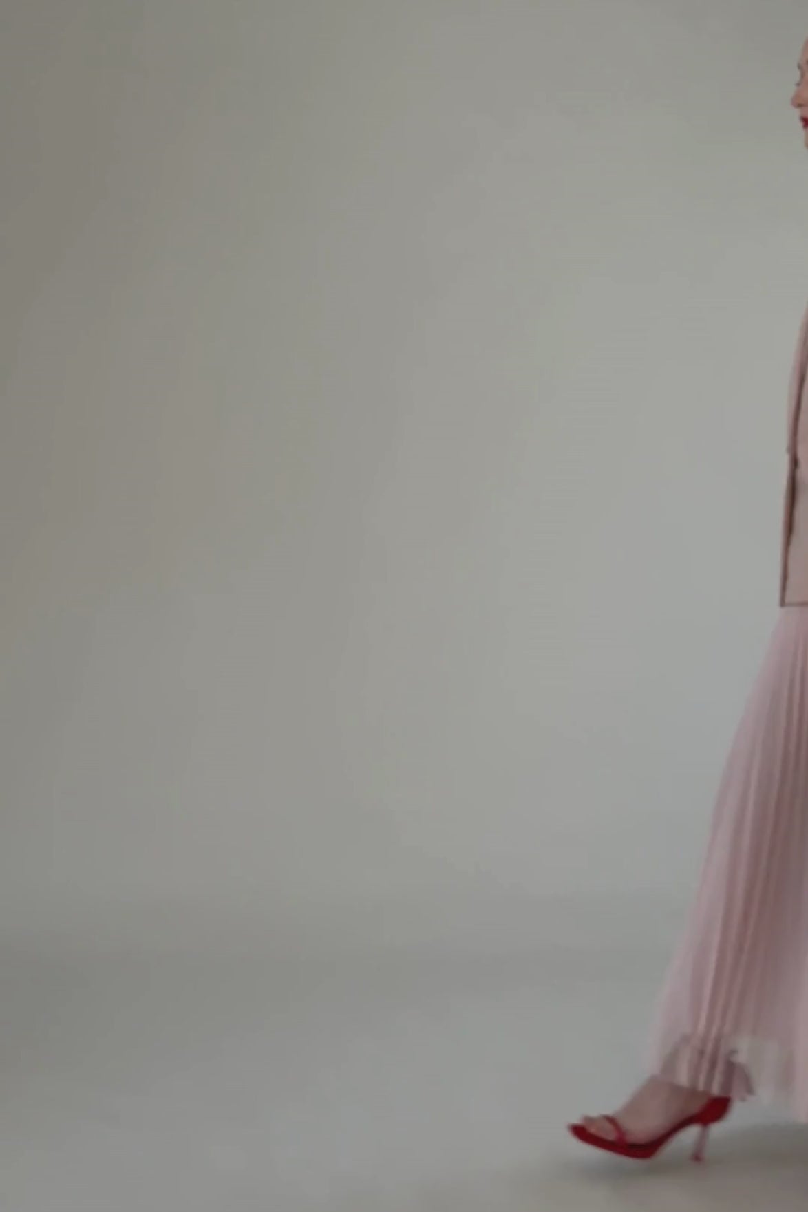 Rozā svārki no gofrēta tilla ar oderi, jostas vietā gumija.