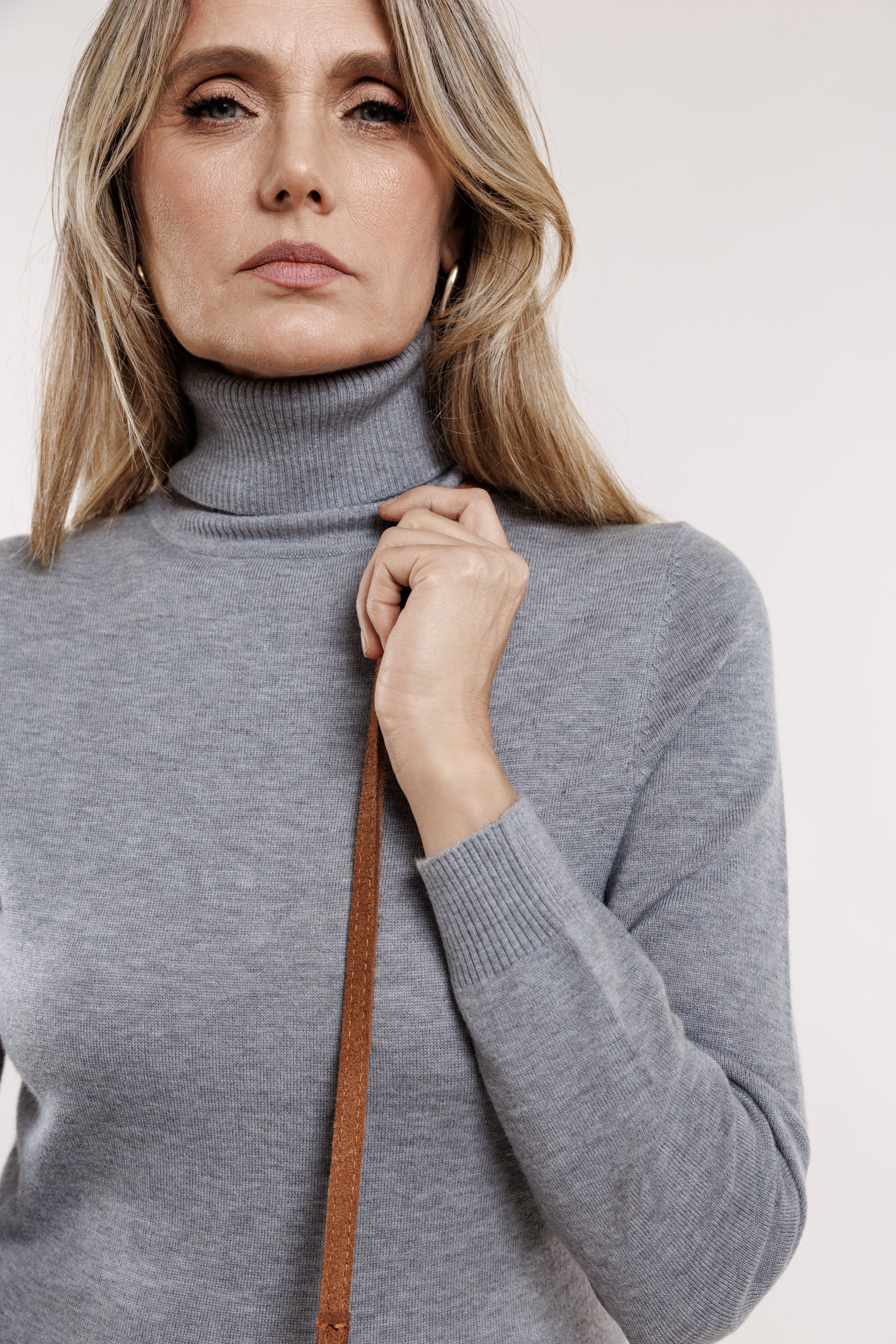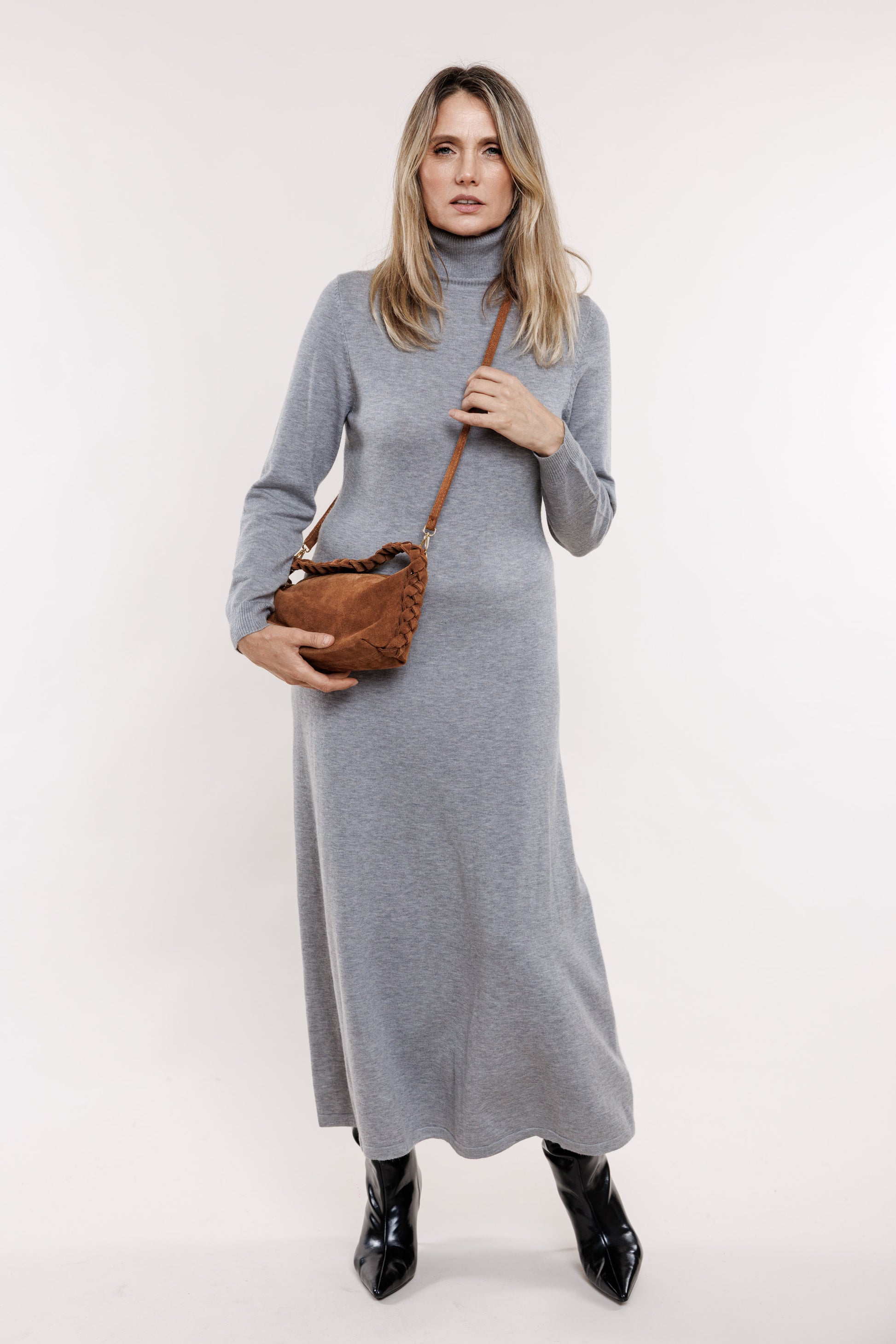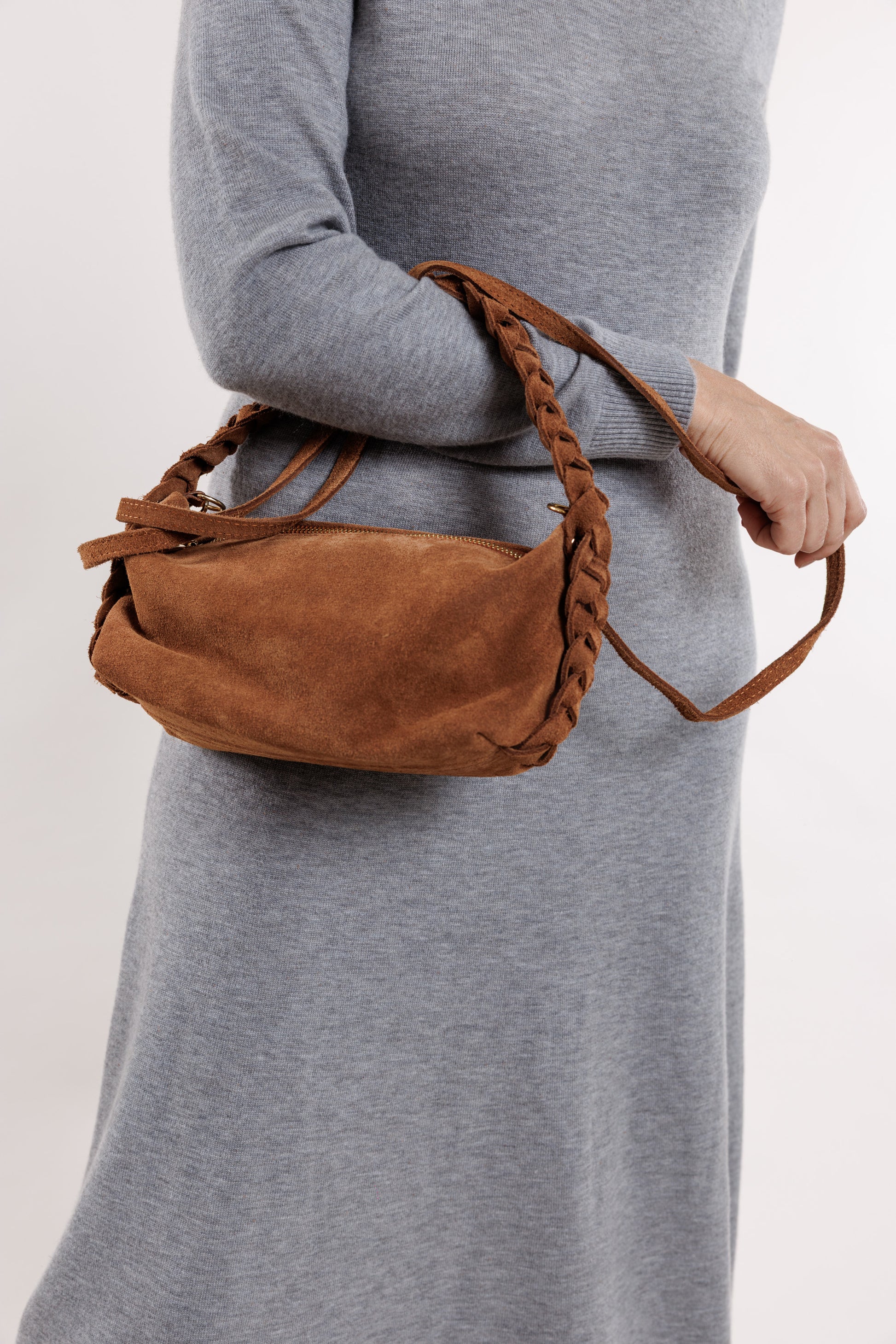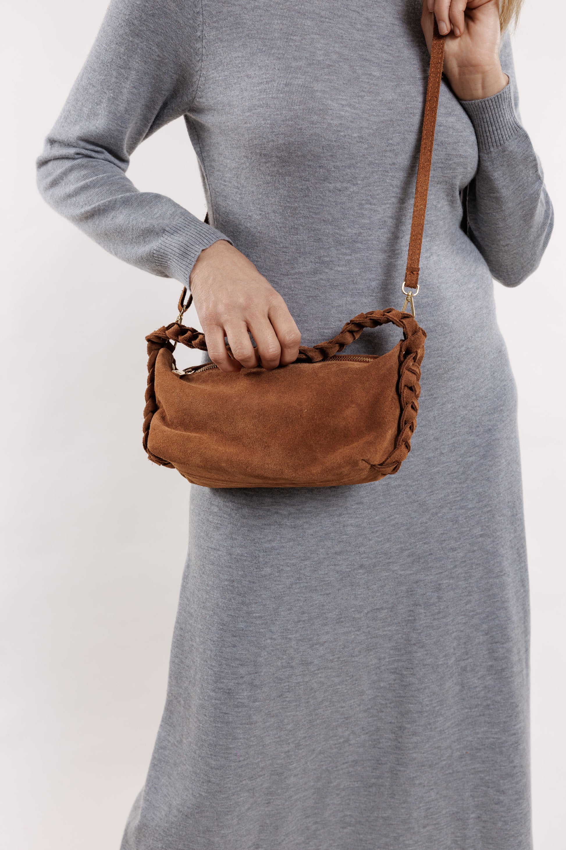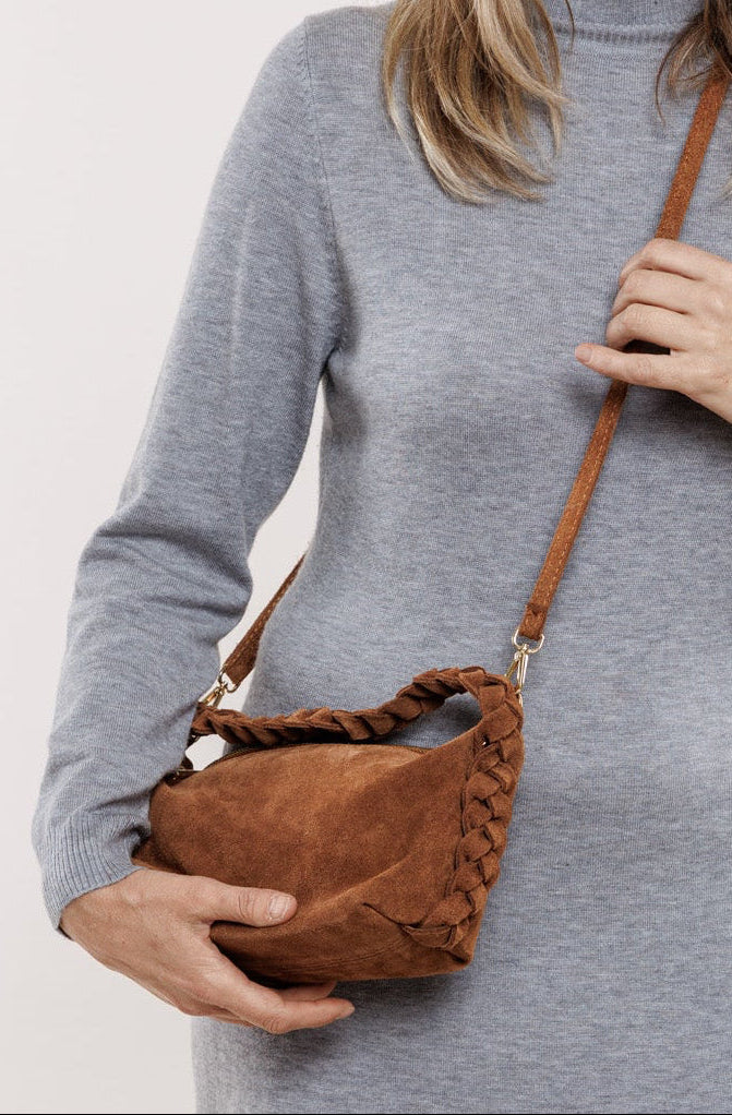 Ruda toņa zamšādas somiņa ar pīni, īsā lence ir pīta un garā lence ir gluda ar regulējamu garumu. Somiņa ir ar oderi un mazo, iekšējo kabatiņu.