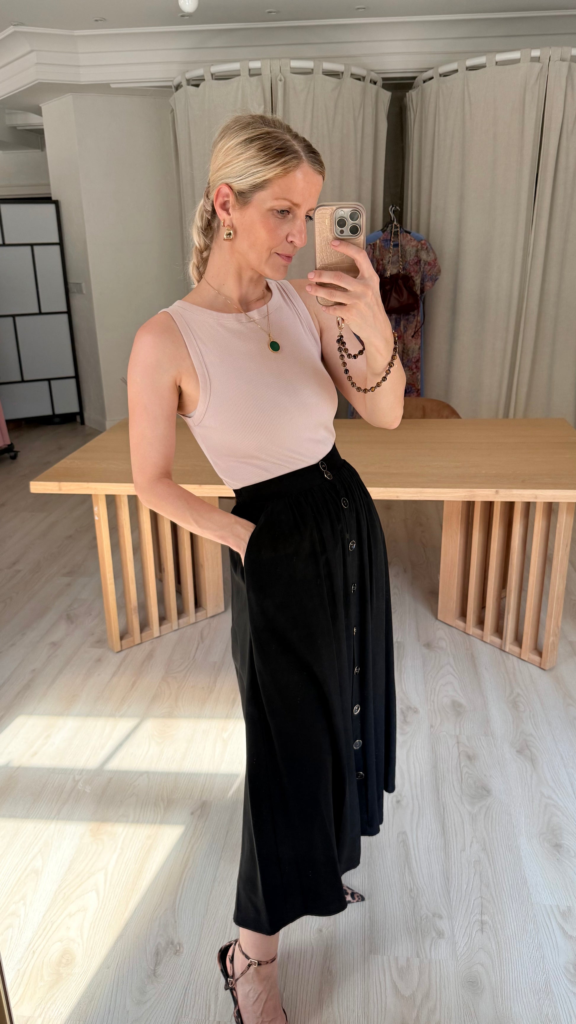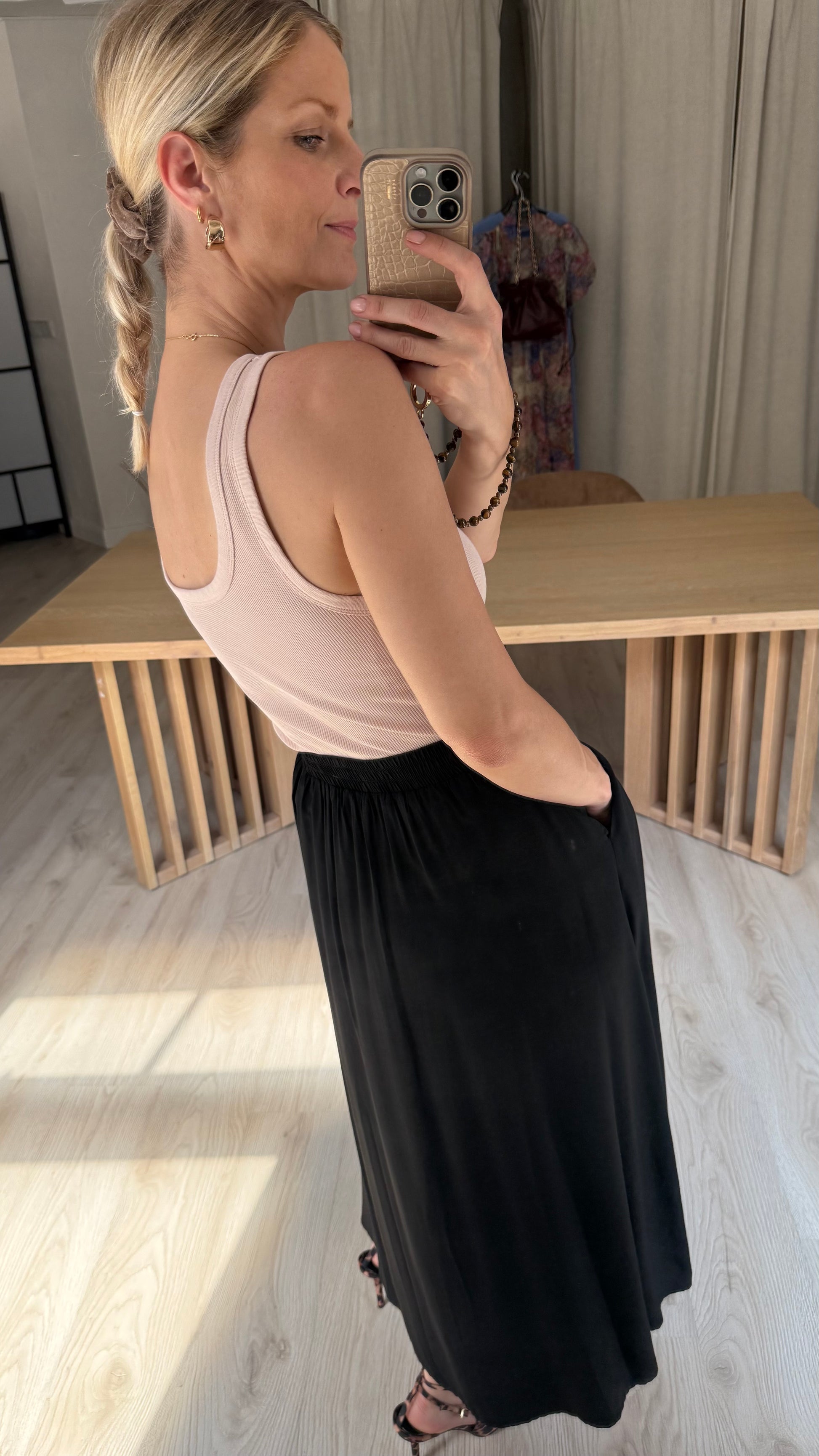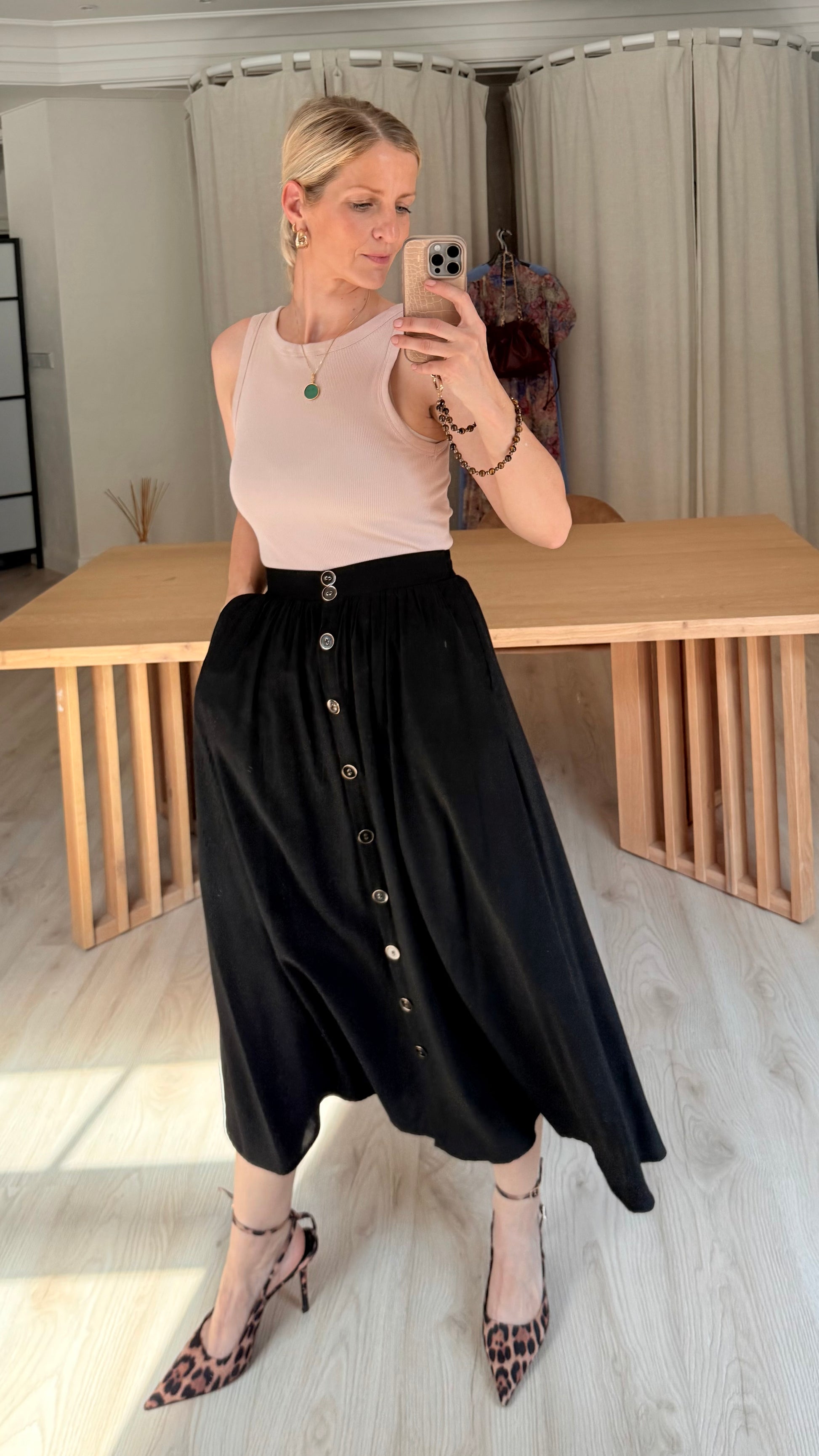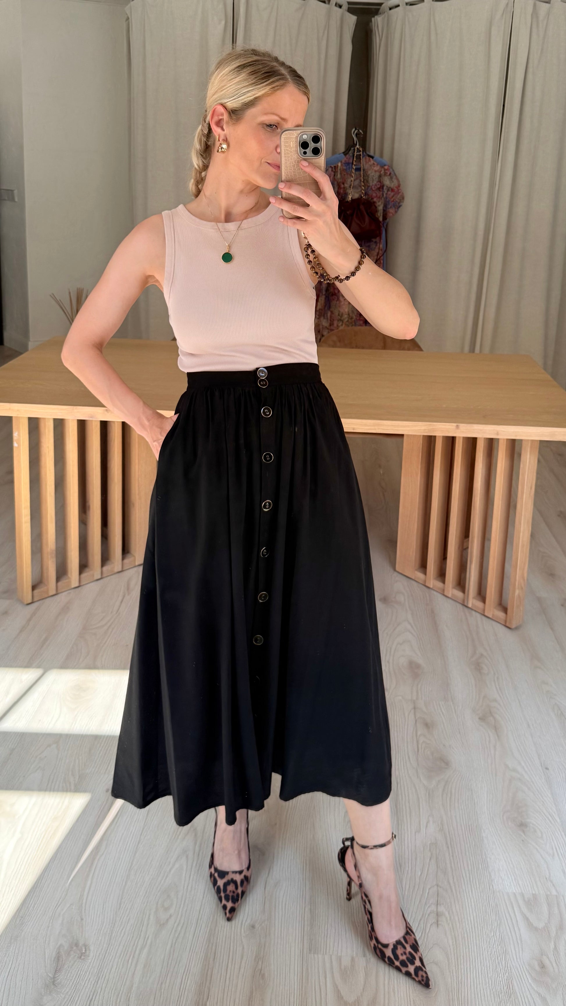 Šifona svārki ar pogām melnā krāsā, ir kabatas. Mugurpusē jostas daļā gumija, pogas pogājamas vaļā vēlamajā dziļumā.