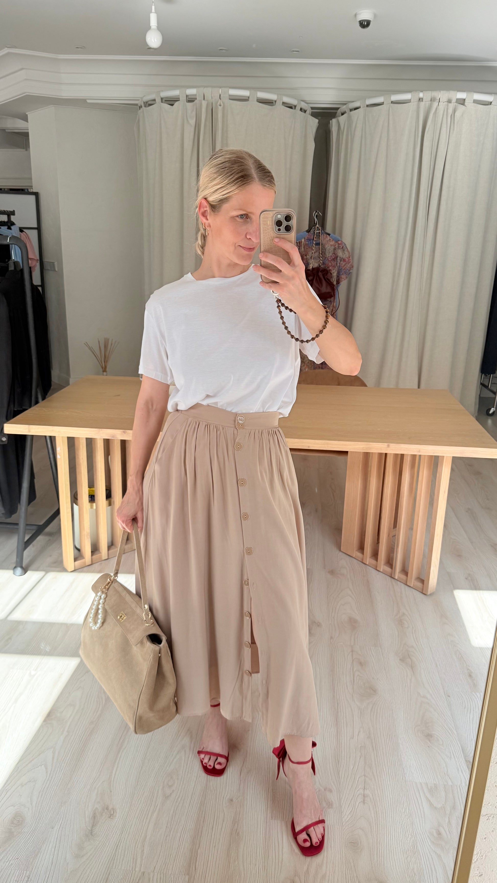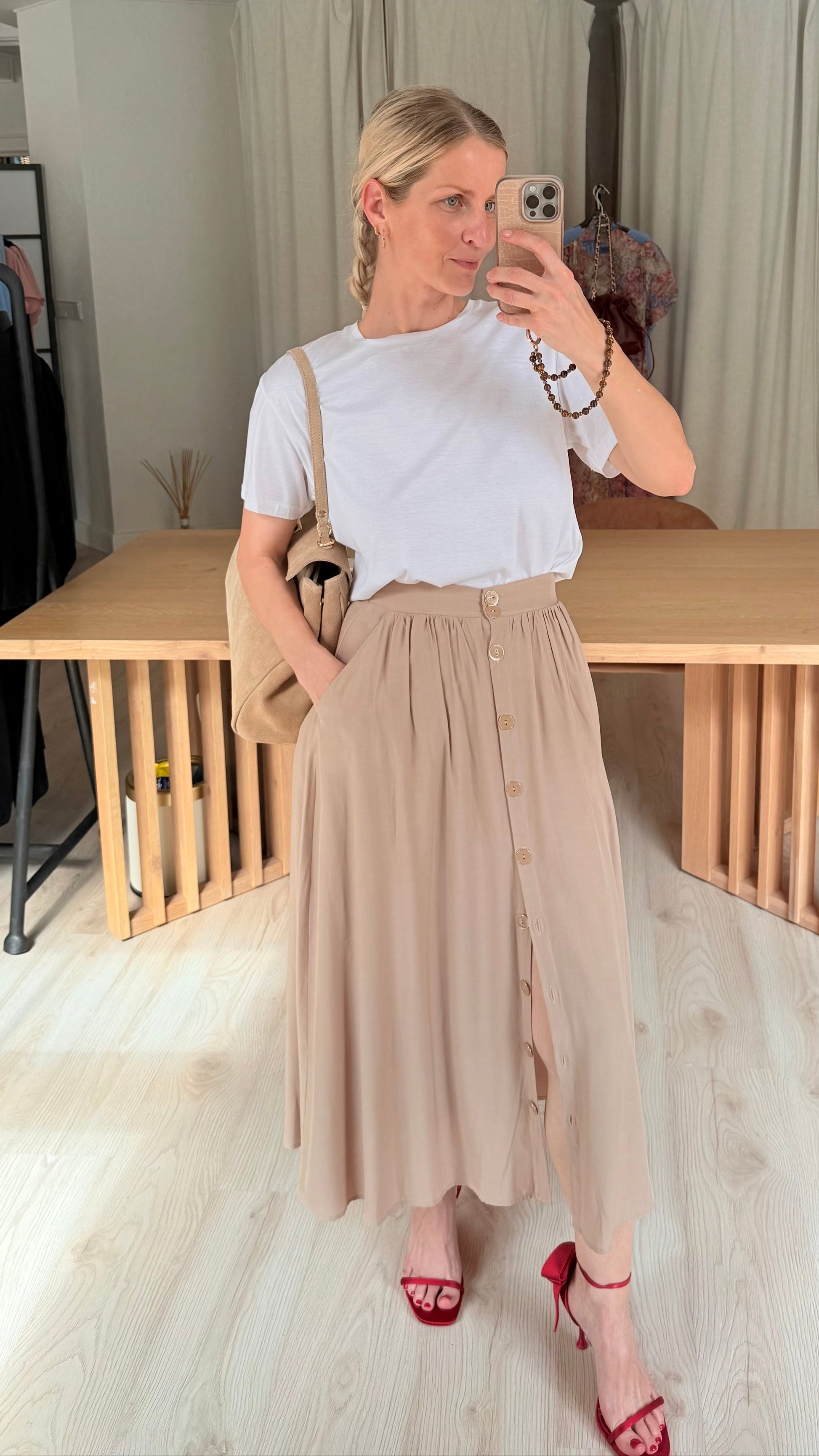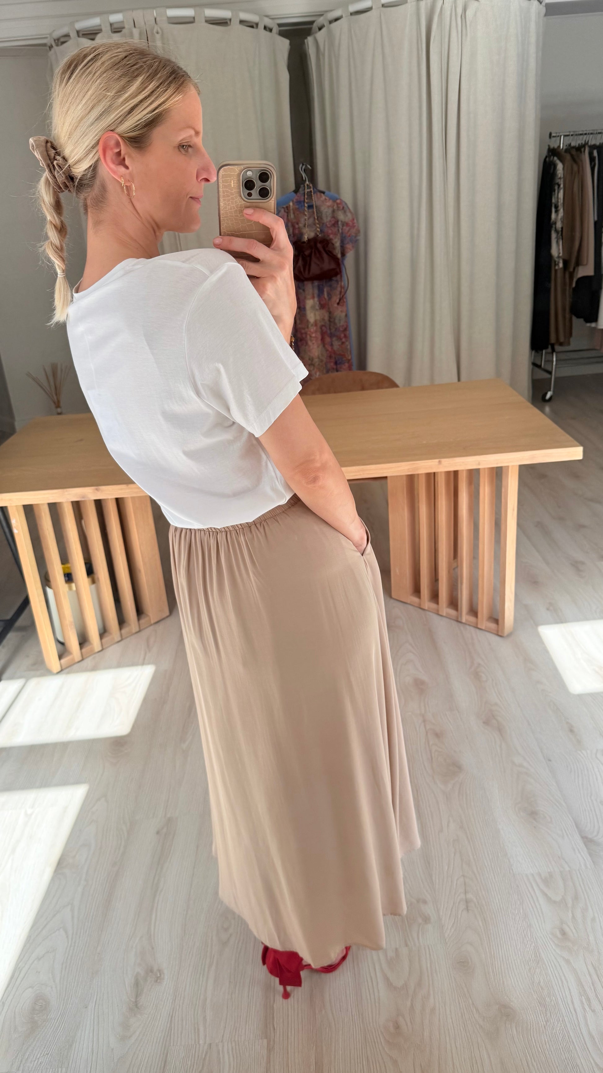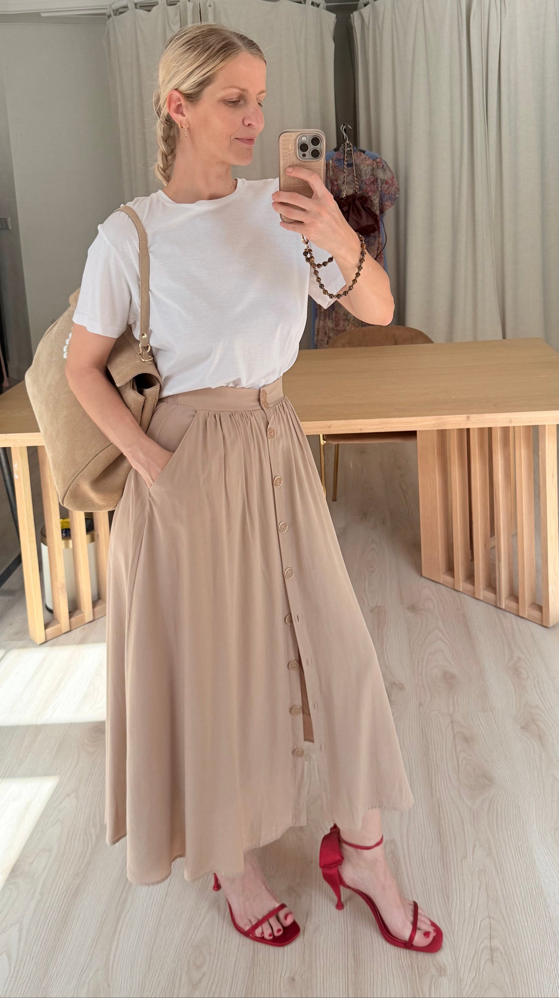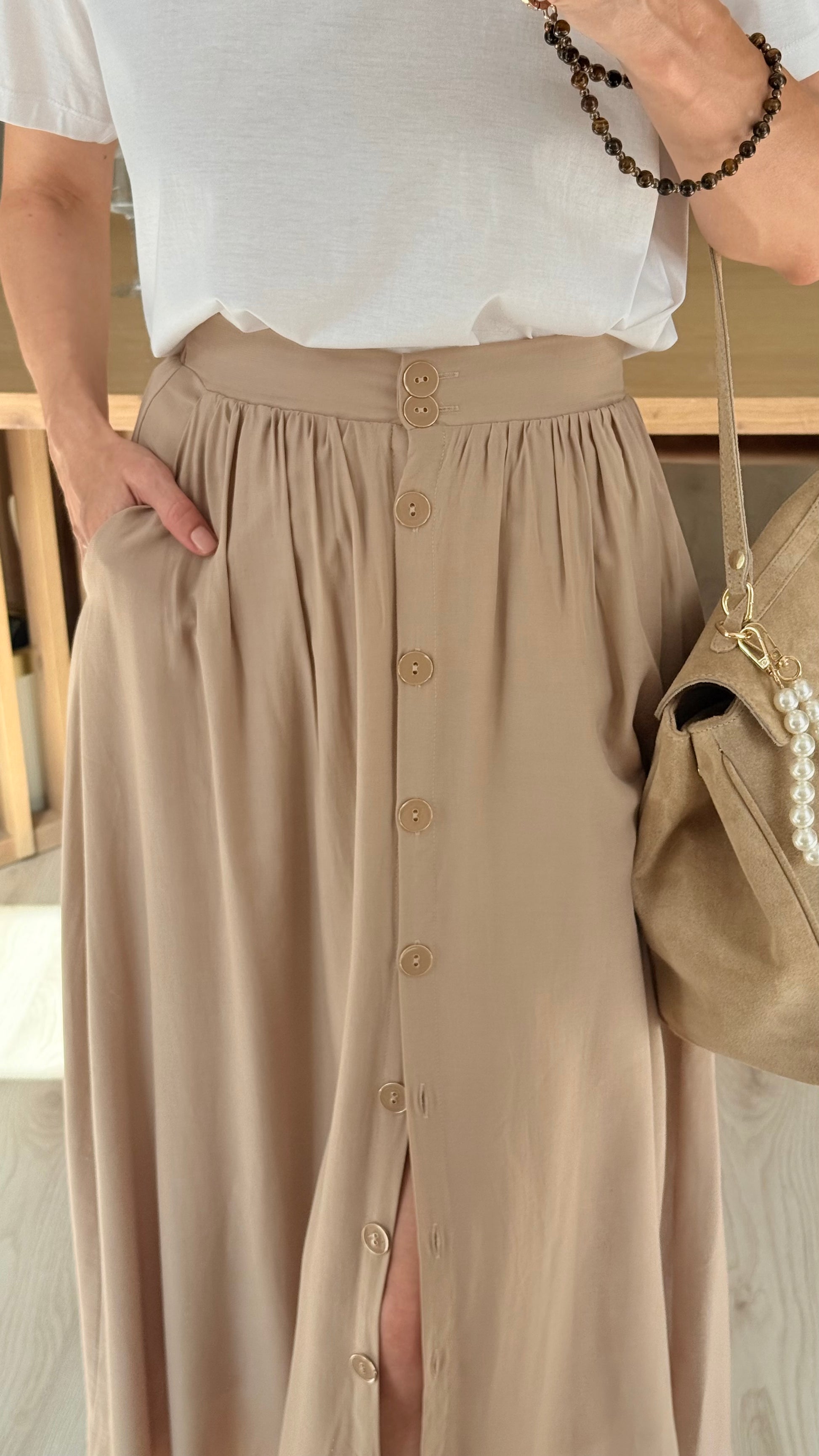 Šifona svārki ar pogām smilšu tonī, ir kabatas. Mugurpusē jostas daļā gumija, pogas pogājamas vaļā vēlamajā dziļumā.