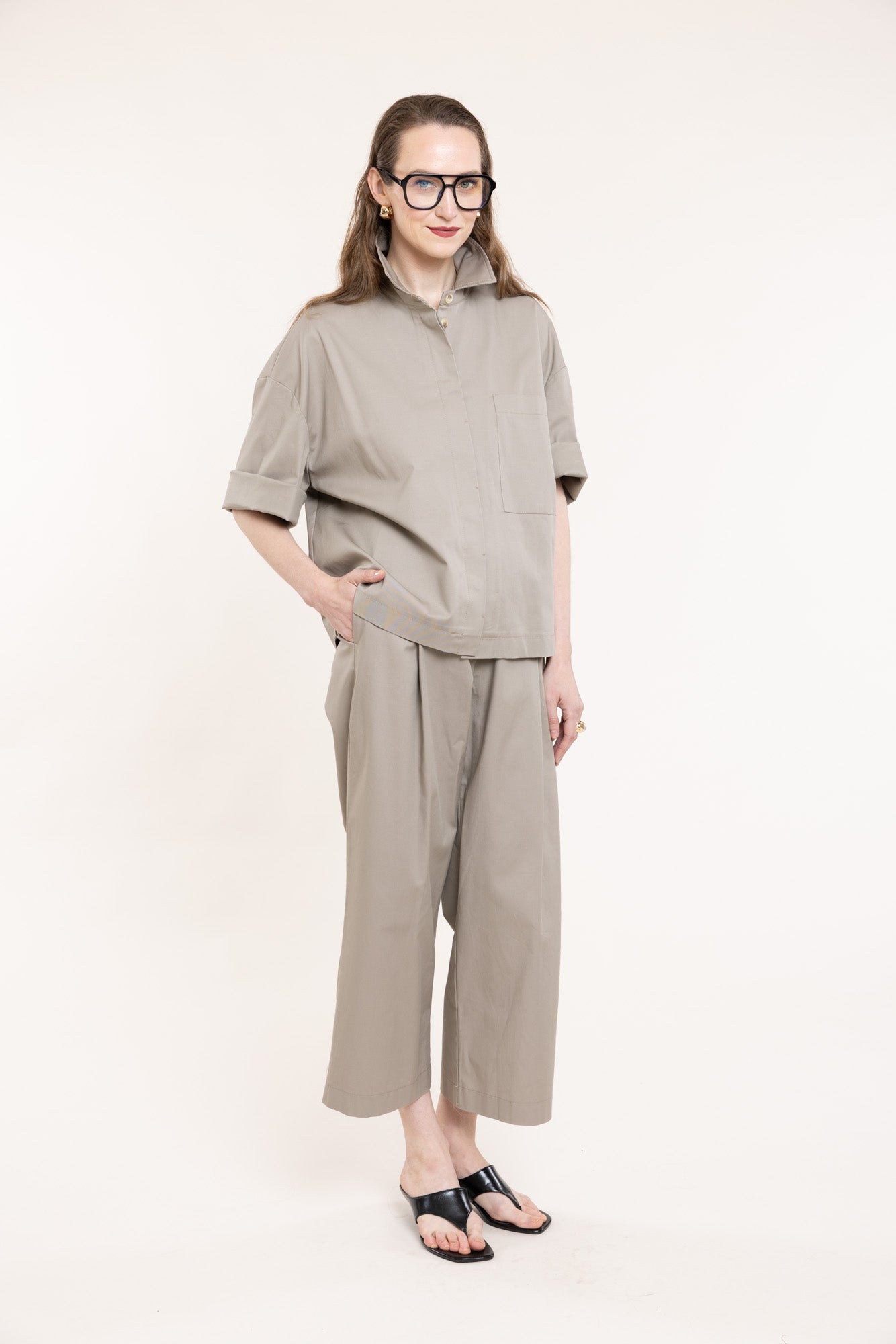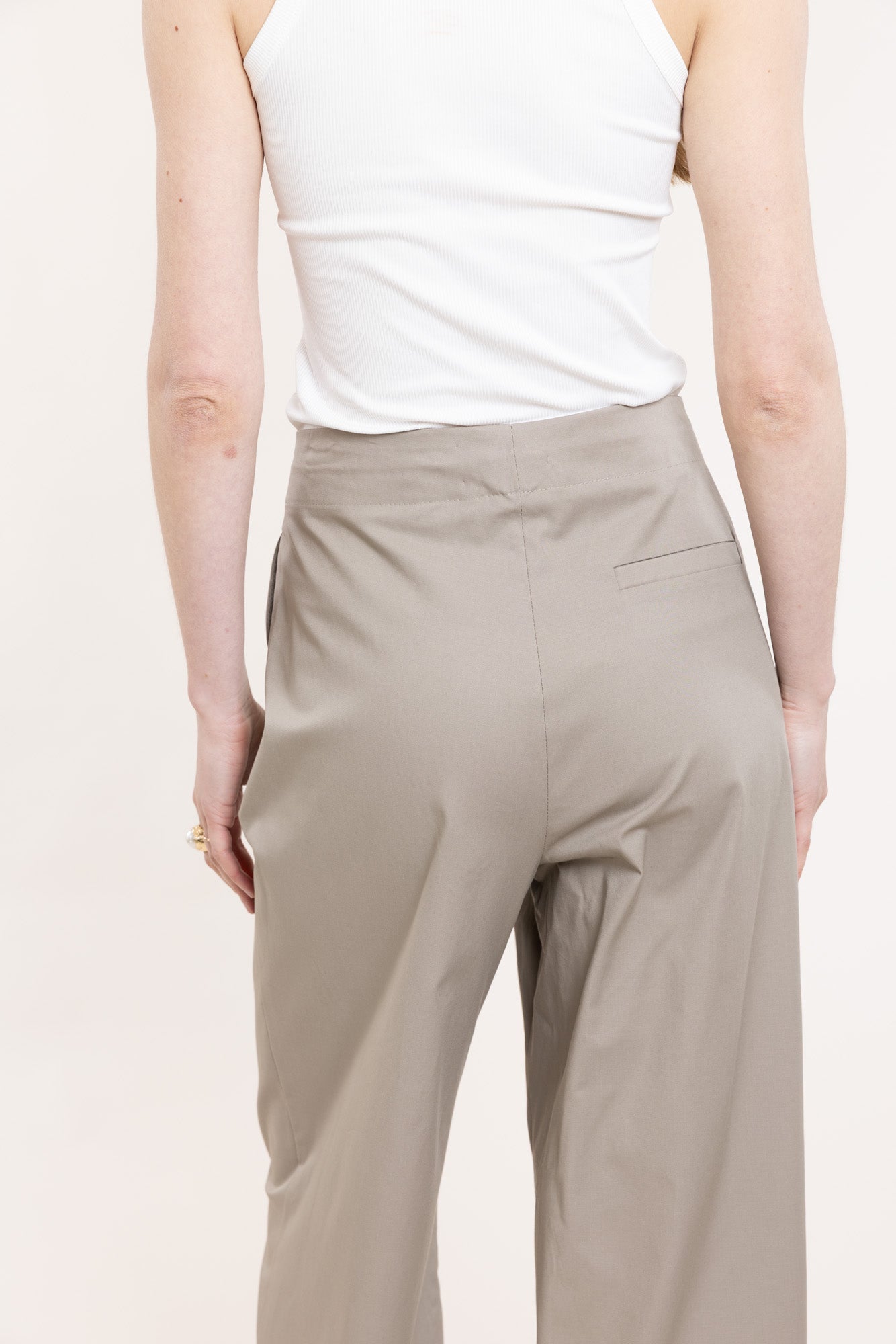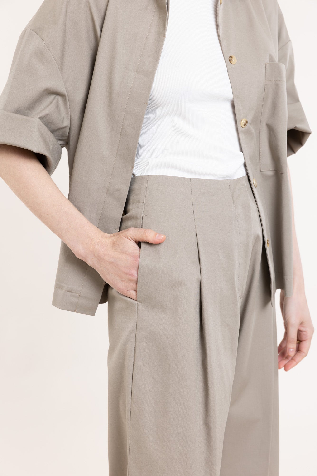 Smilškrāsas bikses ar taisnām, brīvi krītošām starām un krokojumu priekšpusē. Bikses ir ar sānu kabatām un gludu jostasvietu, aizmugurējā daļā ir dekoratīva kabata. Lieliski piemērotas komplekta veidošanai ar tāda paša auduma kreklu.