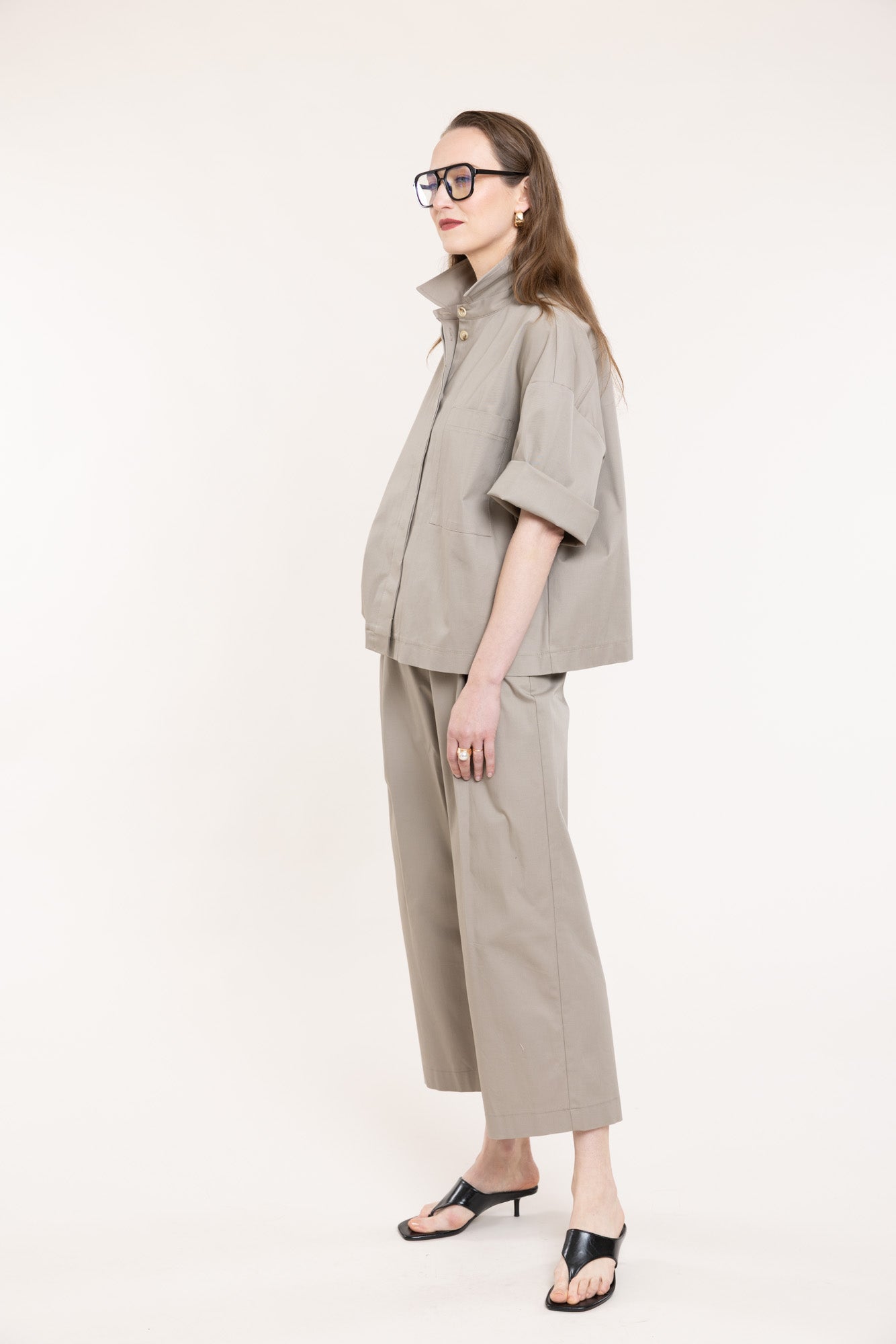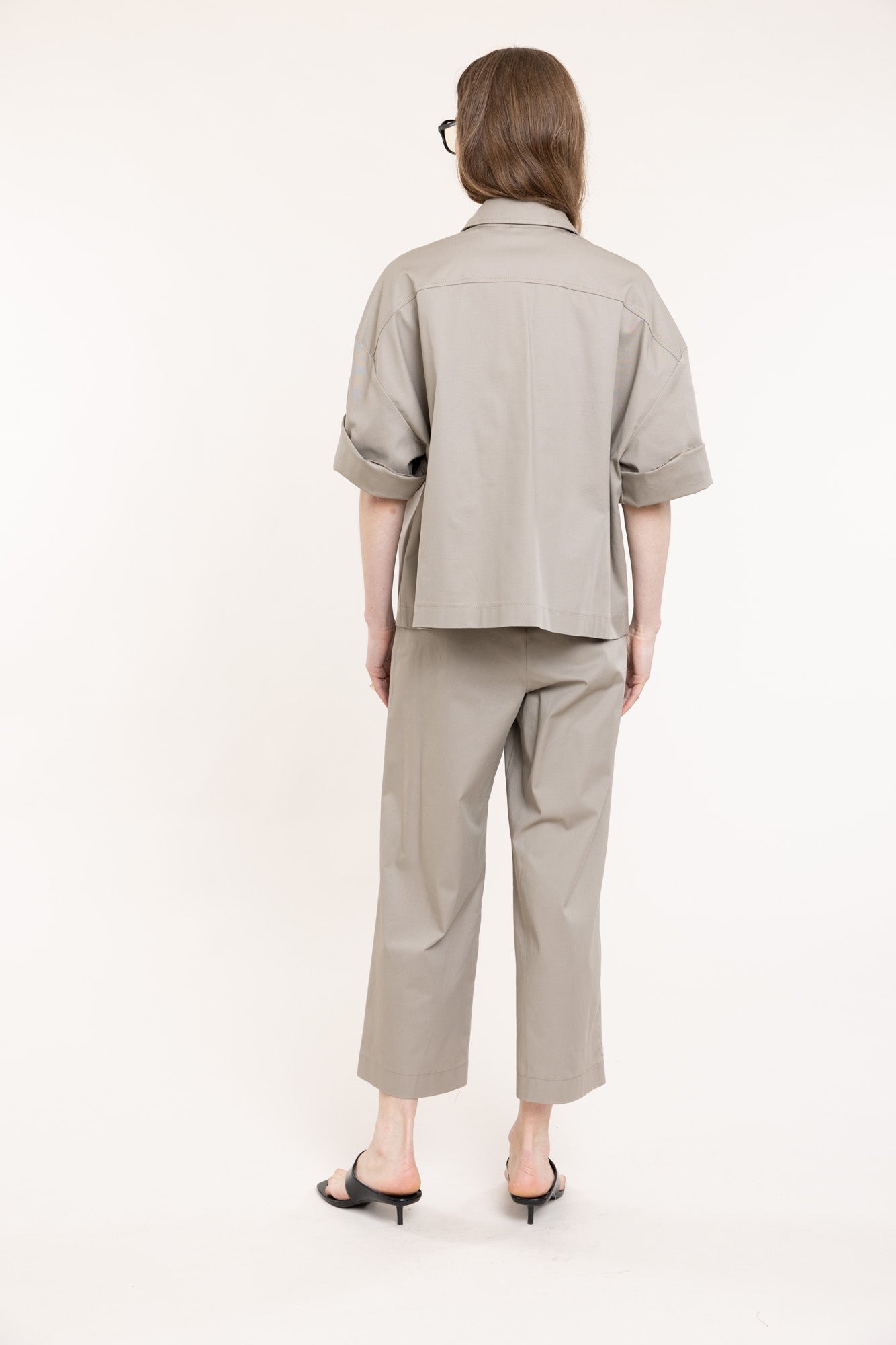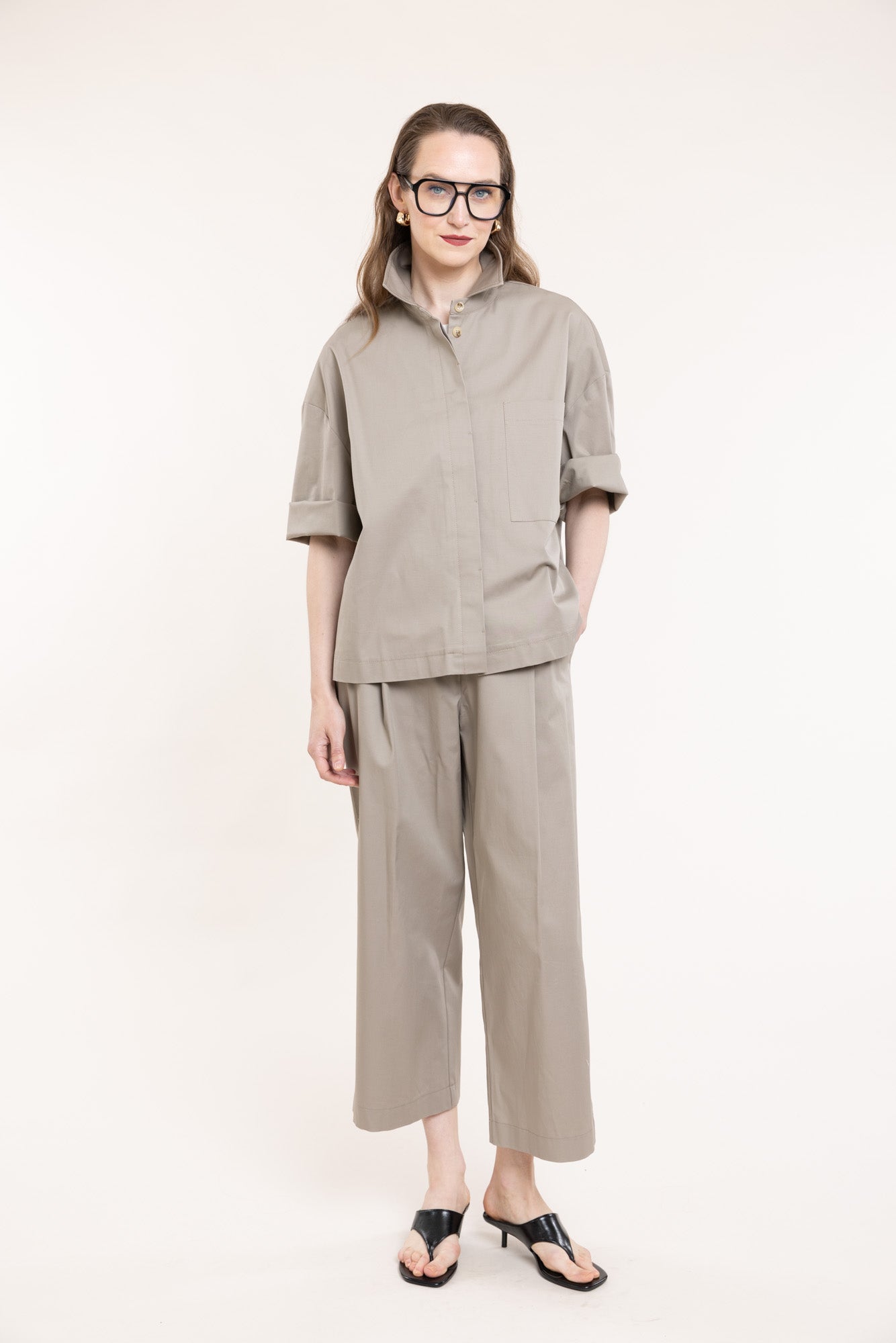 Smilškrāsas bikses ar taisnām, brīvi krītošām starām un krokojumu priekšpusē. Bikses ir ar sānu kabatām un gludu jostasvietu, aizmugurējā daļā ir dekoratīva kabata. Lieliski piemērotas komplekta veidošanai ar tāda paša auduma kreklu.