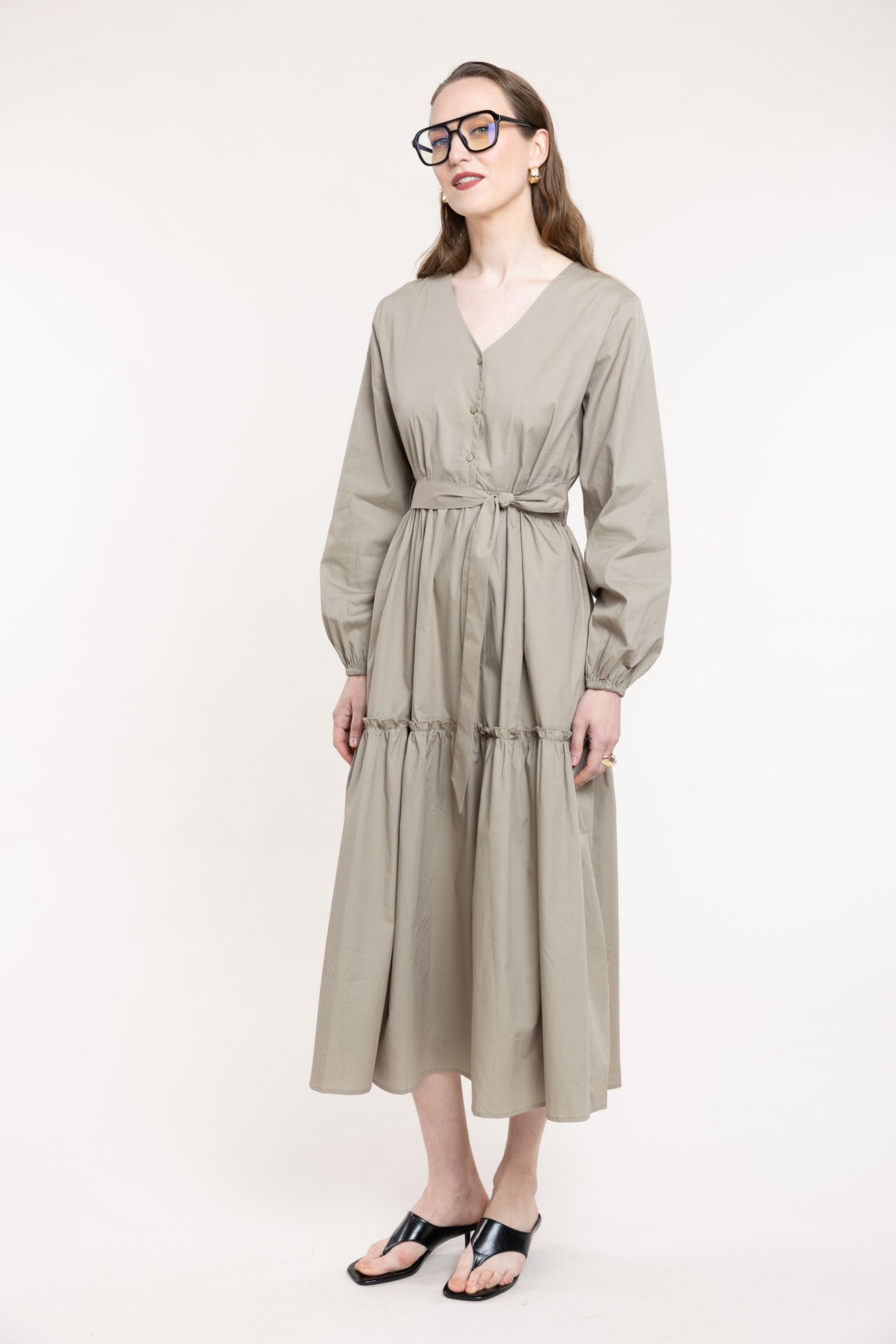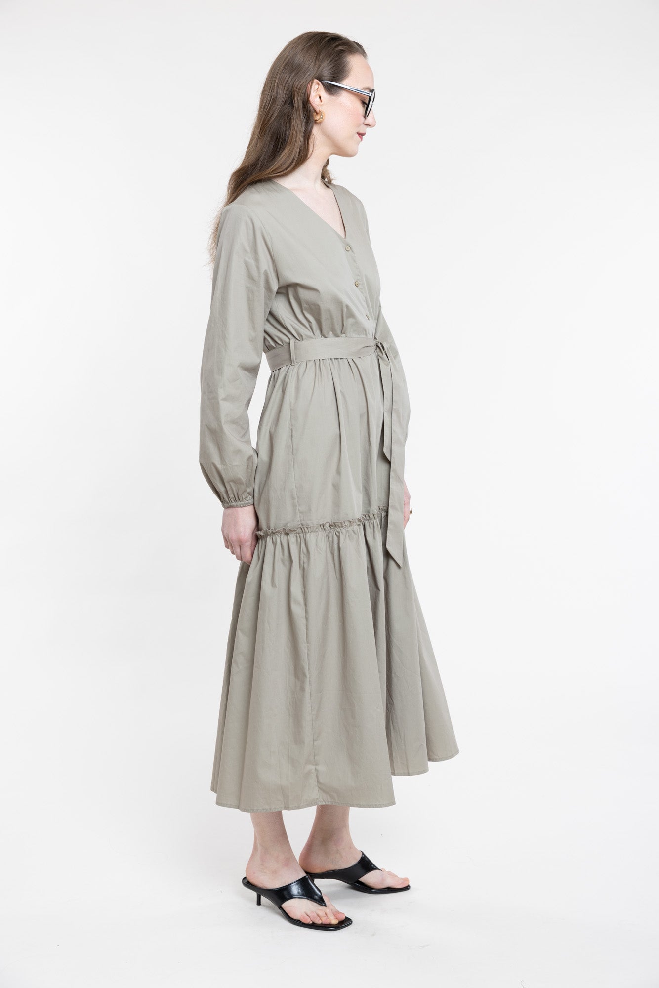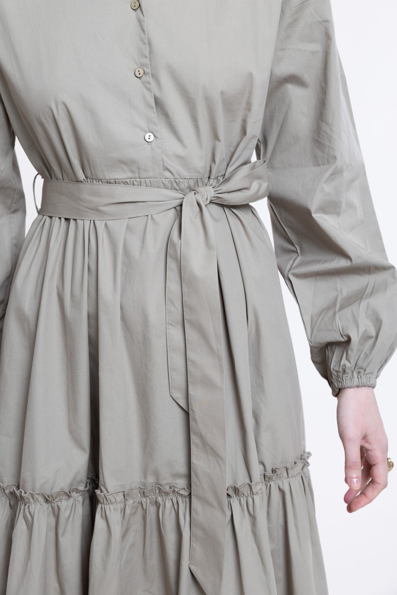 Zaļpelēka toņa kleita no mīksta 100% kokvilnas auduma. Kleitai ir garais midi garums, V veida kakla izgriezums un pogu rinda priekšpusē. Garas piedurknes ar gumiju un viduklī ir sasienama josta, kas lieliski izceļ siluetu