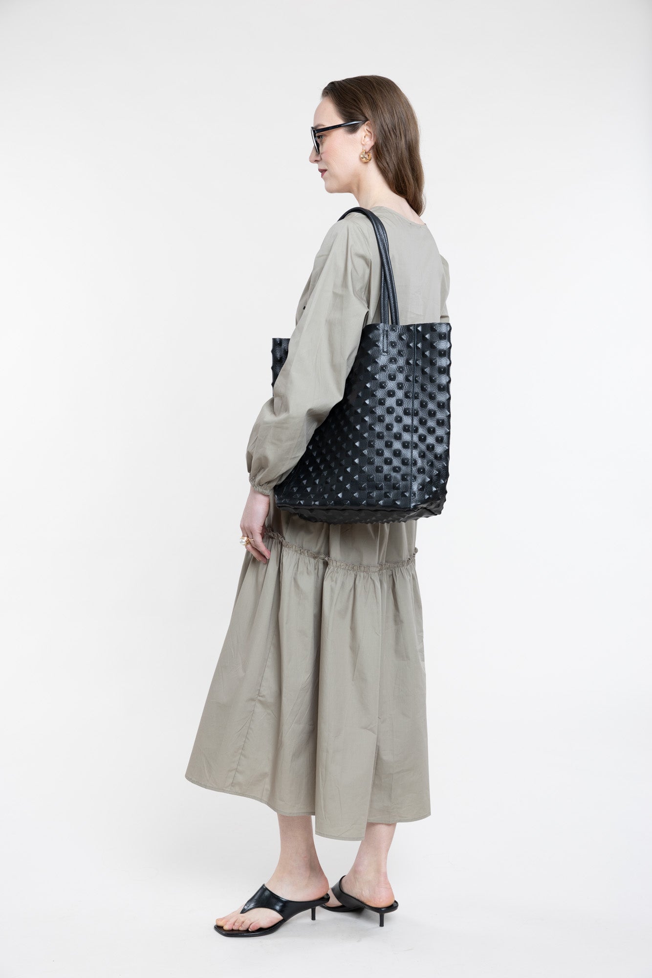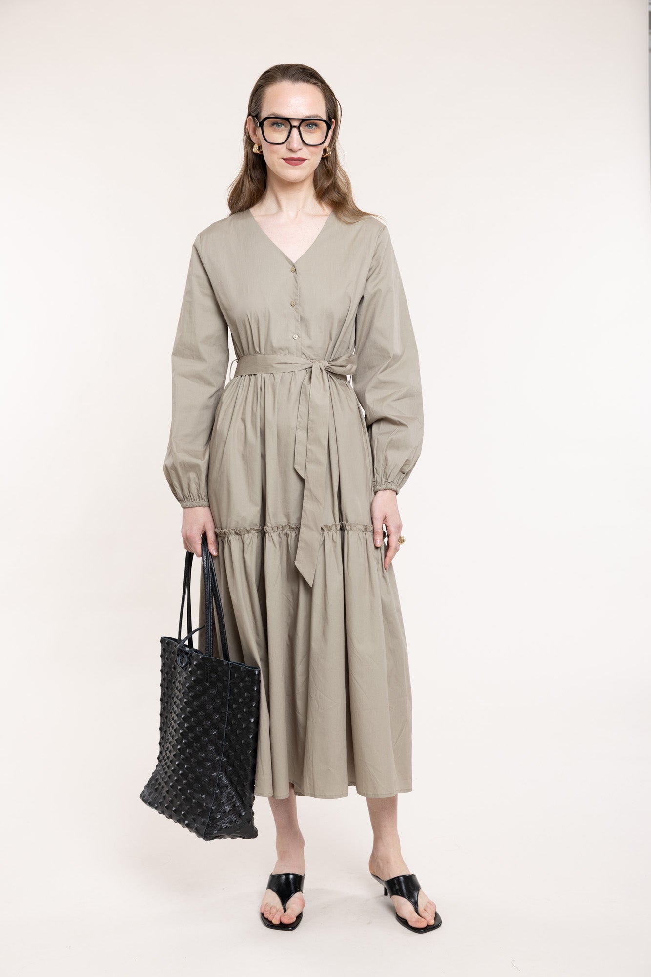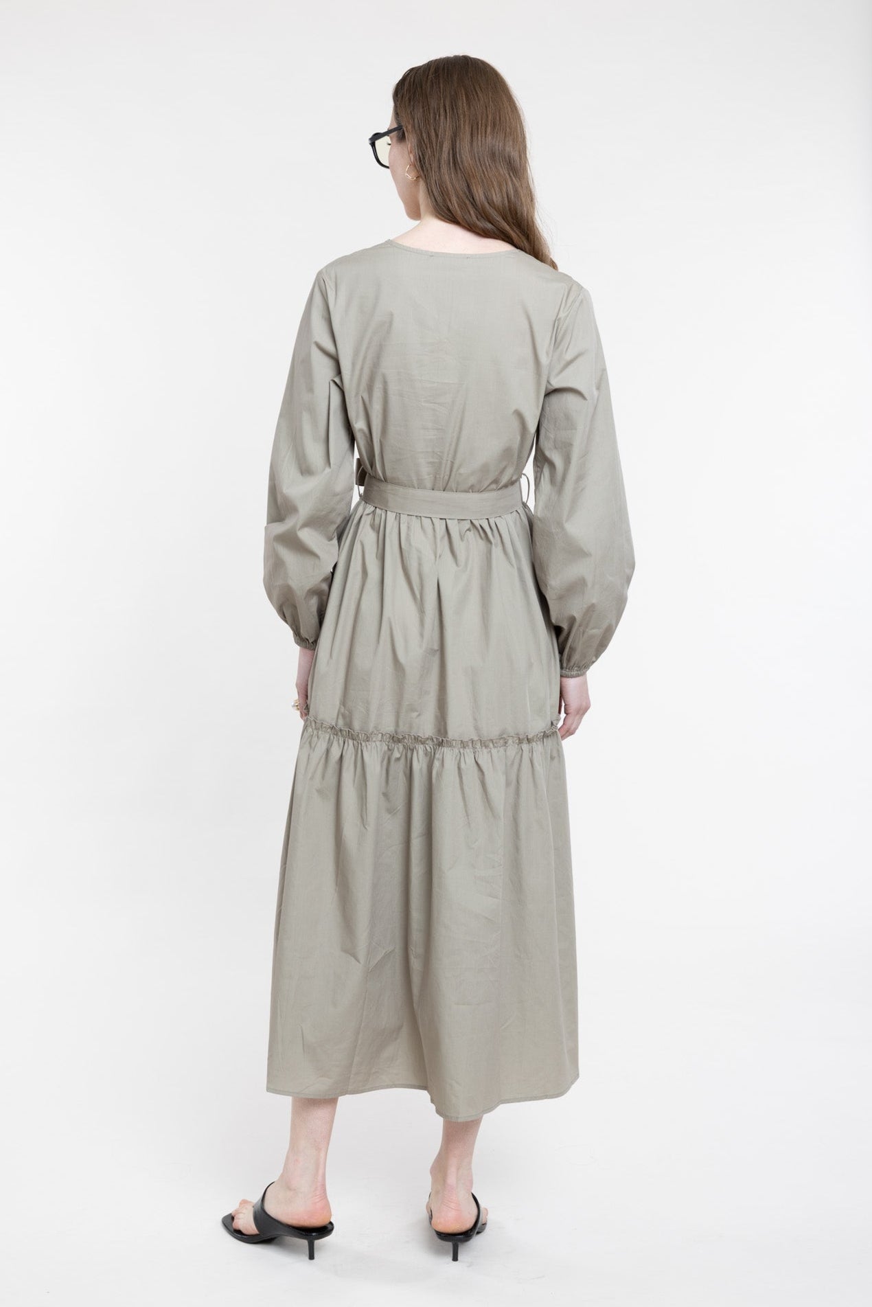 Zaļpelēka toņa kleita no mīksta 100% kokvilnas auduma. Kleitai ir garais midi garums, V veida kakla izgriezums un pogu rinda priekšpusē. Garas piedurknes ar gumiju un viduklī ir sasienama josta, kas lieliski izceļ siluetu