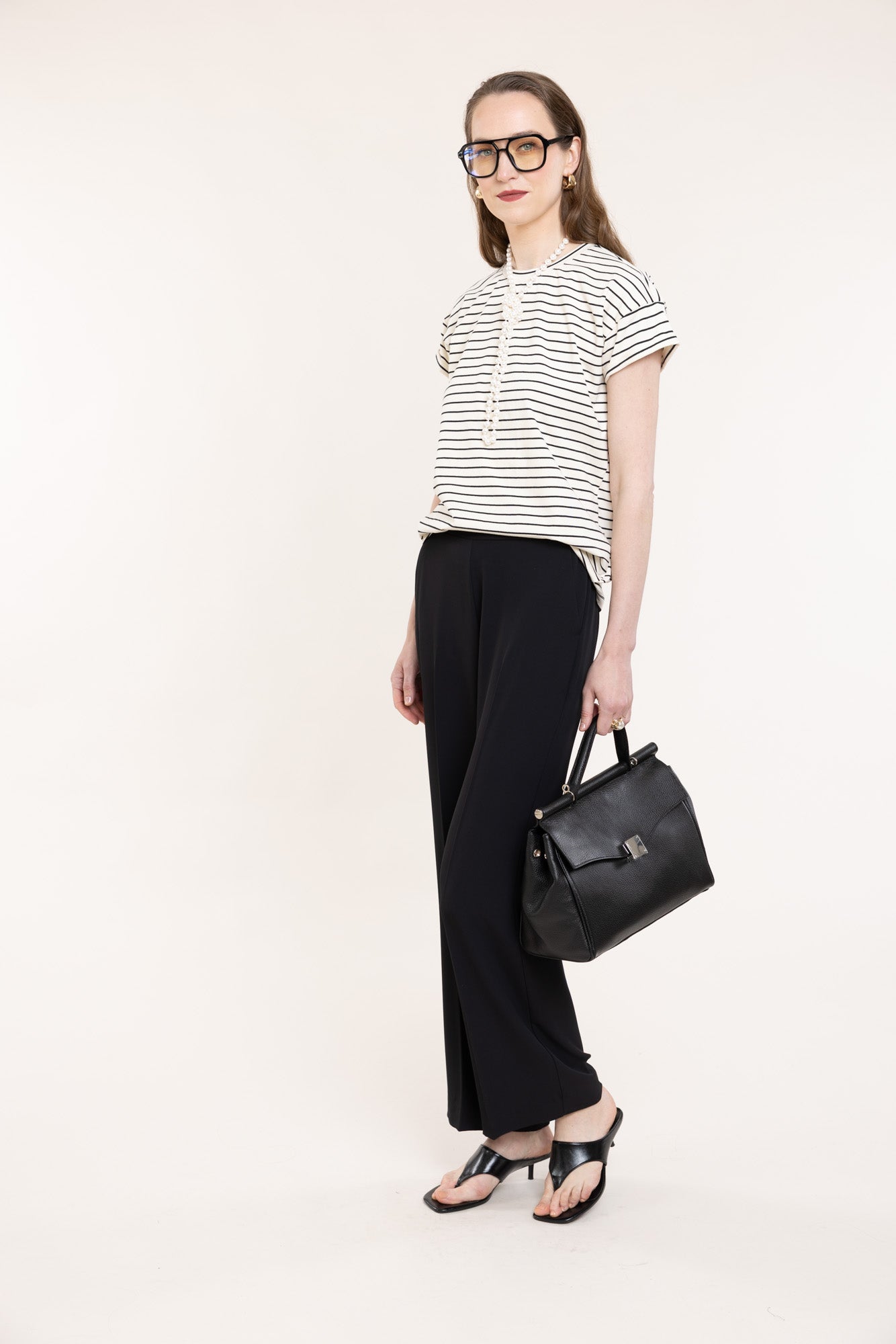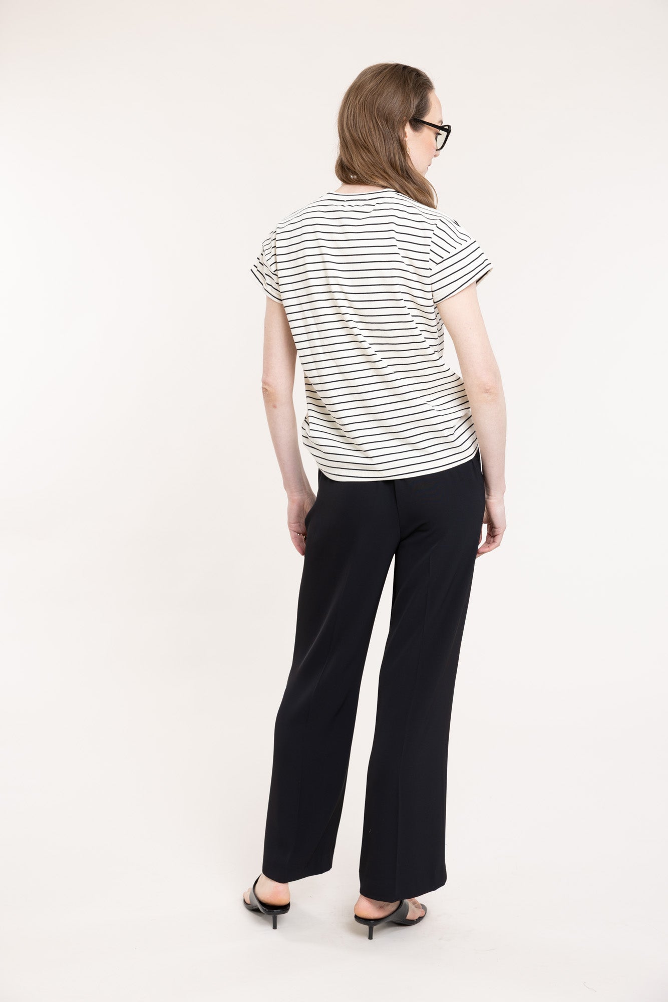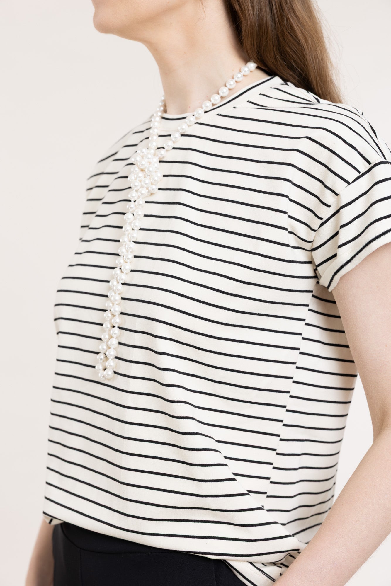 Kokvilnas krekls ar melnām horizontālām svītrām uz balta auduma. Kreklam ir apaļš kakla izgriezums un īsas piedurknes.
