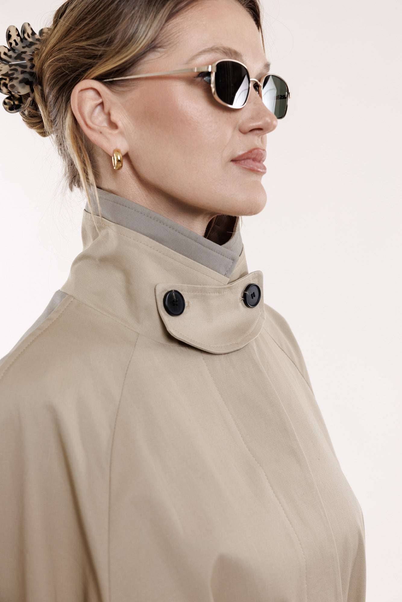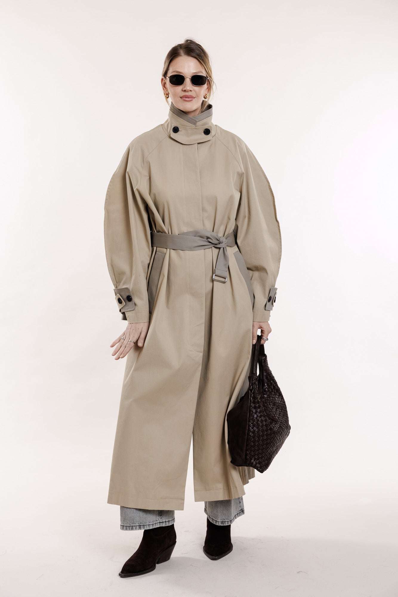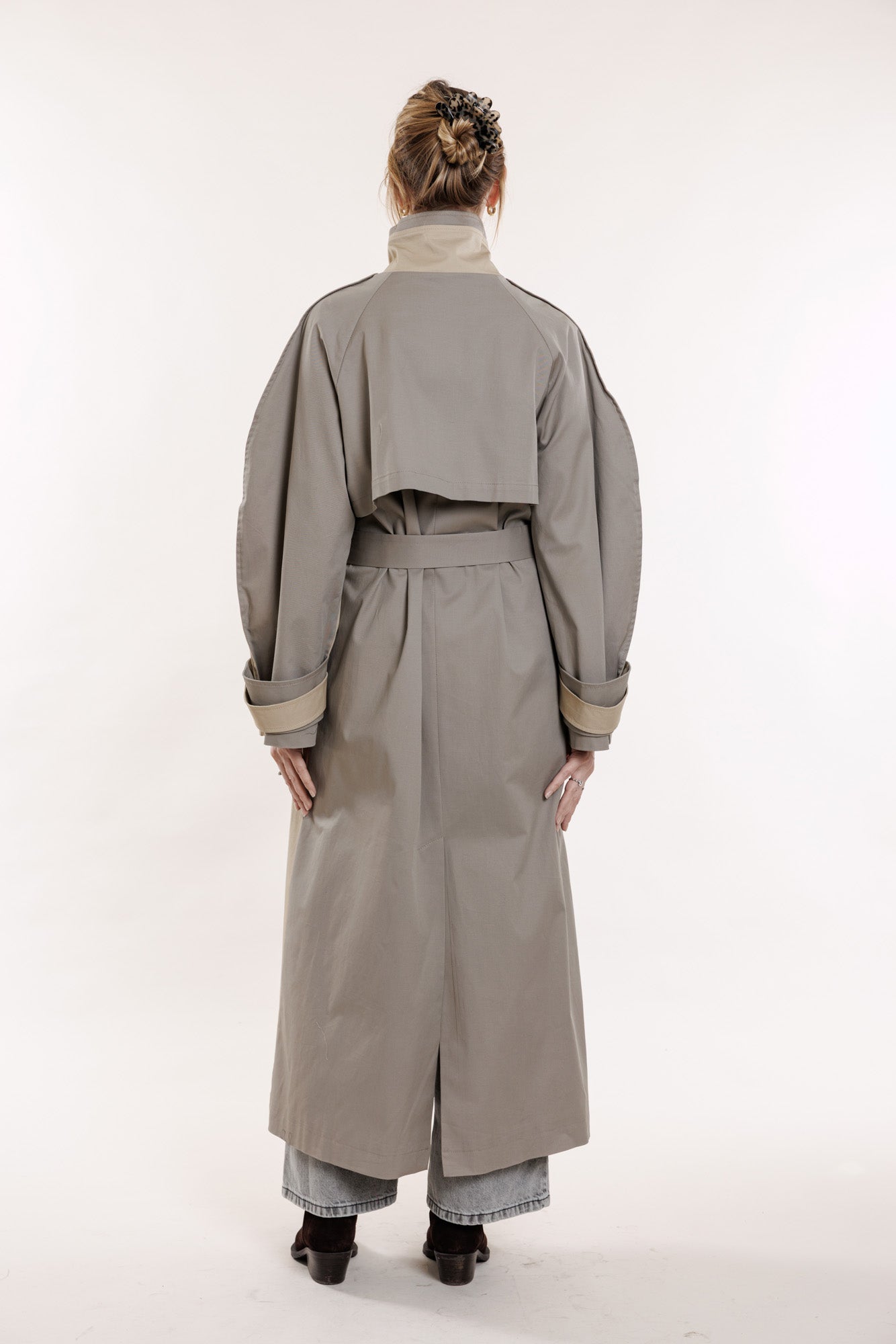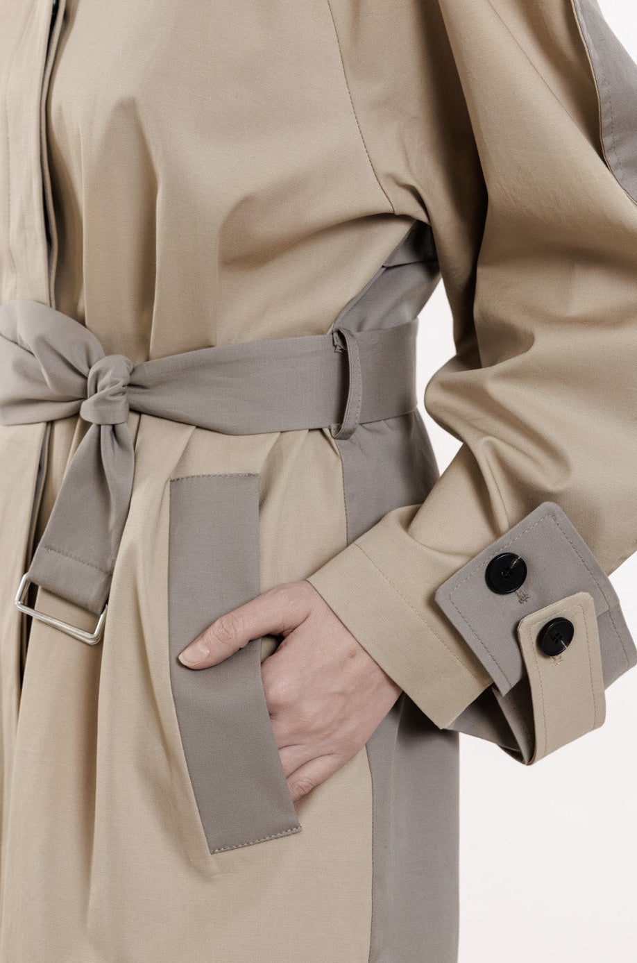 Oderēts trencis ar jostu un slēpto pogu aizdari, ir kabatas. Trencis ir veidots divās krāsās- priekšpuse maigi bēšīga, mugurpuse gaiši pelēka. Manšetēs un kakla aizdarē pieskaņota toņa pogas.