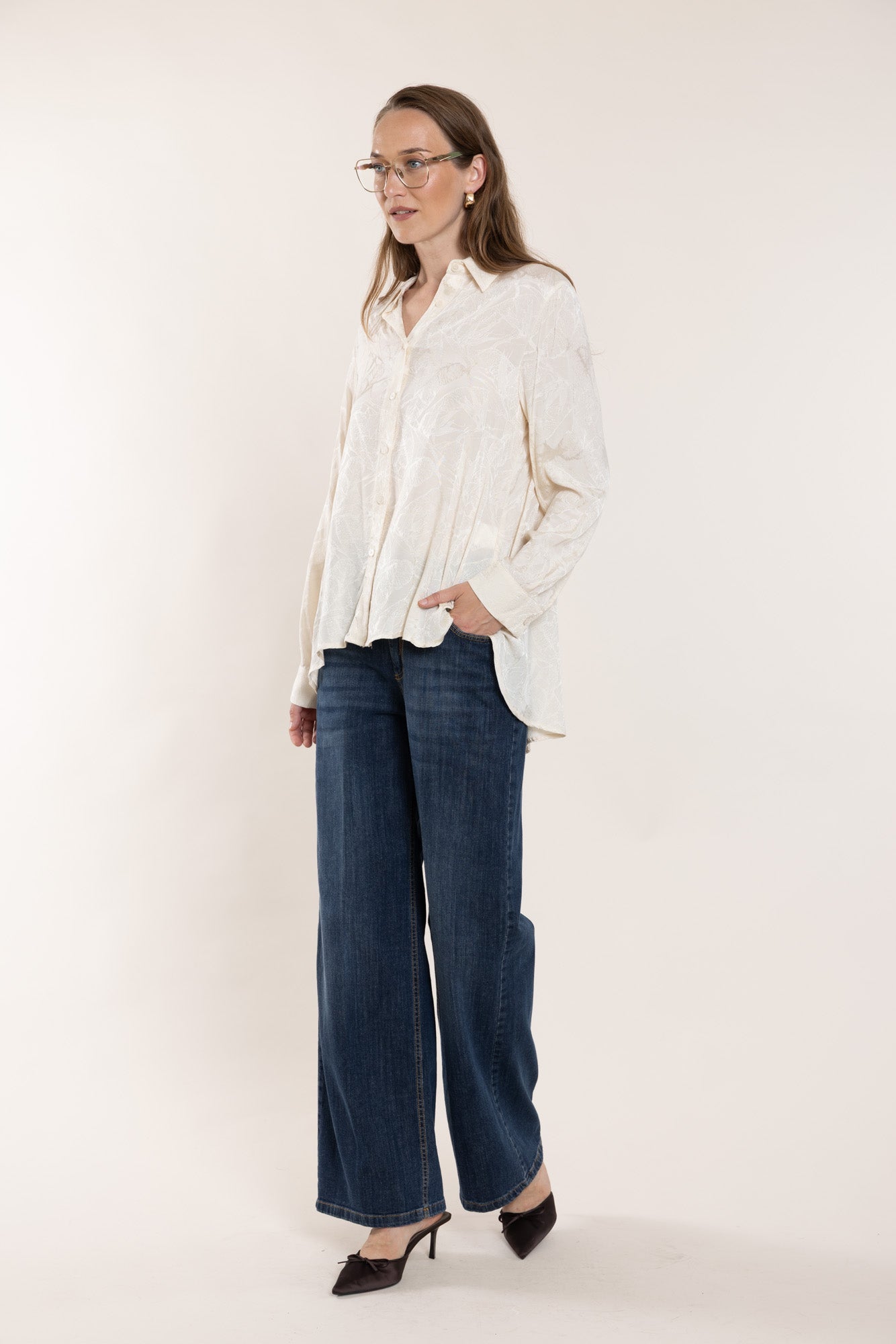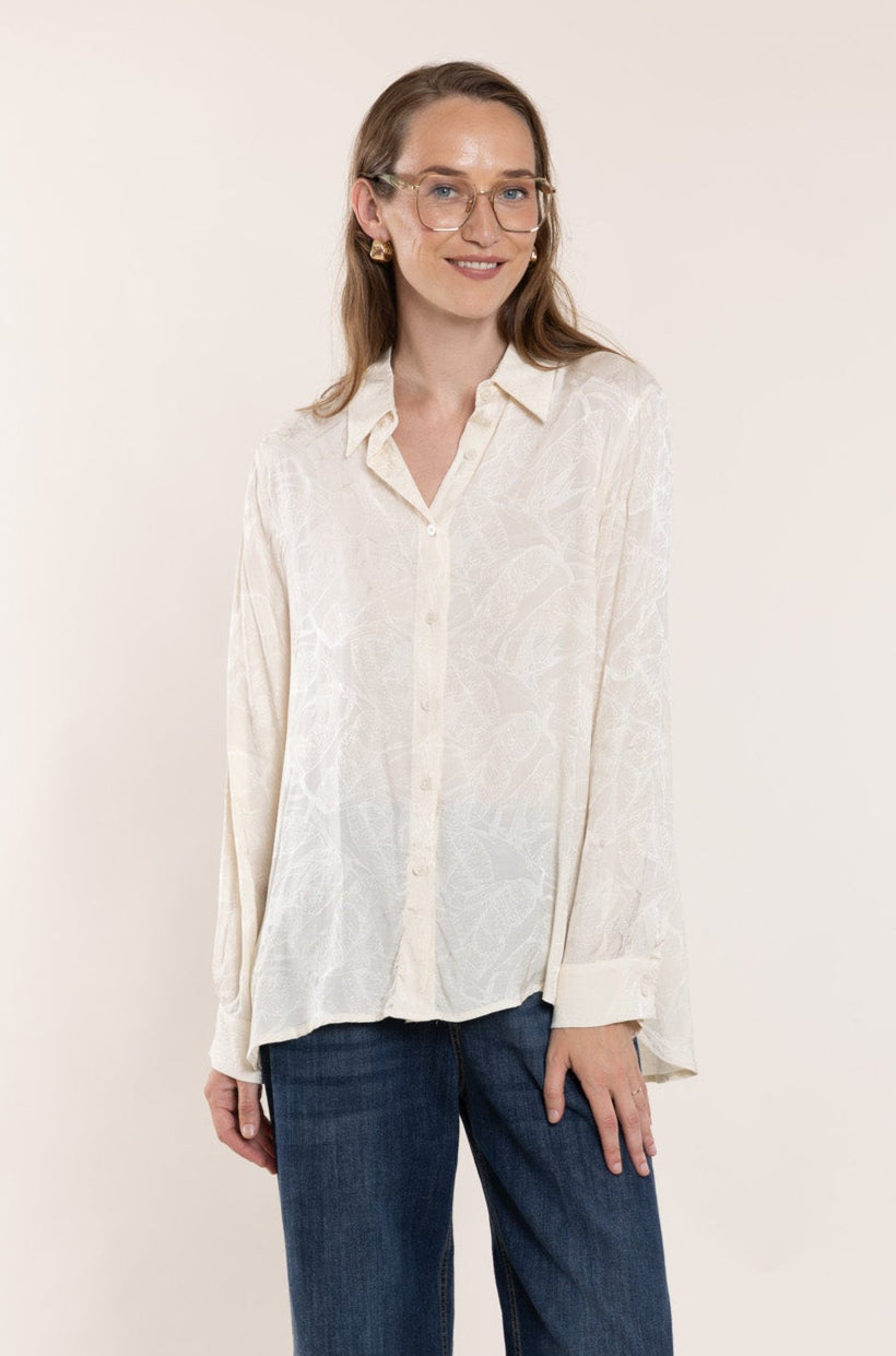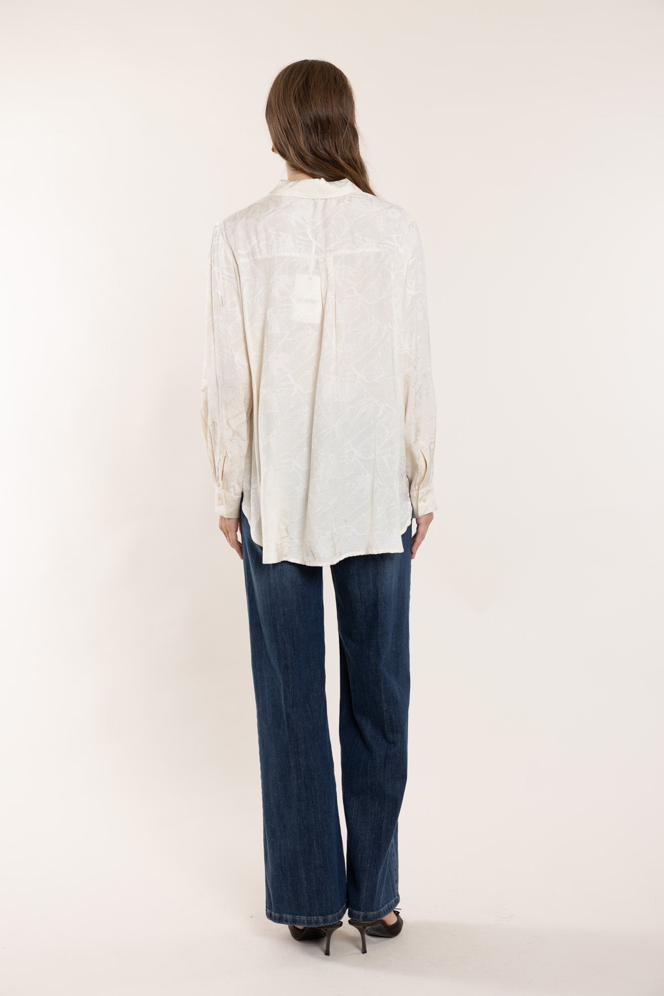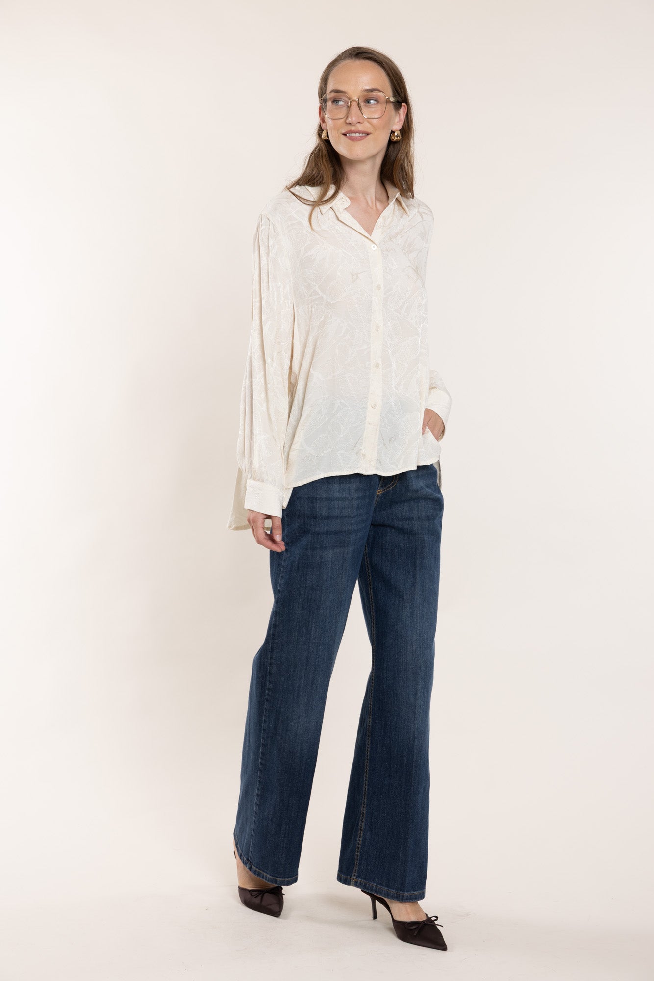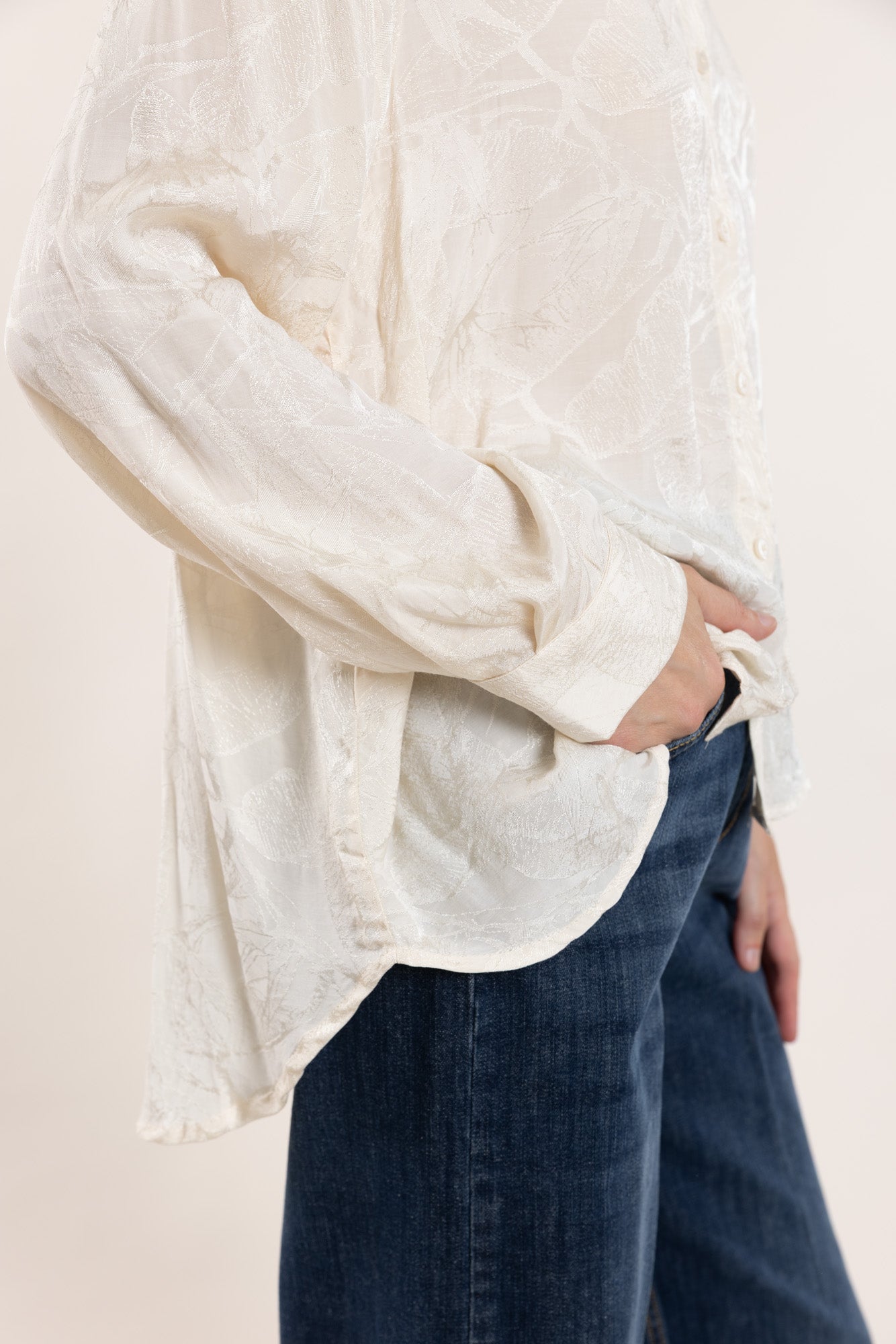 Vaniļas toņa krītoša, eleganta blūzīte ar lāsumainu, nenoteikti ģeometrisku rakstu. Klasiska mašetes daļa un pogu aizdare priekšpusē. Korpuss ir trapecveida ar krītošu stāvu. Blūze priekšpusē ir īsāka un mugurpusē nedaudz garāka.