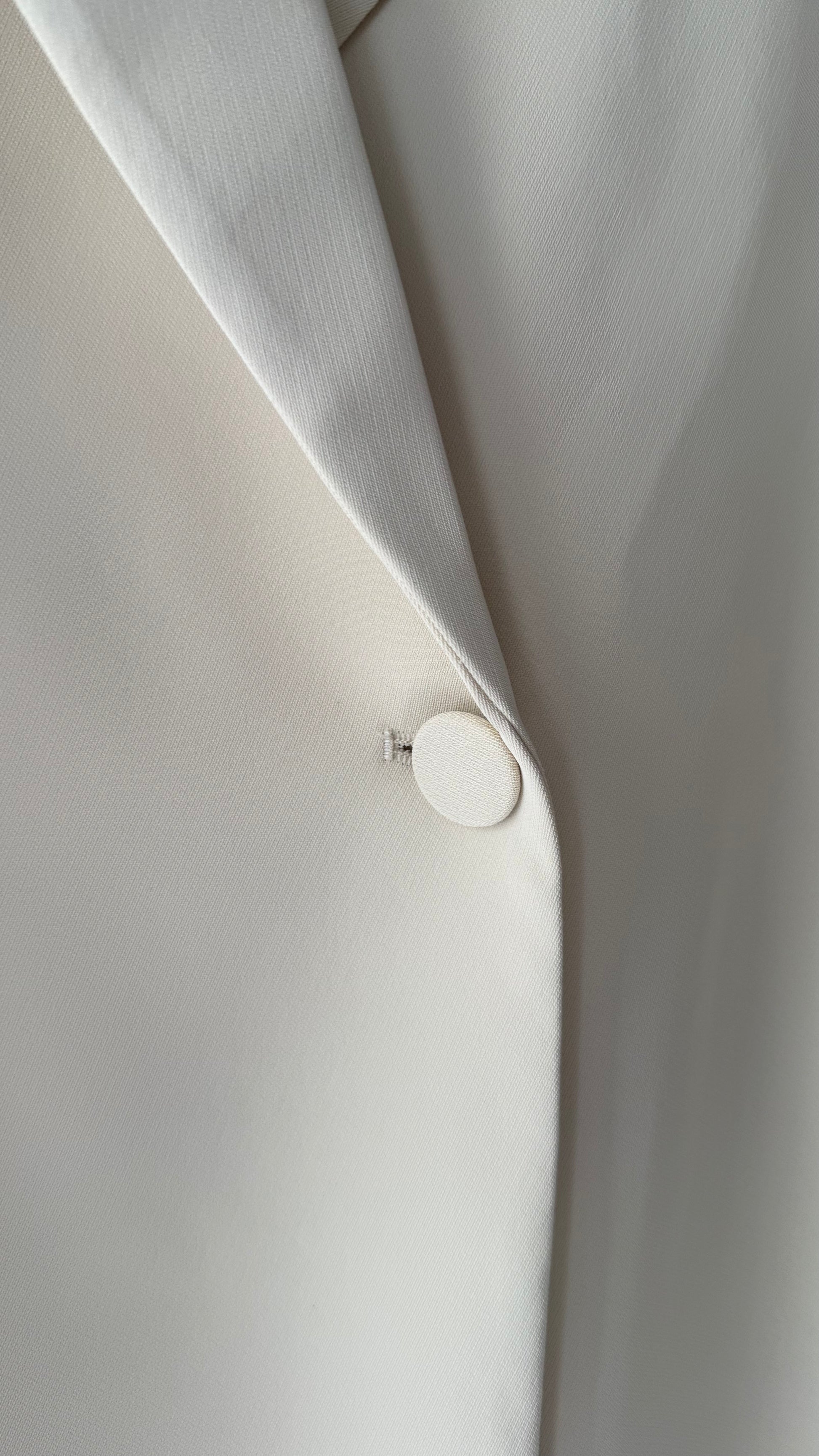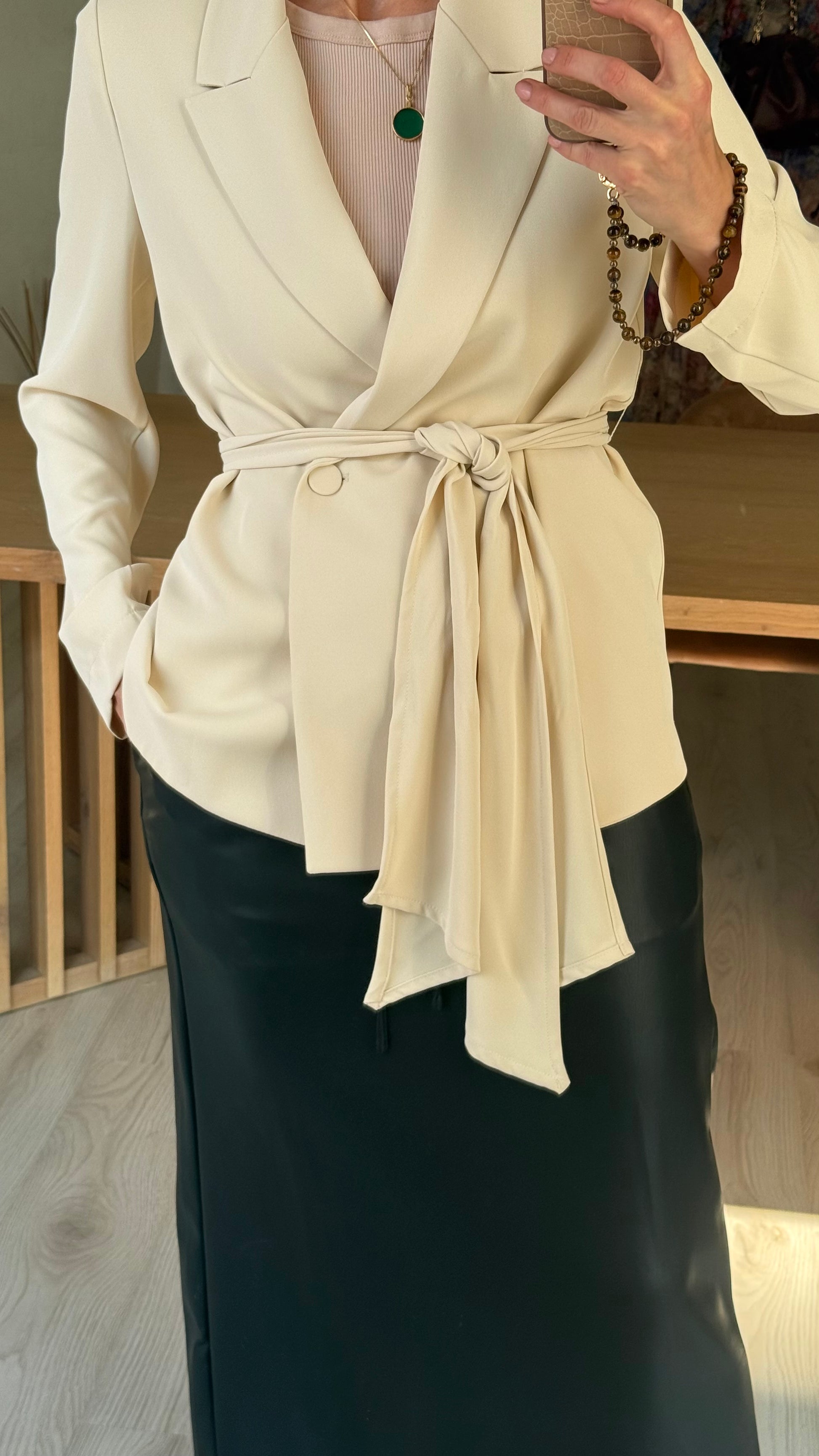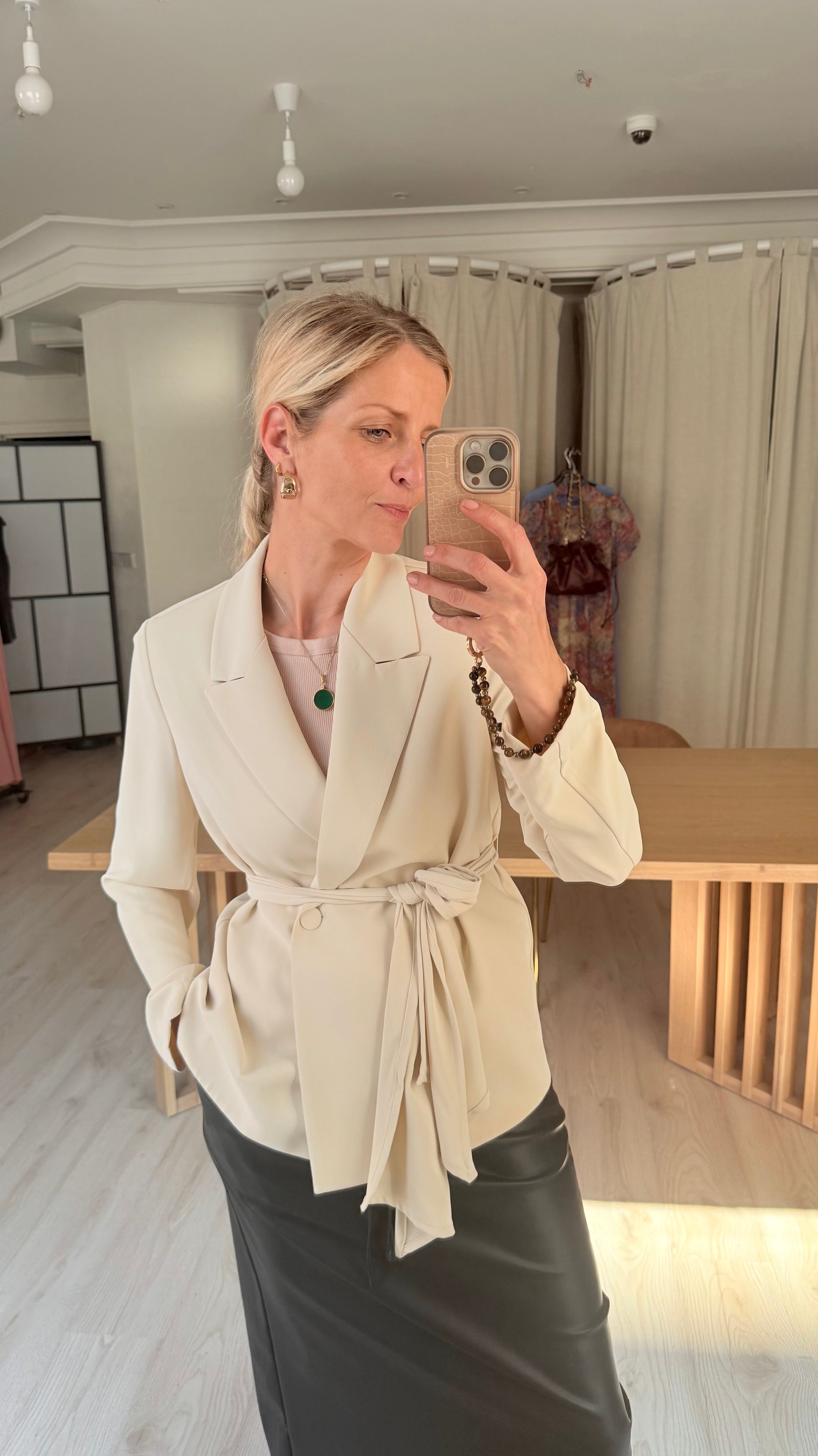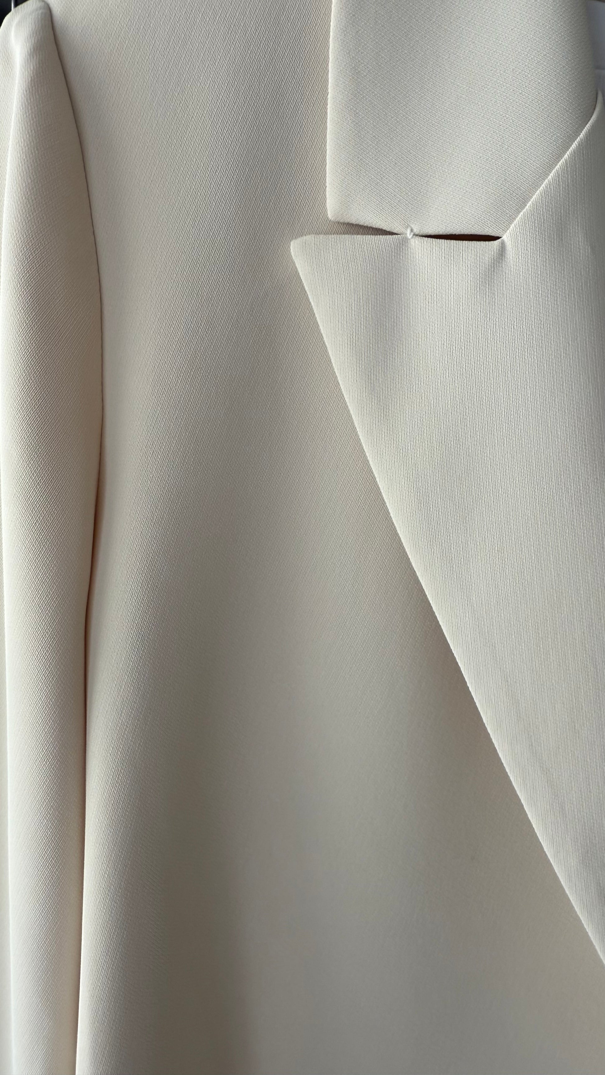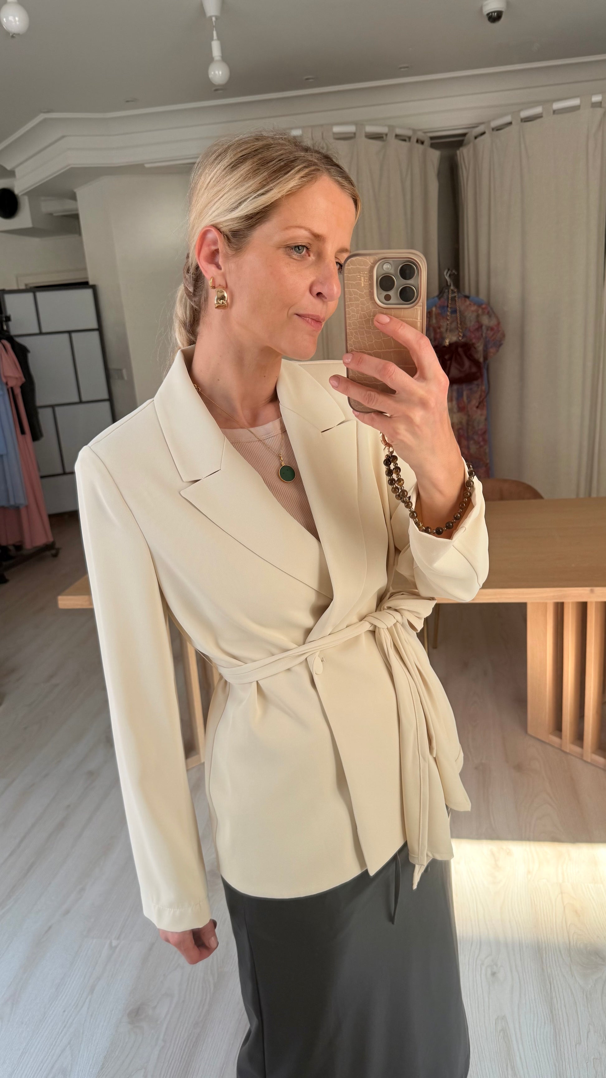 Krītoša krepa žakete vaniļas tonī, sienama josta un plecos polsteri. Žaketei ir šaurs siluets un audums ir krītošs, bez oderes.