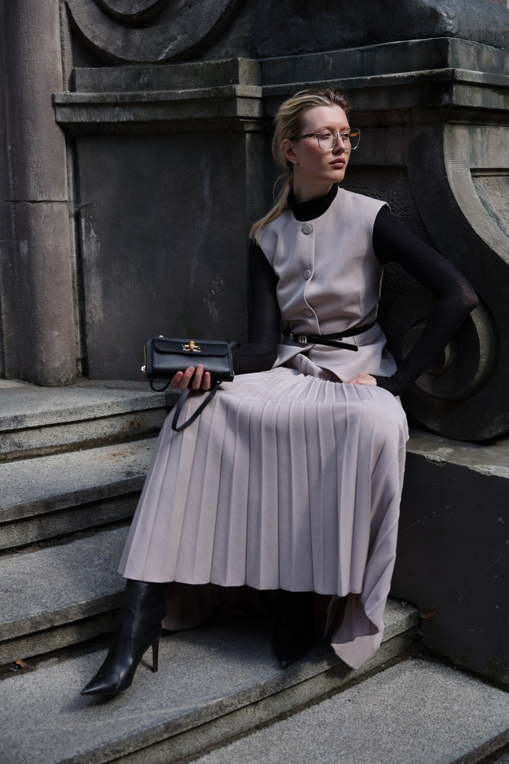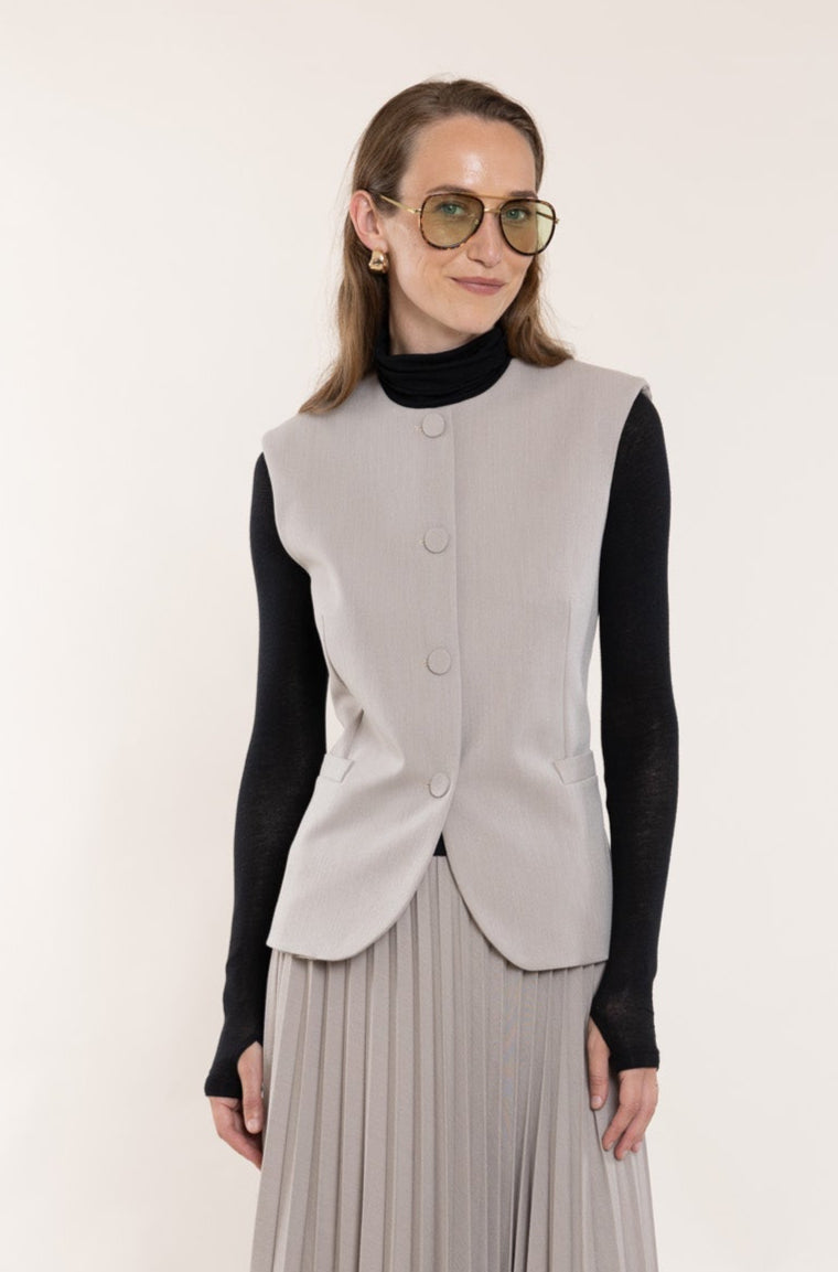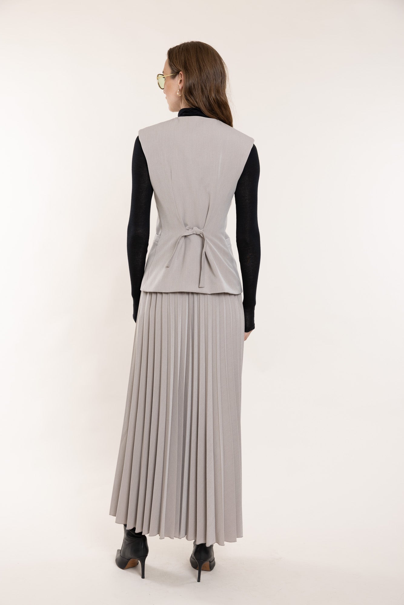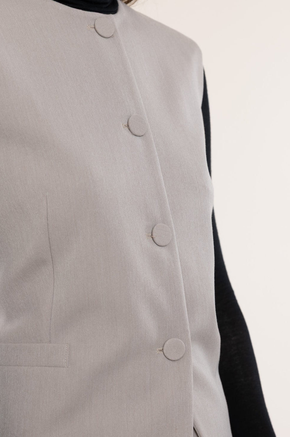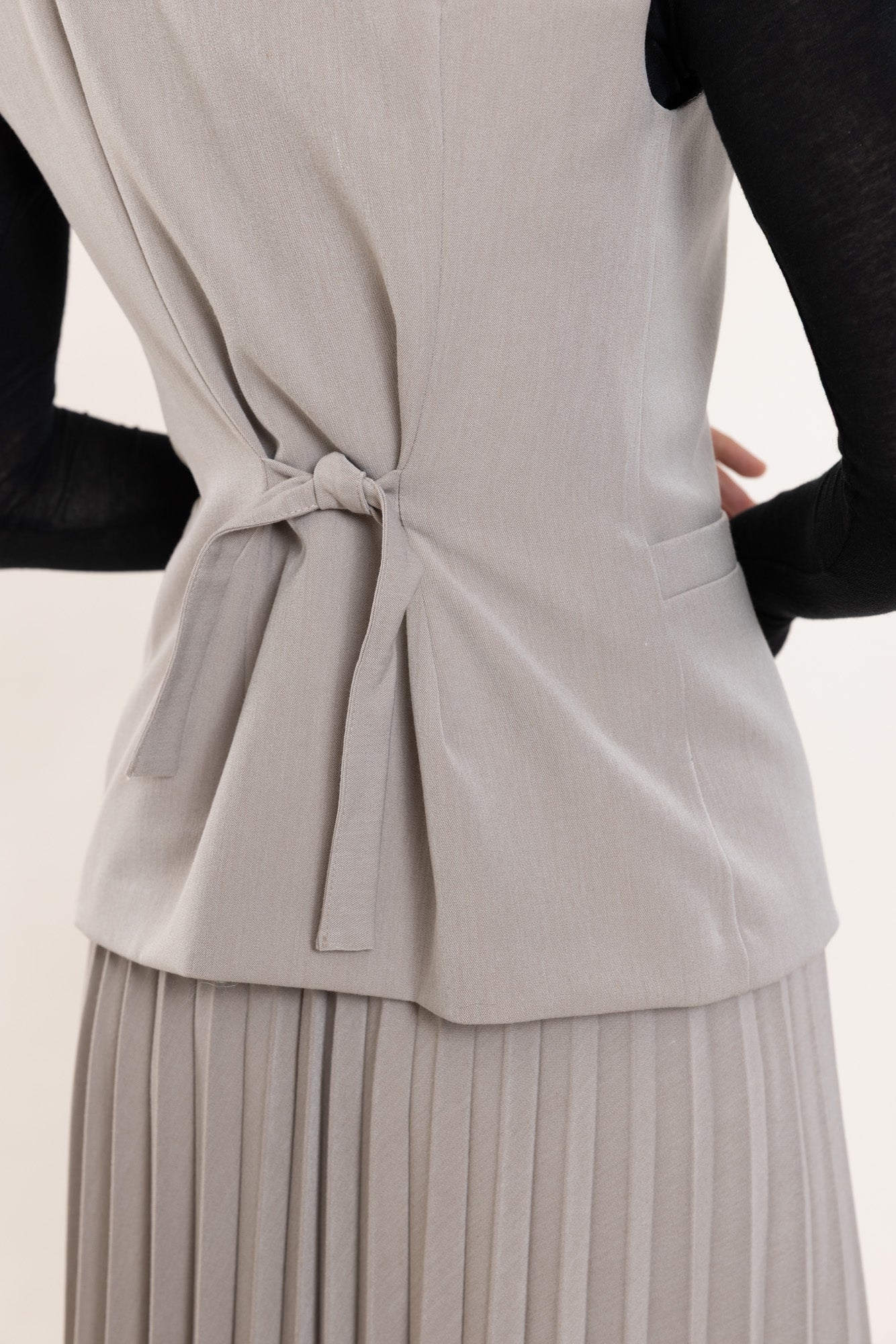 Velēka veste ar auduma apvilktām pogām. Mugurpusē lentīte regulējamu platumu jostas vietā, krūšu zonā izmērs izmērā. Šaurs griezums, ar oderi un kabatām. Pilnam komplektam pieejami svārki no identiska auduma.