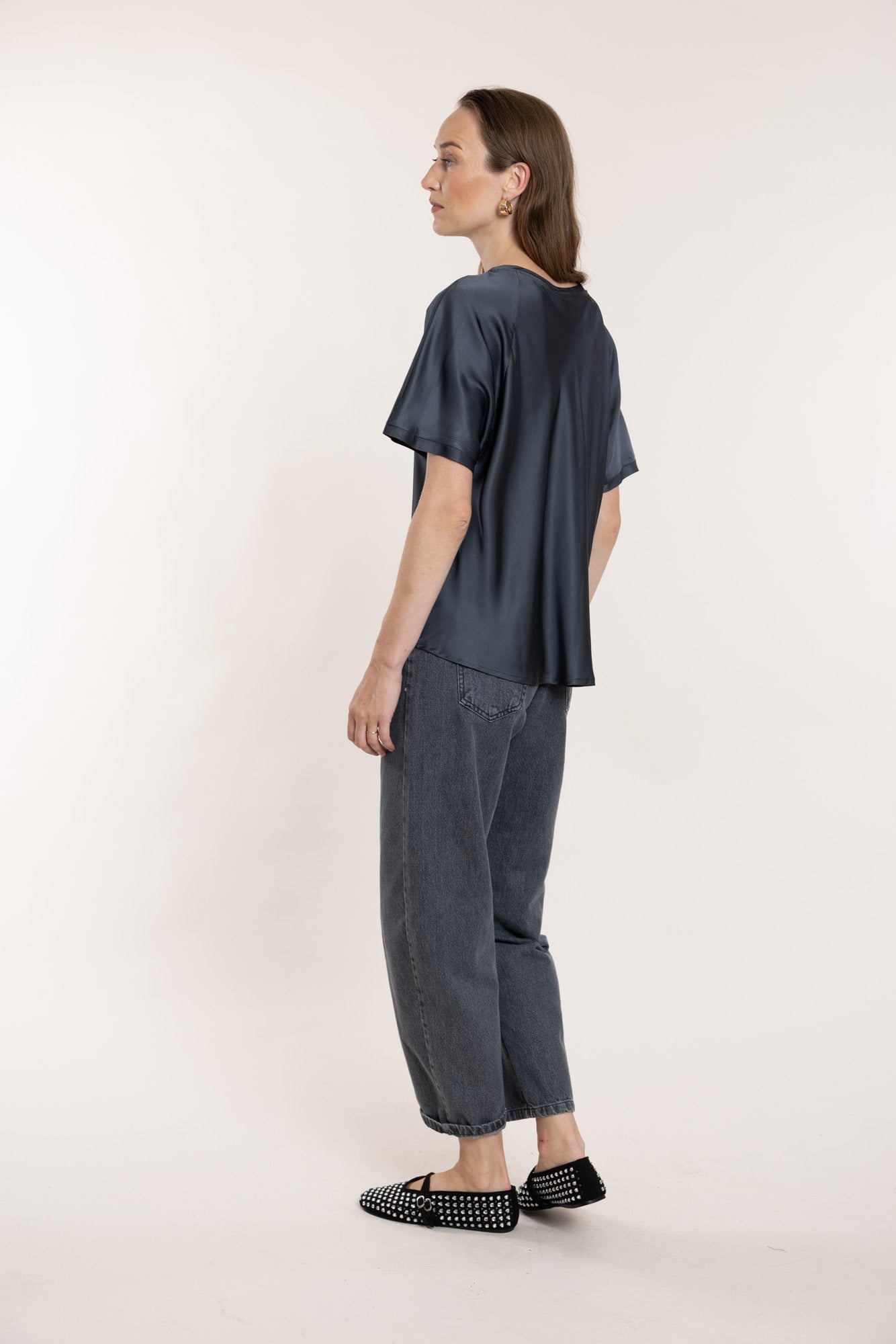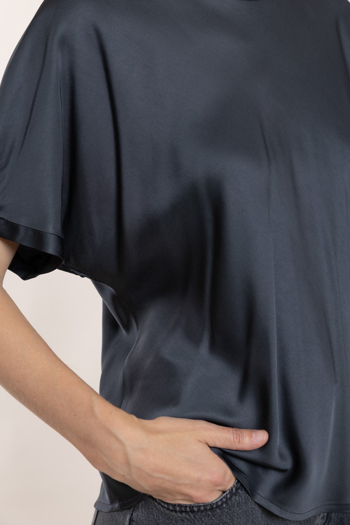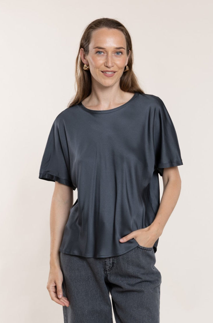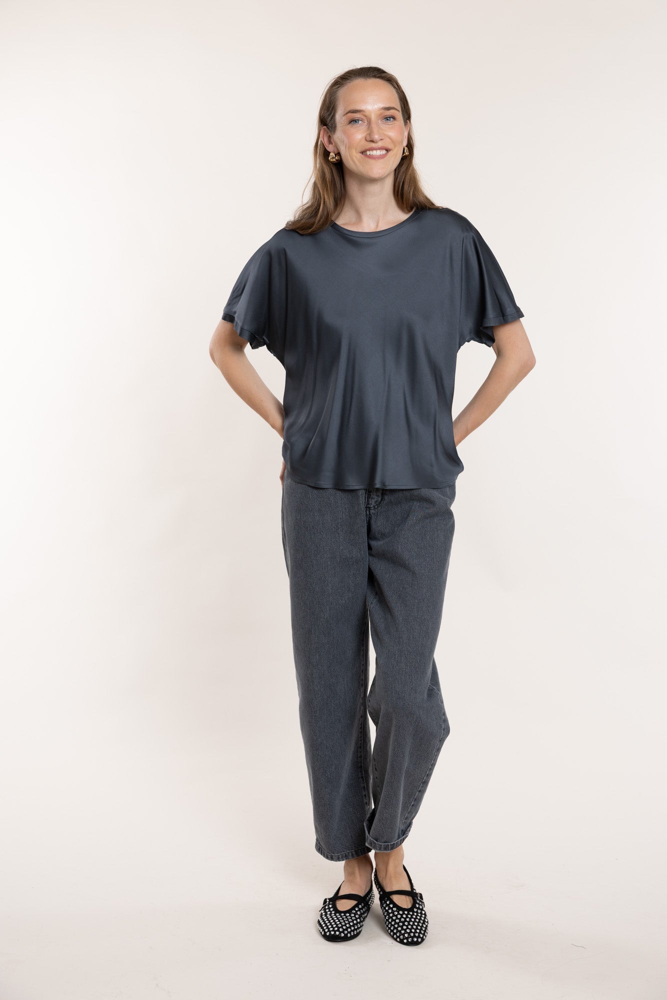 Viskozes tops grafīta tonī slīpā diegā, kopgrieztā piedurkne.