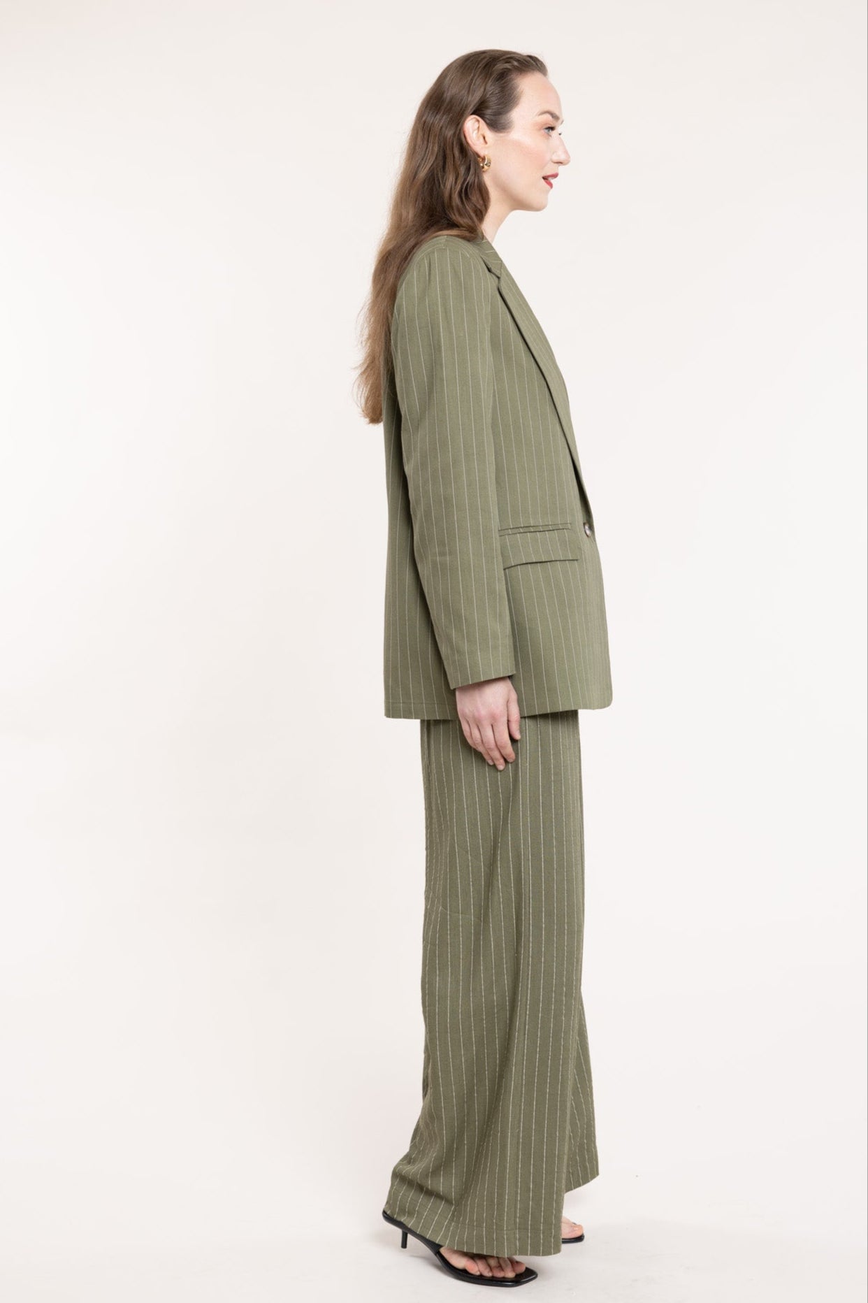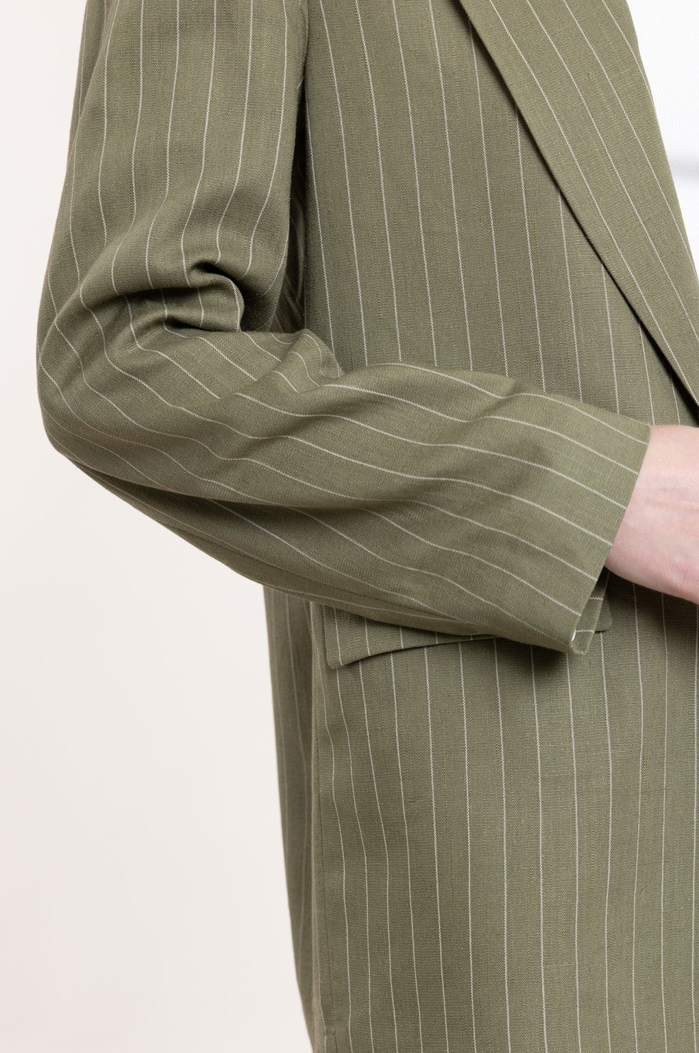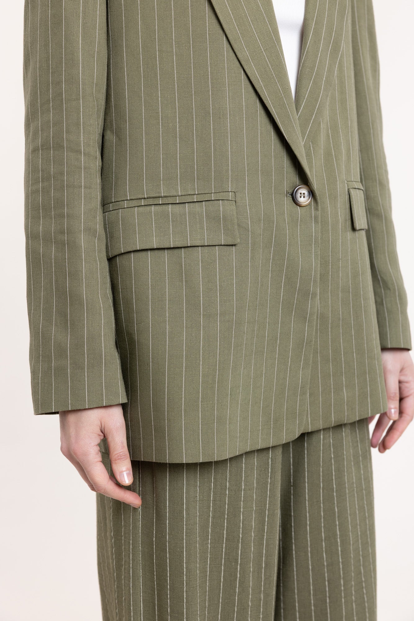 Zaļa linu žakete ar mazu svītriņu un divām pogām. Korpuss brīvi krītošs, plecā neliels polsters, odere priekšpusē un mugurpusē plecos. Ideālai komplektācijai pieejamas arī tāda paša auduma bikses.