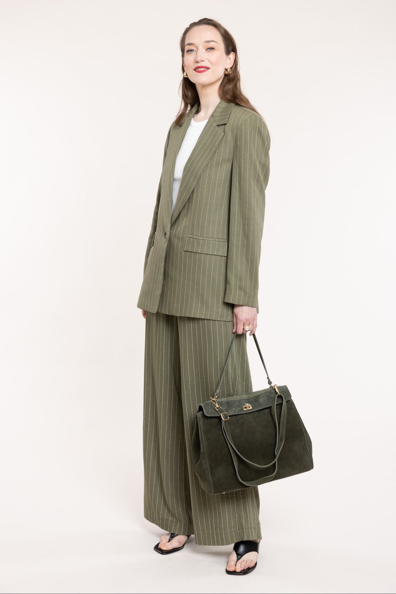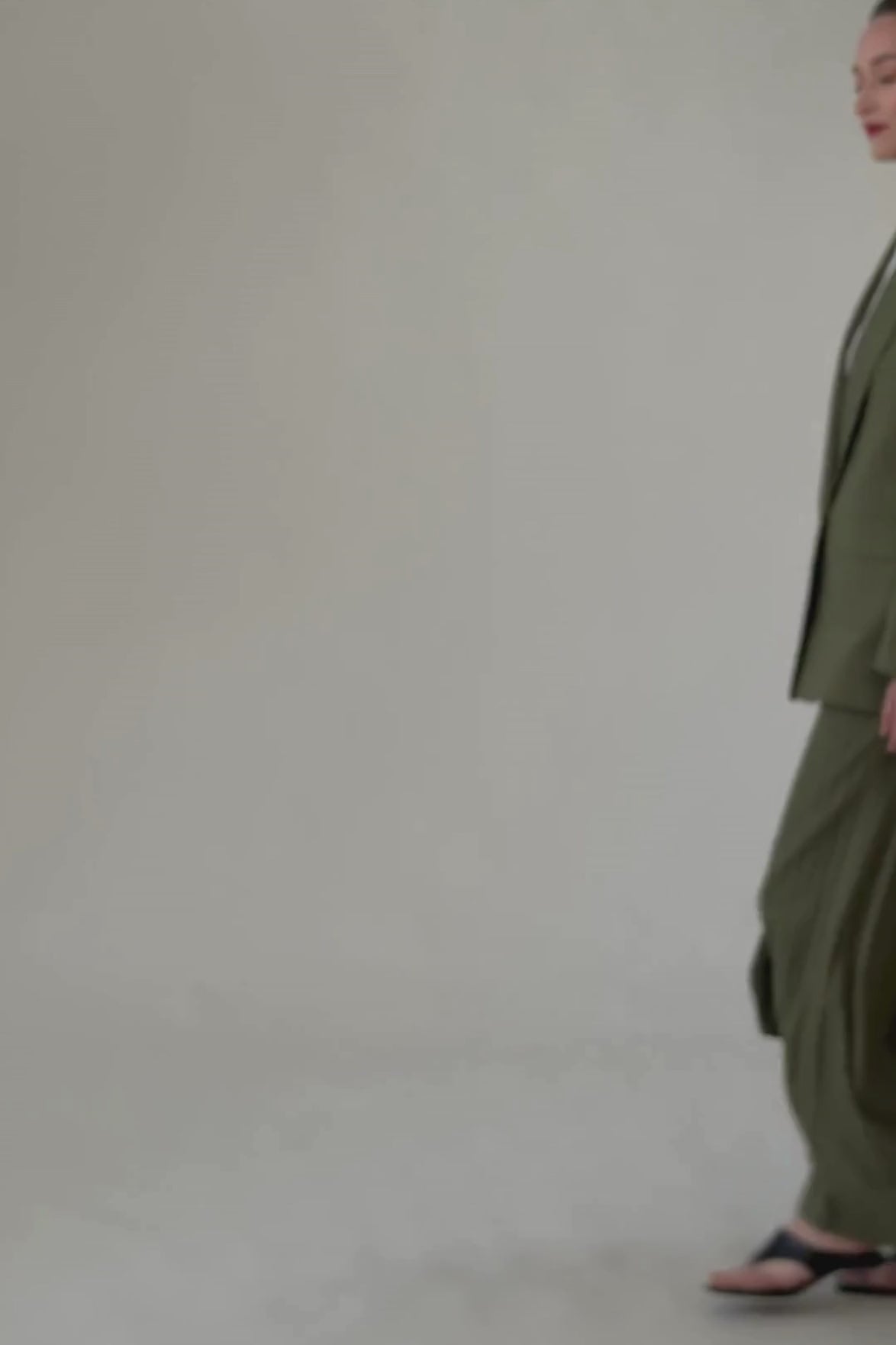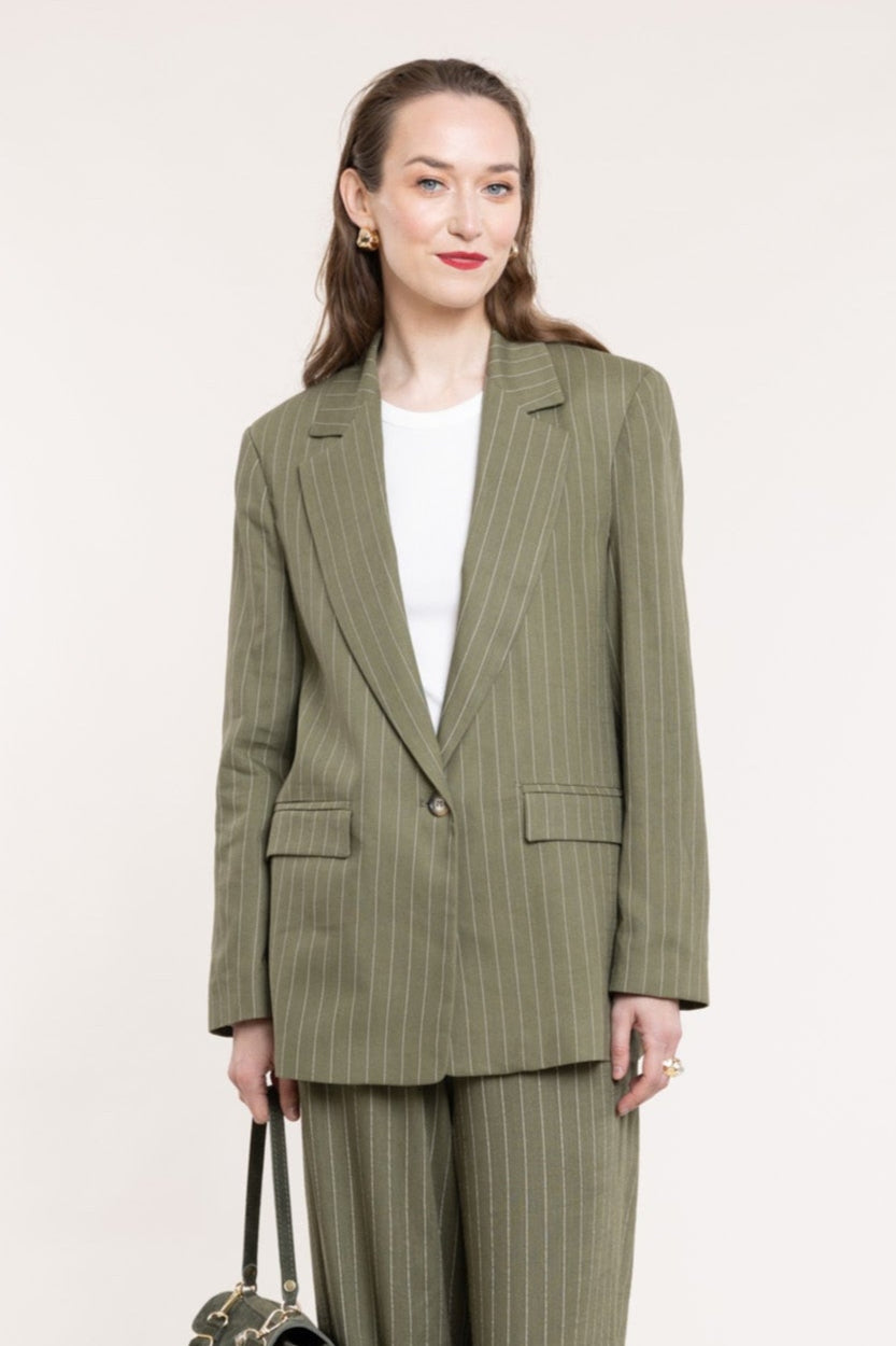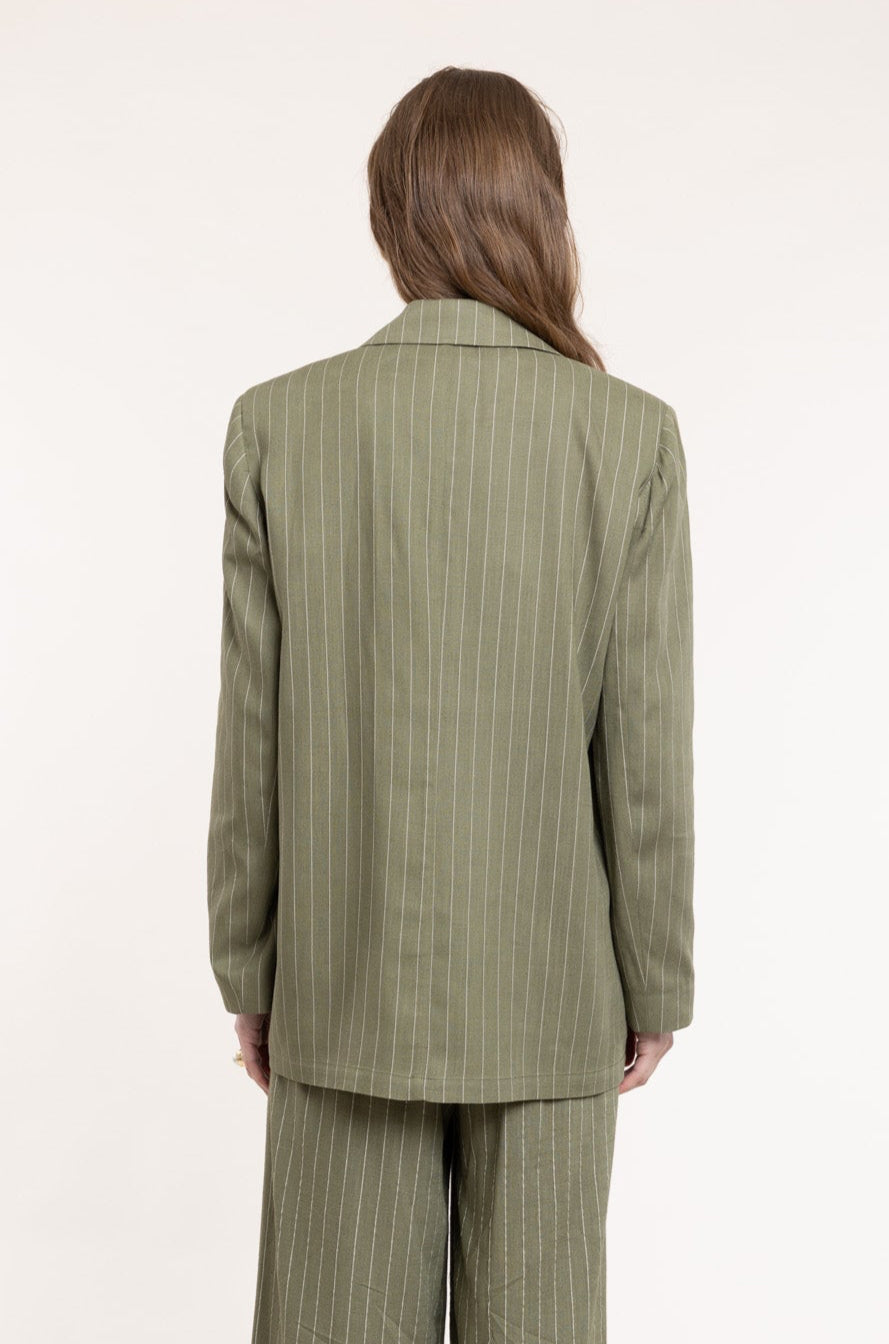 Zaļa linu žakete ar mazu svītriņu un divām pogām. Korpuss brīvi krītošs, plecā neliels polsters, odere priekšpusē un mugurpusē plecos. Ideālai komplektācijai pieejamas arī tāda paša auduma bikses.