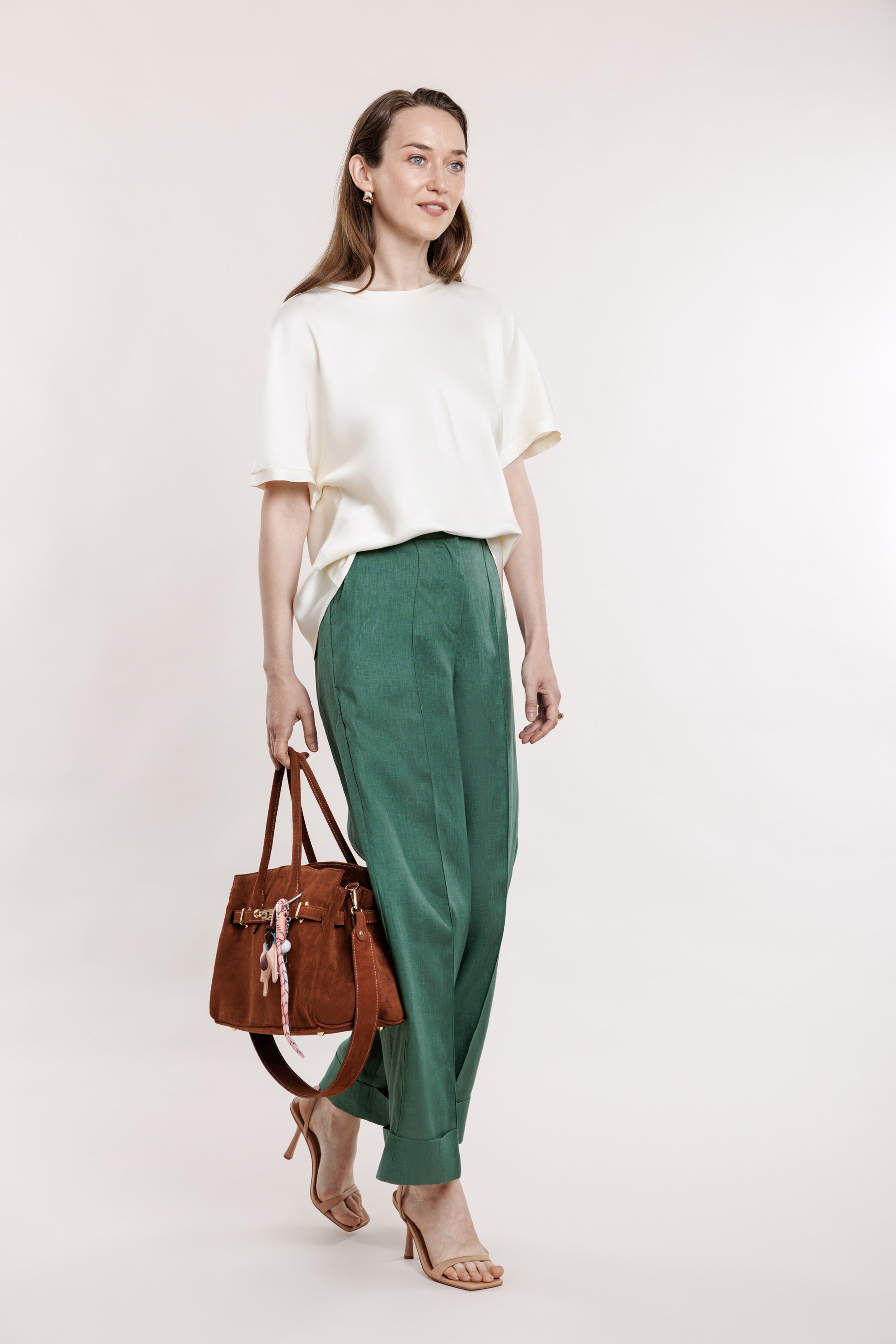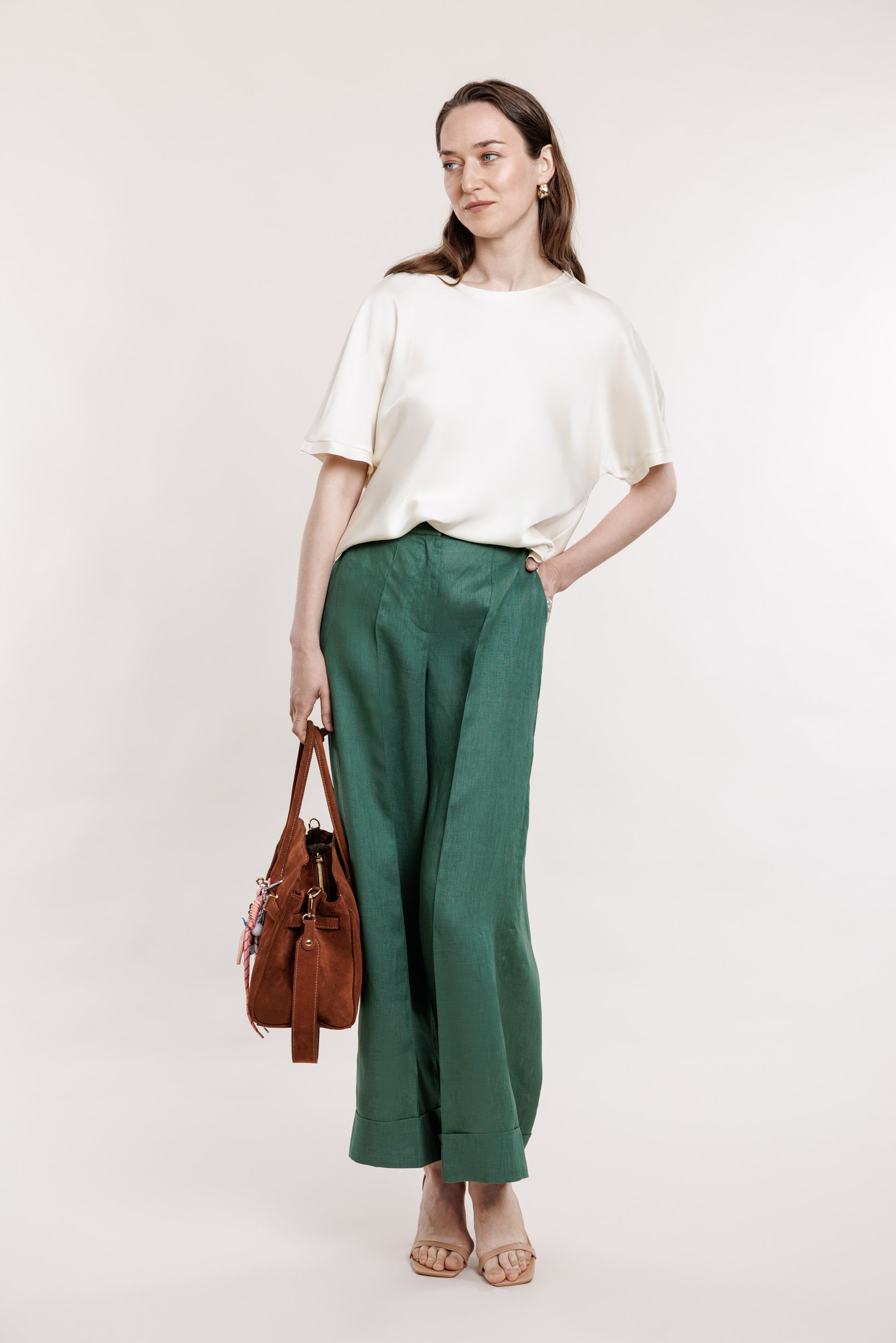 Taisna piegriezuma bikses zaļā krāsā ar atlokiem. Biksēm ir gumija aizmugurējā jostas daļā un 2 kabatas.