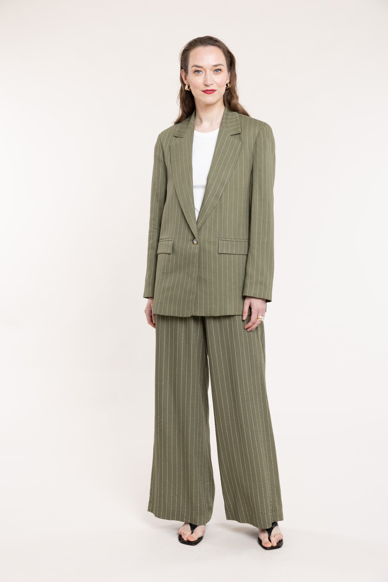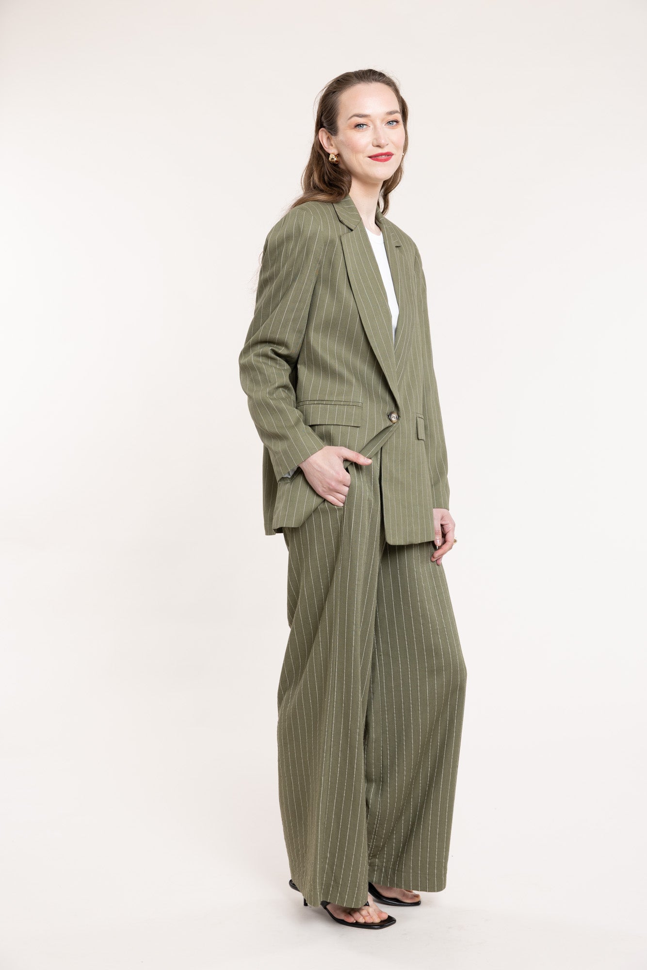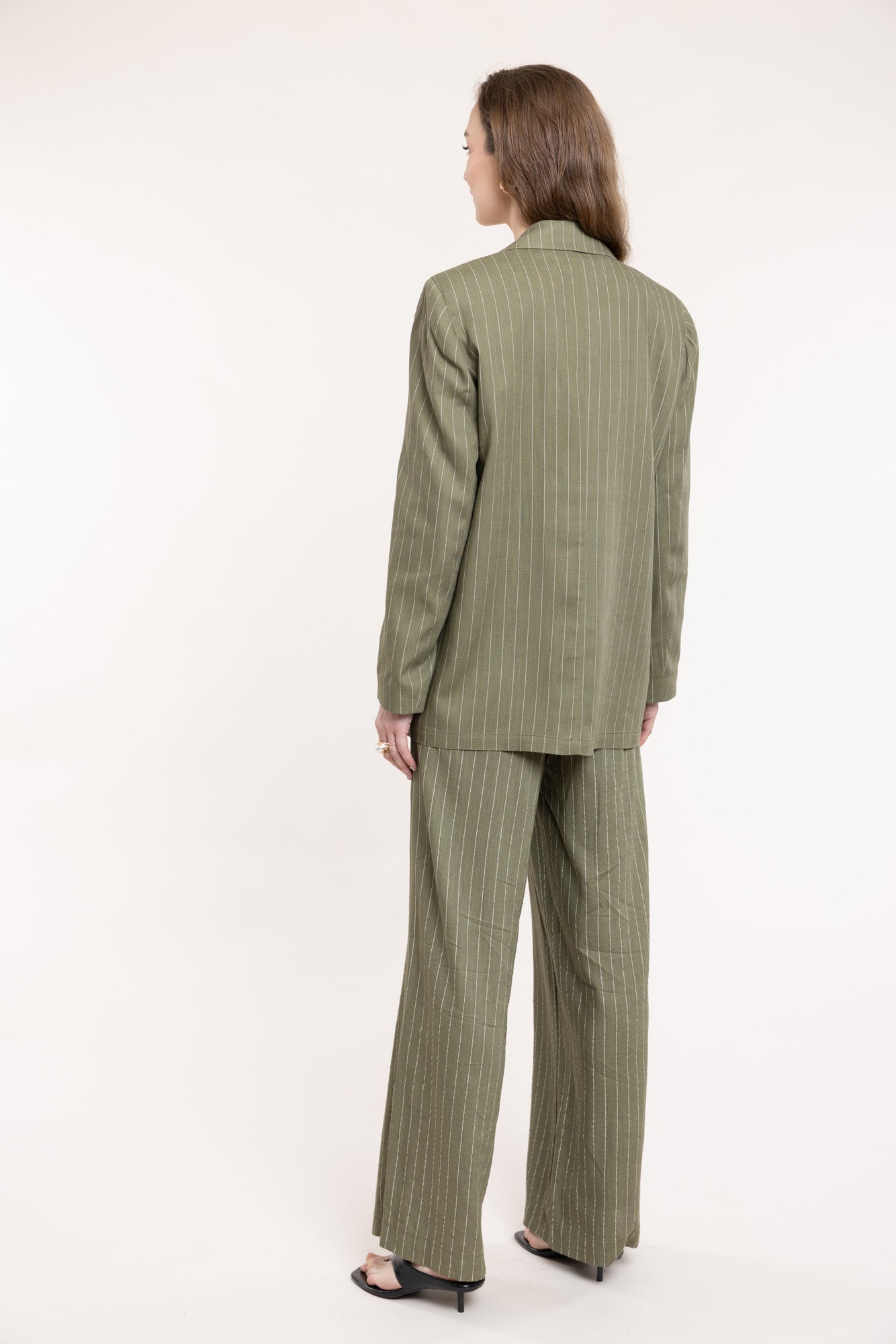 Zaļas linu bikses ar gumiju mugurpusē, priekšpuses josta gluda. Perfektai komplektācijai pieejama tāda paša auduma žakete.