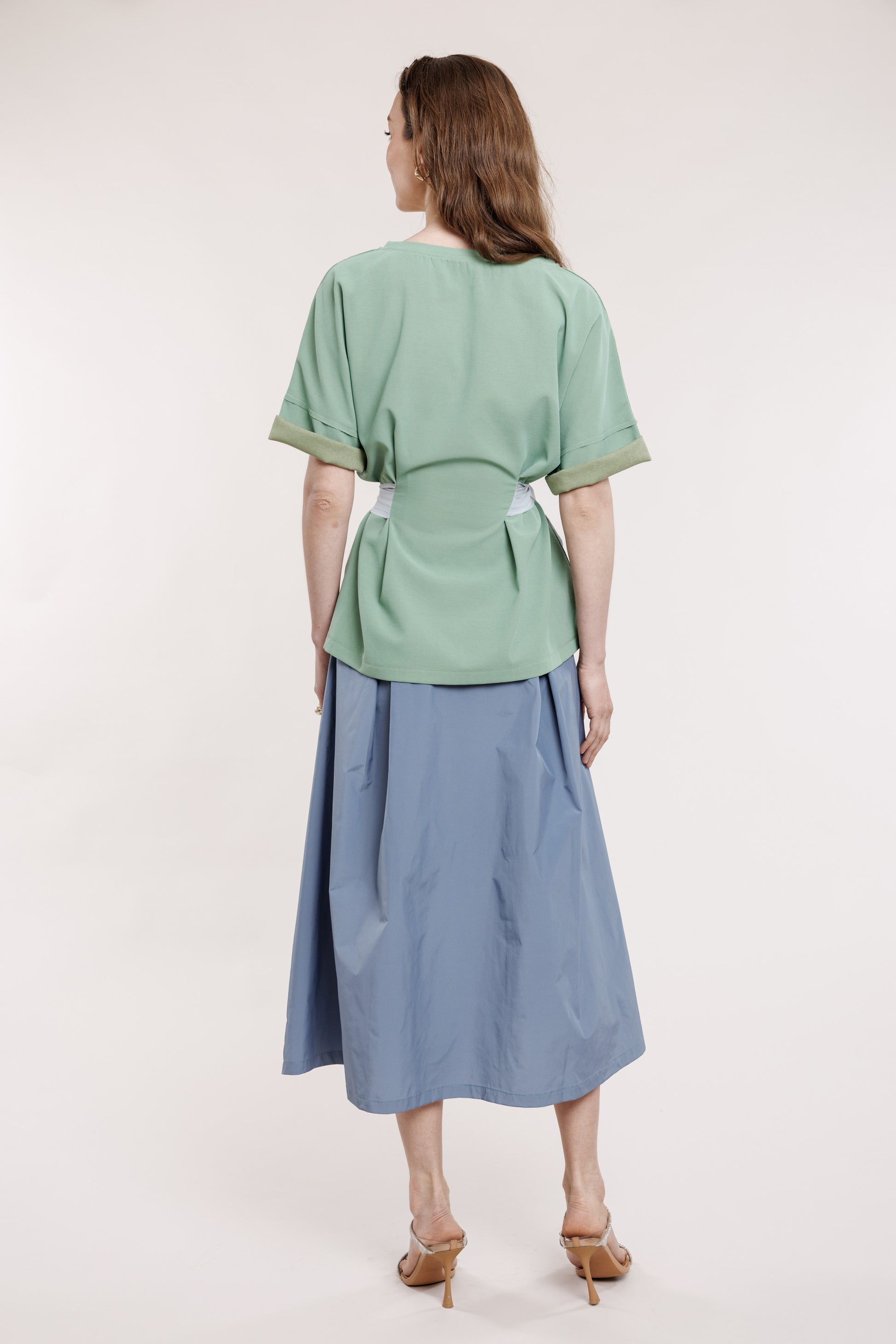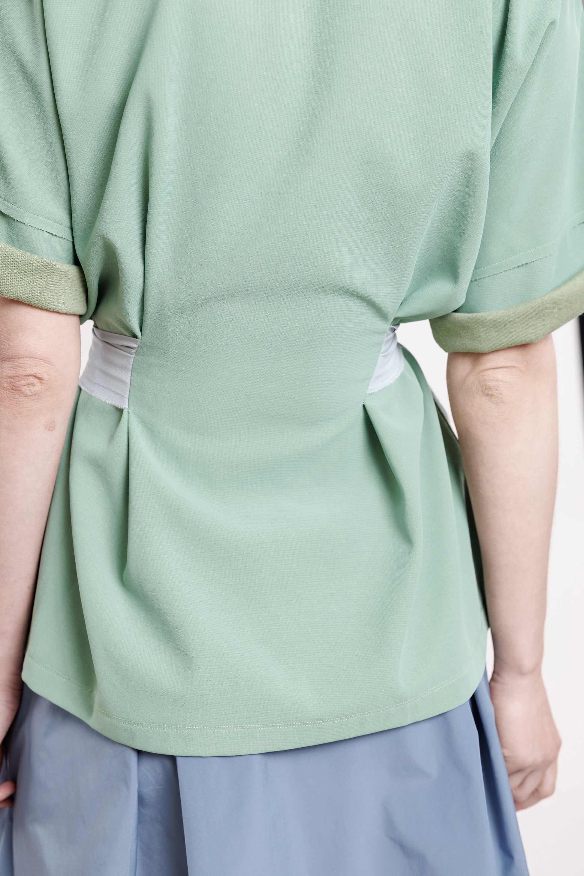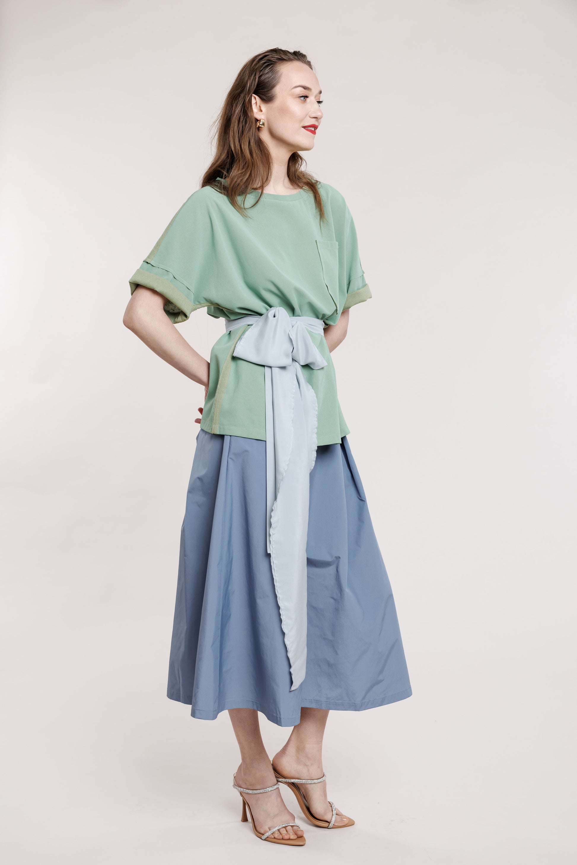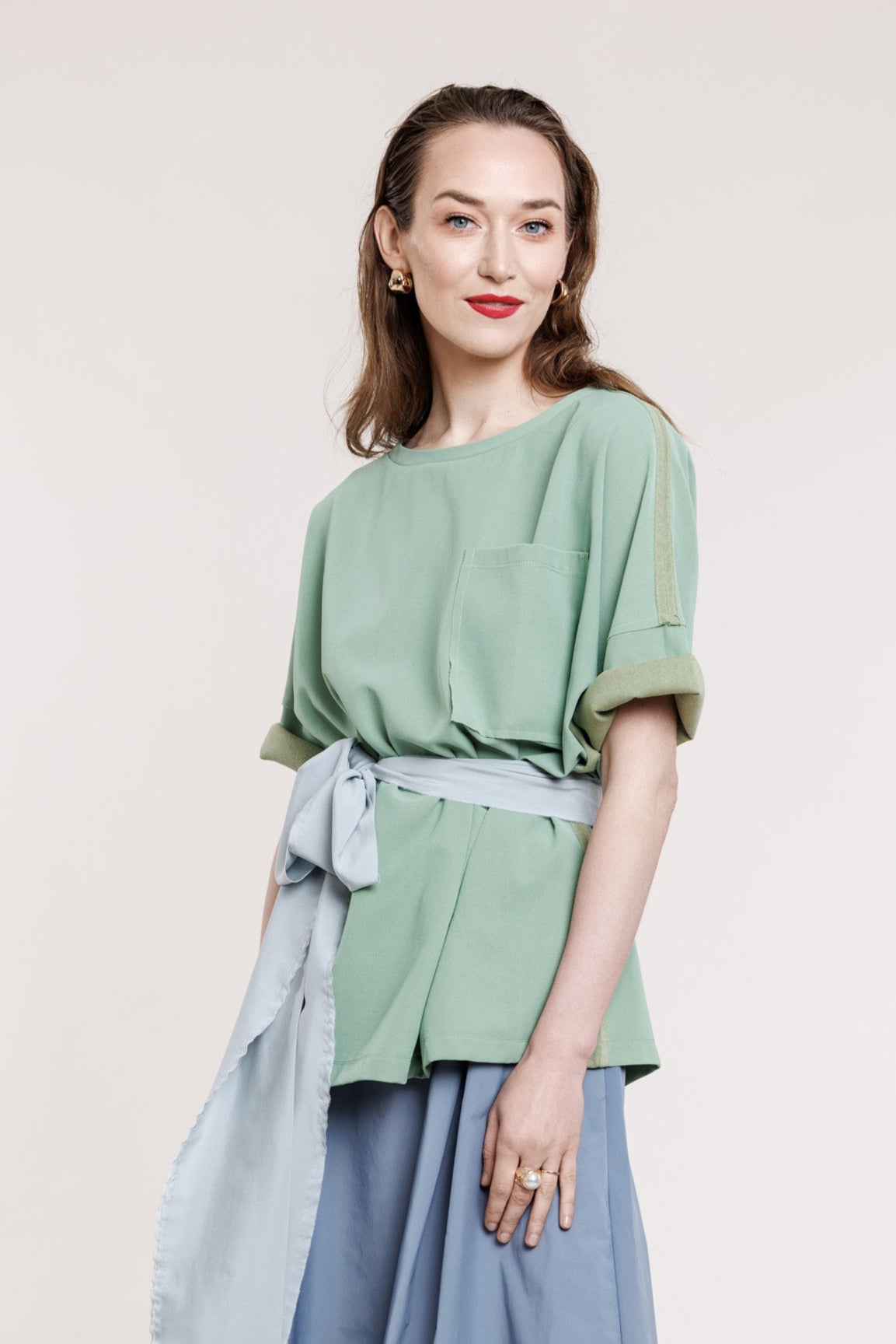 Zaļš oversize T krekls ar sasienamo jostu. Oversize griezums un siluets.