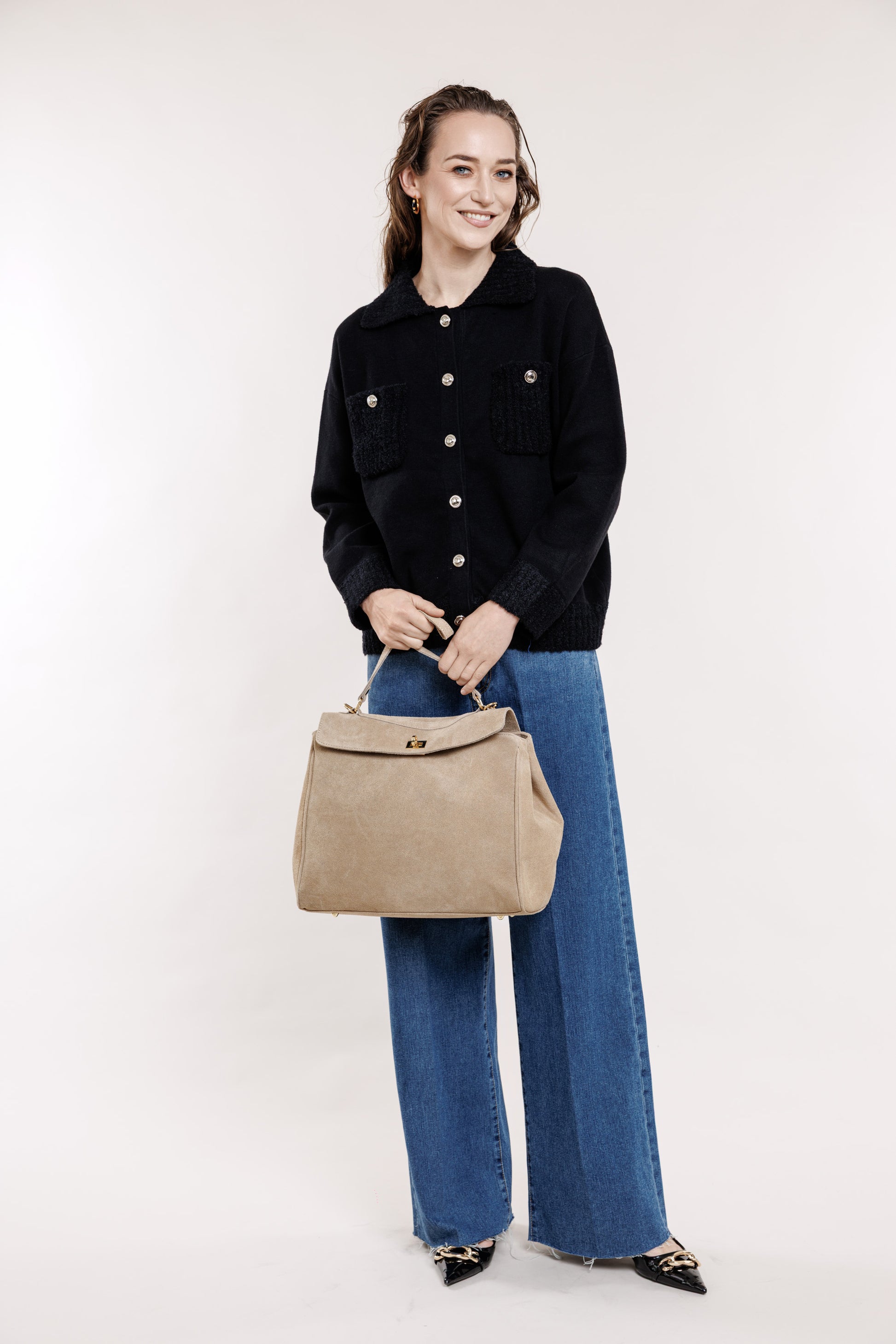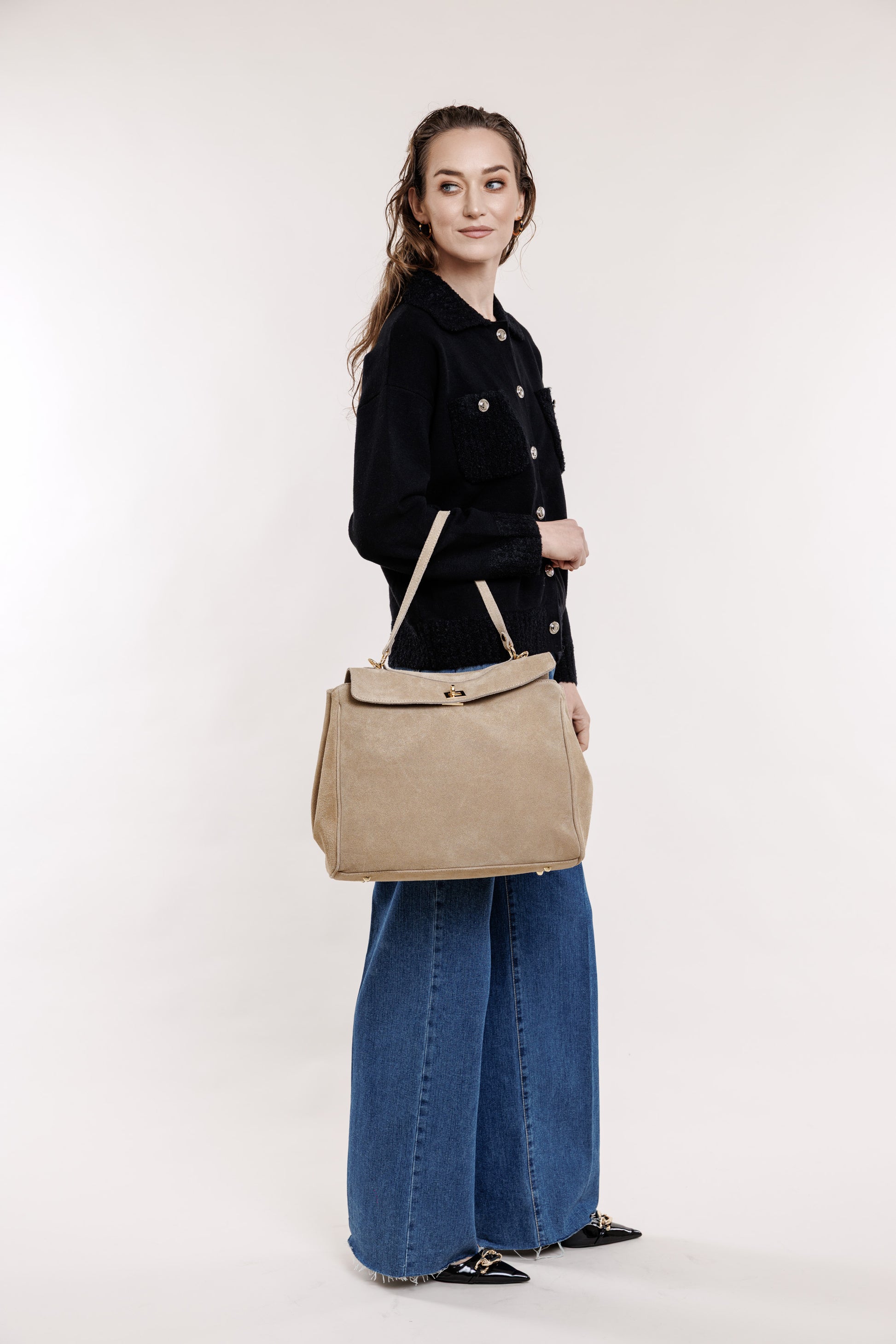 Dabīgās zamšādas soma smilšu tonī, ir īsā un garā lence. Iekšpusē divas atdalītas sadaļas, maza un liela, ir mazais kosmētikas nodalījums ar rāvējslēdzēju. Somu var paplatināt attaisot sānu spiedpogas.