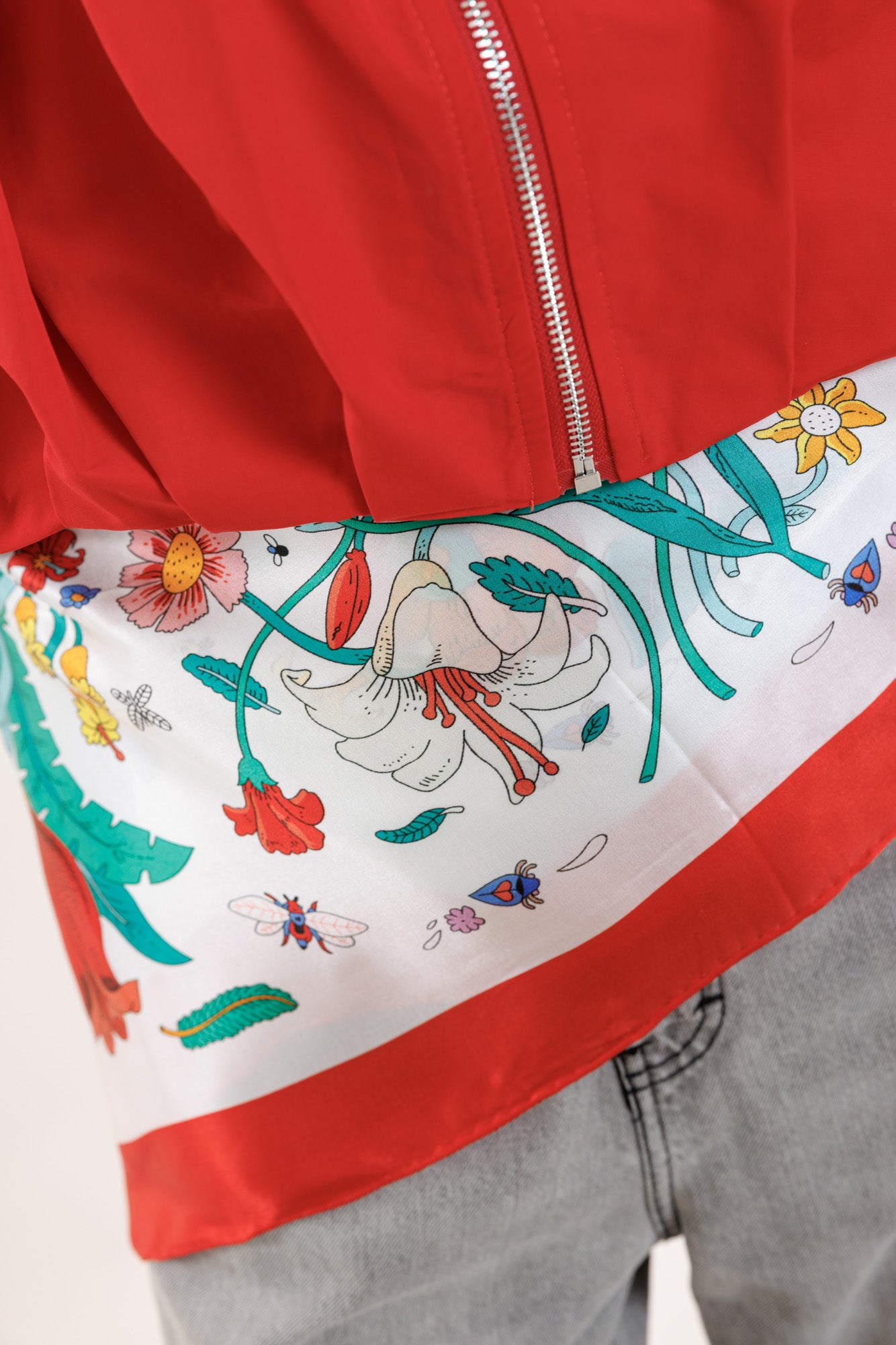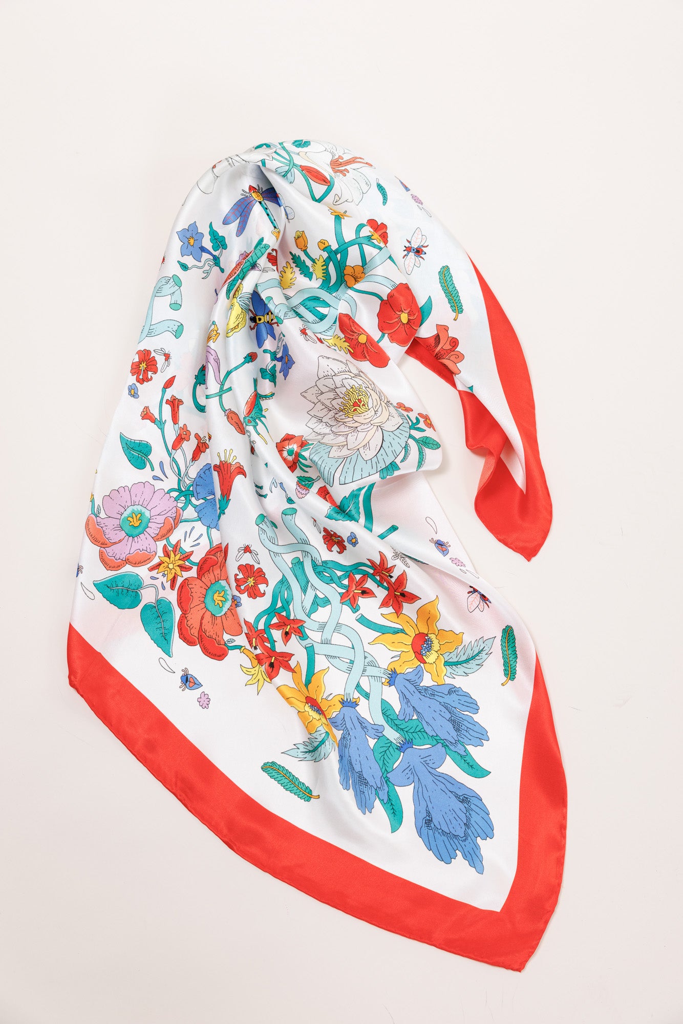 Zīda lakats ar dažādiem ziediem un sarkano maliņu.