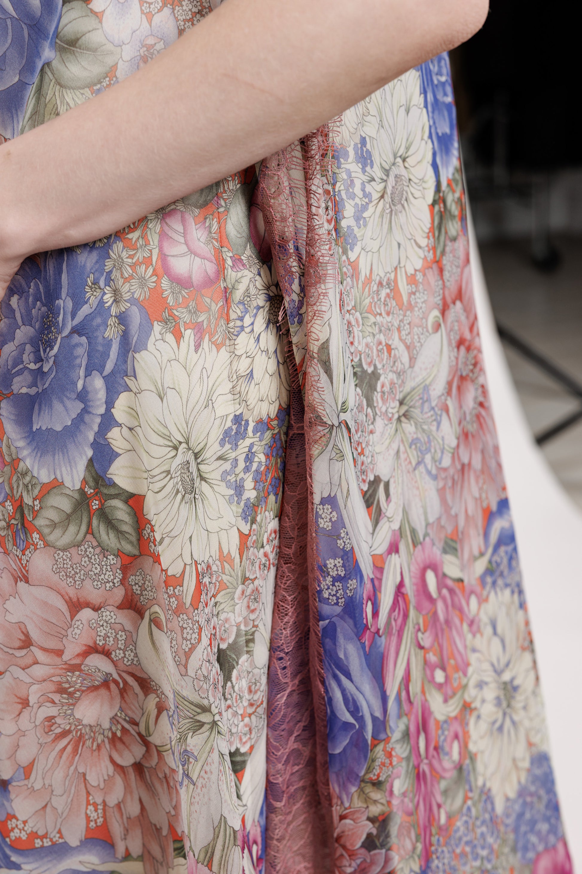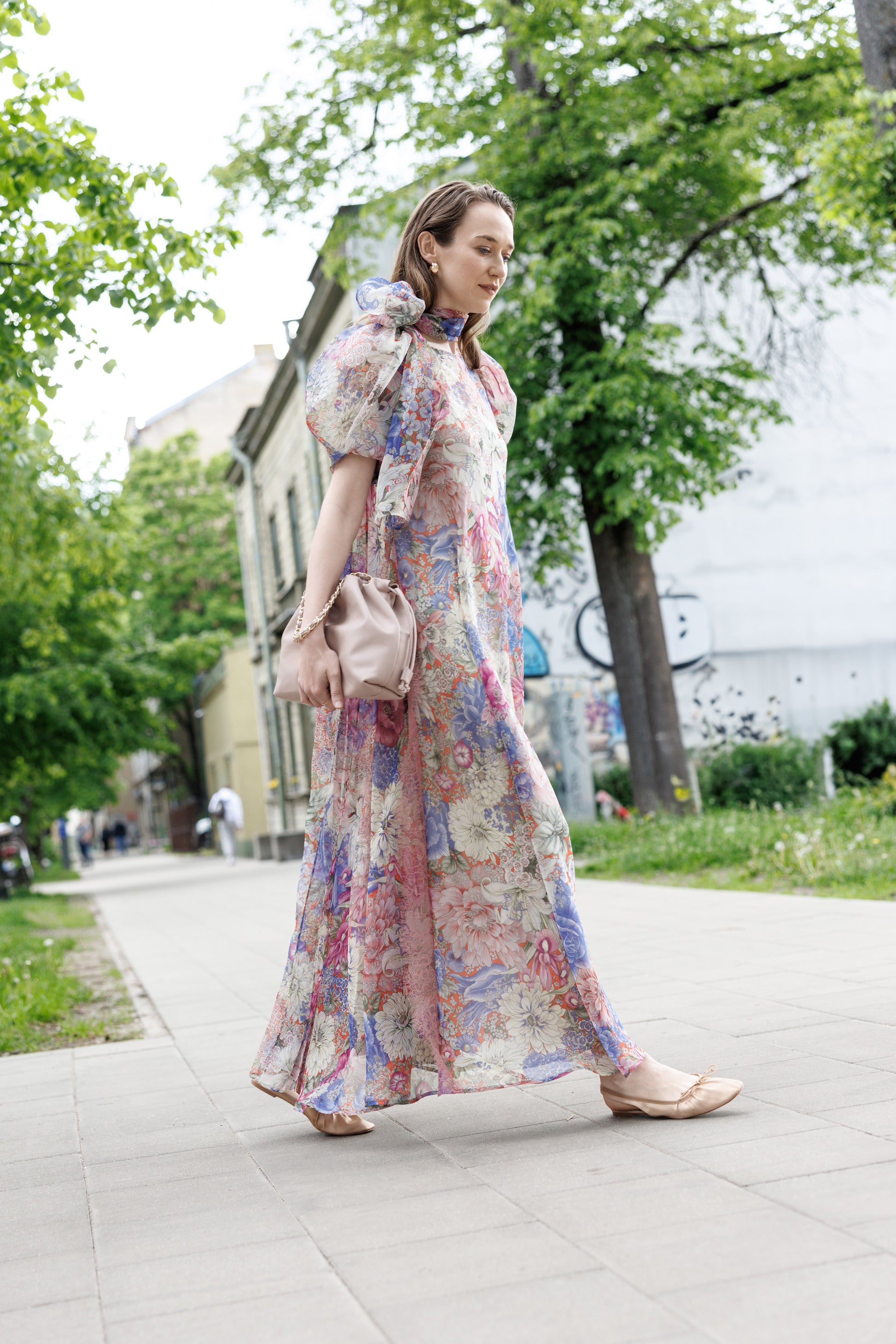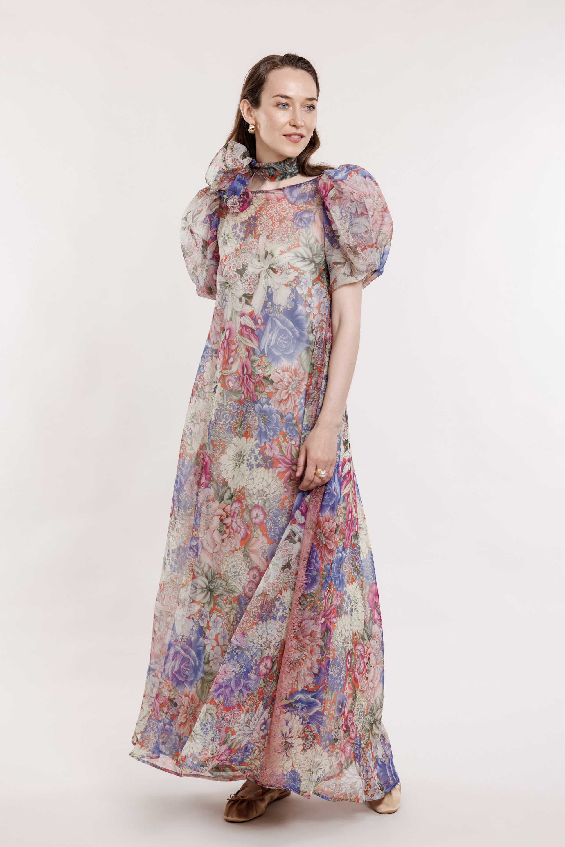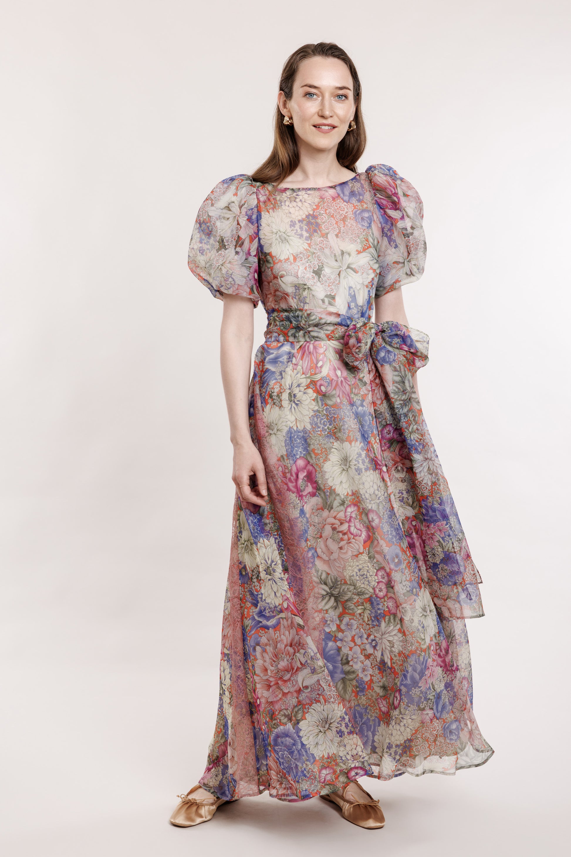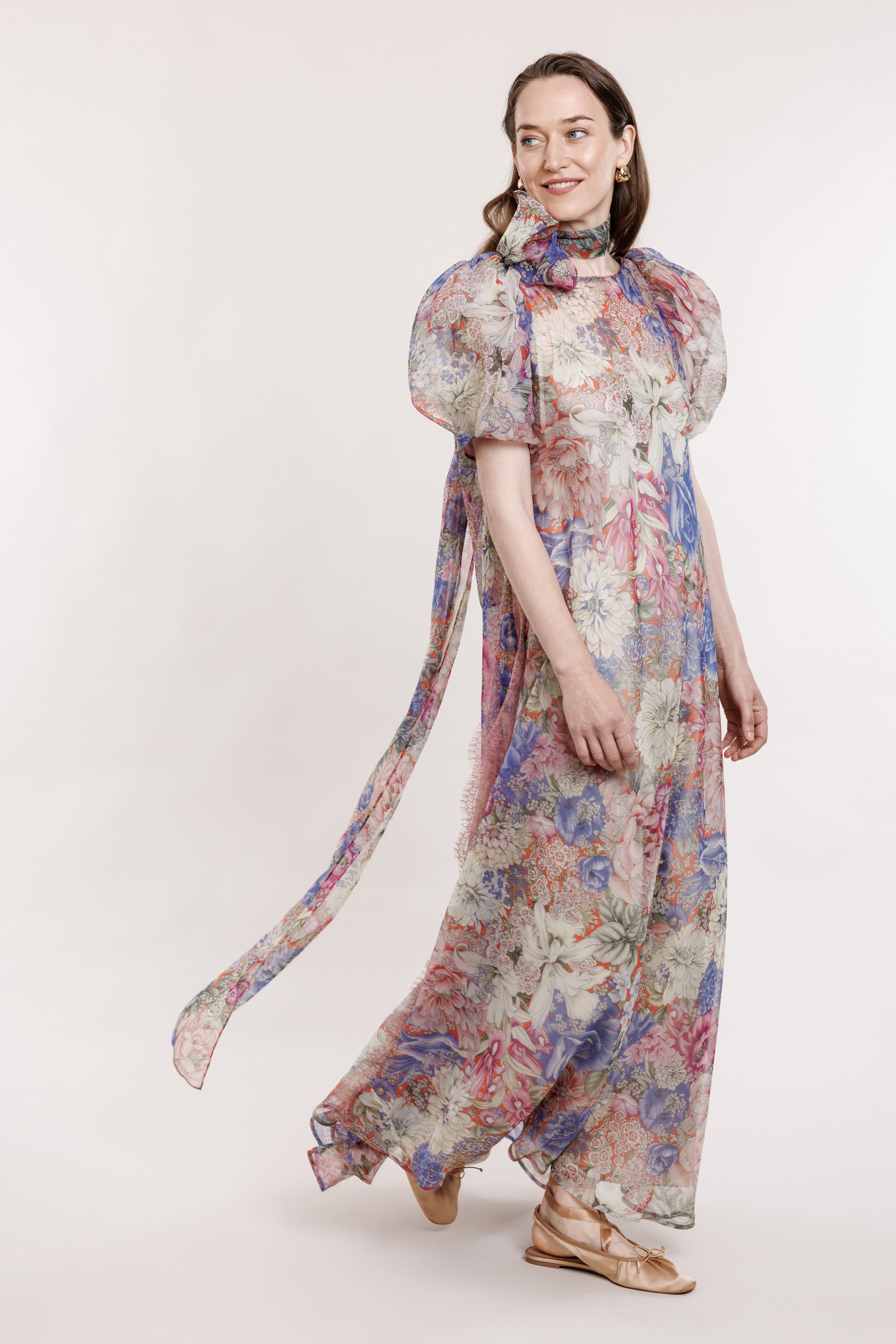 Zīda organzas kleita ar ziedu rakstu un mežģīņu ielaidumiem sānu daļās. Kleitai komplektā apakškleita, jeb slipa kleita ar sasienamām lencītēm. Apakškleita nēsājama kā patstāvīgs izstrādājums ar žaketēm un jakām.